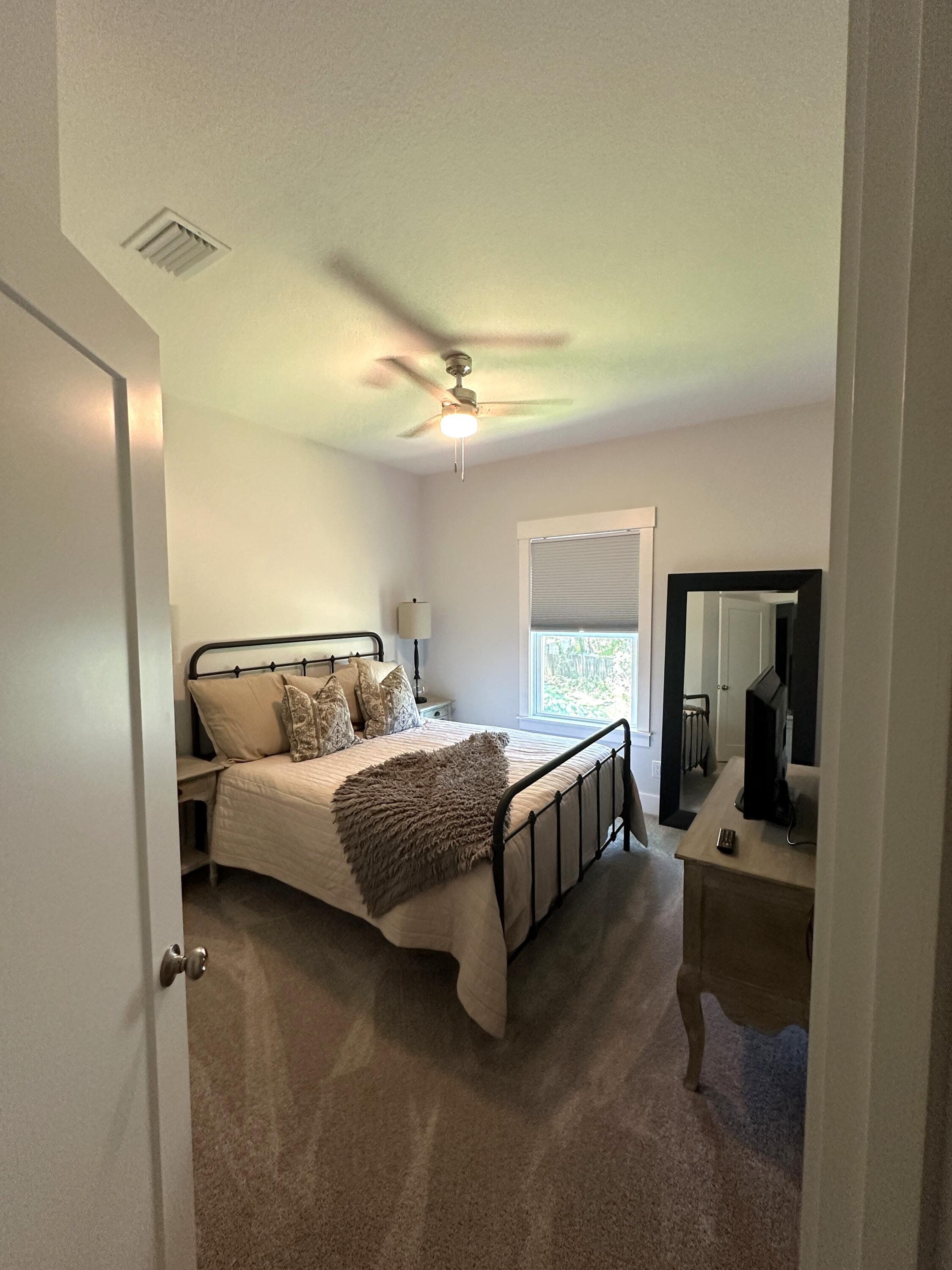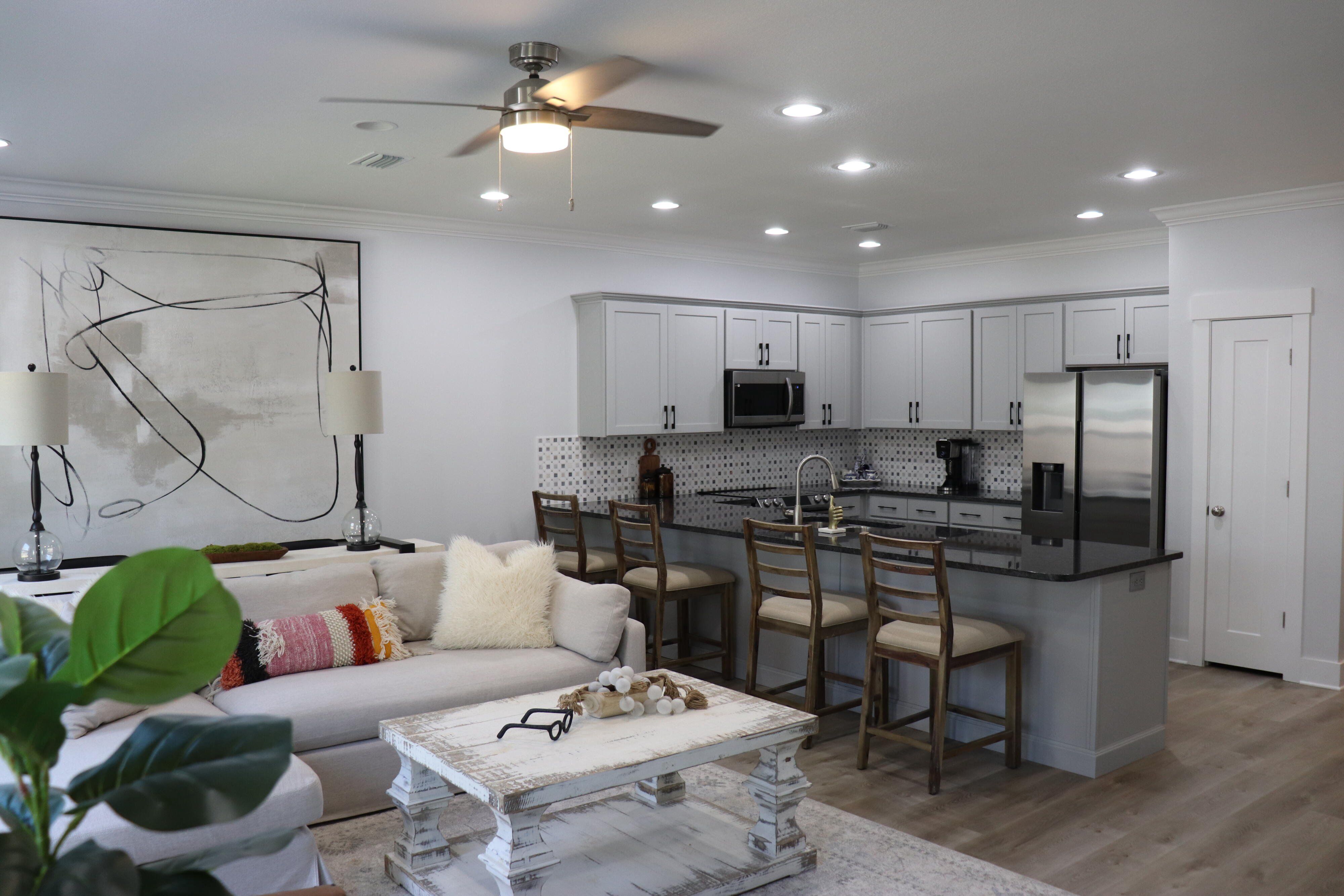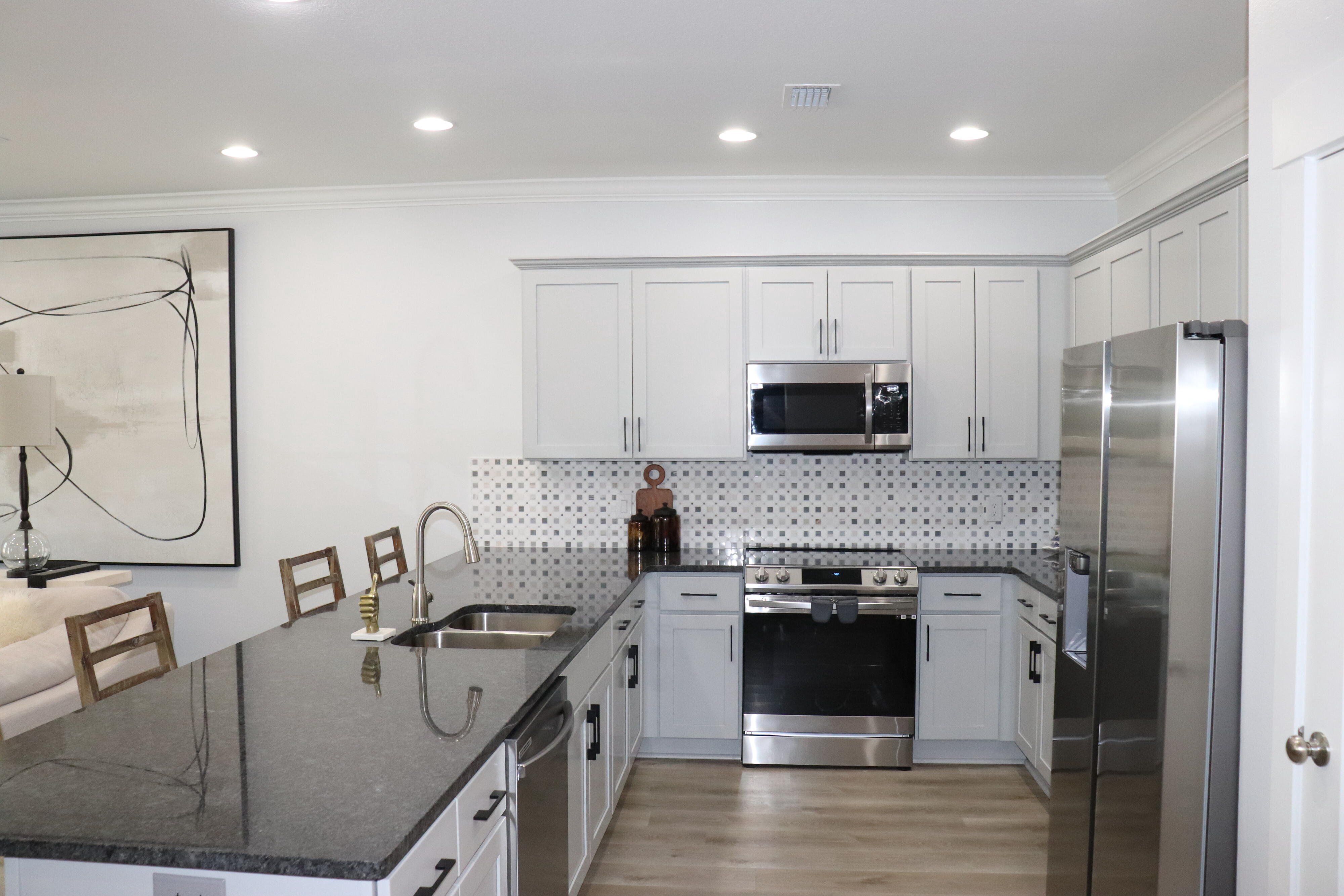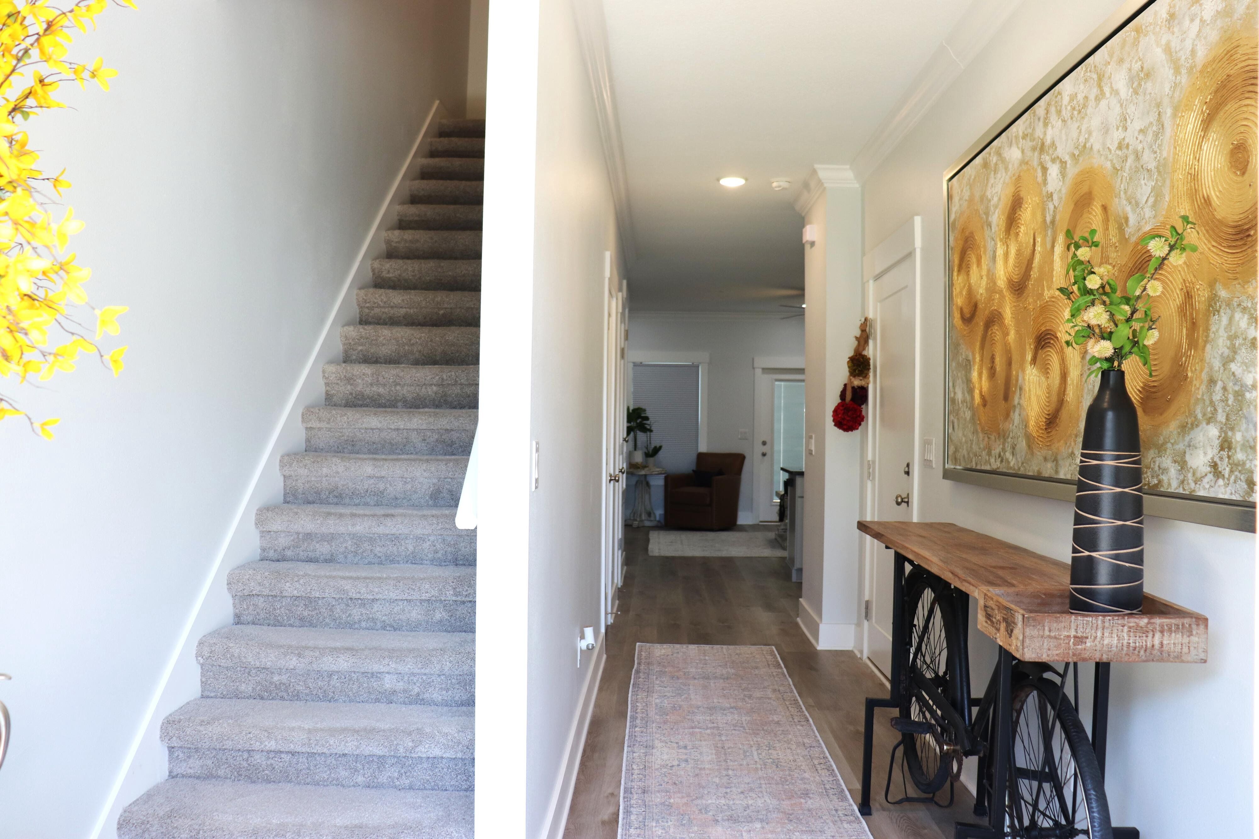 Beautiful end unit in excellent condition. Fully furnished (over 25k in furniture included). Luxury Vinyl Plank in living areas and baths. Carpet on stairs and in bedrooms. Upstairs features all bedrooms, full guest bath, on-suite bath for primary bedroom and laundry room. Downstairs main entryway leads to half bath, kitchen w/breakfast peninsula and upgraded stainless appliances such as side by side refrigerator, self cleaning convection stove with Air Fry, built-in microwave/range hood and dishwasher. Kitchen opens to living and dining area. This unit has the largest backyard in the community with gated privacy fence. Single garage with Epoxy sealed flooring and automatic garage door. Custom blinds for all windows will stay and all appliances including washer and dryer are included.