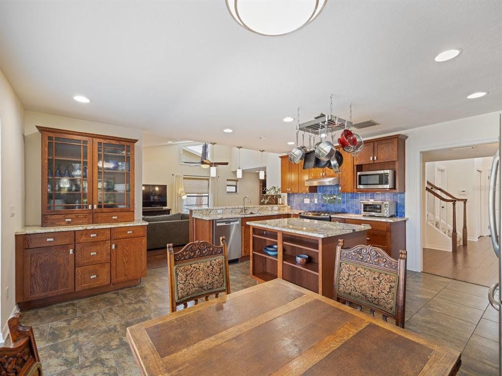 Discover the perfect blend of comfort, character, and convenience in this beautiful two-story home, tucked away on a peaceful cul-de-sac in Safety Harbor. From the moment you step inside, you’ll feel the warmth of solid wood doors, gleaming wood floors, and the inviting glow of the family room’s floor-to-ceiling wood-burning fireplace. At the heart of the home lies a spacious kitchen featuring rich wood cabinetry, granite countertops, a center island, and high-end GE Profile and Bosch stainless steel appliances—perfect for both everyday living and entertaining family or friends. Nearly every room enjoys serene pond views, with more than 160 feet of combined waterfront creating a picturesque backdrop for relaxing or hosting gatherings by the large screened-in pool area. Upstairs, the primary suite offers a private retreat with an ensuite bath, while two additional bedrooms share a generous secondary bathroom. A fourth bedroom on the main floor opens directly to the screened lanai and pool area and has access to a full bath that also serves as the convenient pool bath. Additional highlights include Clearwater natural gas service for the oven, dryer, and tankless water heater, a new roof (2022), and newer A/C systems (upstairs 2020, downstairs 2022). With easy access to downtown Safety Harbor’s charming shops, restaurants, and waterfront parks, this home captures the essence of Florida living—comfort, style, and serenity.