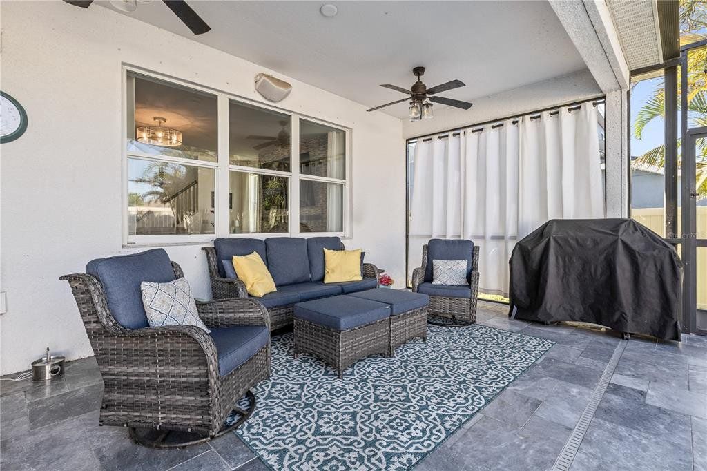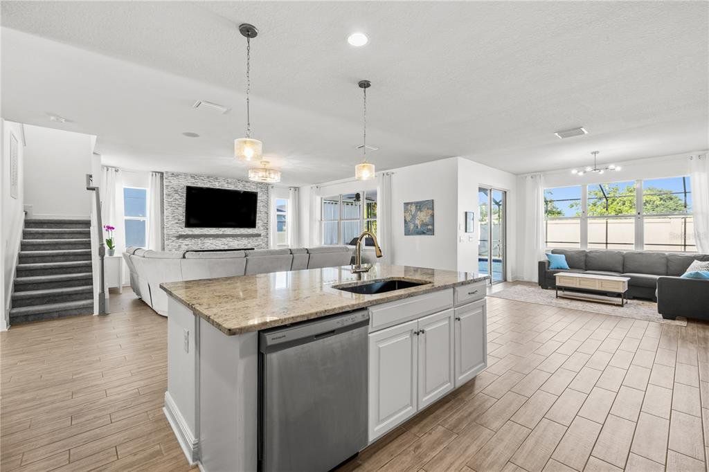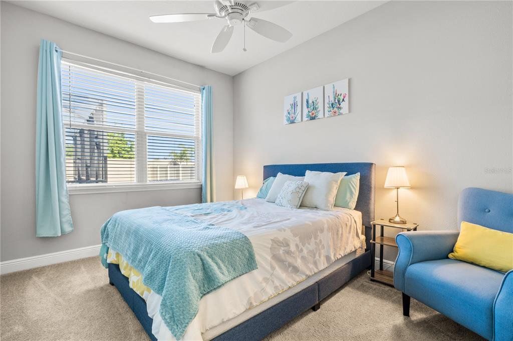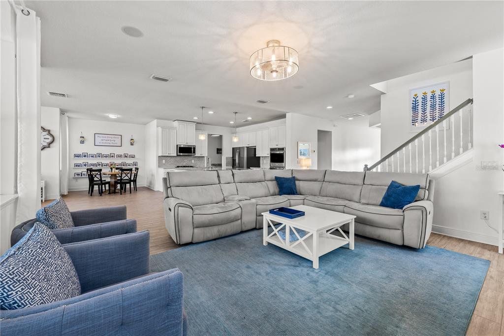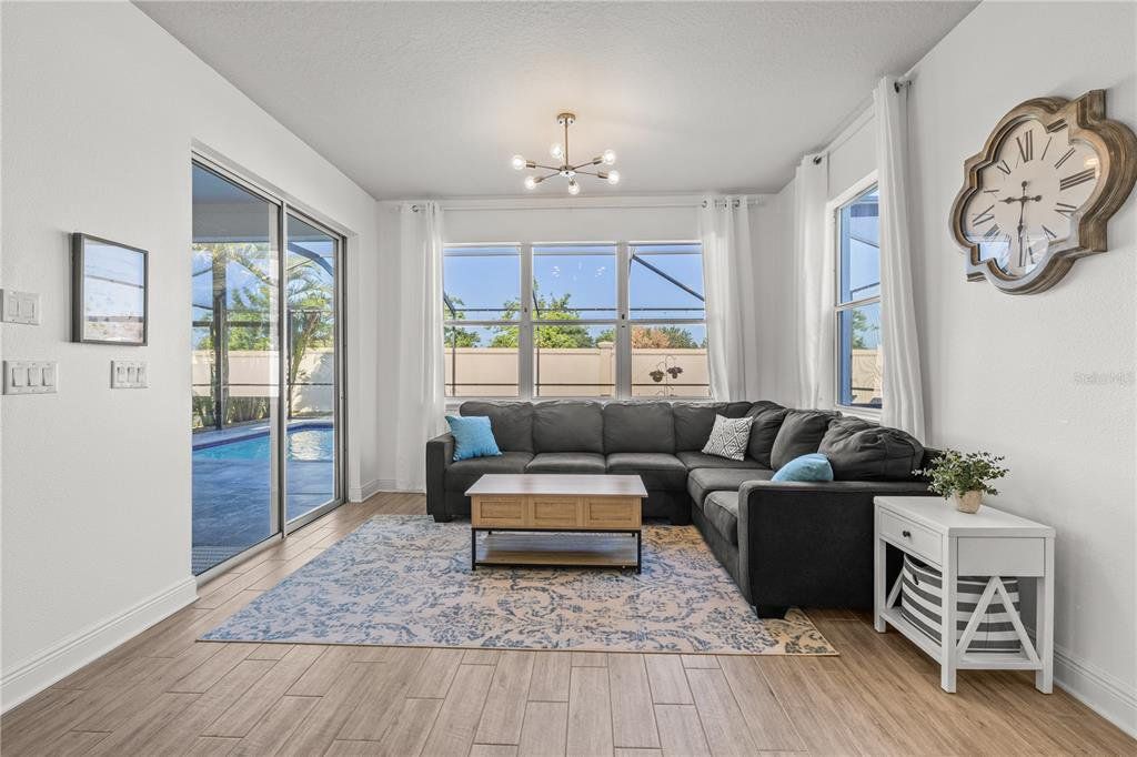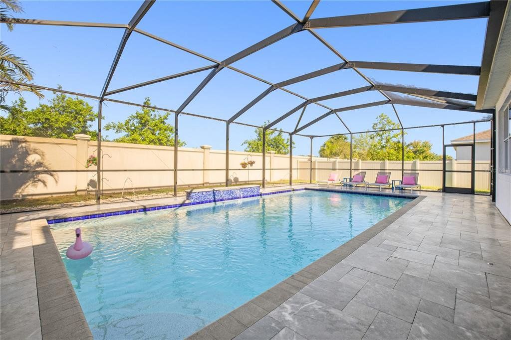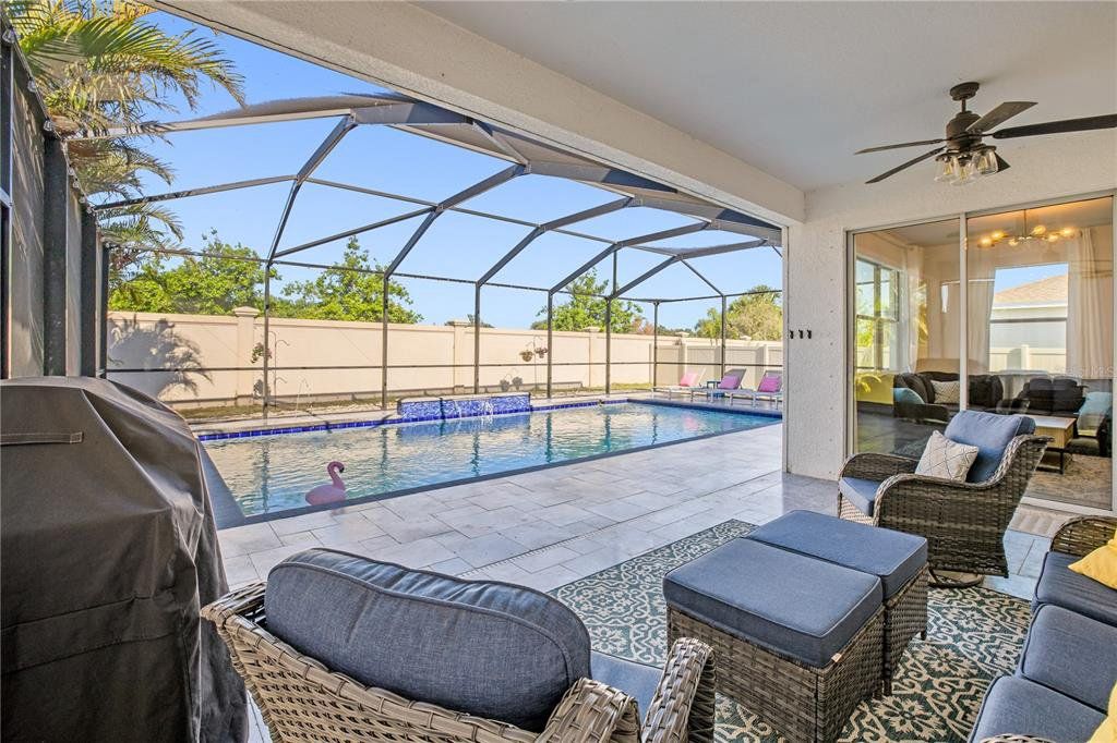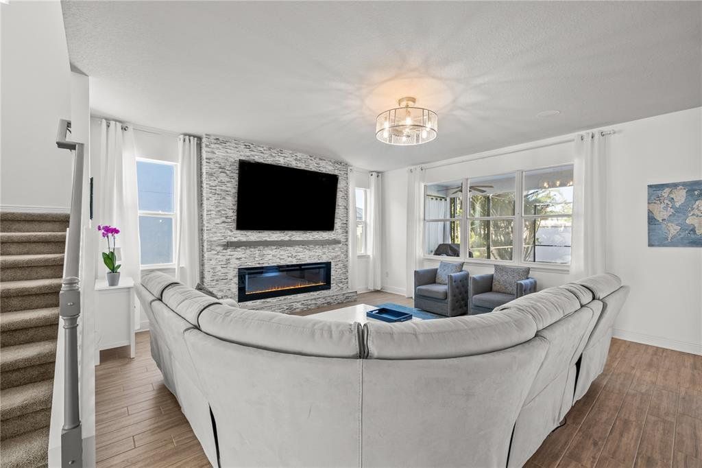 Welcome to this gorgeous 5-bedroom, 3.5-bathroom home in the highly sought-after gated community of Lucaya Lake Club—a place where comfort, functionality, and style come together beautifully. From the moment you step inside, you’ll appreciate the thoughtful upgrades, including wood-look porcelain tile flooring that brings warmth and durability to the main living spaces. The kitchen opens right into the heart of the home and features modern stainless steel appliances, making it perfect for both everyday living and hosting friends or family. The living room is anchored by a custom built-in wall and electric fireplace, creating a cozy and inviting space to unwind. Step outside and you’ll find one of the home’s true highlights—a screened-in outdoor area with a large heated saltwater pool, framed by Areca palms that offer both privacy and a touch of tropical charm. On the main floor, there’s a private guest suite with its own full bath, plus a flex room that can easily function as an office, formal dining room, or playroom depending on your lifestyle. Upstairs, you'll find four more spacious bedrooms, including a generously sized primary suite with double vanities, a walk-in shower, and an oversized walk-in closet you’ll love. The interior has been freshly painted, and the front yard has been refreshed with new sod and crisp landscaping borders, giving the home a polished, welcoming feel. As a resident of Lucaya Lake Club, you’ll also enjoy access to top-notch amenities, including a resort-style pool, fitness center, playground, and a beautiful lake at the heart of the community—perfect for peaceful walks or simply taking in the view. Just a short stroll to Collins Elementary, and close to everything—restaurants, shopping, I-75, downtown Tampa, and even the beach—this home truly offers the best of Florida living.