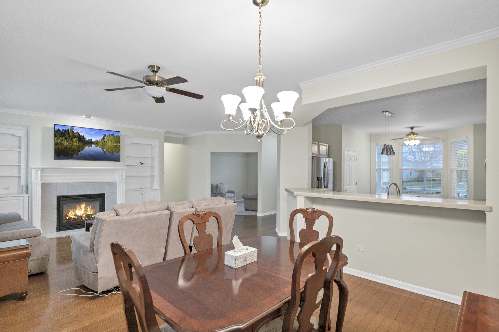 Del Webb-built Petoskey model situated on a desirable corner lot, featuring a custom vaulted four-season sunroom with heat and air, along with screened windows for year-round enjoyment. The home also includes an oversized paver patio and a lawn sprinkler system. Interior features include hardwood flooring, bay windows, crown molding, and six-panel white doors and trim throughout. The kitchen is appointed with glazed maple cabinetry and granite countertops, while the living room offers a gas log fireplace with custom built-ins. The primary suite includes a custom built-in wall unit, two walk-in closets, and a private bath with a double vanity. A guest bedroom, additional full bath, and a separate den or office provide flexible living space. The 2.5-car garage includes an energy package and pull-down stairs leading to a finished attic. Ideally located near Wildflower Lake, this home combines thoughtful upgrades with a highly desirable setting.