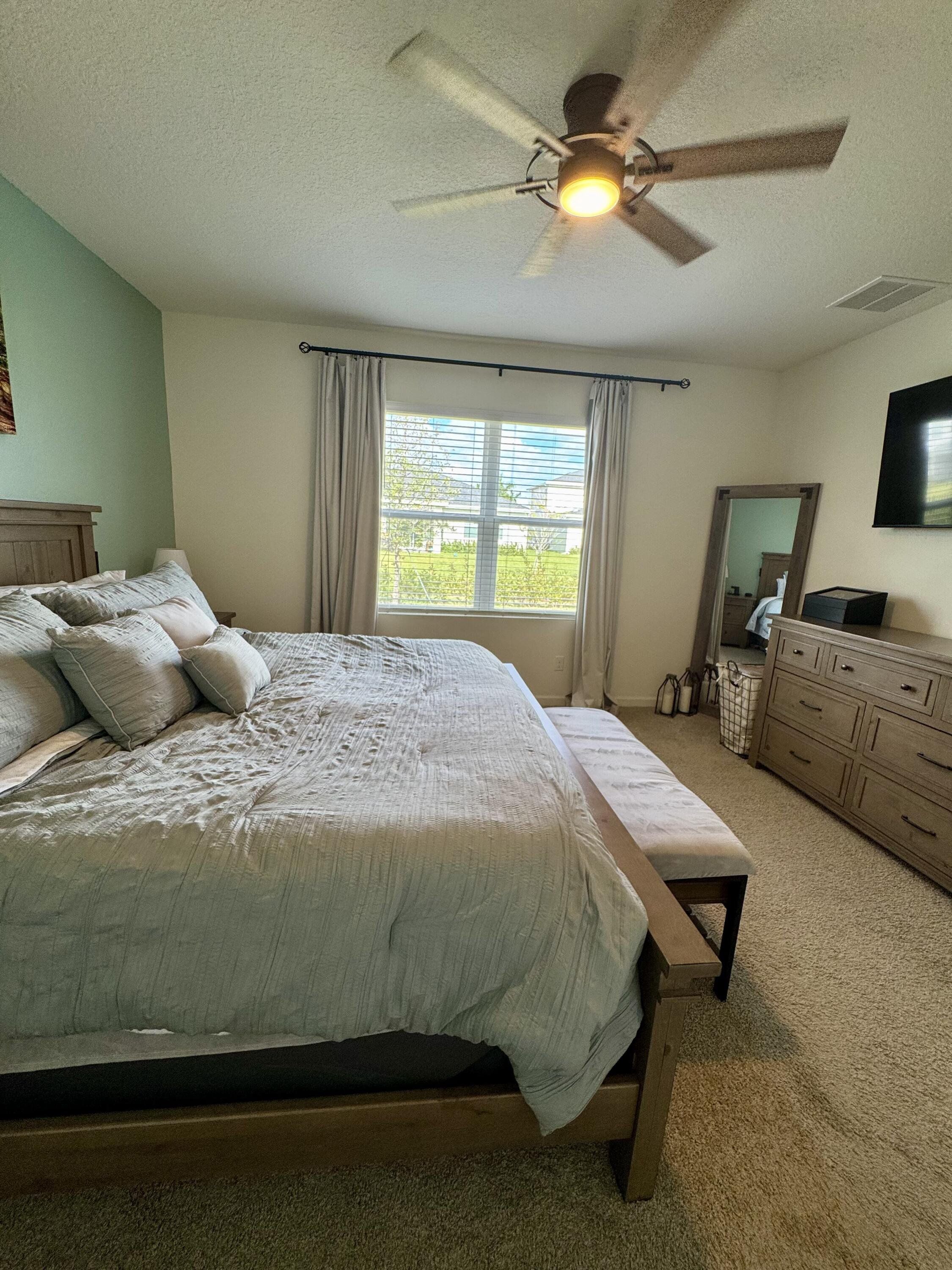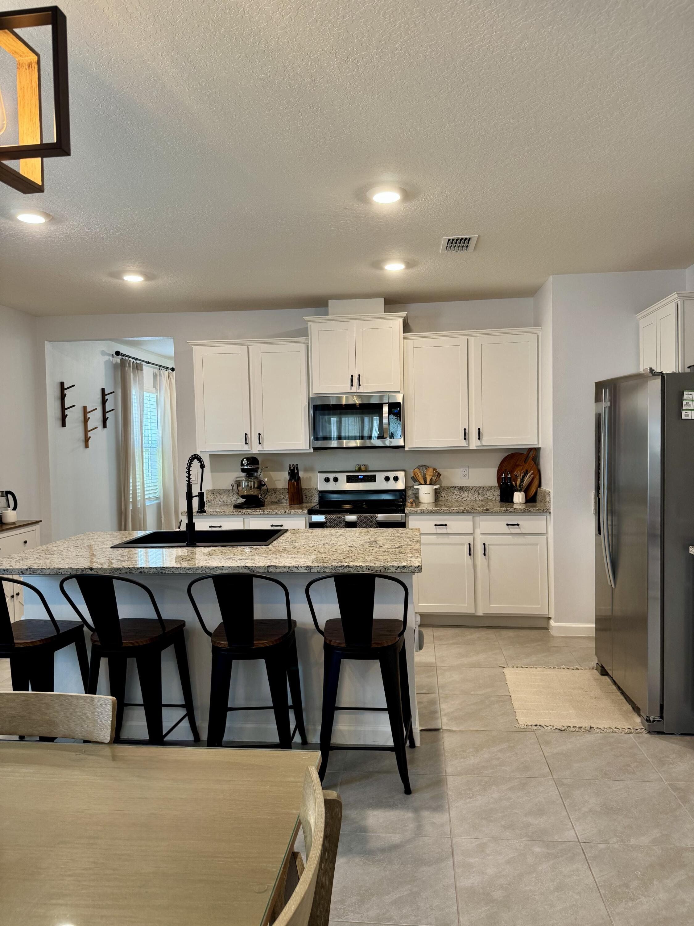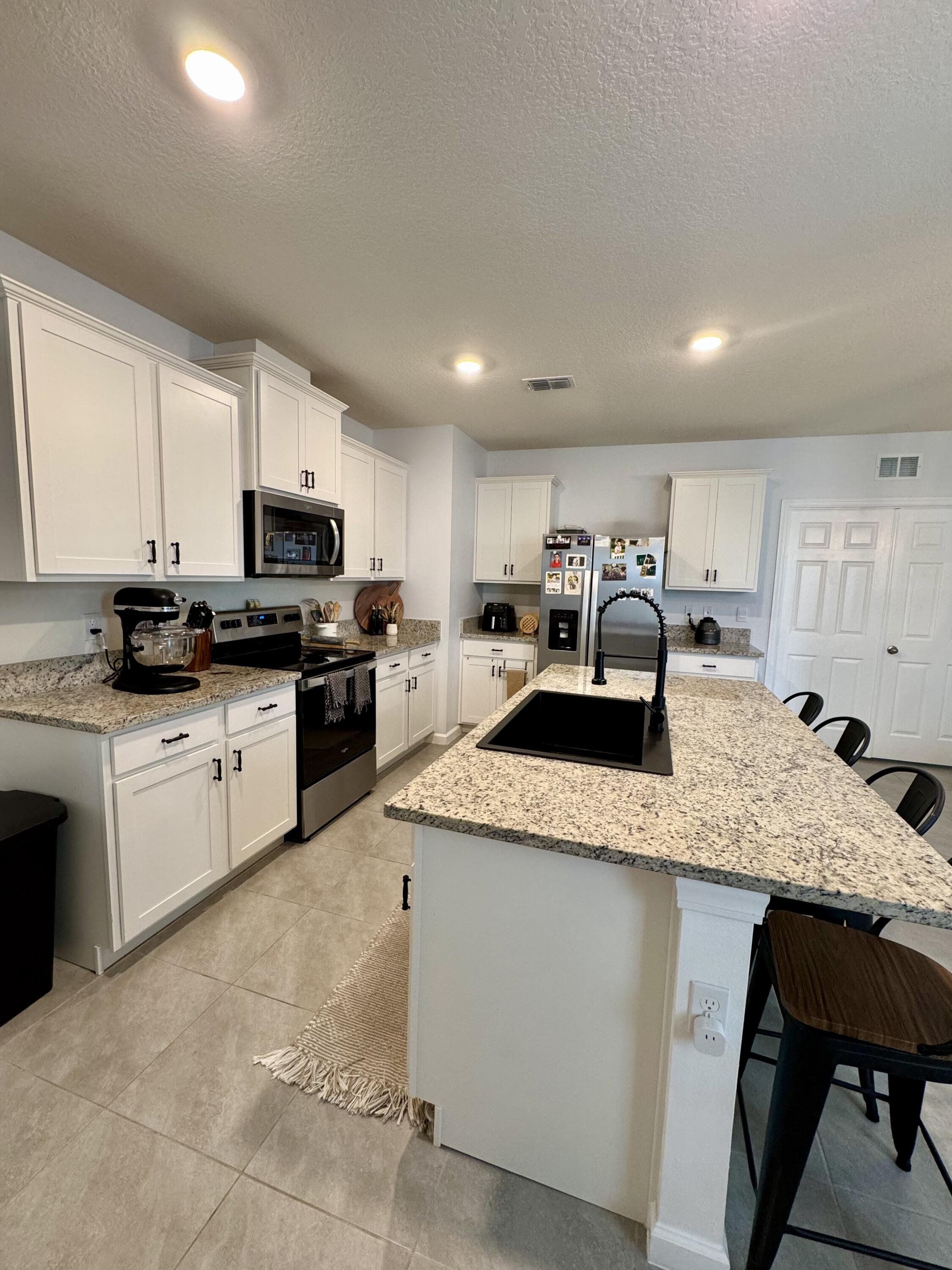 Welcome to this beautifully upgraded 3-bedroom, 2-bath CBS home with a split floor plan and 2-car garage in the desirable Central Park community. Highlights: () Modern kitchen with large island, cabinets with upgraded handles, granite countertops, stainless steel appliances, and oversized pantry () Granite single bowl sink with matching dual function pull down faucet () Tile flooring in main living areas & flex space; carpet in primary and secondary bedrooms () Customized primary closet and upgraded cabinet hardware () Screened patio for outdoor enjoyment () Two ceiling-mounted garage storage units (one with adjustable height) () Workbench with shelving for tool storage (removable if desired) () Whole-house Brita water filtration system () Hurricane panels with hardware and numbered diagram for easy installation () Upgraded light fixtures and fans controlled via Hubspace app or remotes Community Features: () Low HOA $101.15 quarterly () Ten-acre recreation facility () Expansive Clubhouse Amenity Center with gathering areas and multi-purpose rooms () Resort-style pool with large sun deck featuring lounge chairs, umbrella tables, and cabanas () Huge Splash Park with a variety of water features () Restroom building with a poolside café planned in the future () Oval quarter-mile track () Large playground & tot lot () Dog parks for both large and small pets () Four pickleball courts, sport/tennis courts, and basketball court () Space for staging food trucks, farmers markets, and other community activities This home combines modern upgrades, automated features, and resort-style amenities—all in one vibrant community.