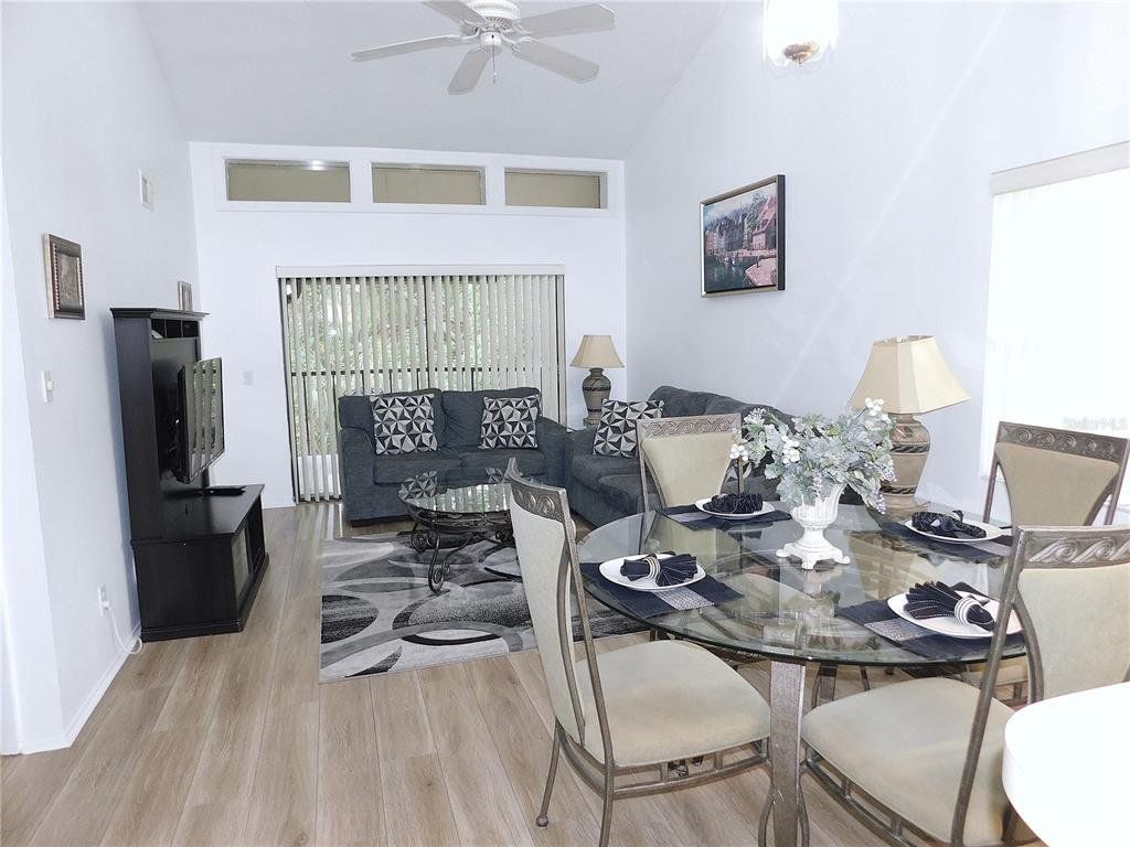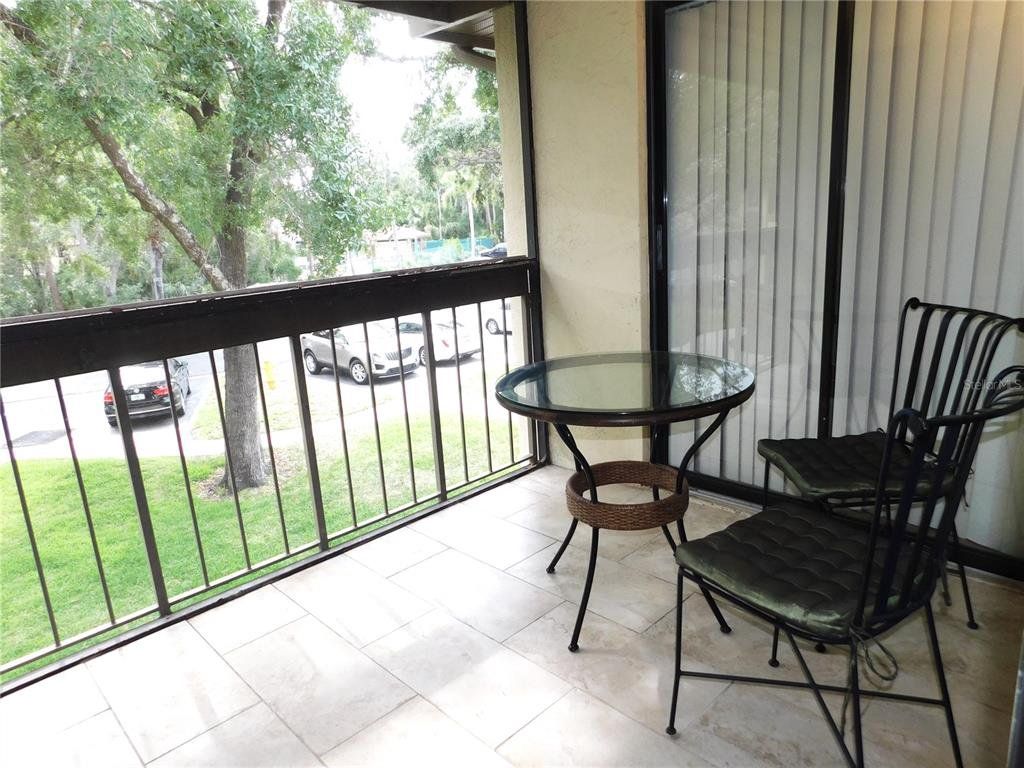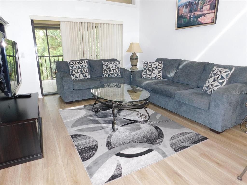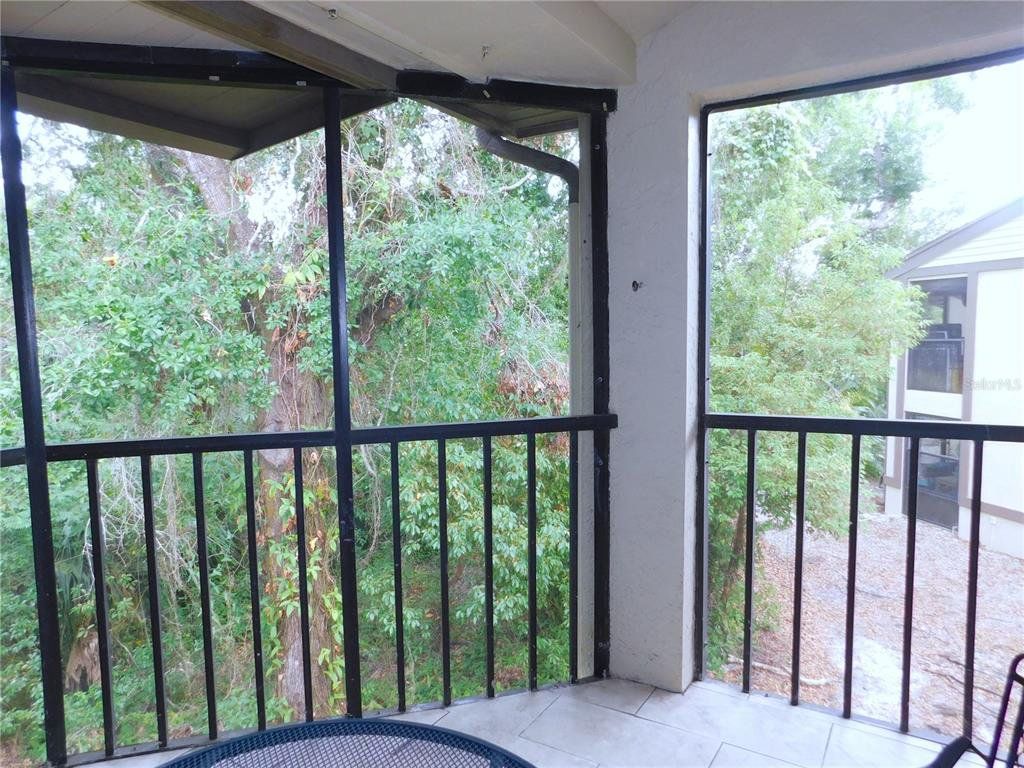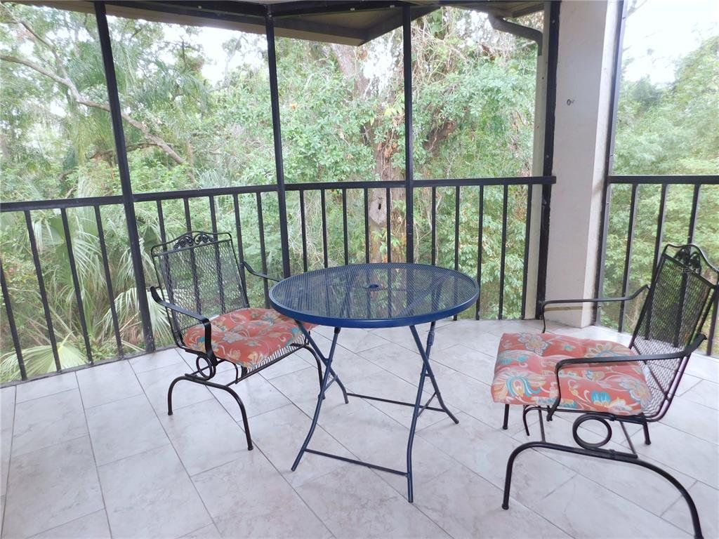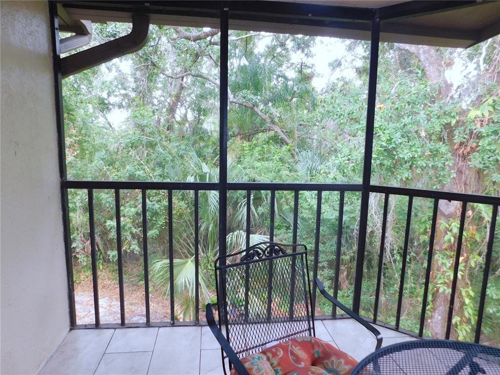 Come home every evening, relax on your screen enclosed oversized lanai overlooking your wooded lot backdrop and let the day's cares slip away! This second floor end unit condo with vaulted ceilings is waiting for you, well maintained condition and complete with all furnishings! Foyer entrance with hall closet takes you into the living/dining combination showcased with beautiful natural light from the clearview windows along the vaulted ceilings to the sliding glass doors on either end of the living space. The open floor design of the living area is met with a breakfast bar into the kitchen with sliders out to the screen enclosed lanai in the front of the condo where the washer & dryer are located in the utility closet. This condo offers a split bedroom plan. The primary suite gives you two closets, king size bed, sliders out to your private lanai and primary bathroom with tub/shower combination, oversized vanity and large linen closet. The guest bedroom also has sliders out to the front screen enclosed lanai, along with wall closet and twin (single) beds. The guest bath with another linen closet has a walk in shower. If you are ready to explore, the location of the condo is fantastic - starting with the nearby community heated pools (two of them) or visit/join Ardea Country Club that offers two 18 hole golf courses, their own pools, tennis, pickleball, fitness center, Clubhouse, restaurants and activities. Your condo is an easy commute to Westfield Countryside Mall, area shopping, various restaurants and entertainment plus the sandy beaches of Honeymoon Island along with local parks and walking trails for your low stress lifestyle. More dining and shopping in the surrounding downtown areas of Tarpon Springs, Dunedin and Safety Harbor. As a convenience to the sellers, the condo is being offered fully furnished and the condo is located in Woodlake Run area of the gated community of East Lake Woodlands Country Club. New a/c in 2023, new hw heater and dishwasher in 2024.