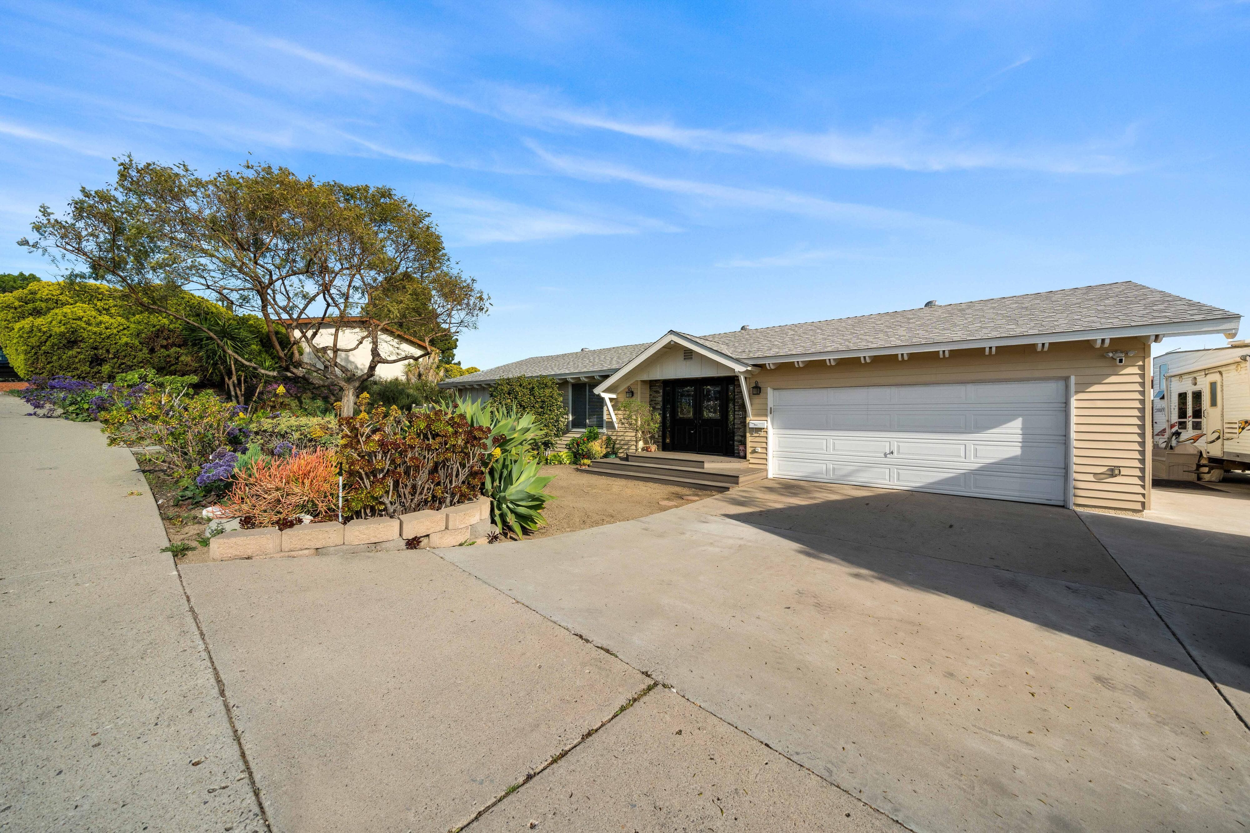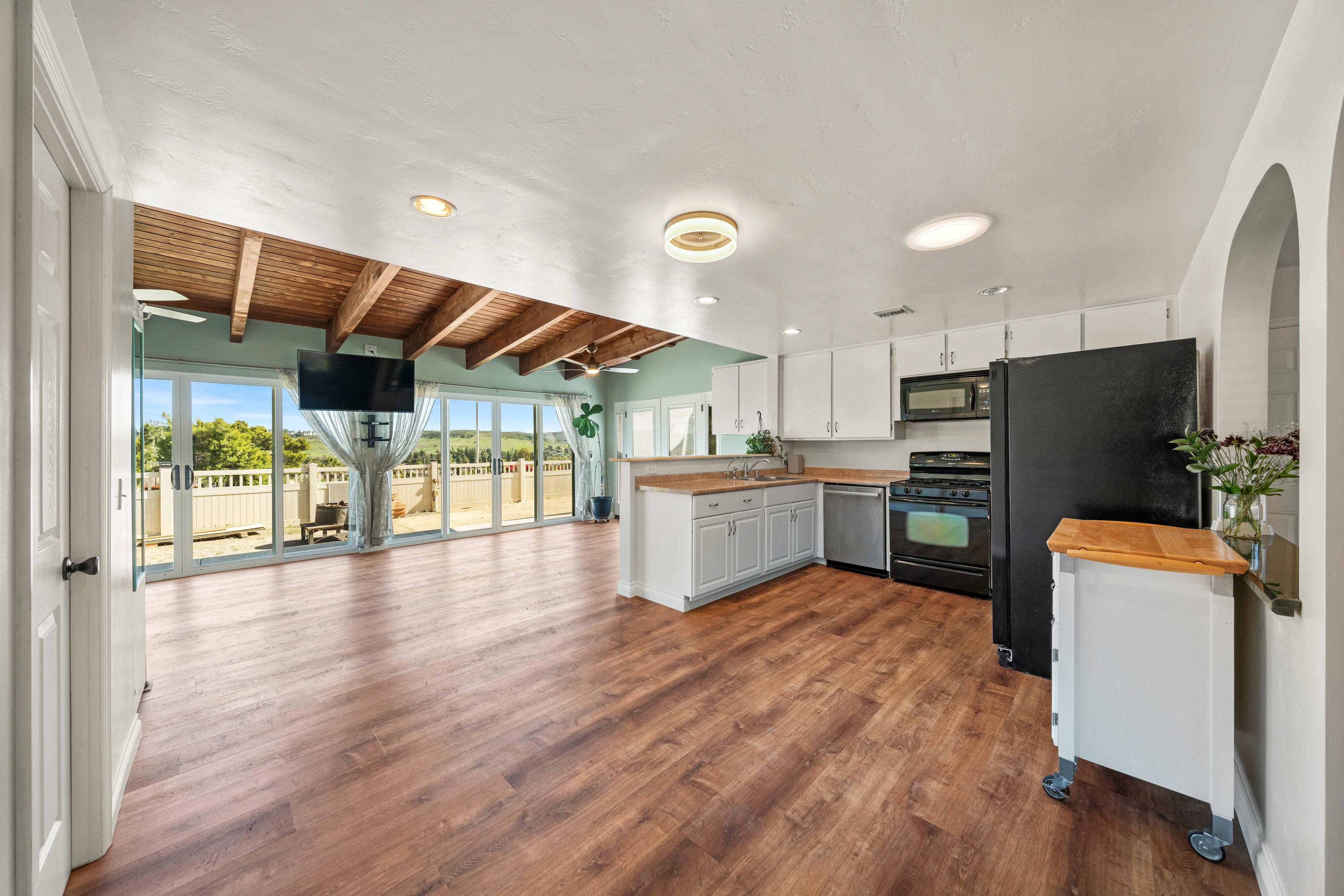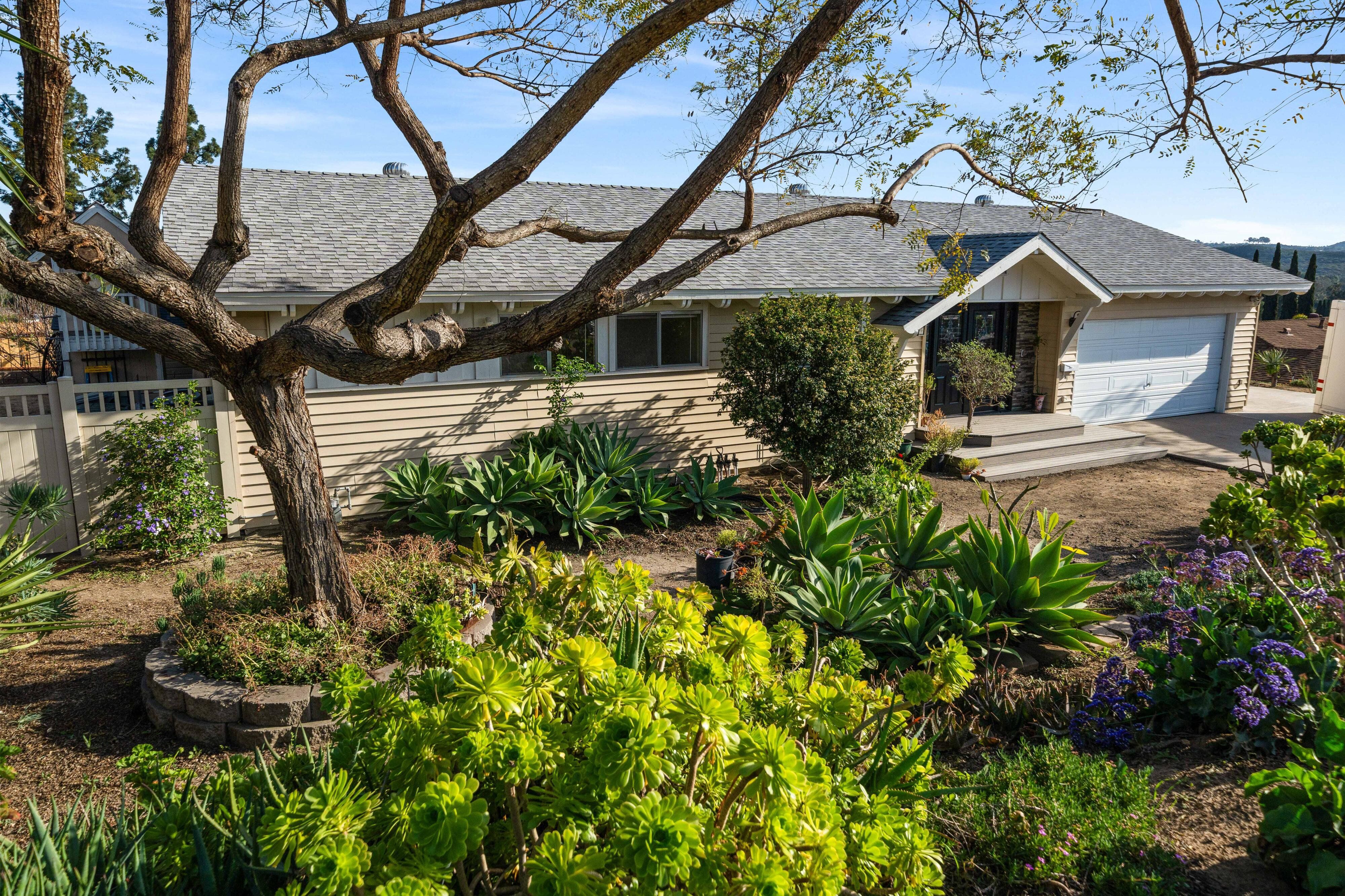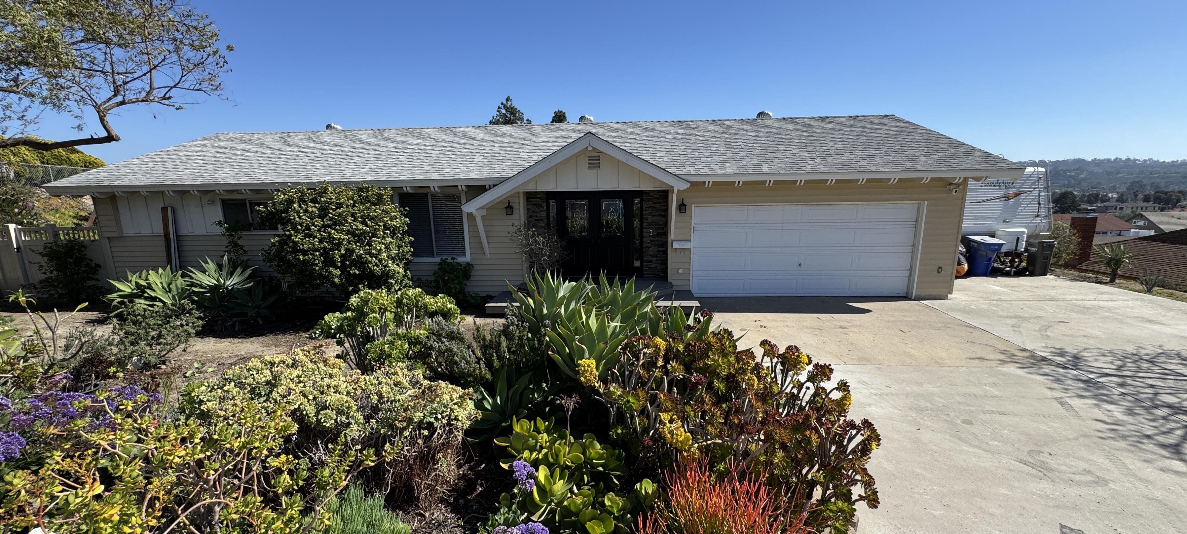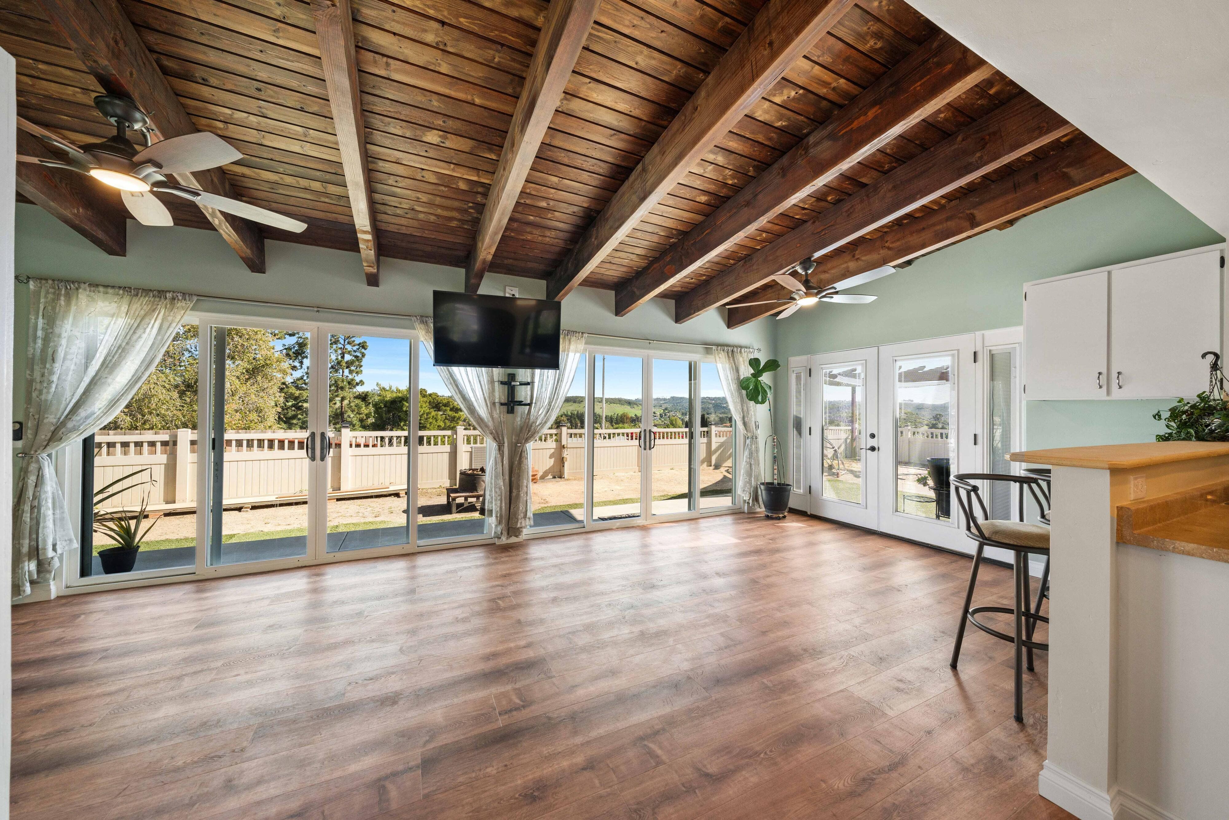 Welcome to our unique, spacious 2,200 square foot home with the most beautiful views and privacy in the neighborhood. We are part of Poway school district which is rated top 10 in the nation, within walking distance to the elementary and middle schools. We own our solar panels with a credit on our electric bill each month. We have a super spacious living area with a beamed, vaulted ceiling that opens into the kitchen and sunroom where you can see the view of the city and mountains. We have 3 standard bedrooms and 2 bonus rooms (potential bedrooms/studio) all of which are spacious with bright lighted windows. New paint inside & outside, blinds, roof and floors. The property has many fruit trees and exotic plants. We also have RV parking with full hook-ups.