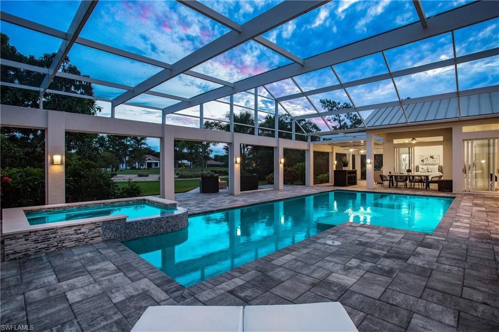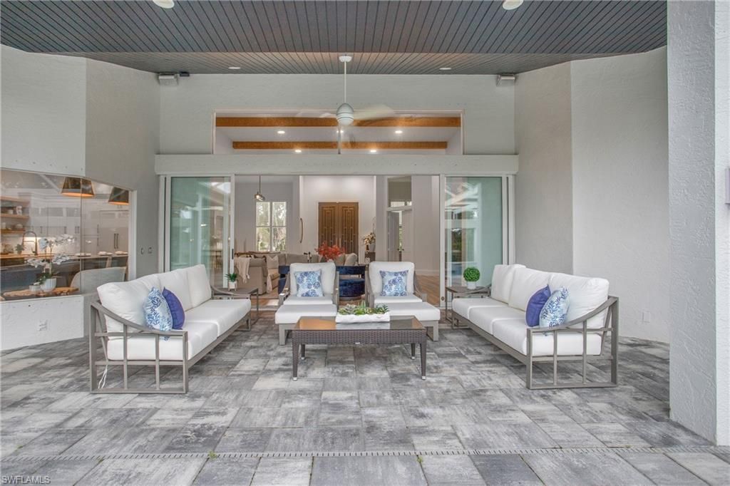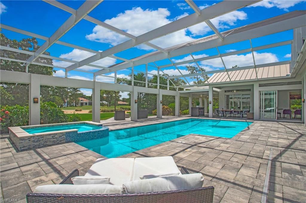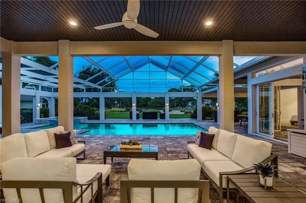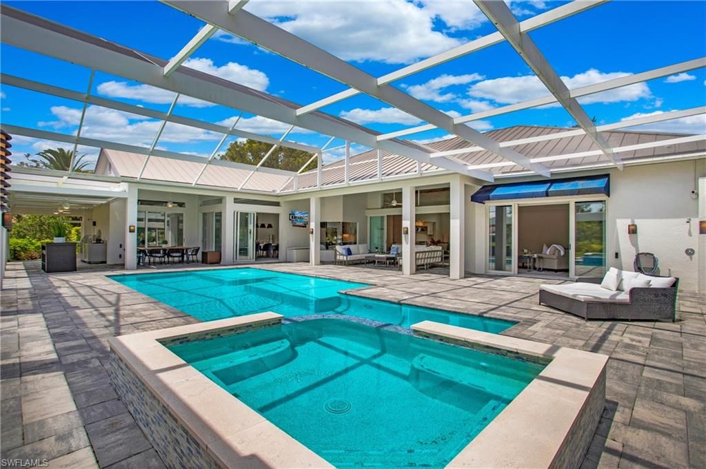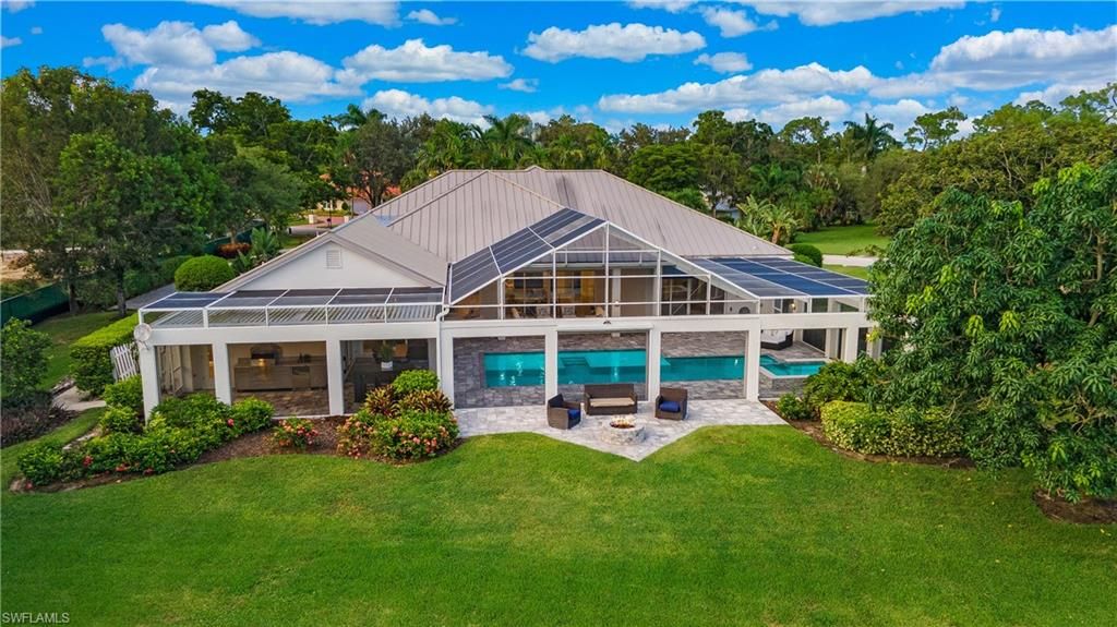 Come experience the understated luxury of this 4-bedroom, 4-bathroom Quail Creek estate home. Reimagined in a modern coastal style that perfectly complements its surroundings, this home stuns with soaring 14’ ceilings and an abundance of sliding glass pocket doors that dissolve the boundaries between indoor and outdoor living. Designed to meet the needs of today’s dynamic lifestyles, this home is the perfect balance of an open floor plan and designated spaces tailored for family engagement, productivity, and privacy. The kitchen is a chef's paradise featuring dual islands and equipped with top-of-the-line appliances, and the dining room is a space you will actually use – open to the kitchen, light and bright. Or dine al fresco on the covered lanai as the retractable pergola roof ensures a perfect meal rain or shine. A theater room, library and game room offer space to entertain, relax or work. Take advantage of the beautiful SWFL weather lounging by the pool, savoring the tranquility of panoramic golf course views on the over 1500 sf screened lanai. Marvel at spectacular sunset views and end the day gathered around the fire pit to share stories and create lasting memories. The life you’ve always imagined is possible in this beautifully renovated haven!