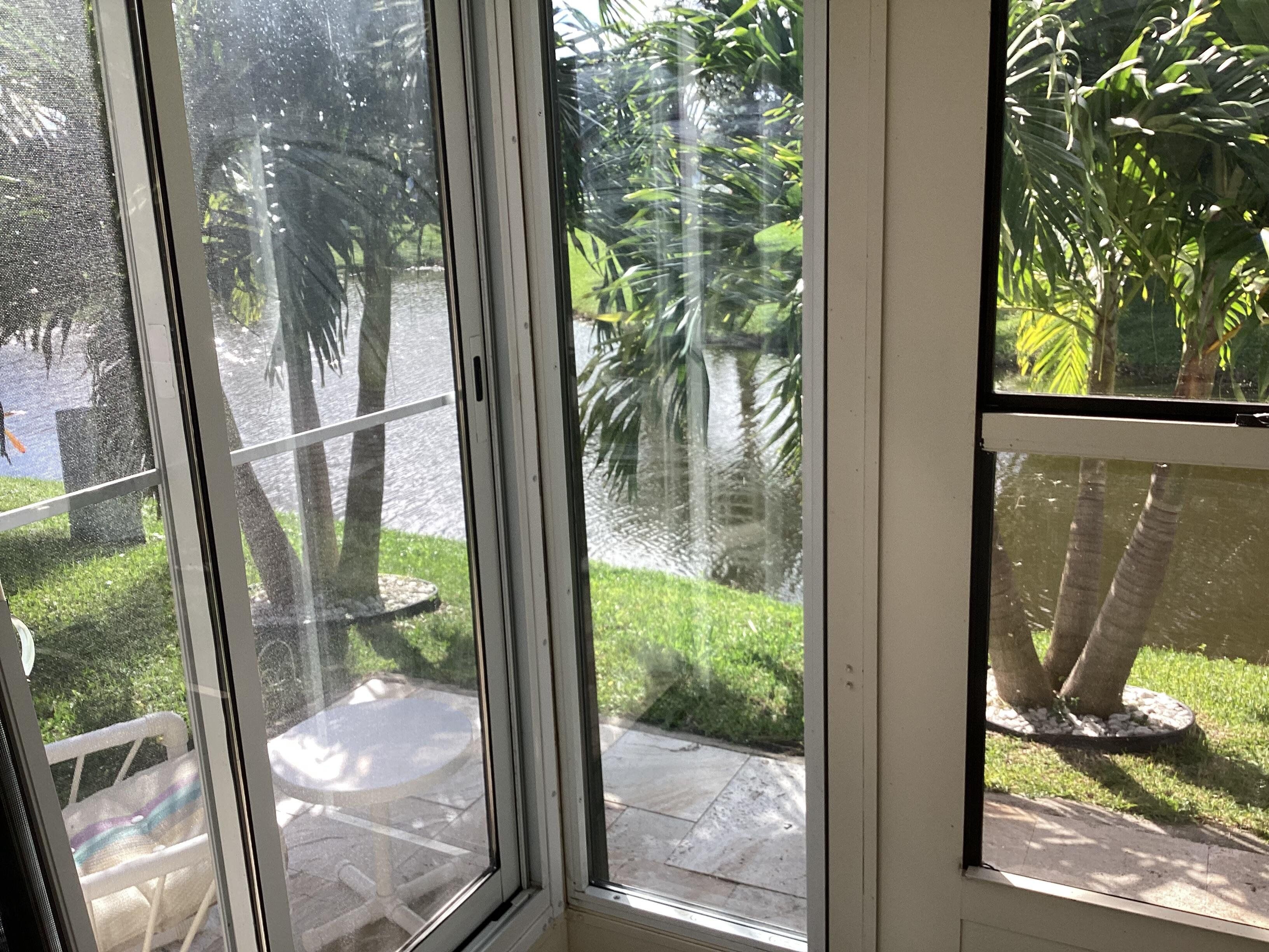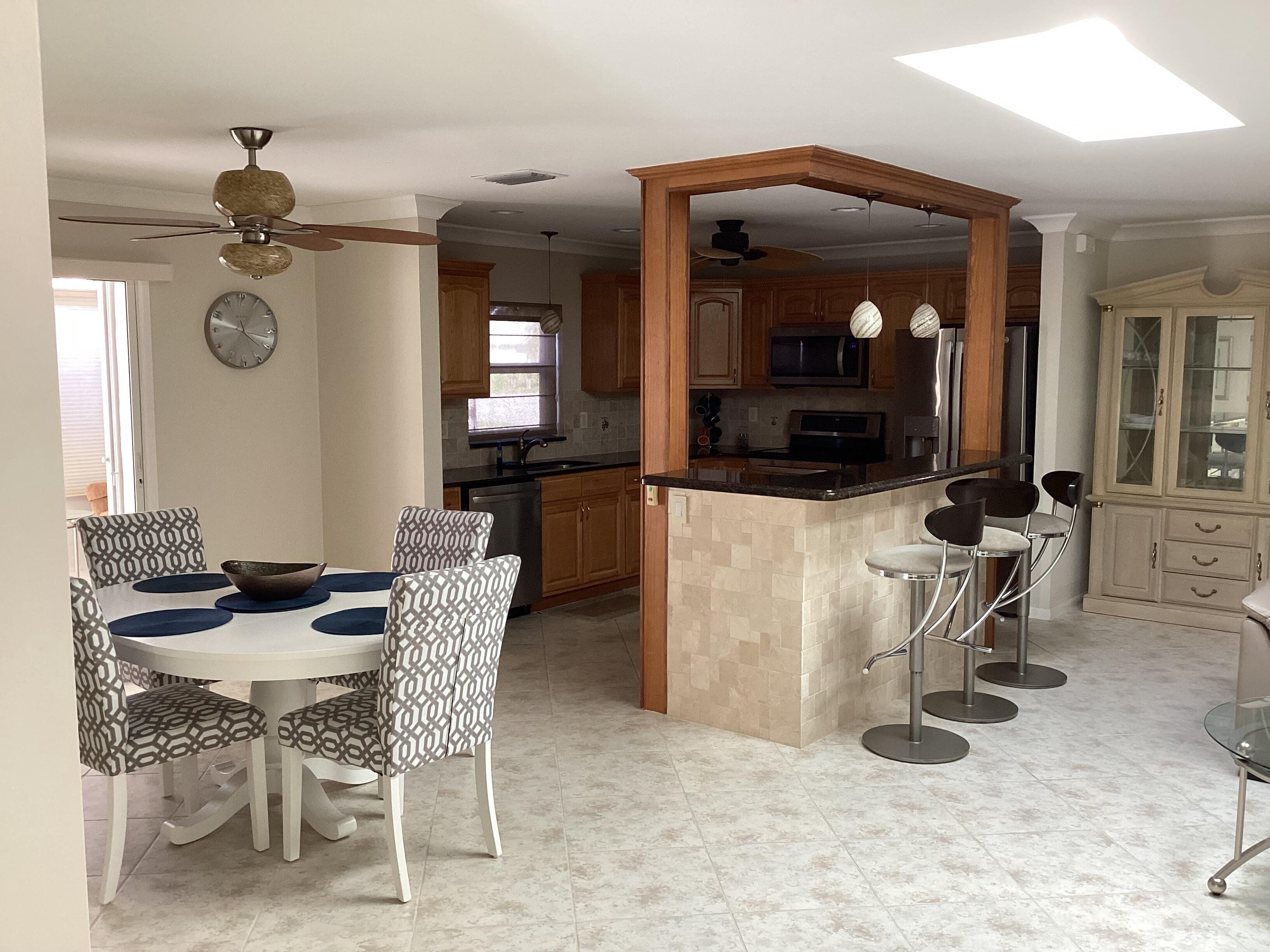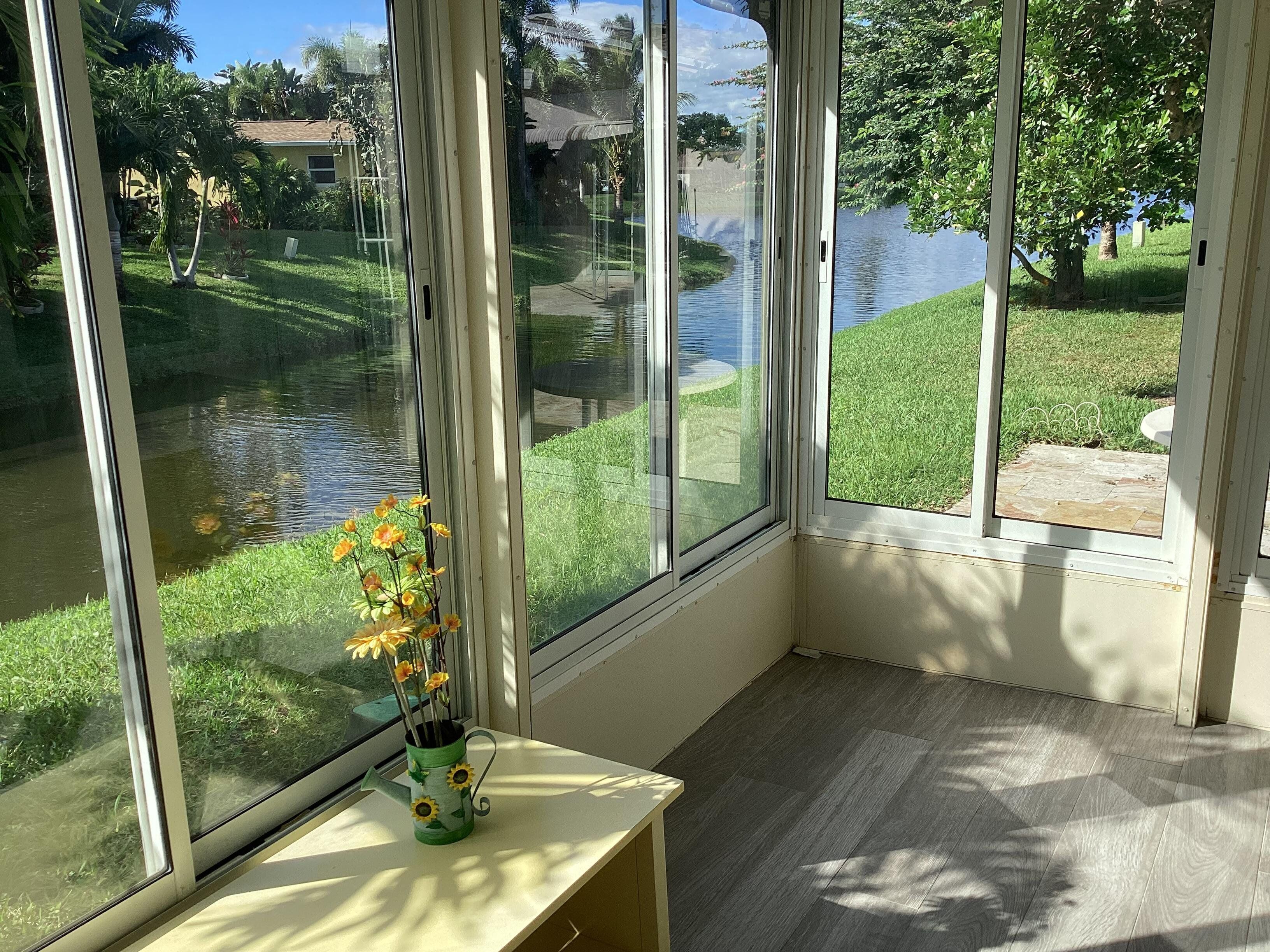 This home has a NEW roof and full impact windows. Modern open kitchen with granite countertops-stainless appliances, island into a living room with 2 new skylights. Large den with lots of natural light. Sliding door to 2 enclosed lanais with mini split air conditioners overlooks a gorgeous water view and lush greenery. Bathrooms with new walk in showers. Master bedroom closets with custom wood shelves. Important features: laundry room, popcorn free ceilings with crown molding and remote control ceiling fans, 1car garage, outdoor patios with beautiful travertine tile, double wide driveway. This extremely well maintained home is perfectly located on a quiet cul de sac and a short walk to pool and active clubhouse. Enjoy the convenience of nearby shopping, dining, and recreational options.