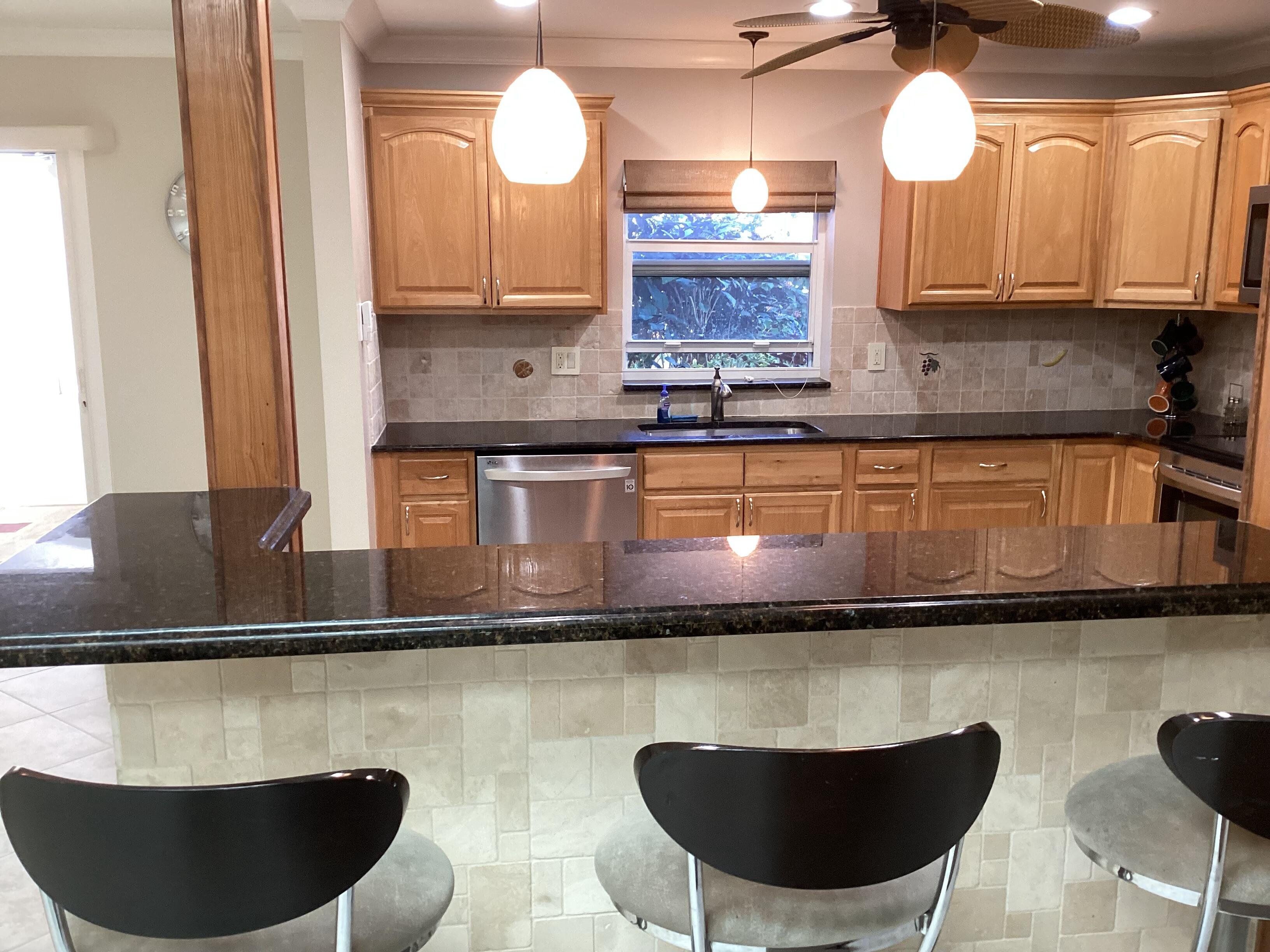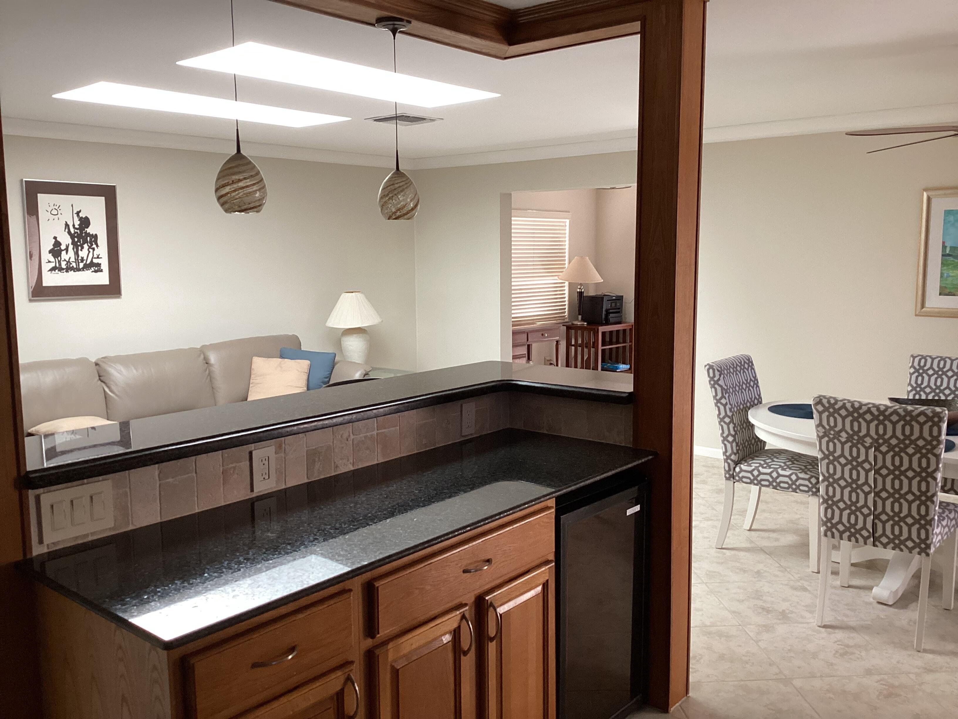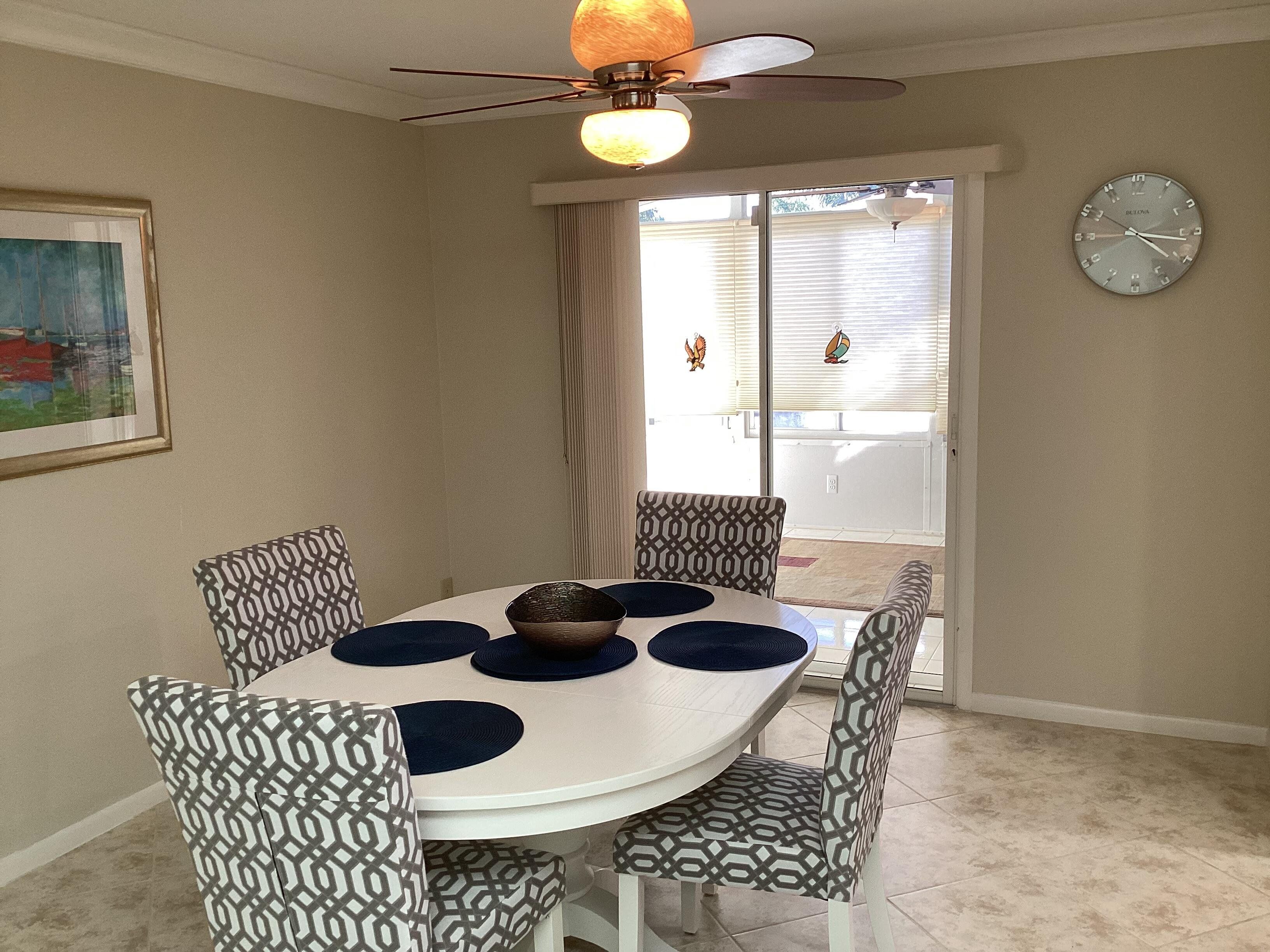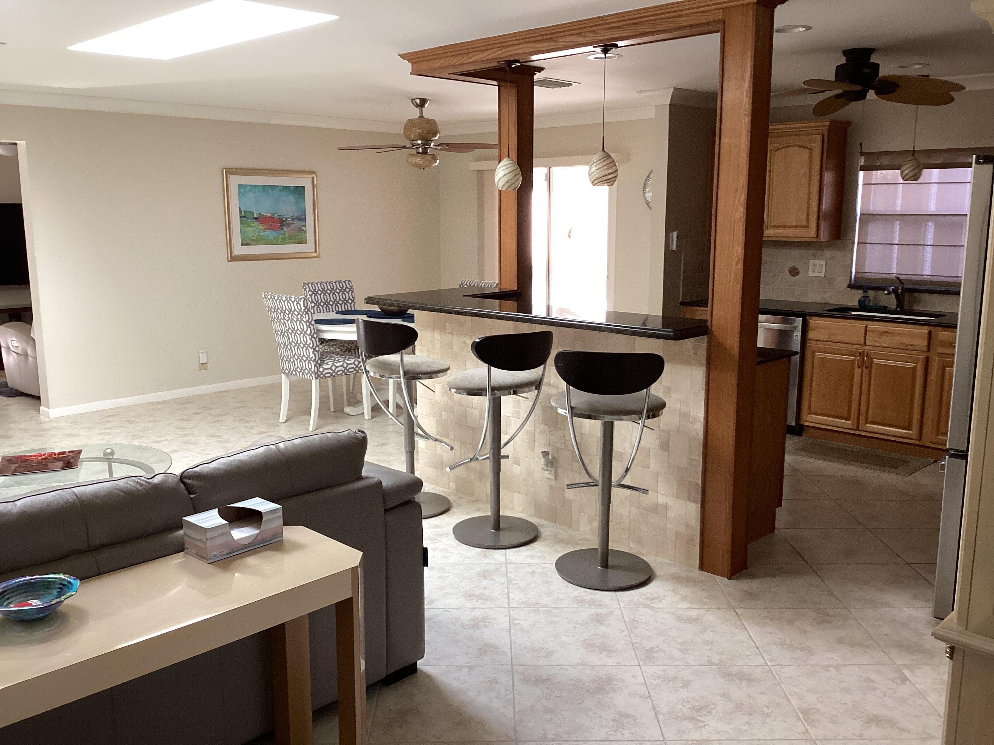 This home has a NEW roof and full impact windows. Modern open kitchen with granite countertops-stainless appliances, island into a living room with 2 new skylights. Large den with lots of natural light. Sliding door to 2 enclosed lanais with mini split air conditioners overlooks a gorgeous water view and lush greenery. Bathrooms with new walk in showers. Master bedroom closets with custom wood shelves. Important features: laundry room, popcorn free ceilings with crown molding and remote control ceiling fans, 1car garage, outdoor patios with beautiful travertine tile, double wide driveway. This extremely well maintained home is perfectly located on a quiet cul de sac and a short walk to pool and active clubhouse. Enjoy the convenience of nearby shopping, dining, and recreational options.