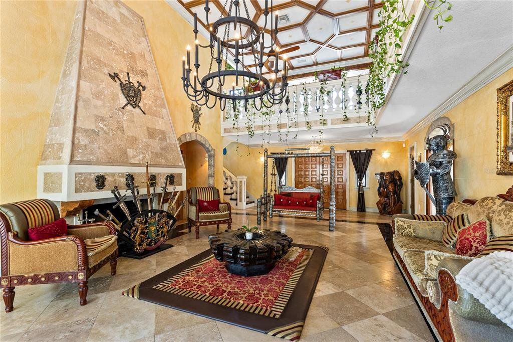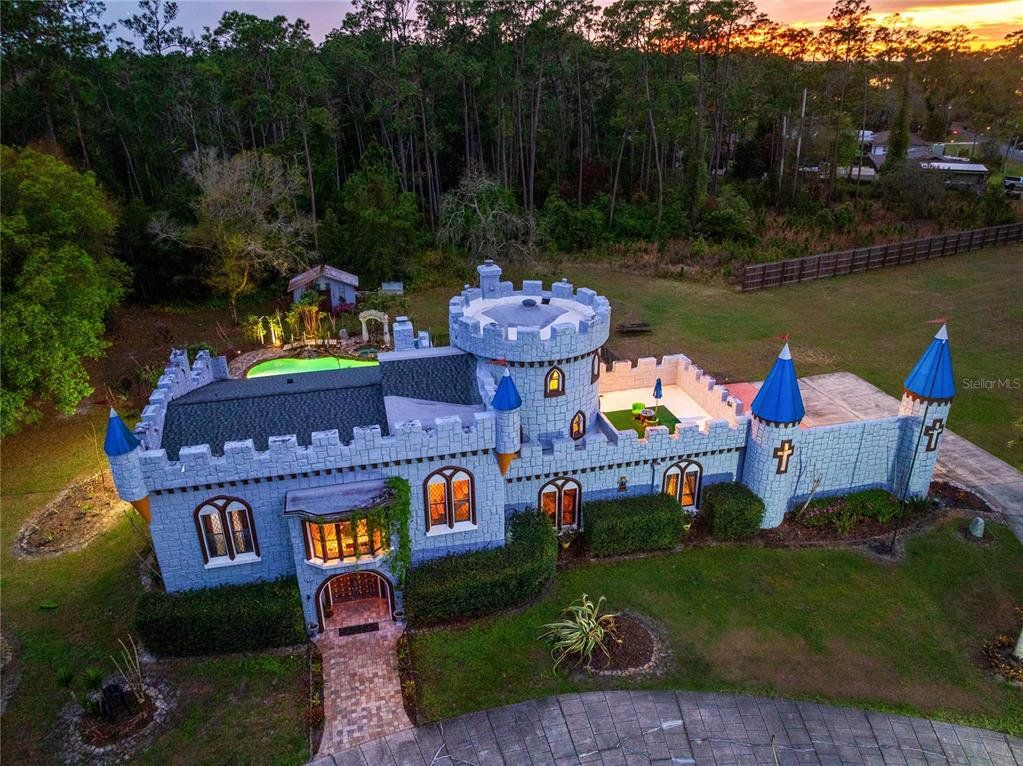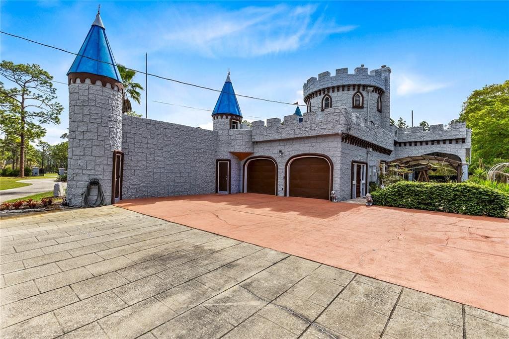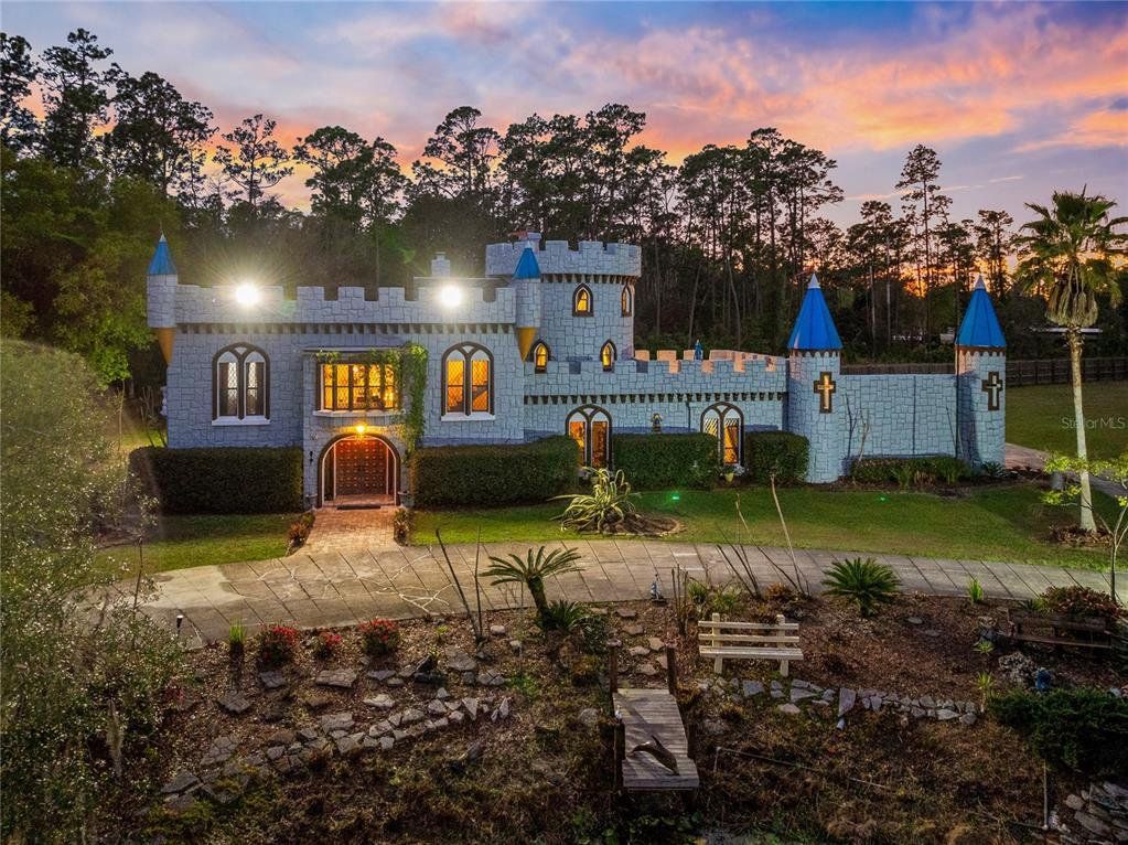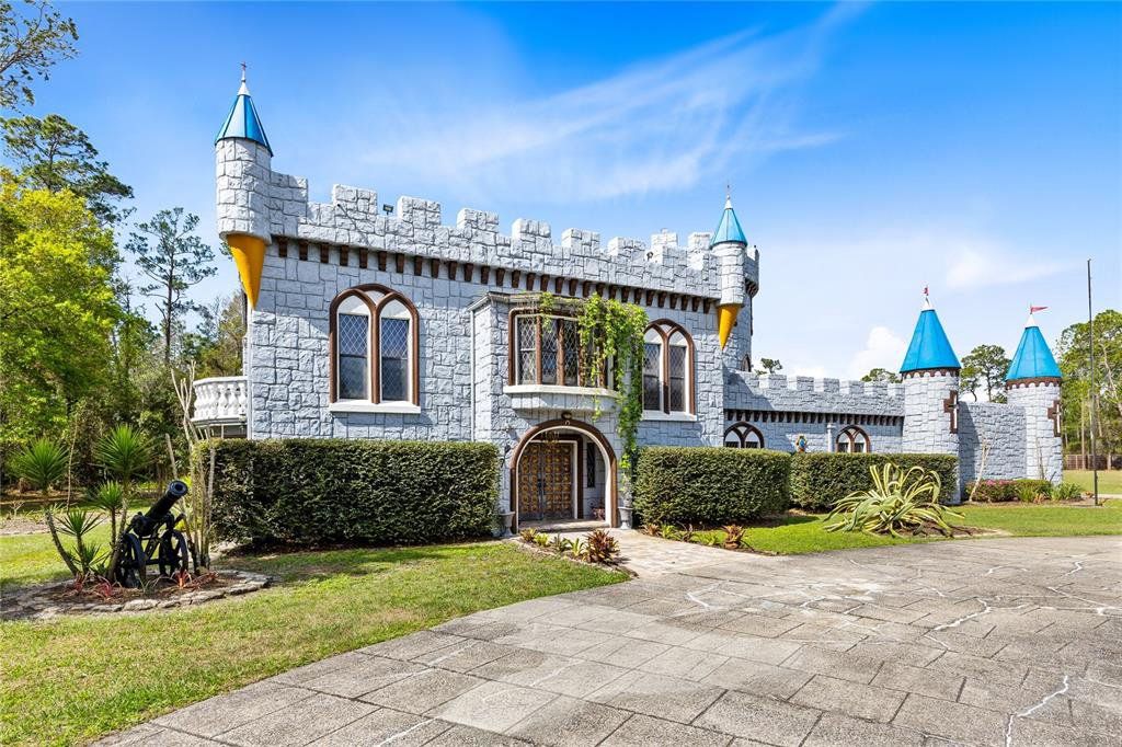 Set behind a gated entrance on 10 private acres in the sought after Lake Mary Jane area, this unforgettable castle estate is one of Central Florida’s rarest offerings. With 5 bedrooms, 3 full baths, 1 half bath, and 4,680 square feet of living space, the property blends striking architecture, expansive grounds, and a truly unique multi level layout into an experience that feels worlds away, yet remains within Orlando. From the moment you arrive, the circular drive, turrets, stone inspired façade, and walled entry create a dramatic sense of arrival. Inside, the home opens to a breathtaking foyer and family room with soaring ceilings, statement chandeliers, a grand fireplace, gothic inspired windows and doors, and an upper level overlook that instantly sets this home apart. The kitchen and dining area balance charm and function with extensive cabinetry, stone counters, stainless steel appliances, a gas range, and a bright bay window dining nook with peaceful views of the property. A separate first floor living room adds even more character with exposed wood beams, gothic style doors and windows, and seamless access to the outdoor living area. Nearby, a beautifully updated full bath features custom wood finishes, a vessel sink, and a walk in shower. Also on the main level, a spacious bedroom and separate flex room provide exceptional versatility for guests, multigenerational living, a private office, gym, or media space. The entire second level is dedicated to a remarkable primary suite unlike anything you see every day, featuring a dramatic round design, fireplace, private balcony, walk in closet, separate vanity area, and spacious bath with walk in shower. Above, a private upper level retreat within the suite adds even more character and can serve as a sitting room, reading nook, or secluded escape. The third level offers two additional bedrooms, each with its own Juliet balcony, along with a full bath and a versatile loft overlooking the grand foyer below. Outside, the lifestyle continues with an expansive covered lanai that feels like an outdoor great room, complete with castle inspired arches and generous room for lounging and entertaining. The resort style pool and spa create a spectacular backyard setting with a freeform design, beach entry, waterfall feature, stone accents, and an oversized paver deck surrounded by peaceful natural beauty. Zoned for horses and set on an extraordinary 10 acre homesite, this is more than a home, it is a private estate with storybook presence and unforgettable style.