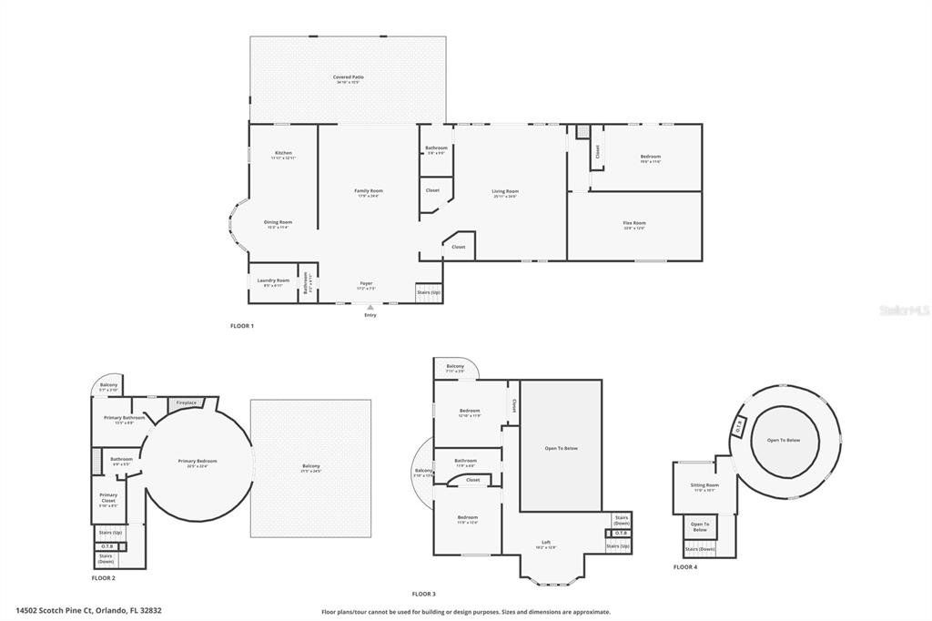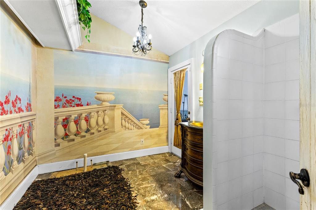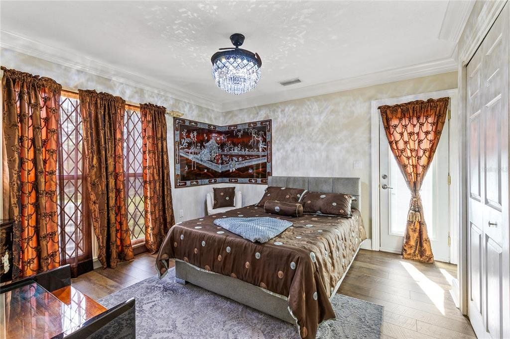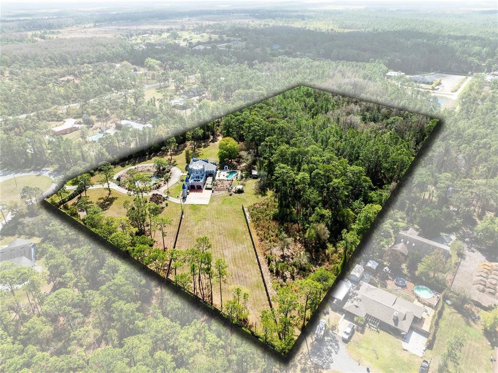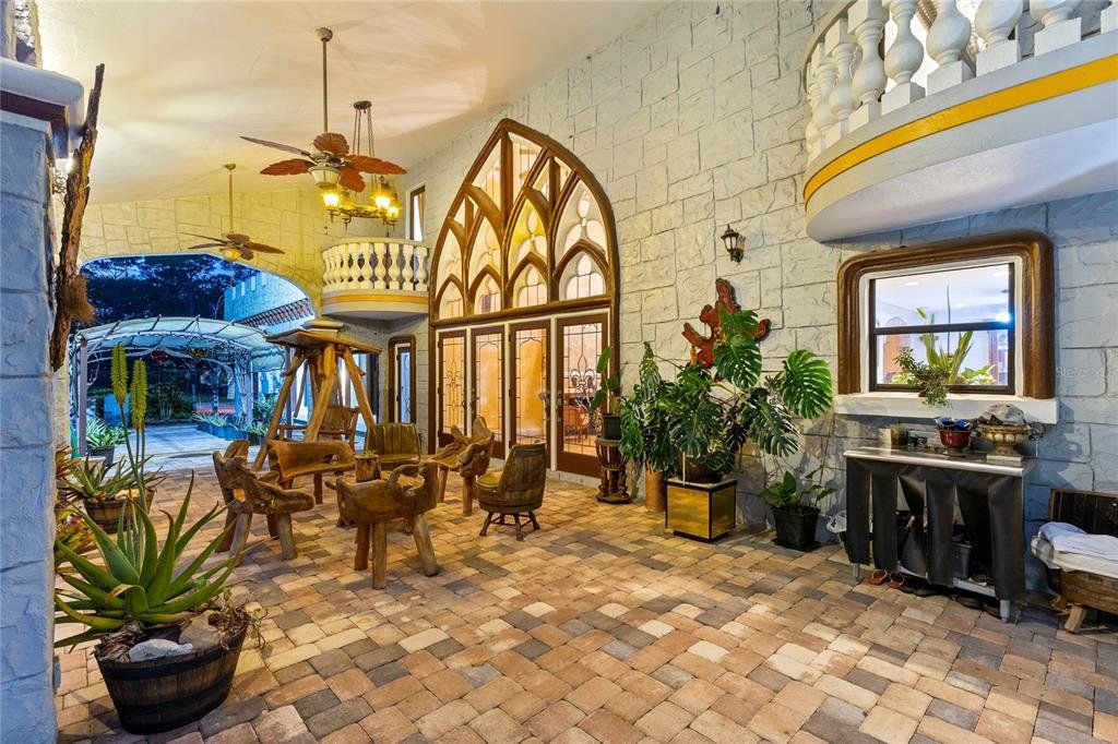 Set behind a gated entrance on 10 private acres in the sought after Lake Mary Jane area, this unforgettable castle estate is one of Central Florida’s rarest offerings. With 5 bedrooms, 3 full baths, 1 half bath, and 4,680 square feet of living space, the property blends striking architecture, expansive grounds, and a truly unique multi level layout into an experience that feels worlds away, yet remains within Orlando. From the moment you arrive, the circular drive, turrets, stone inspired façade, and walled entry create a dramatic sense of arrival. Inside, the home opens to a breathtaking foyer and family room with soaring ceilings, statement chandeliers, a grand fireplace, gothic inspired windows and doors, and an upper level overlook that instantly sets this home apart. The kitchen and dining area balance charm and function with extensive cabinetry, stone counters, stainless steel appliances, a gas range, and a bright bay window dining nook with peaceful views of the property. A separate first floor living room adds even more character with exposed wood beams, gothic style doors and windows, and seamless access to the outdoor living area. Nearby, a beautifully updated full bath features custom wood finishes, a vessel sink, and a walk in shower. Also on the main level, a spacious bedroom and separate flex room provide exceptional versatility for guests, multigenerational living, a private office, gym, or media space. The entire second level is dedicated to a remarkable primary suite unlike anything you see every day, featuring a dramatic round design, fireplace, private balcony, walk in closet, separate vanity area, and spacious bath with walk in shower. Above, a private upper level retreat within the suite adds even more character and can serve as a sitting room, reading nook, or secluded escape. The third level offers two additional bedrooms, each with its own Juliet balcony, along with a full bath and a versatile loft overlooking the grand foyer below. Outside, the lifestyle continues with an expansive covered lanai that feels like an outdoor great room, complete with castle inspired arches and generous room for lounging and entertaining. The resort style pool and spa create a spectacular backyard setting with a freeform design, beach entry, waterfall feature, stone accents, and an oversized paver deck surrounded by peaceful natural beauty. Zoned for horses and set on an extraordinary 10 acre homesite, this is more than a home, it is a private estate with storybook presence and unforgettable style.