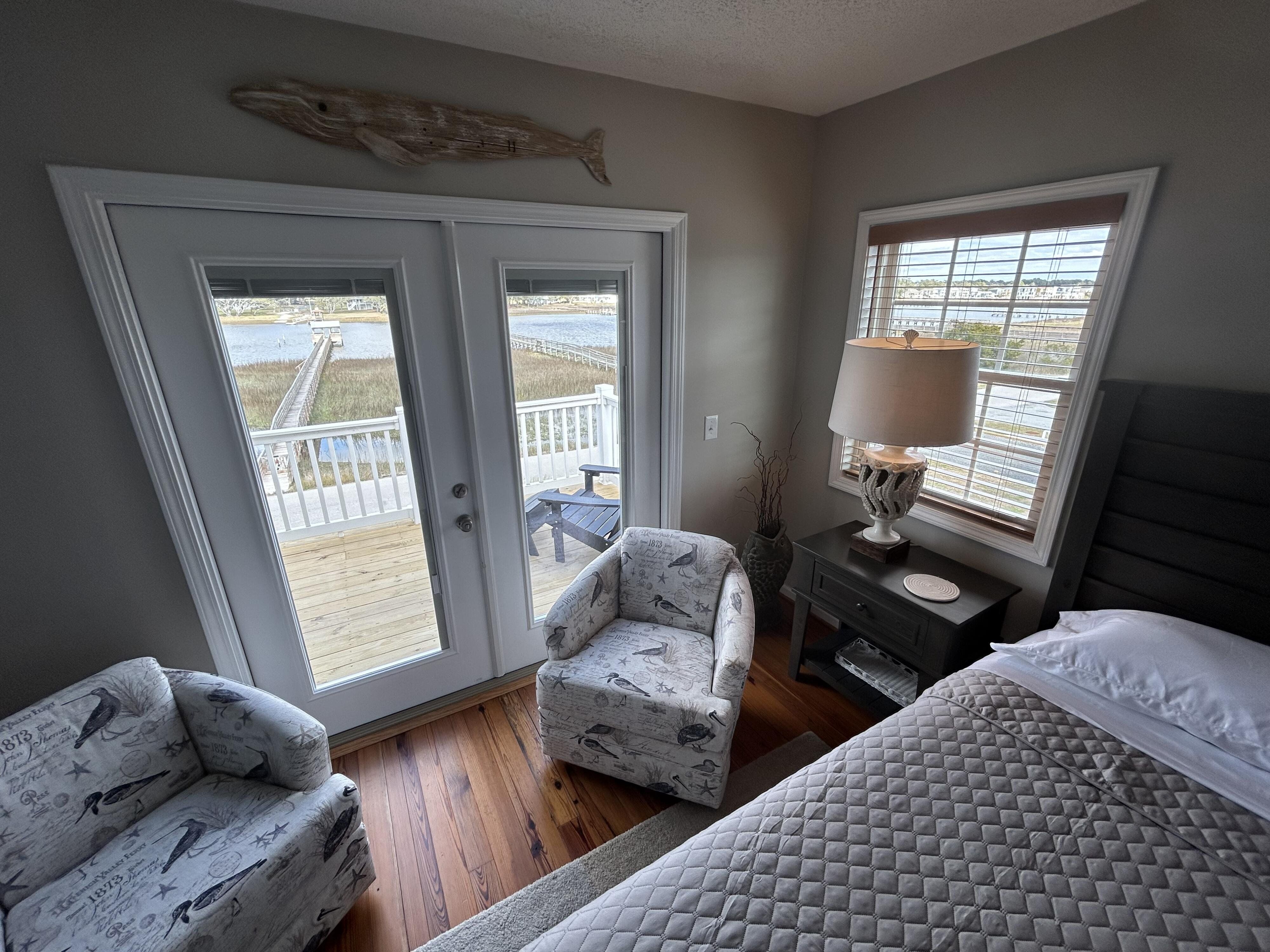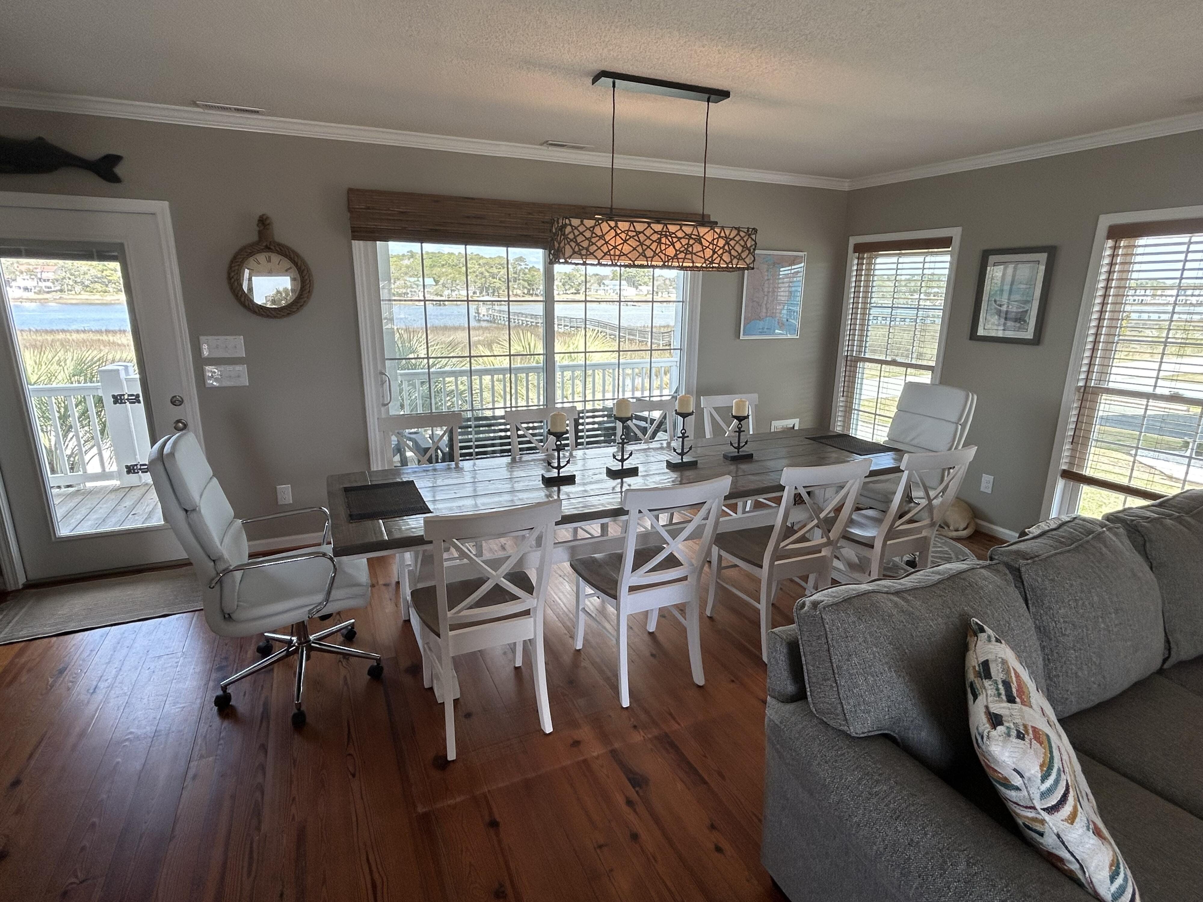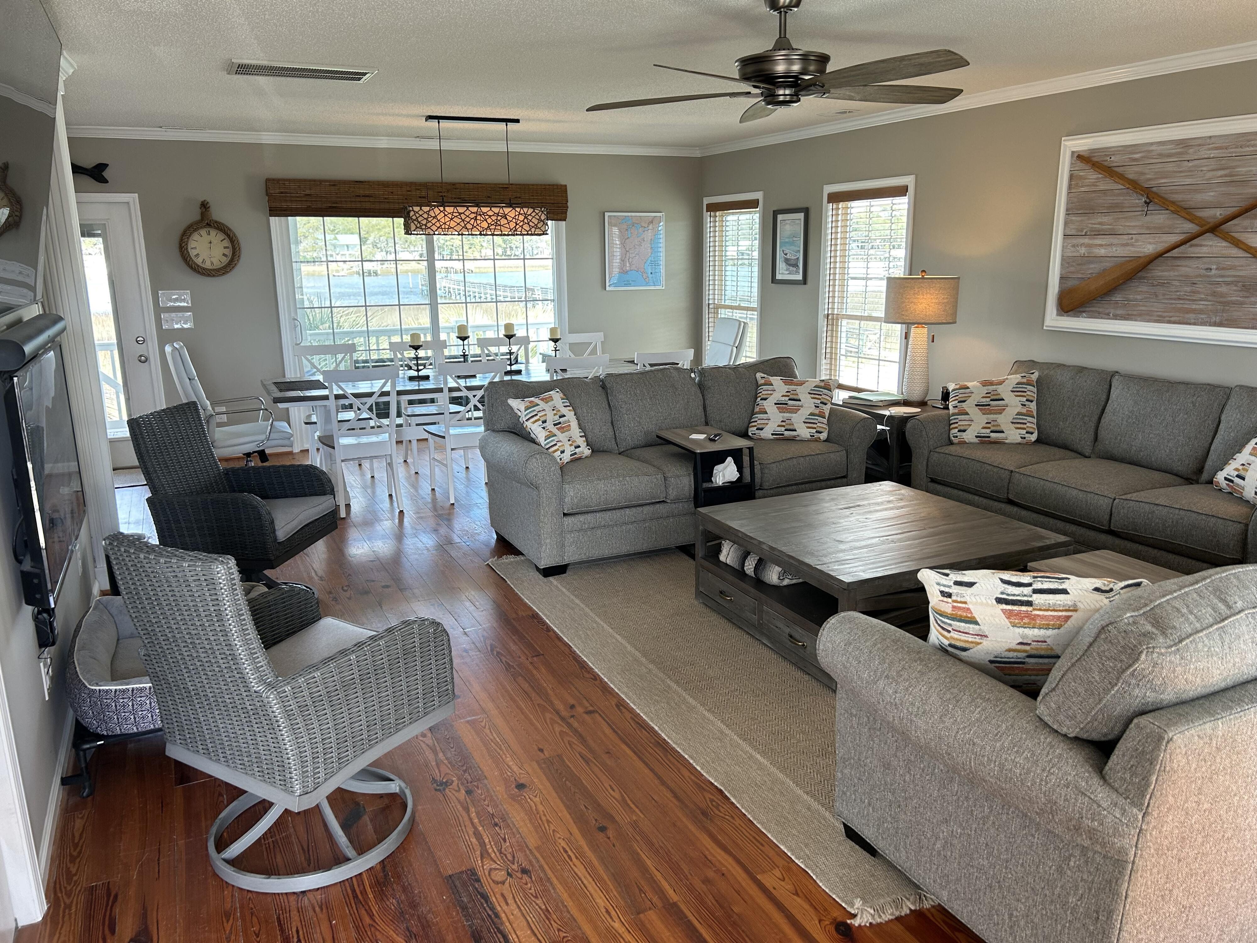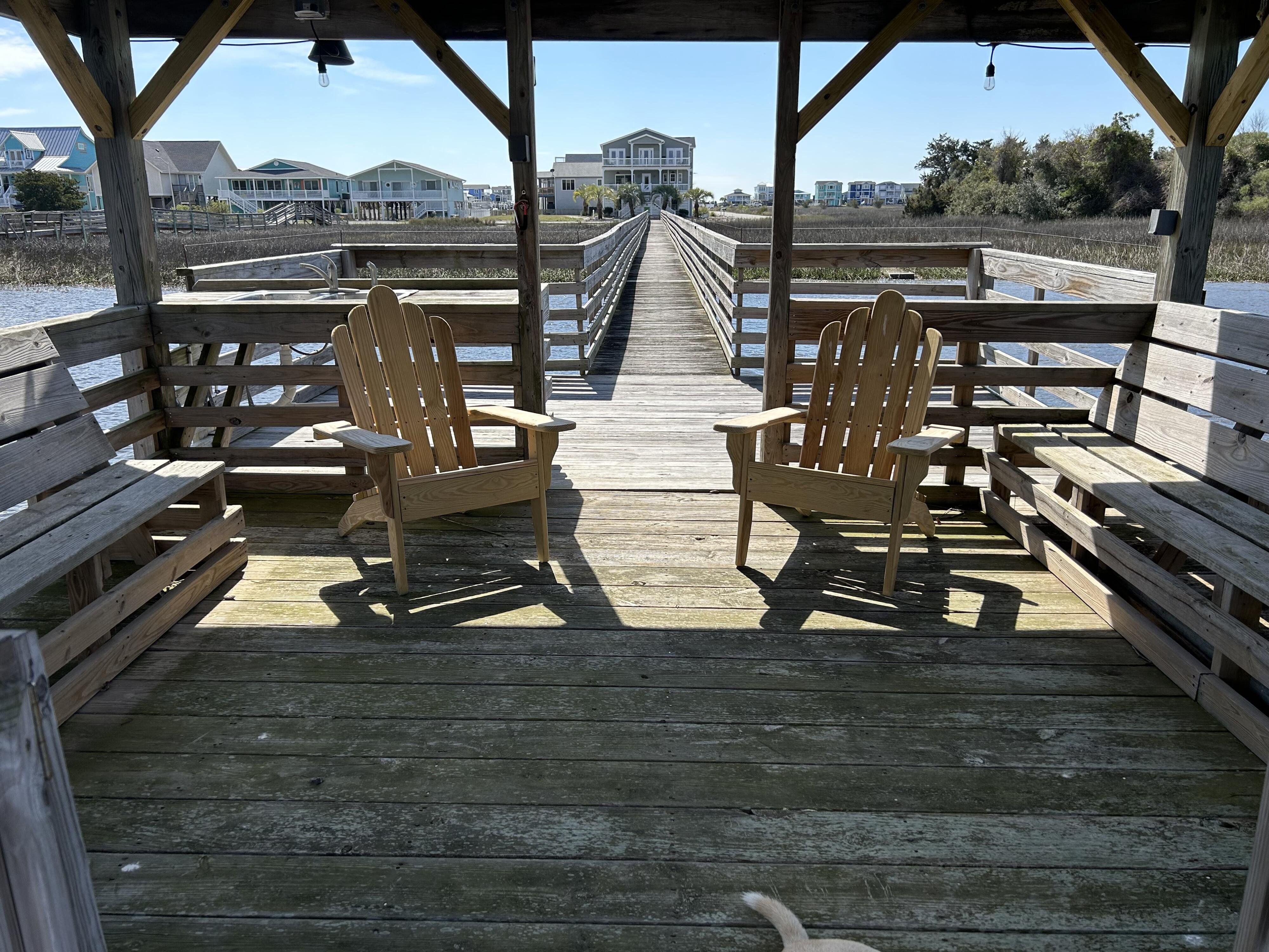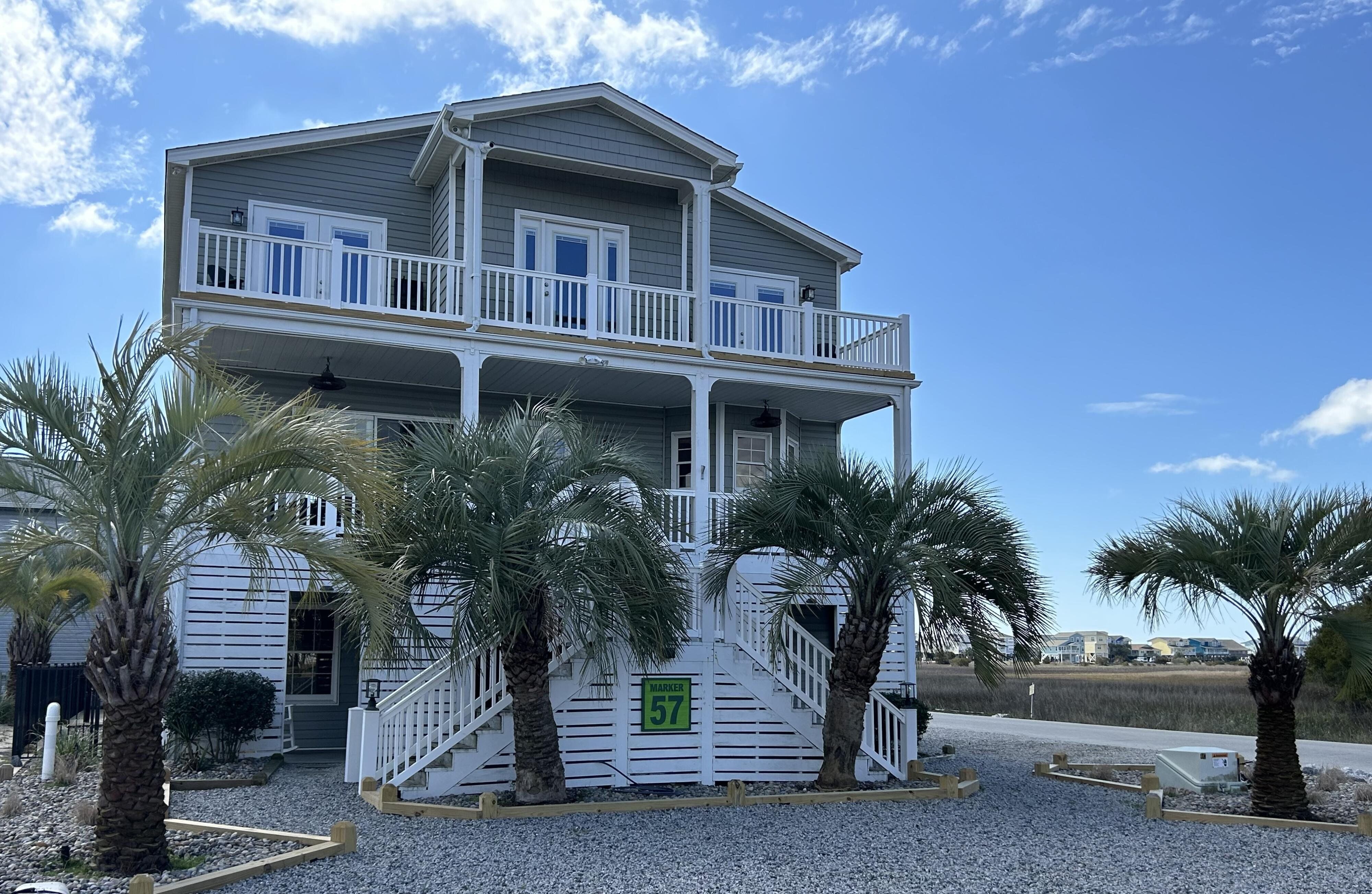 Marker 57 in NOT a canal house. This home is on the actual Intracoastal Waterway with wide open sweeping views with a dock and gazebo with both sunrise and sunset views up and down the waterway that you just don't get from canal houses. Watching the yacht migration each spring and fall never gets old. Fishing, sunning and socializing is a completely different experience here than on a canal. ... Marker 57 is an easy 5 minuet walk to the beach along a 50 acre green marsh arriving at the General Store and Haley's Ice Cream right on the beach. The neighboring marsh and wonderful tidal creek that wrap around the house are features that few homes have and make this place special. Large waterfowl have a thoroughfare between the house and marsh island trees and sore right by the porch corners and kitchen windows. The creek is full of baitfish and attracts a lot of sea birds. Watching the tide come and go in and out of the creek every day is very satisfying. ... Marker 57 is professionally decorated in a casual nautical theme and comes with all new (as of 2024) furniture, decor, 9 large TV's, 12 appliances, 8 quality mattresses, and much more. ... Marker 57 is 5 bedrooms counting the Bunk Room. It sleeps 4 and has 10 large drawers for clothing and hanging space in the hall. There is also a half bath in the hall. All 5 bedrooms have glass doors leading to various different balconies. The house has 5 toilets and 5 showers all total. The tankless gas water heater provides endless hot water to all 5 showers at the same time. ... Marker 57 having no canal in the back yard allows the wonderful pool with a big marsh view. The gas pool heater is so powerful it will heat the water in just a few hours. The adjacent enclosed ground level of the house is not part of the heated square footage but is a significant feature of the house. With the game area, TV room full bath, direct access to the pool and front patio, it becomes Grand Central Hangout.