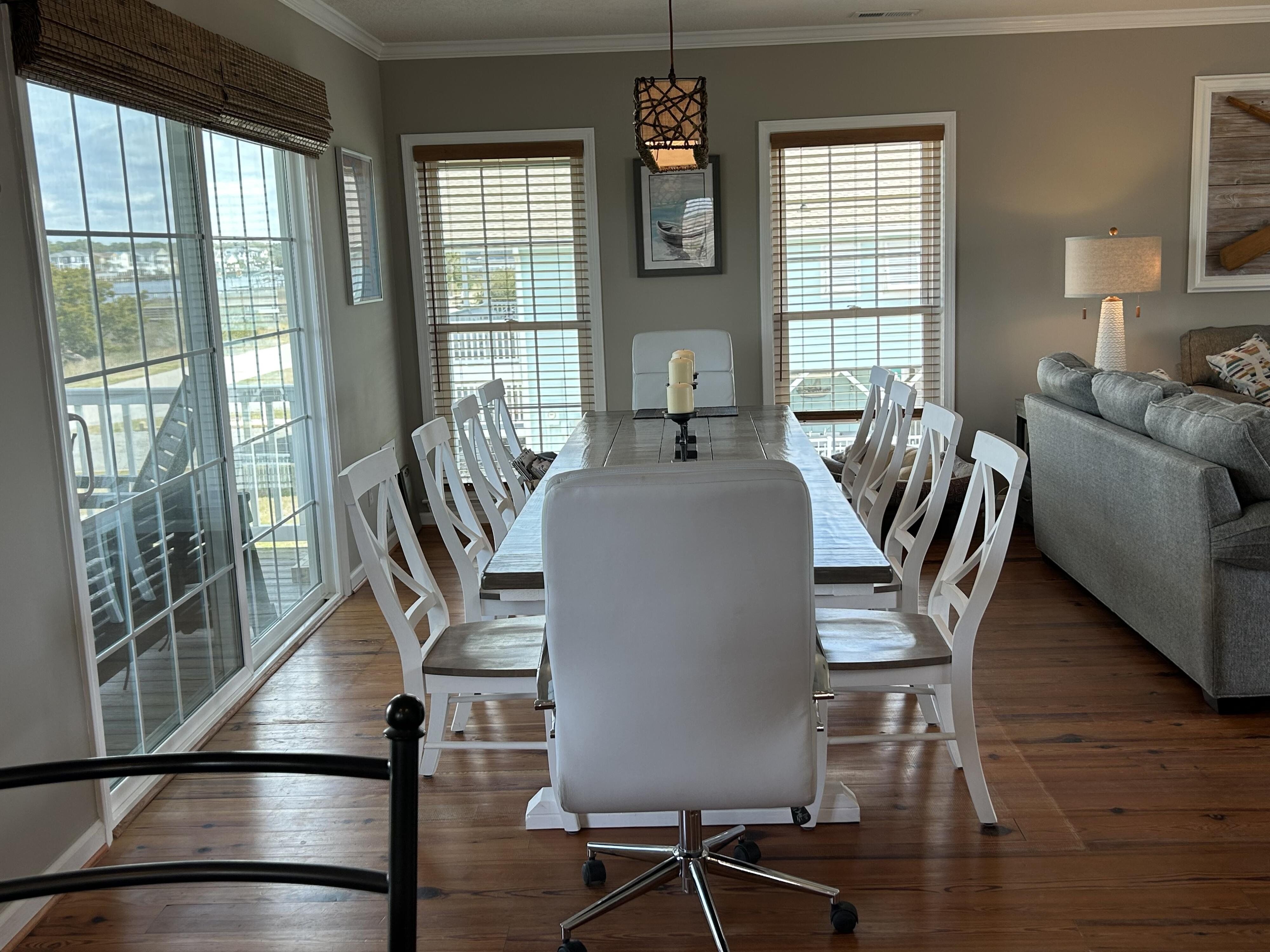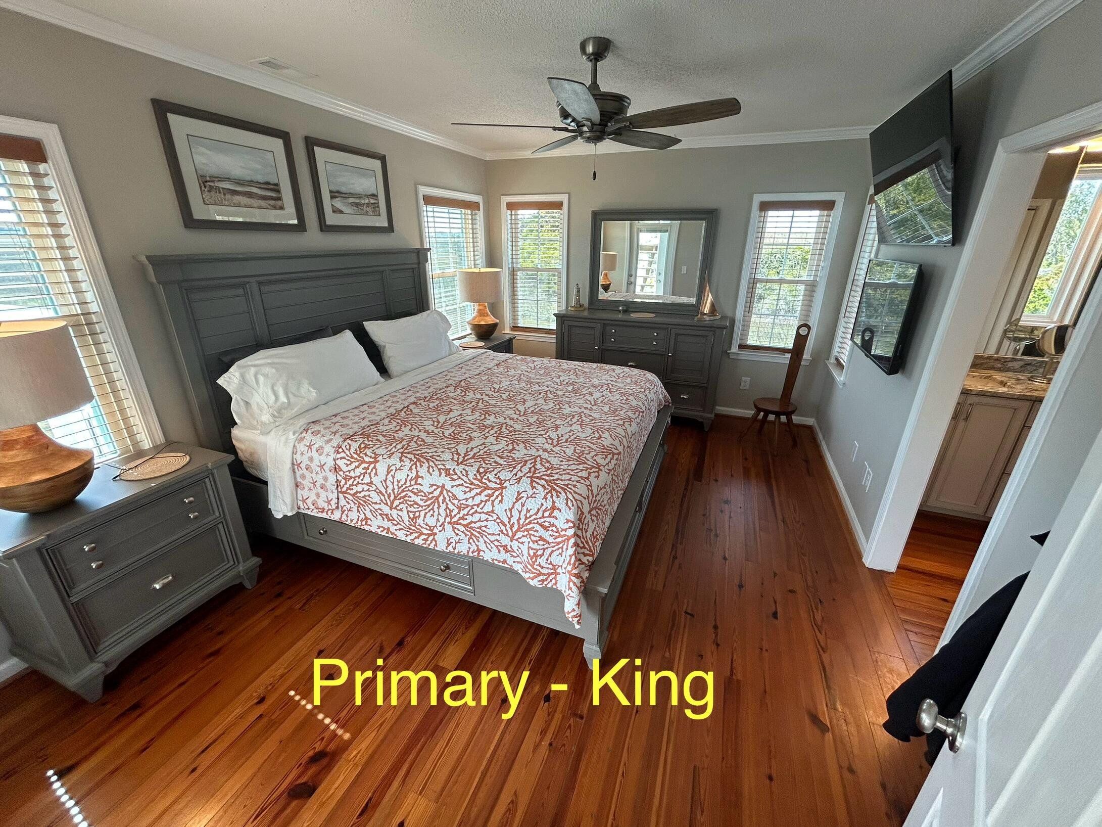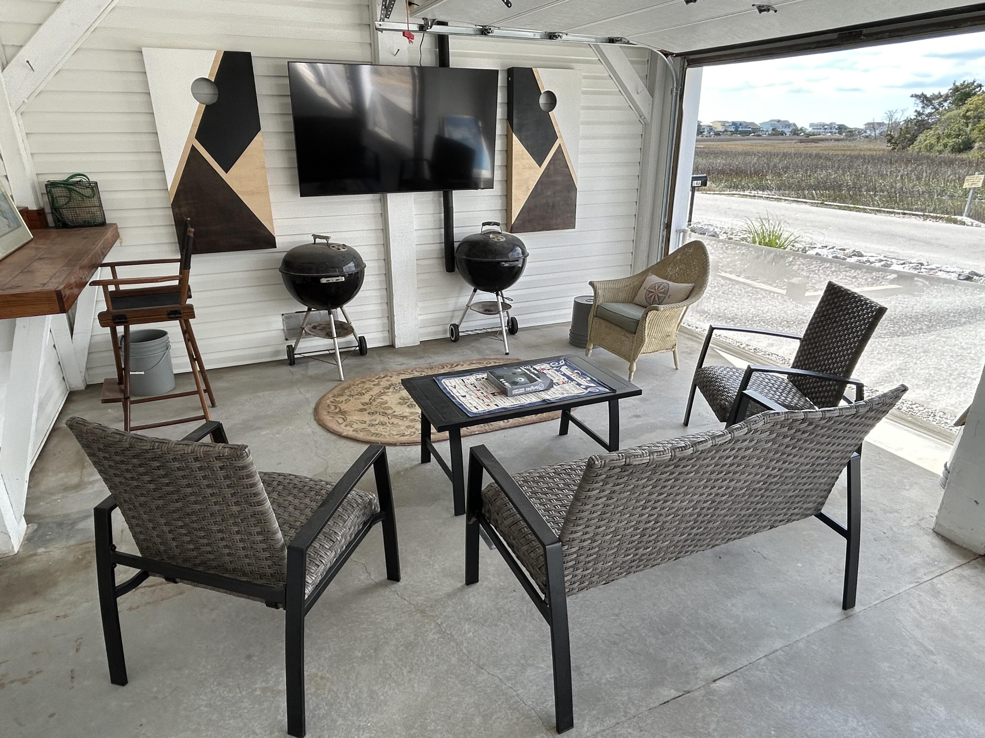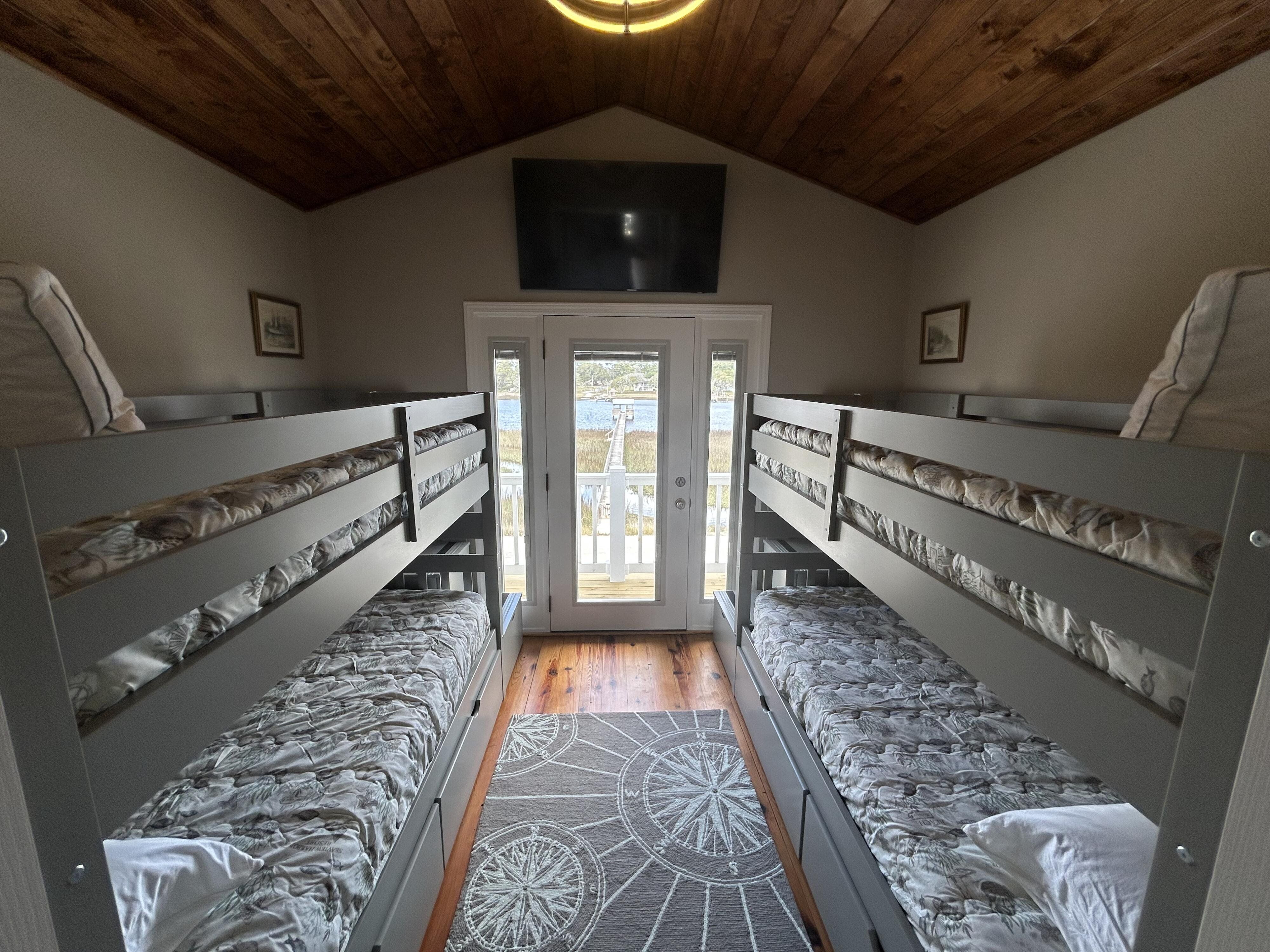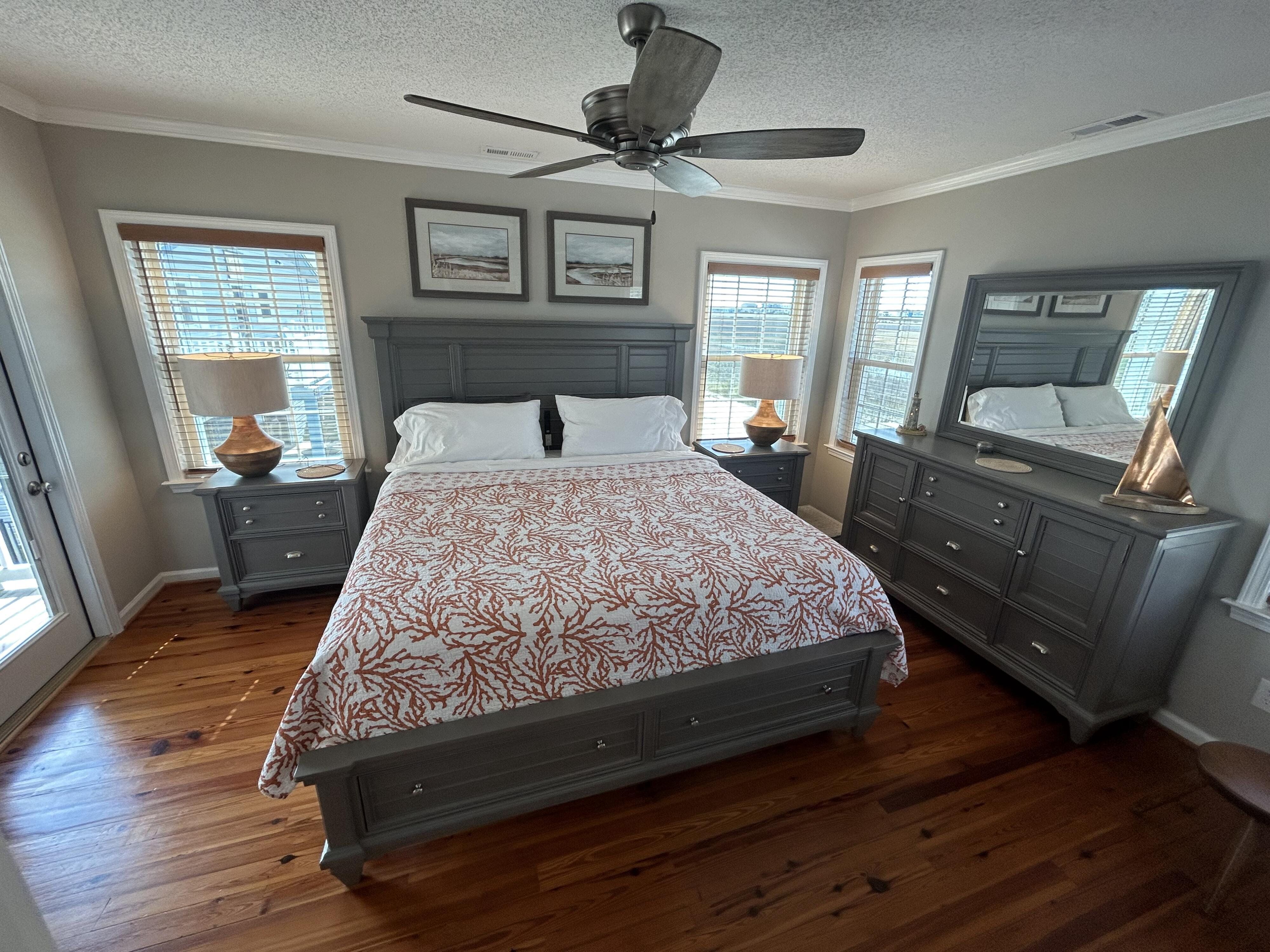 Marker 57 in NOT a canal house. This home is on the actual Intracoastal Waterway with wide open sweeping views with a dock and gazebo with both sunrise and sunset views up and down the waterway that you just don't get from canal houses. Watching the yacht migration each spring and fall never gets old. Fishing, sunning and socializing is a completely different experience here than on a canal. ... Marker 57 is an easy 5 minuet walk to the beach along a 50 acre green marsh arriving at the General Store and Haley's Ice Cream right on the beach. The neighboring marsh and wonderful tidal creek that wrap around the house are features that few homes have and make this place special. Large waterfowl have a thoroughfare between the house and marsh island trees and sore right by the porch corners and kitchen windows. The creek is full of baitfish and attracts a lot of sea birds. Watching the tide come and go in and out of the creek every day is very satisfying. ... Marker 57 is professionally decorated in a casual nautical theme and comes with all new (as of 2024) furniture, decor, 9 large TV's, 12 appliances, 8 quality mattresses, and much more. ... Marker 57 is 5 bedrooms counting the Bunk Room. It sleeps 4 and has 10 large drawers for clothing and hanging space in the hall. There is also a half bath in the hall. All 5 bedrooms have glass doors leading to various different balconies. The house has 5 toilets and 5 showers all total. The tankless gas water heater provides endless hot water to all 5 showers at the same time. ... Marker 57 having no canal in the back yard allows the wonderful pool with a big marsh view. The gas pool heater is so powerful it will heat the water in just a few hours. The adjacent enclosed ground level of the house is not part of the heated square footage but is a significant feature of the house. With the game area, TV room full bath, direct access to the pool and front patio, it becomes Grand Central Hangout.