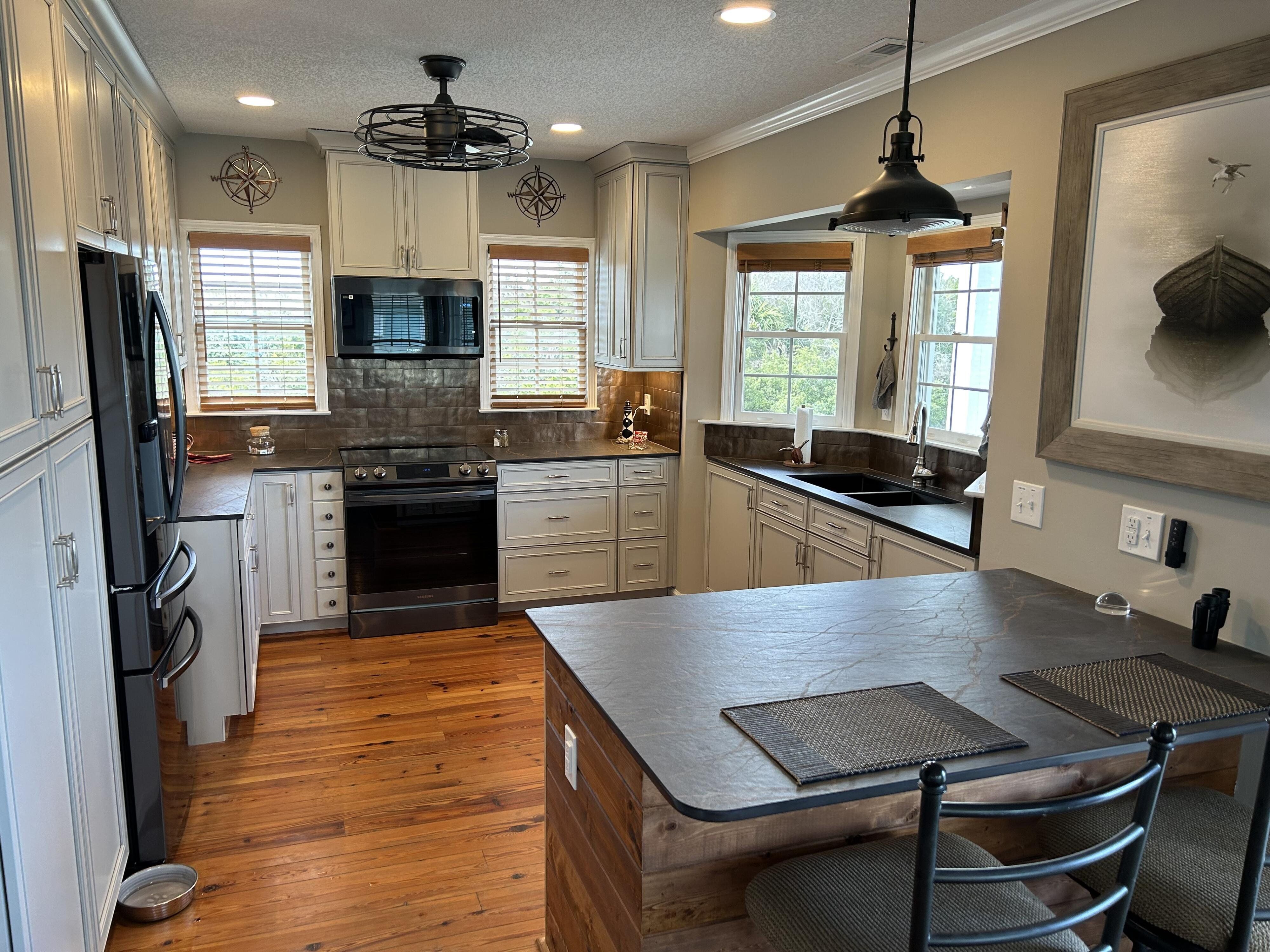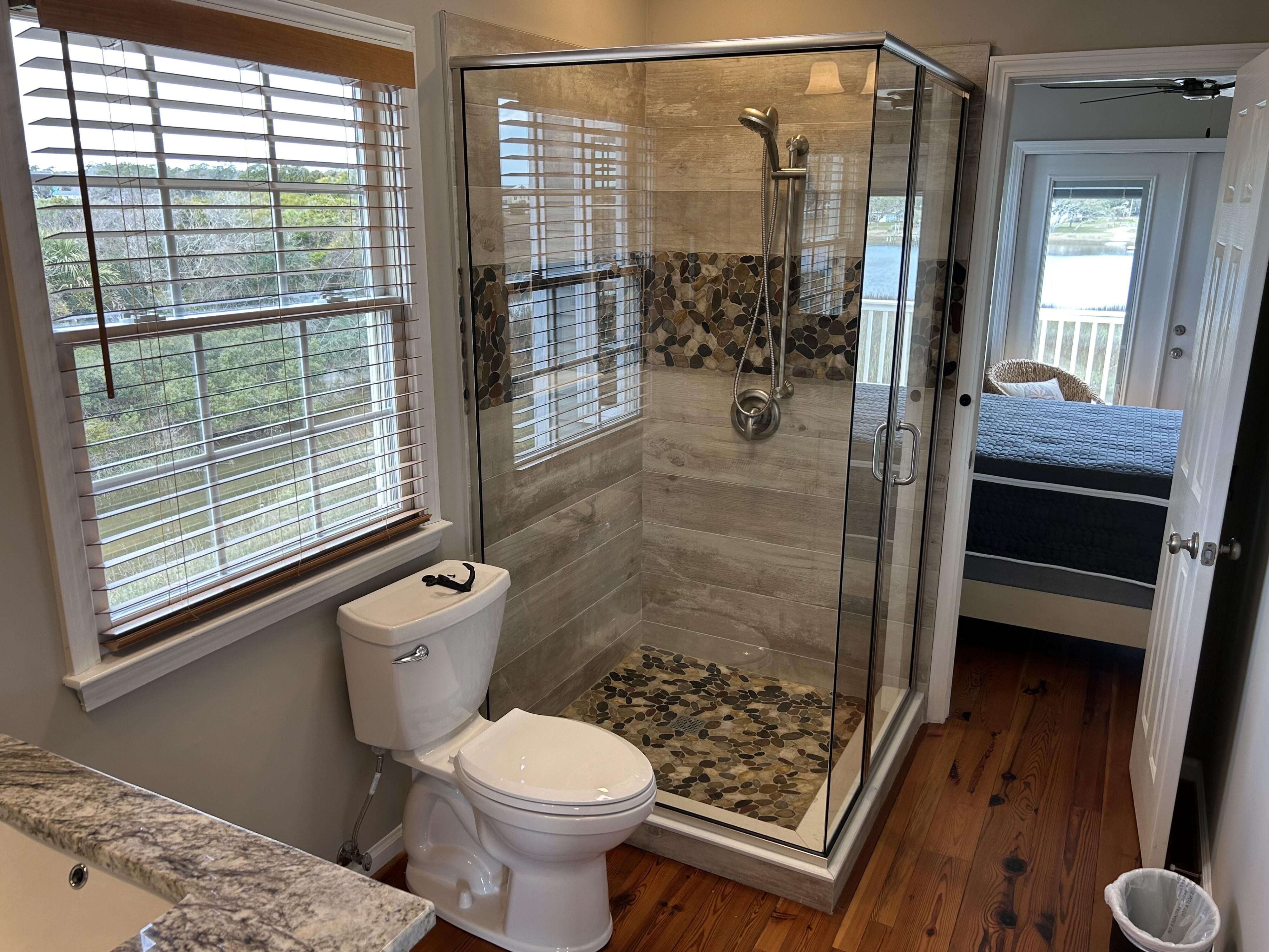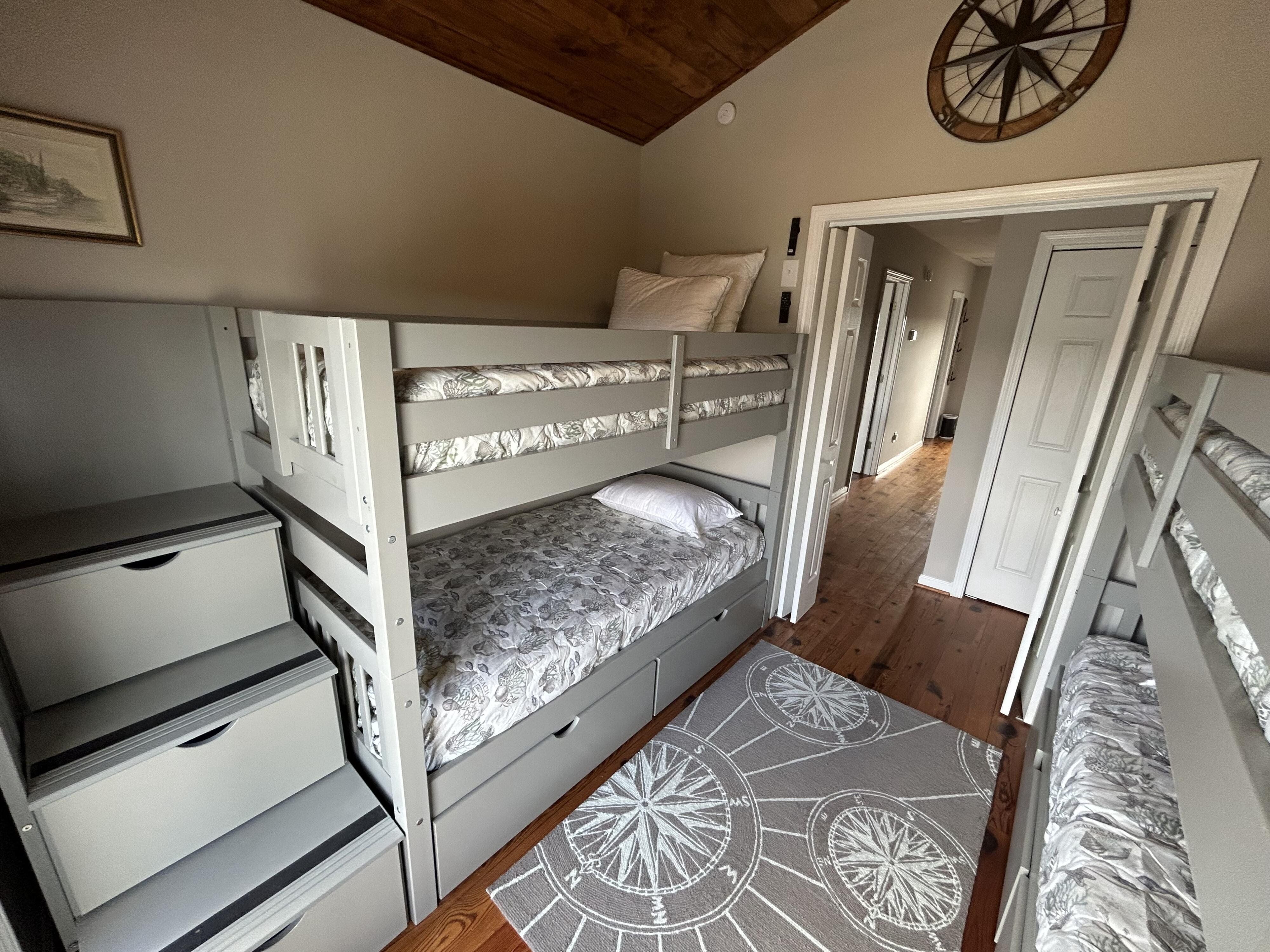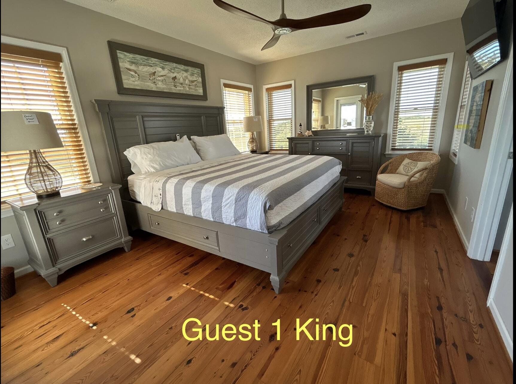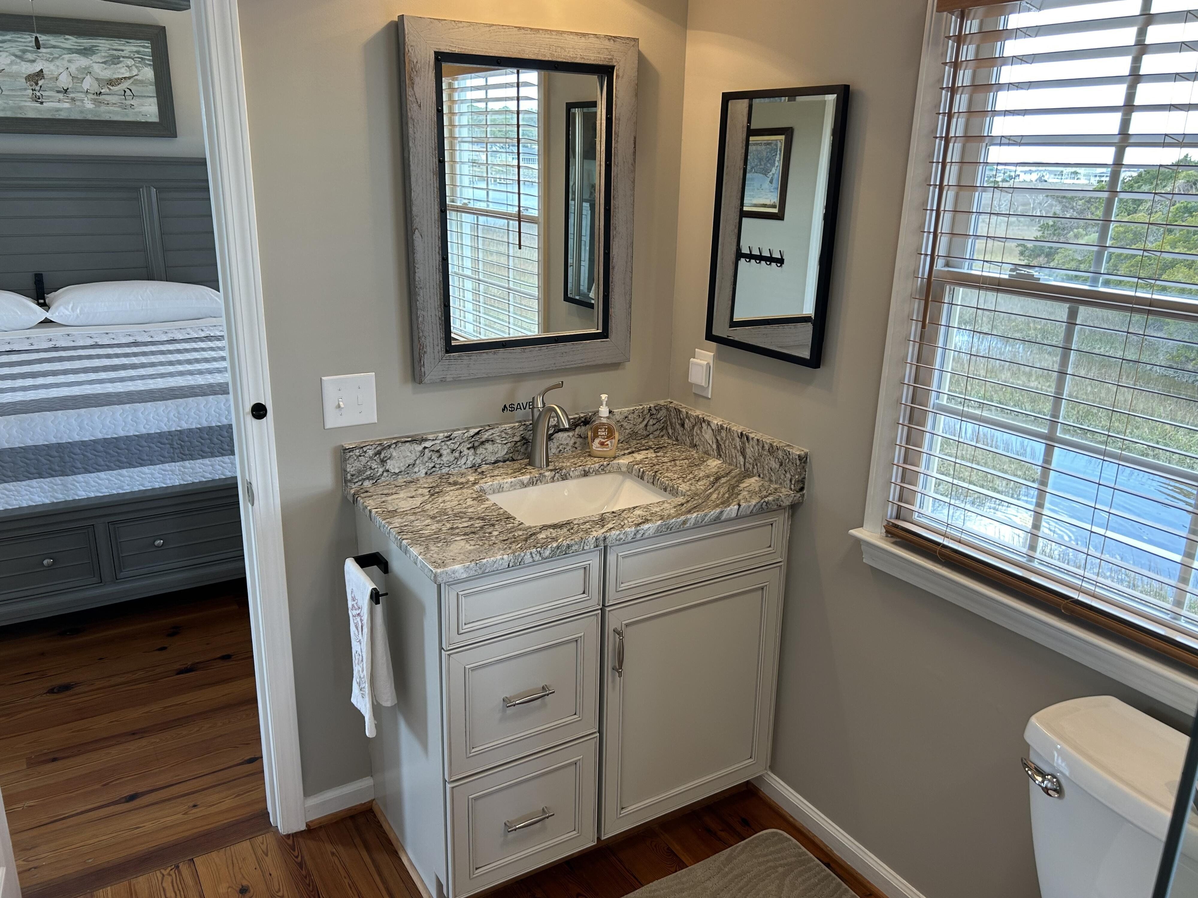 Marker 57 in NOT a canal house. This home is on the actual Intracoastal Waterway with wide open sweeping views with a dock and gazebo with both sunrise and sunset views up and down the waterway that you just don't get from canal houses. Watching the yacht migration each spring and fall never gets old. Fishing, sunning and socializing is a completely different experience here than on a canal. ... Marker 57 is an easy 5 minuet walk to the beach along a 50 acre green marsh arriving at the General Store and Haley's Ice Cream right on the beach. The neighboring marsh and wonderful tidal creek that wrap around the house are features that few homes have and make this place special. Large waterfowl have a thoroughfare between the house and marsh island trees and sore right by the porch corners and kitchen windows. The creek is full of baitfish and attracts a lot of sea birds. Watching the tide come and go in and out of the creek every day is very satisfying. ... Marker 57 is professionally decorated in a casual nautical theme and comes with all new (as of 2024) furniture, decor, 9 large TV's, 12 appliances, 8 quality mattresses, and much more. ... Marker 57 is 5 bedrooms counting the Bunk Room. It sleeps 4 and has 10 large drawers for clothing and hanging space in the hall. There is also a half bath in the hall. All 5 bedrooms have glass doors leading to various different balconies. The house has 5 toilets and 5 showers all total. The tankless gas water heater provides endless hot water to all 5 showers at the same time. ... Marker 57 having no canal in the back yard allows the wonderful pool with a big marsh view. The gas pool heater is so powerful it will heat the water in just a few hours. The adjacent enclosed ground level of the house is not part of the heated square footage but is a significant feature of the house. With the game area, TV room full bath, direct access to the pool and front patio, it becomes Grand Central Hangout.