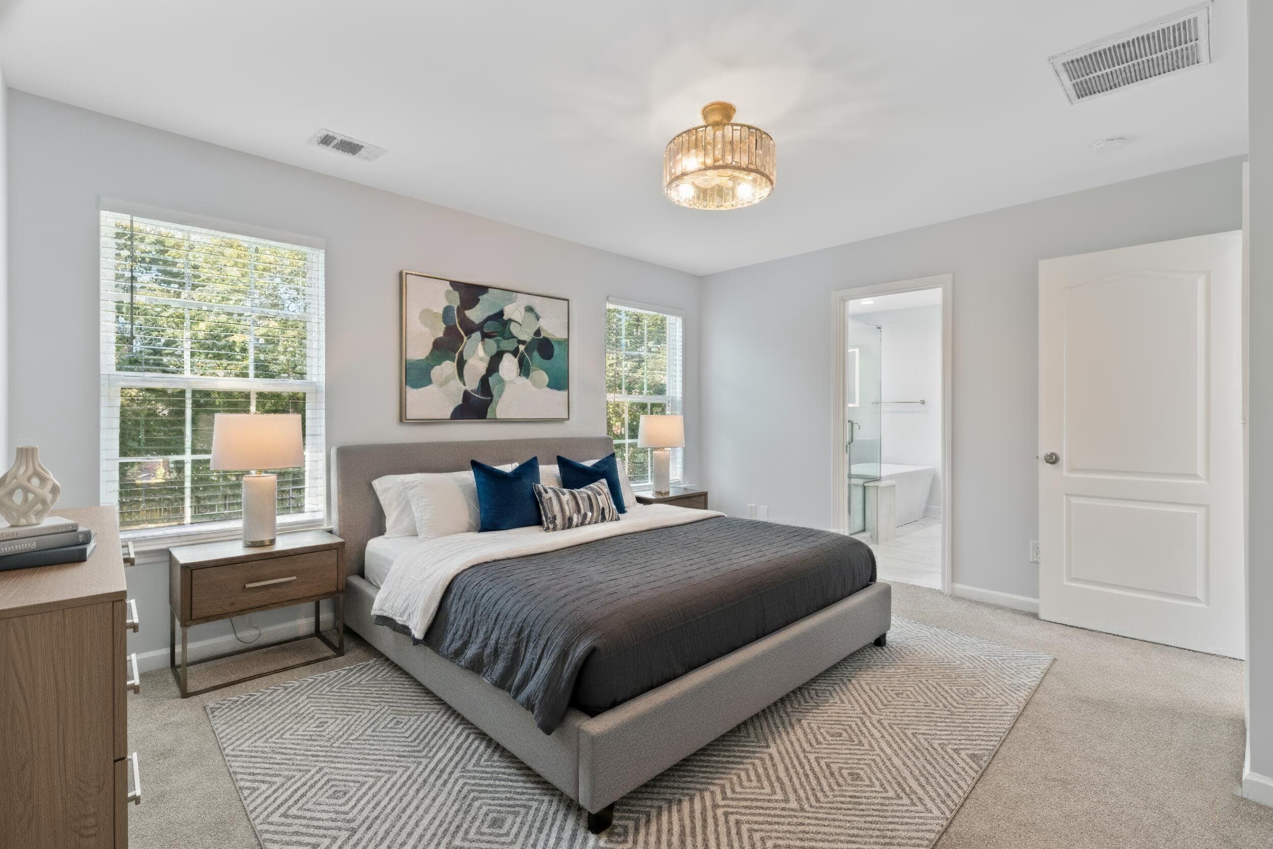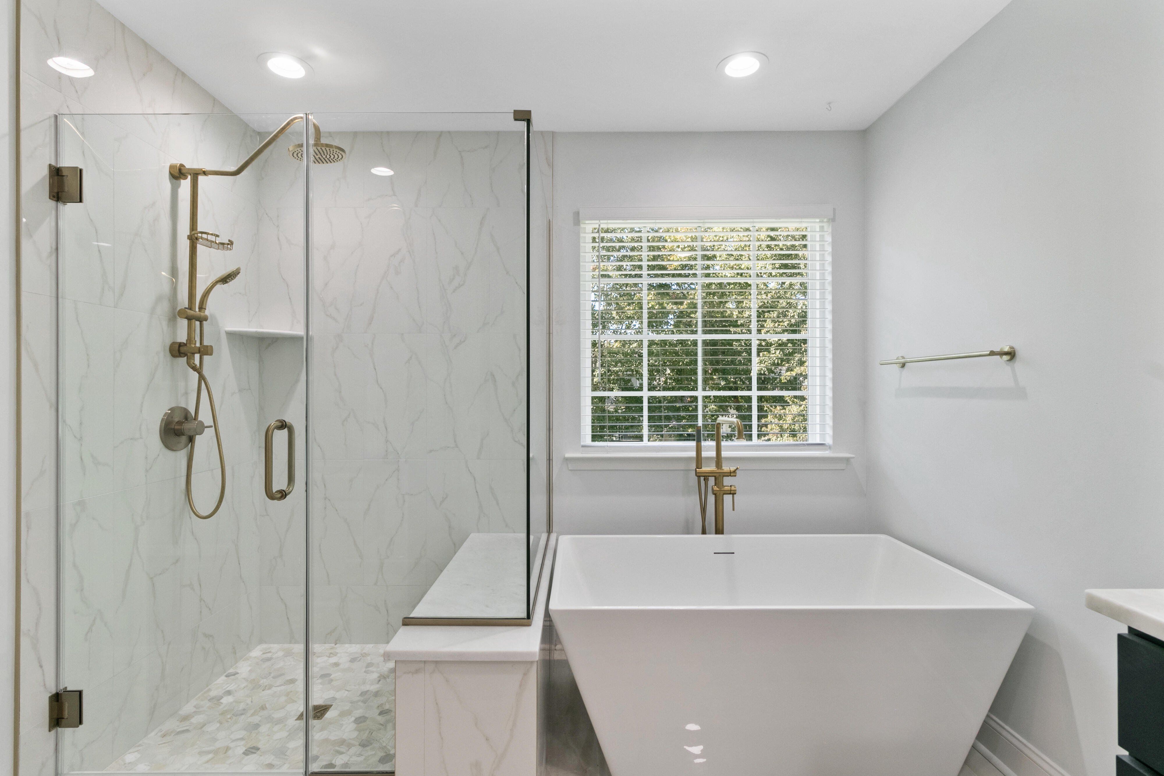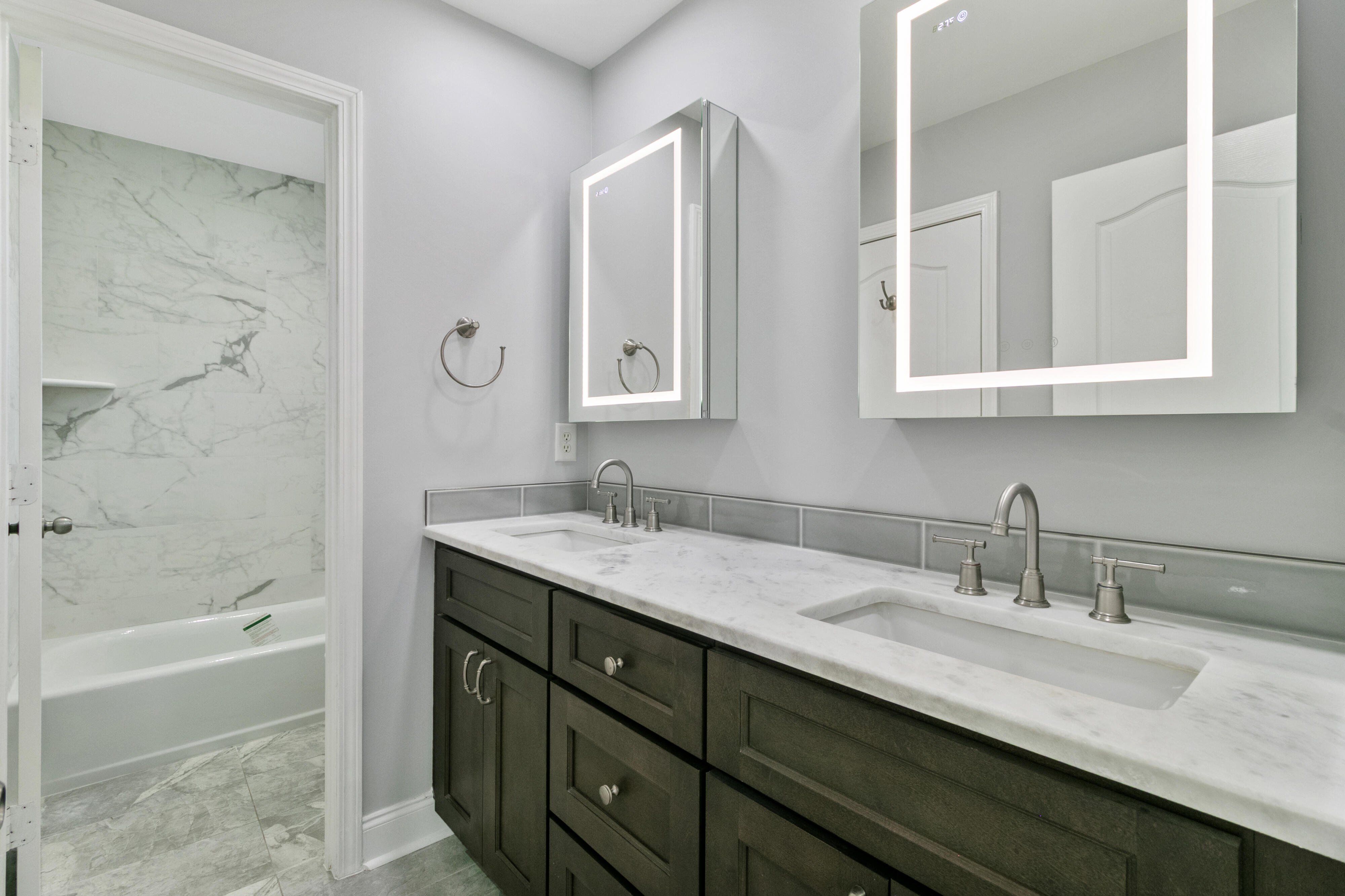 Thoughtfully remodeled by designer/owners for family, this home features engineered hardwoods throughout the first floor and an open living room. The kitchen boasts leathered Quartzite counters, subway tile with glass mosaic accent, stainless vent hood, ample storage, and all-new stainless appliances. A laundry/mudroom with hookups and cabinet storage. The powder room shines with Quartzite vanity, Italian porcelain tile, Champagne Gold fixtures, and LED-lit cabinet. Upstairs, the master suite includes a crystal fan, spa bath with porcelain tile, rain shower, frameless glass door, freestanding tub, dual Quartzite vanities, his-and-her LED cabinets, water closet, and walk-in closet with organizer. Two bedrooms share a Jack-and-Jill bath with Quartzite vanity, dual sinks, tiled tub/shower,