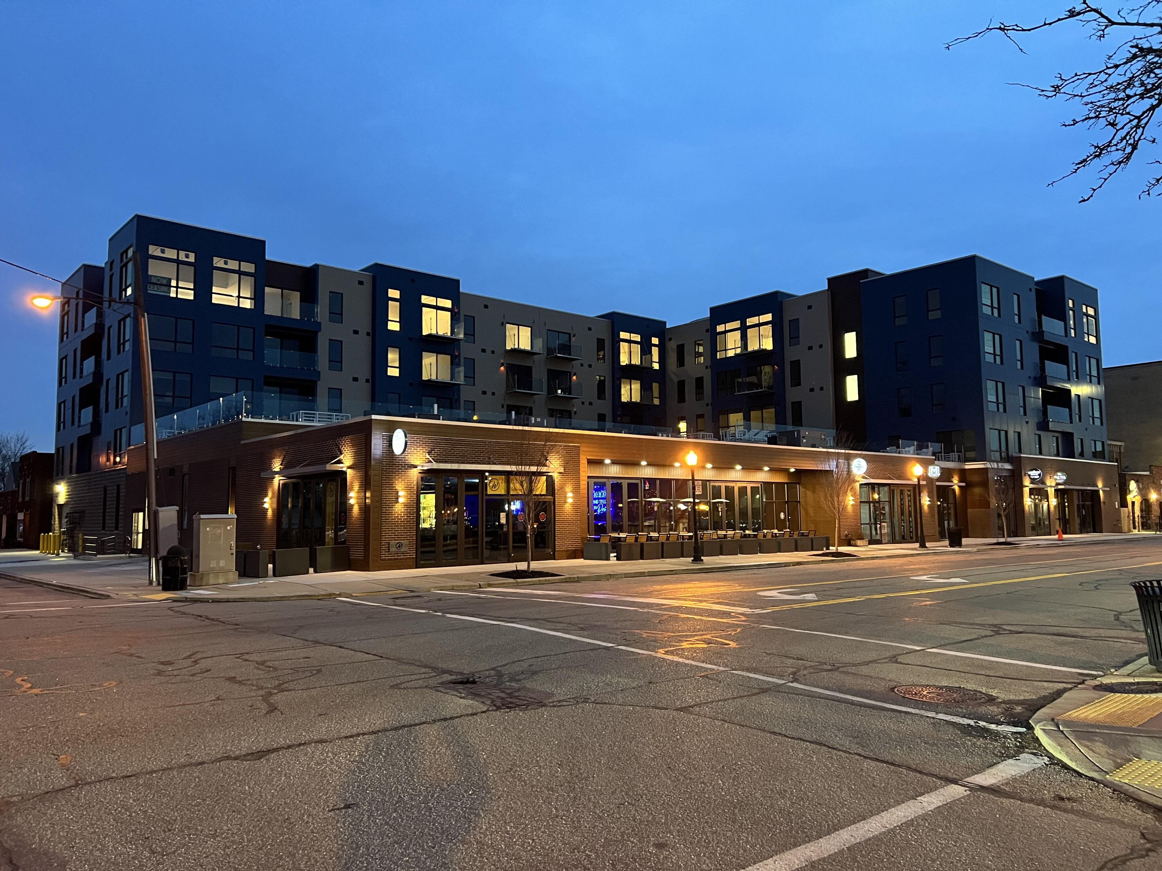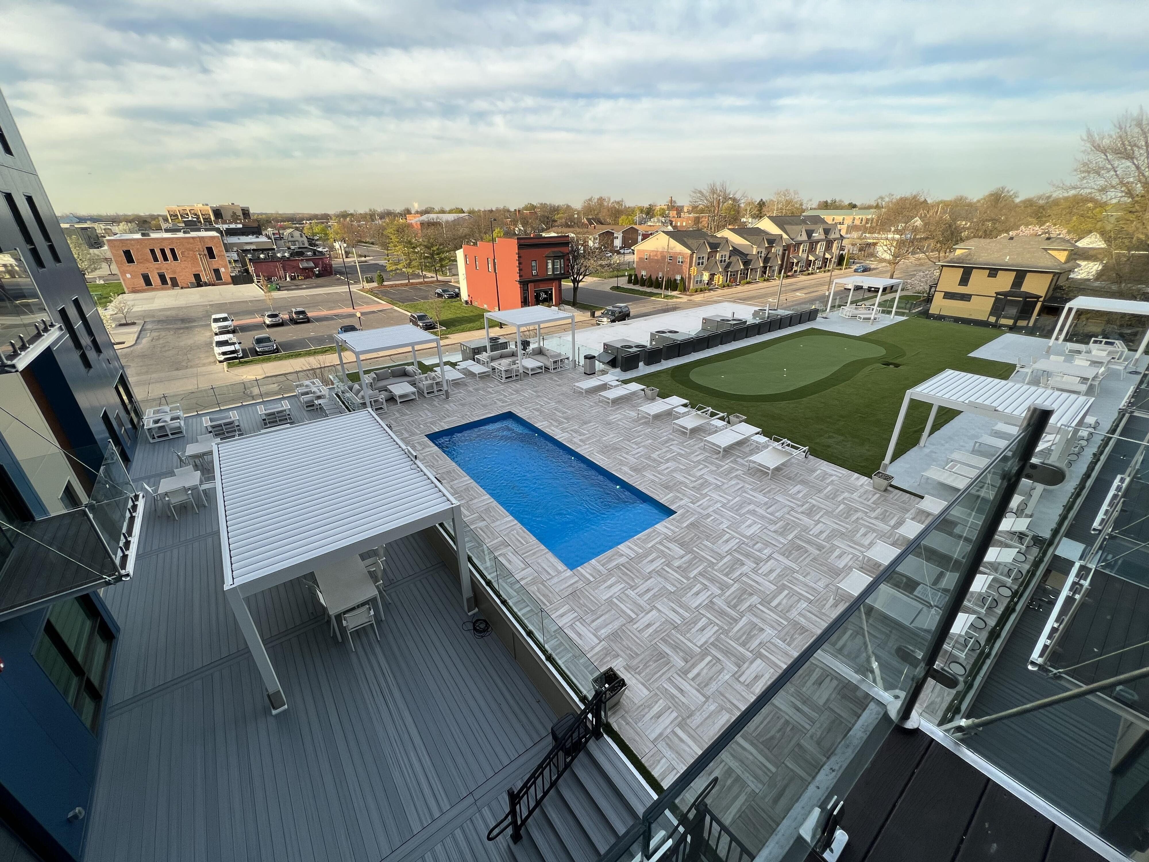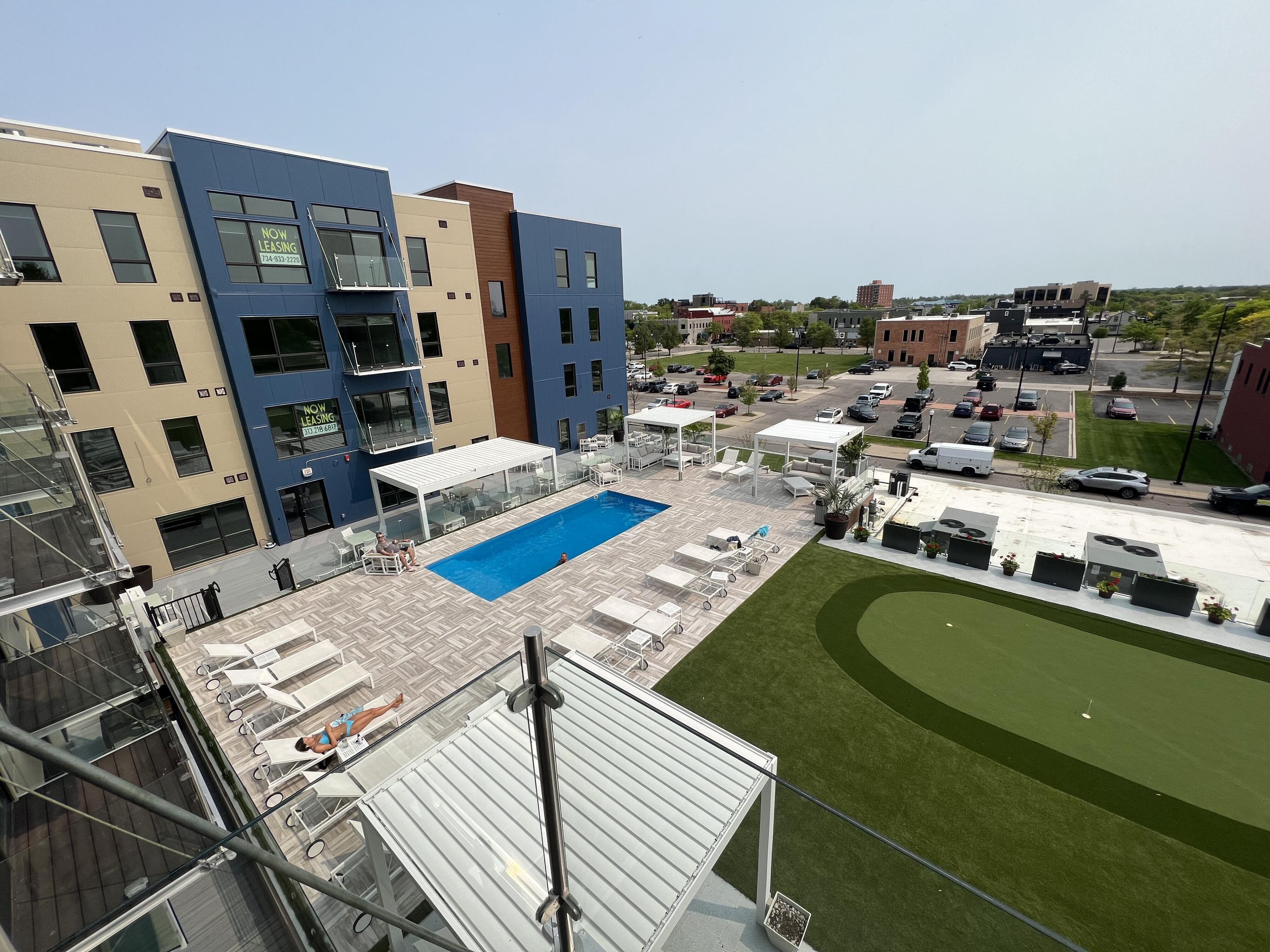 Experience elevated living in this luxurious 2-bedroom, 2-bath penthouse loft in the heart of vibrant downtown Wyandotte. Offering approximately 1,300 square feet of thoughtfully designed space, 4th floor residence seamlessly blends modern sophistication with warm, inviting comfort. Step inside to an open-concept living and dining area featuring soaring ceilings and dramatic floor-to-ceiling windows that flood the space with natural light. Contemporary finishes and refined details create an upscale yet comfortable atmosphere throughout. The chef-inspired kitchen boasts sleek cabinetry, a spacious island with granite countertops, recessed lighting, stainless steel appliances, and generous prep space. The primary suite a private retreat complete with a spa-inspired ensuite bath and ample closet space. A well-appointed second bedroom and full bath provide flexibility for guests, a home office, or additional living needs. Residents enjoy exceptional amenities, including a stunning rooftop pool with cabanas, food and beverage service, and a putting green - creating a true resort-style experience at home. Additional features include: Private or assigned garage parking Secure building entry with fob-controlled elevator and door access Fitness center and community amenities Located just steps from downtown shops, restaurants, entertainment, and only a block from the waterfront, this penthouse is luxury and downtown living.