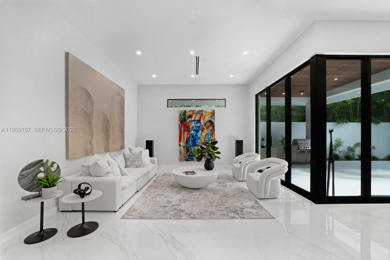 Unique opportunity to own this stunning, modern residence in the highly desirable and ultra-private North Grove section of Coconut Grove—one of Miami's most prestigious and serene neighborhoods. New Construction Nestled on a secluded cul-de-sac, this exceptional home offers unparalleled privacy and tranquility while enjoying prime proximity to the best of Coconut Grove living. With soaring 12-foot ceilings and a convenient elevator for effortless multi-level access, the residence features 5 spacious bedrooms and 4 bathrooms, including a downstairs guest/in-law suite with its own cabana bath for ultimate flexibility and comfort. The gourmet kitchen is an epicurean's dream, boasting a massive central cooking island, top-tier Sub-Zero, Wolf, and Miele appliances, and seamless flow for entertaining or everyday luxury. Luxurious details abound: 10-foot impact windows flooding the home with natural light, rich wood floors throughout, integrated security cameras, and sophisticated custom lighting. Step outside to your private oasis—a stunning saltwater pool illuminated by vibrant color LED lights, perfect for year-round relaxation in Miami's tropical climate. Ascend to the impressive 868 sq ft rooftop terrace, an entertainer's paradise with breathtaking views and endless potential for outdoor lounging, dining, or stargazing. A 2-car attached garage and thoughtful modern finishes that elevate everyday living Alumatech Gourmet exterior Kitchen with Bull Appliances.