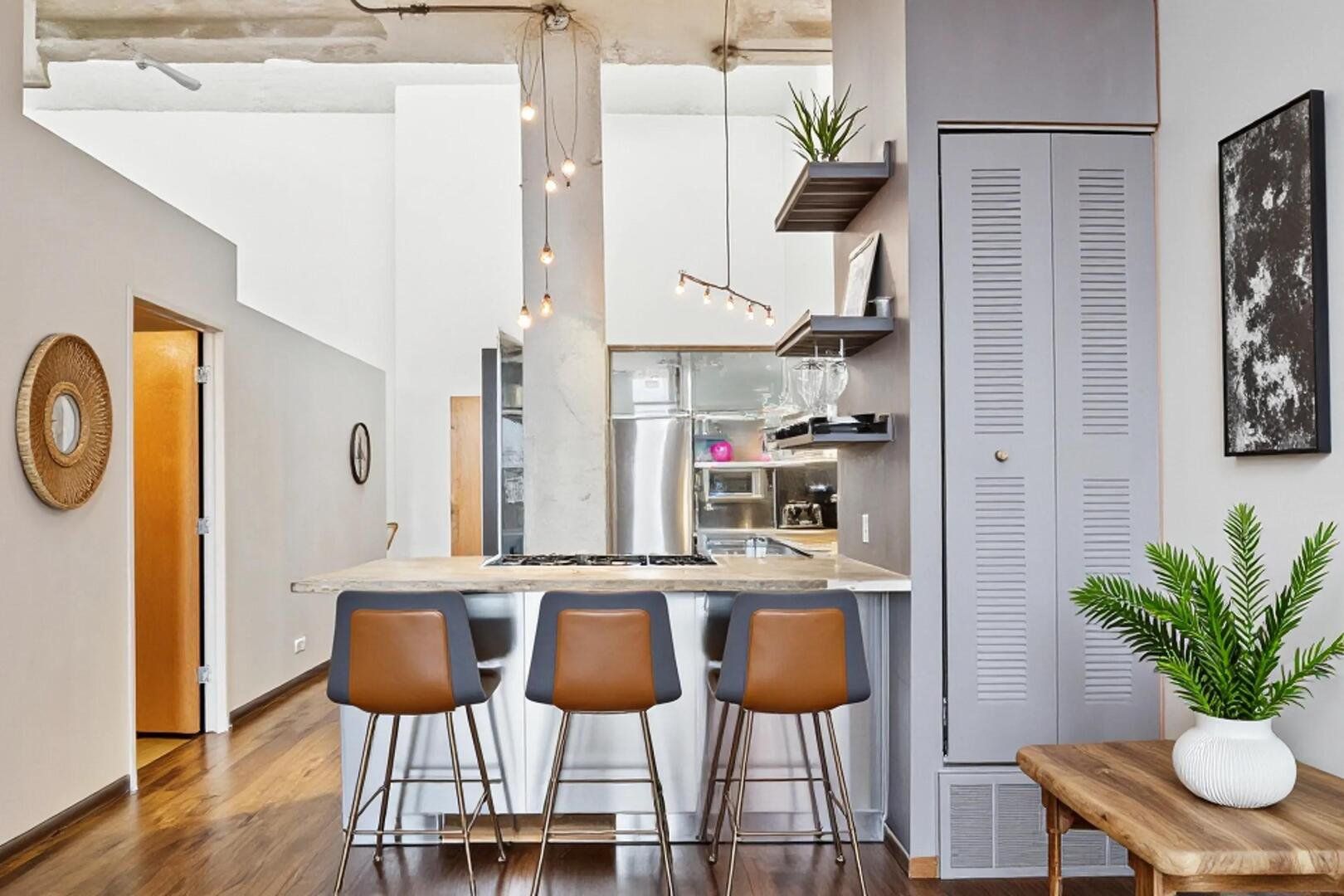 Step into this professionally architect-renovated, bright, spacious, top-floor loft at the premier PENCIL FACTORY LOFTS. Featuring BOTH soaring 12-foot ceilings and dramatically skylighted 20-foot ceilings, this home has an open, airy vibe, bathed with light from the skylights and from the 9-foot tall windows. Of note, there are only a few of these skylighted-designed units in this building, and overall, available units have become scarce. ... The kitchen boasts (Hey, the kitchen is proud of itself.) sleek stainless and interior-lit frosted-glass cabinetry with stainless KitchenAid appliances, and stunning brushed concrete countertops with breakfast island accomodating a 5-BURNER FISHER & PAYKEL GAS STOVE. The extra-large primary bathroom features plenty of counter space and a spa-like walk-in shower with rain head. (For showers, rain is a good thing.) And, this loft contains a new LENNOX EFFICIENCY FURNACE, installed in 2023. ... Perhaps the grandest feature of this particular loft is the storage with extensive sliding glass-paneled closets in the primary bedroom, plus a walk-in closet and a sliding-glass paneled closet in the 2nd bedroom. Additionally, there is a large lofted storage area and more storage in the in-unit laundry room which has a stackable washer-dryer. ... The flooring throughout is oak, and yes, it's REAL OAK. Along with exposed brick, a custom 30-foot wood wall is the feature of the living room which hides an entertainment center and a "secret door" to the primary bedroom. (Very James Bond!) Several modern ceiling fans help to enhance energy efficiency and also give the loft an extra touch of industrial flair. Relatively low energy bills complete the package. ... Btw, the portion of this loft with 20-foot ceilings is perfect for you to build a lofted extra room, giving you even more functional space, which has already been done in several other units by owners in this building. ... And speaking of the building, the PENCIL FACTORY LOFTS is a rare loft building located on a tree-lined street. It offers impressively useful AMENITIES, including a renovated full gym, recently renovated relaxing courtyard with grills, new business center, package receiving room with lockers, a car wash bay with hose, vacuum and supplies, a dog wash (YES, a dog wash for Fido), and a roof deck with panoramic city skyline views. Common areas feature Wi-Fi, and there's an on-site engineer, a freight elevator, and a loading dock for easy move-ins. All of this is just one block from the Paulina Brown Line EL station and within close proximity to splendid restaurants, shopping, and 4 major grocery stores. ... NOTE: An indoor deeded PARKING SPACE in the first-floor heated garage is part of the asking price, and is conveniently located near the lobby entrance. (SOME PHOTOS ARE VIRTUALLY STAGED. Living room photos have altered paint color.)