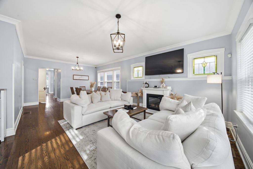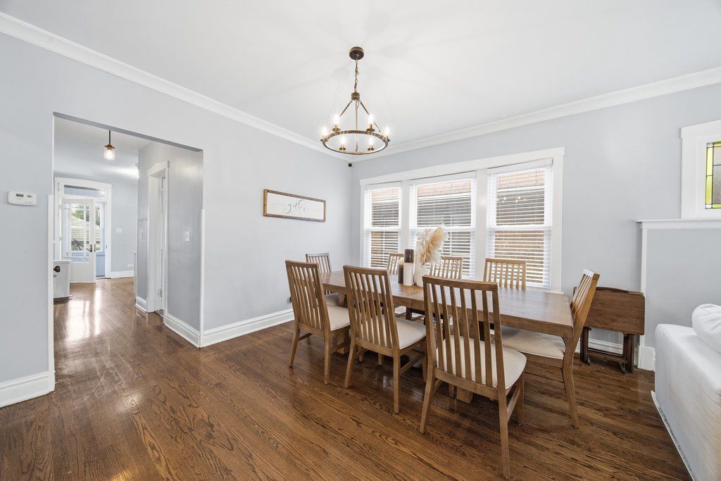 Beautifully Maintained 5-Bedroom Brick Bungalow with Modern Upgrades and Spacious Yard Welcome home to this beautifully updated 5-bedroom, 2-bathroom brick bungalow offering timeless charm with modern comfort. Situated on a full basement, this home features hardwood flooring throughout and an inviting layout perfect for both everyday living and entertaining. Step into a bright and airy living room filled with natural light, detailed with crown molding. The open-concept dining area flows seamlessly into a stunning kitchen featuring white cabinetry, tile backsplash, granite countertops, stainless-steel appliances, and a walk-in pantry-ideal for any home chef. The main level includes two bedrooms and a full tile bathroom. Upstairs, you'll find three bedrooms and a beautifully updated bath with a walk-in shower. The full basement offers endless possibilities-with a large laundry area and plenty of space for a game room, playroom, or media room. Outside, enjoy your level backyard surrounded by a privacy fence and complete with a spacious patio-perfect for relaxing or entertaining. A detached two-car garage provides added convenience and storage. This move-in ready home blends classic charm with modern style and functionality. Don't miss your opportunity to make it yours!