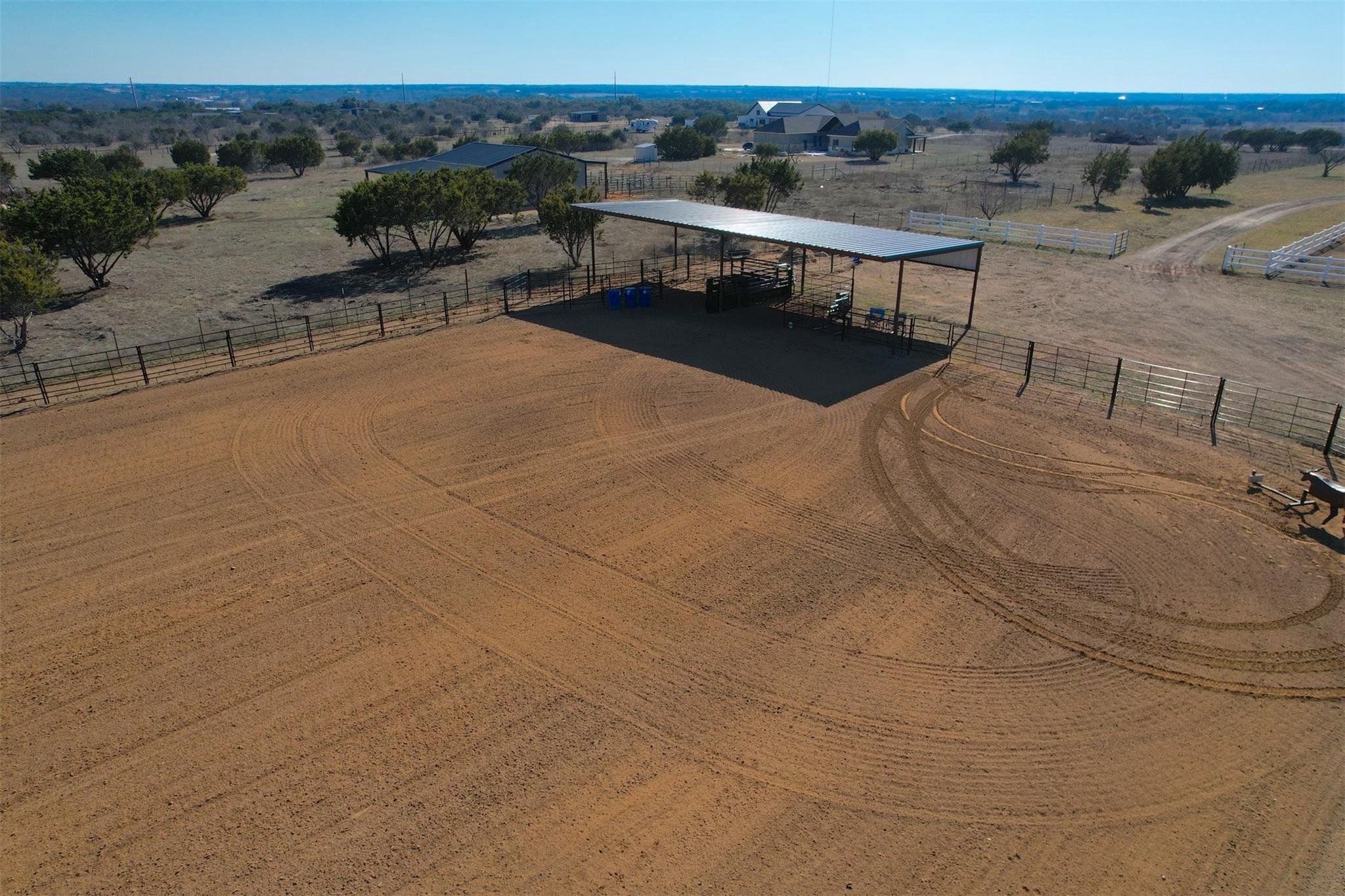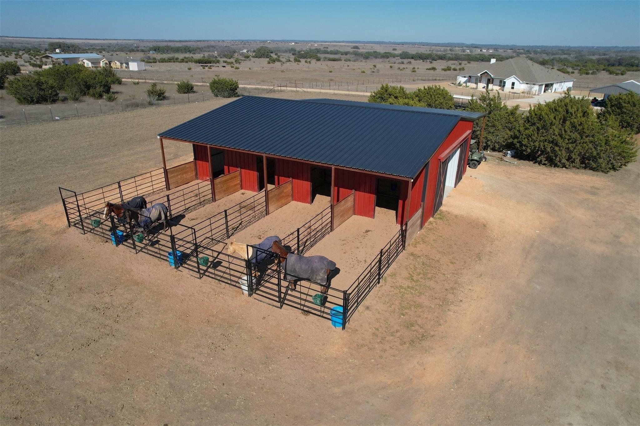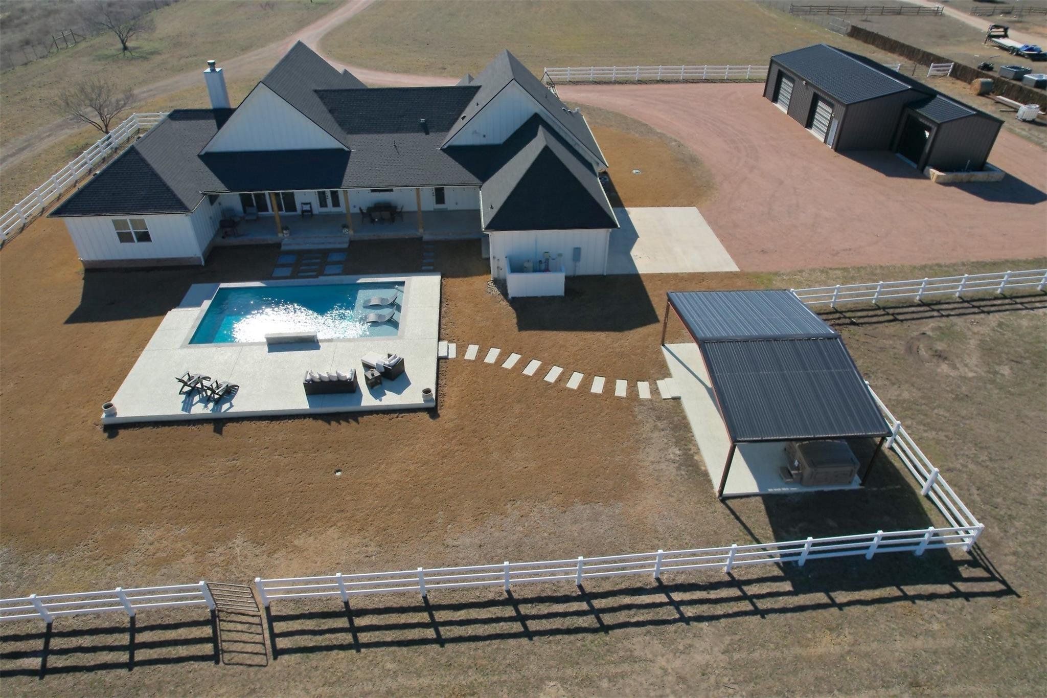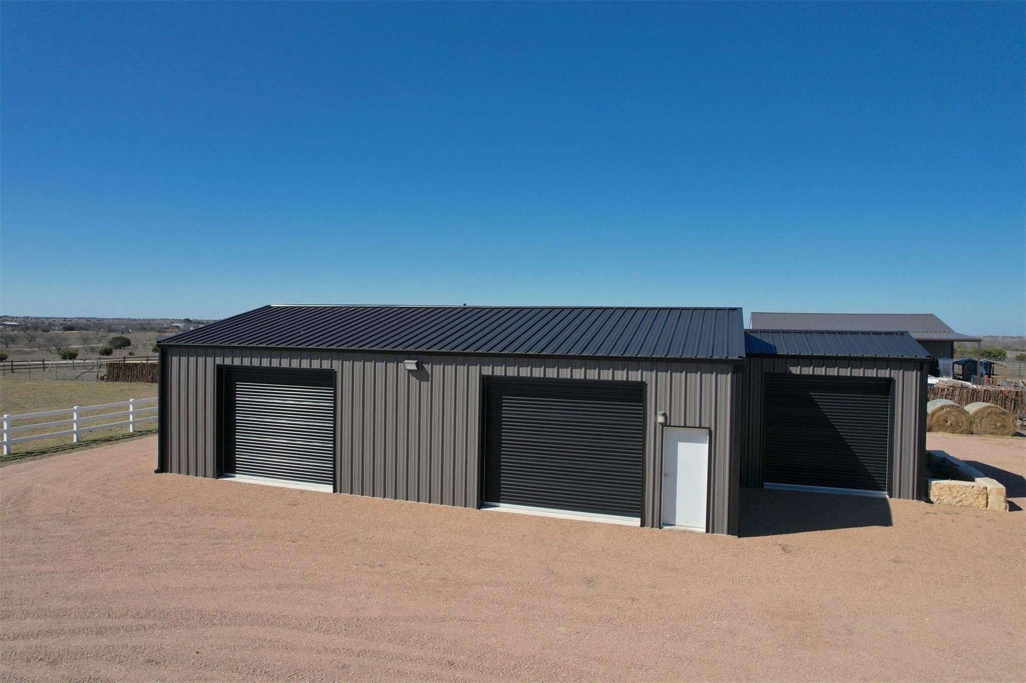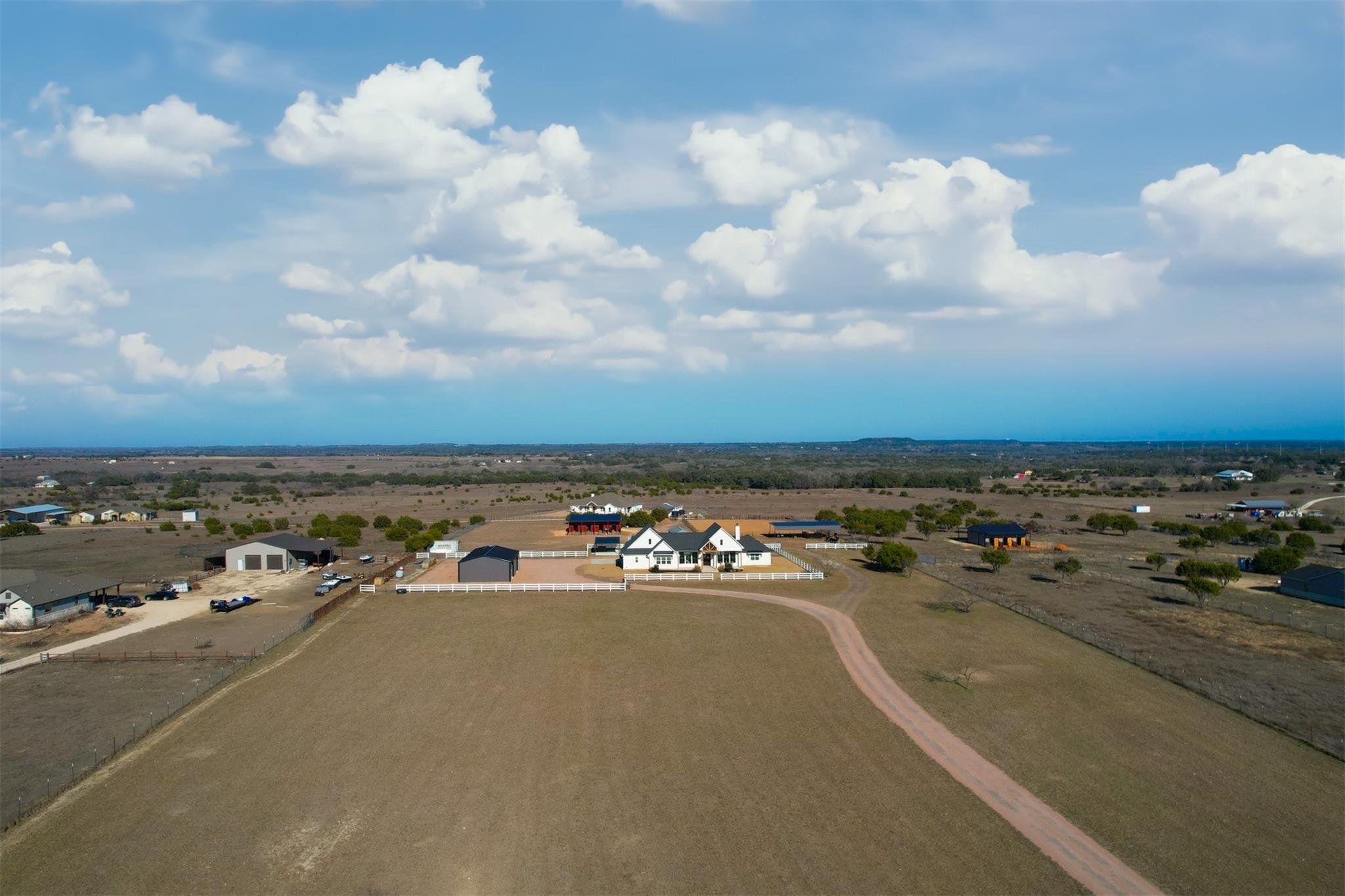 Tucked away on 11 pristine acres in a Liberty Hill, TX gated community, this modern farmhouse is the perfect fusion of luxury, functionality, and rustic charm. With 3,100 square feet of single-story living, this home offers three spacious bedrooms plus a versatile flex/study space, ensuring comfort for both work and relaxation. Every bedroom is a private retreat, complete with its own full bath, while the primary suite elevates the experience with double vanities and separate his-and-hers toilets—a rare and thoughtful touch. The heart of the home is a gourmet kitchen, where sleek quartz countertops and LVP flooring complement the home’s warm, modern aesthetic. Step outside, and the possibilities are endless. A pavilion awaits for outdoor entertaining, overlooking the lush 100% Bermuda grass lawn, sustained effortlessly by a full sprinkler system. For equestrian enthusiasts, the property boasts a 36x48 horse barn with four stalls, complete with lean-tos for trailer parking, a roping arena, and ample open space for grazing. Need more room? The 1,800 sq. ft. shop provides endless potential for hobbies, storage, or a workspace. There's even an in-ground storm shelter too! This is more than a home—it’s a lifestyle. A place where serenity meets sophistication, where wide-open Texas skies frame your everyday views, and where the possibilities stretch as far as your imagination. No HOA! Welcome to 201 Gatlin Ranch Rd—your personal slice of country paradise.