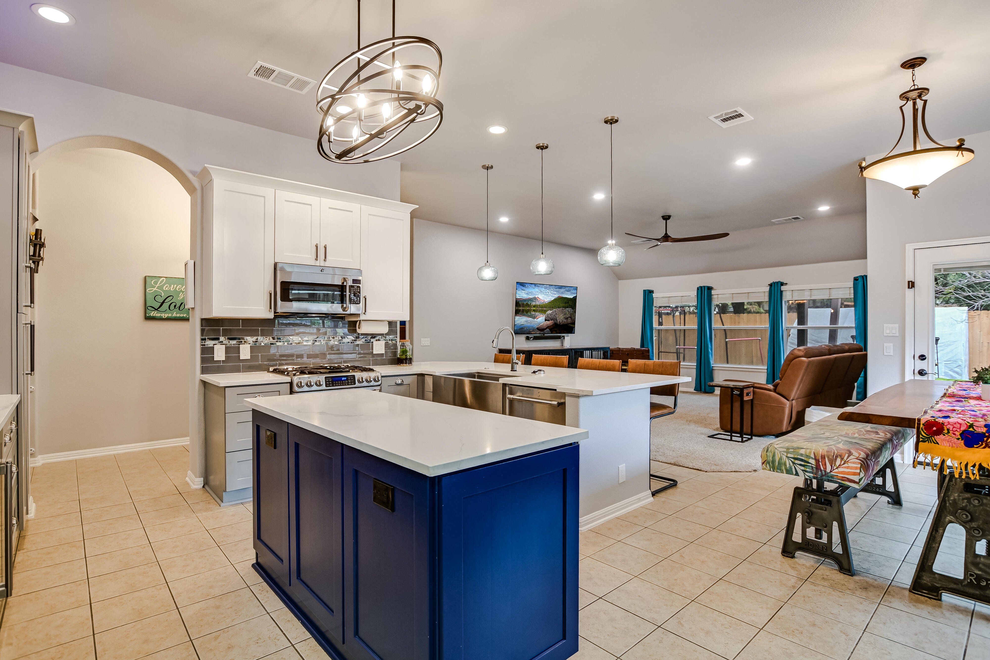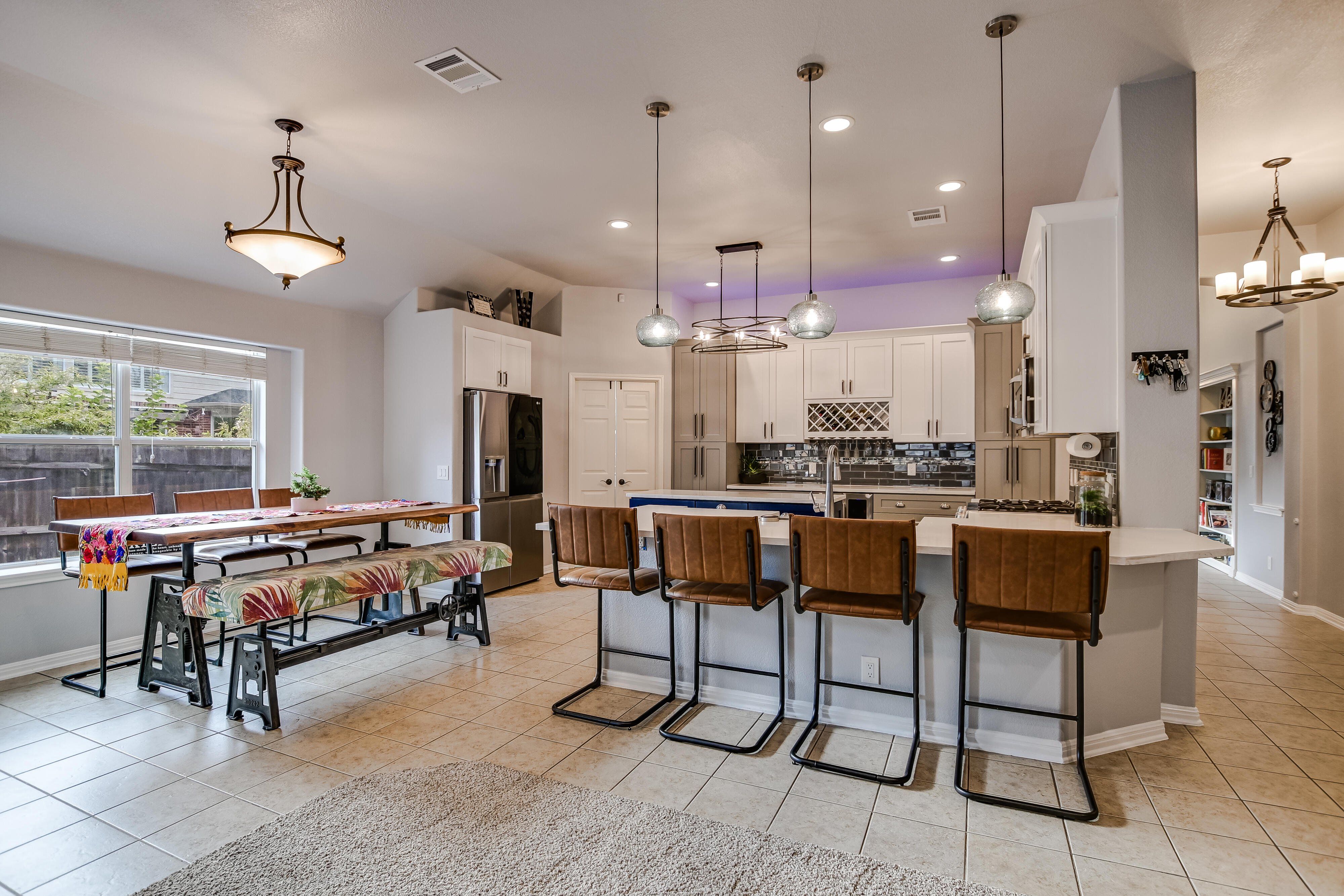 Upgrades! Energy-efficient 3BR/2BA home with 3-car garage in Pflugerville! Features include a fully paid 13.12kW solar system averaging ~17 MWh/year, new 30-year architectural roof (2023), Carrier Greenspeed HVAC, whole-home filtration and water softener, and connected home upgrades throughout. The updated kitchen with gas GE Café range, farmhouse sink, Delta touch faucet, beverage/wine fridge, all-drawer cabinetry, and modern lighting. Bathrooms updated with matching cabinetry and concrete sinks. Showstopping media room with 110” screen wiring and custom hidden bookcase door. The backyard oasis includes Trex deck, cowboy pool, rock stream, garden beds, sprinkler system and St. Augustine grass. Fresh interior paint (2025), exterior paint and gutters (2023), LED lighting, dimmers, USB/USB-C outlets, fiber-ready wiring, and EV charger (negotiable). Not a cookie-cutter—this one stands out.