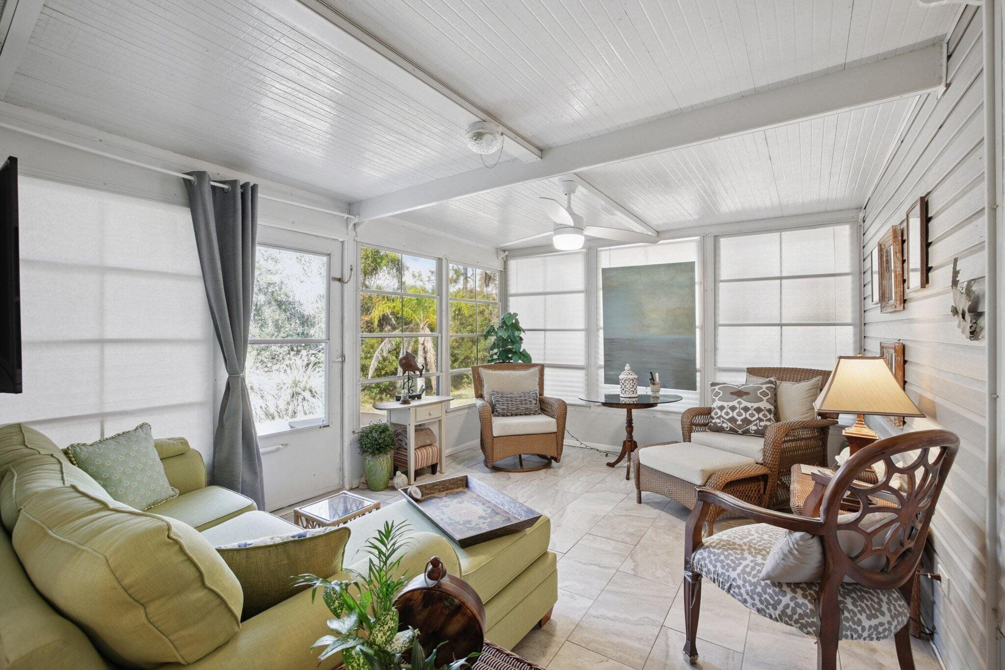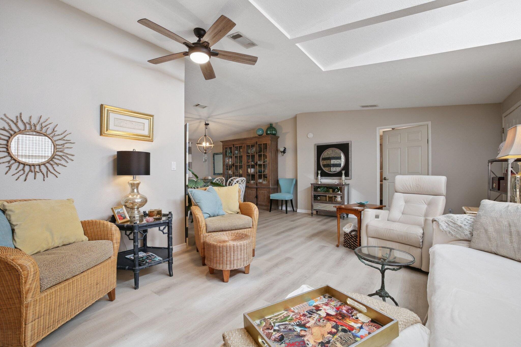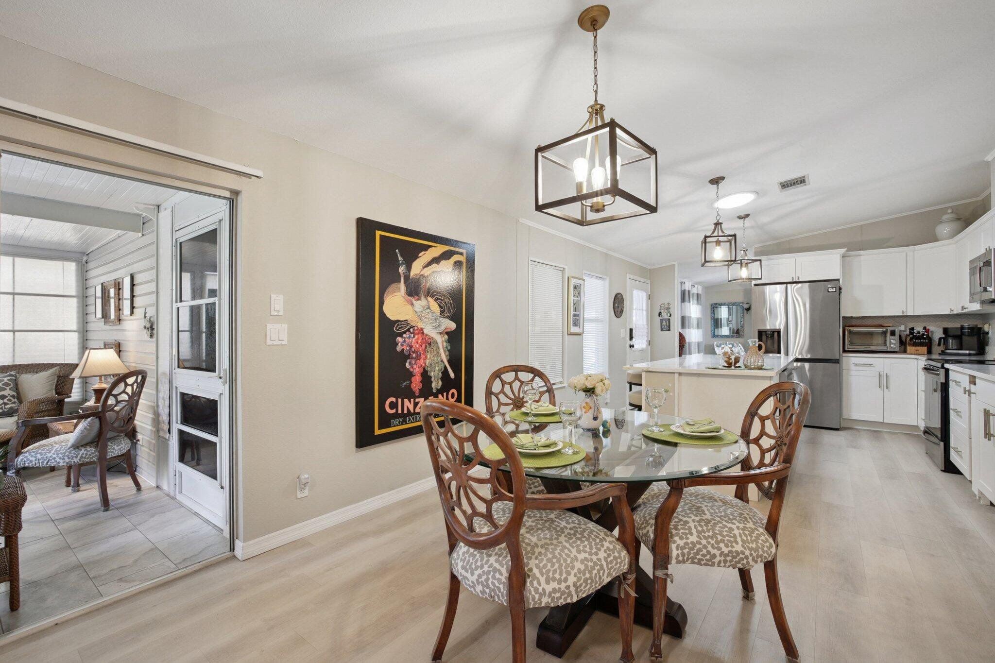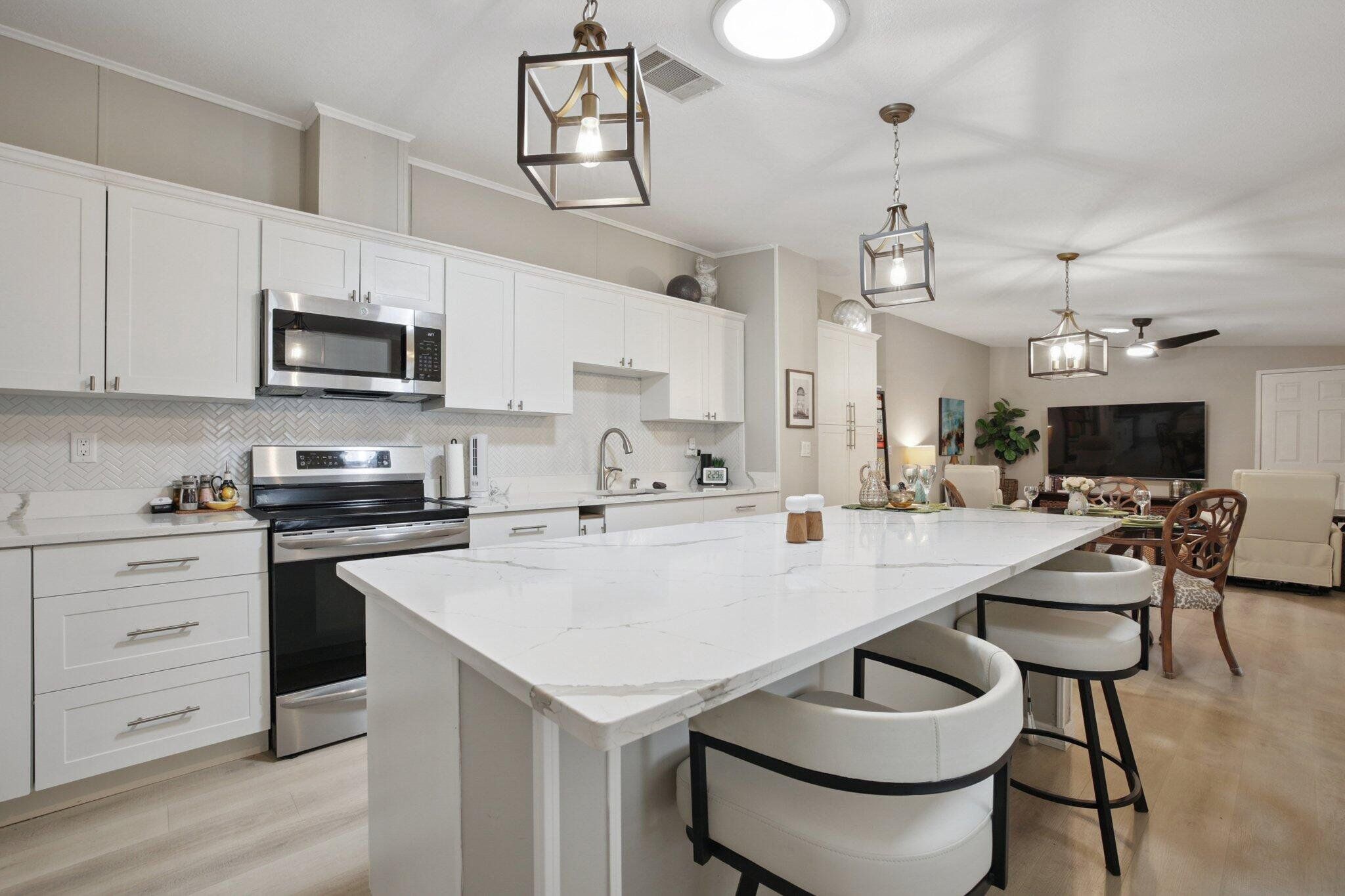 STUNNING,completely redesigned spacious home with modern upgrades & quality materials & timeless neutral …… colors. 2100 sq ft in a charming boutique neighborhood just minutes to Venice beaches and Wellen Park activities. This home features 3 bedrooms, 2 full baths and a flexible great room with a chef‘s kitchen. boasting an 8’ island with abundant storage drawers, pantry, quartz counters, new stainless appliances & a dining area that flows into a den. A separate Inside laundry room. A large dining room leads to a bright living room, creating an inviting gathering space. The primary suite has a king bed & walk in closet. The en suite bath the new large custom tiled shower, marble finishes & dual vanities. A split floor plan provides privacy, with two guest bedrooms with the 3 rd bdrm currently a design studio. Your tiled all season room overlooks the rear patio, preserve views. A screen porch off the double-wide carport, leads to a workshop with AC. Neutral theme & every comfort create a cohesive timeless look. Updates include interior renovation 2023, new roof 2021, new AC in 2024, all new premium luxury floors, NO carpet, new appliances, new kitchen cabinets, new vanity’s in bathrooms, new faucets, new remote controlled ceiling fans in every room, new interior paint, NO popcorn ceilings, new ductwork, vapor barrier and Tiedowns. Too many upgrades to mention. Come see for yourself. Riverwalk in North Port, is bordering Wellen Park & Venice. Take your pick of pristine beaches nearby. This 1997 Palm Harbor open floor plan in the charming tree-lined community welcomes pets & has a vibrant active lifestyle. Amenities are Brand new clubhouse including a Gym, Library, Heated Pool. Enjoy Kayak Trips, Game, Dancing,Dining, Bocce, Yoga classes, Social outings. The monthly fee of $831. covers all amenities, including Real Estate Taxes, Lawns , Cable TV & Internet…with NO property taxes. Wonderful opportunity for an extended family situation..with two separate living areas.