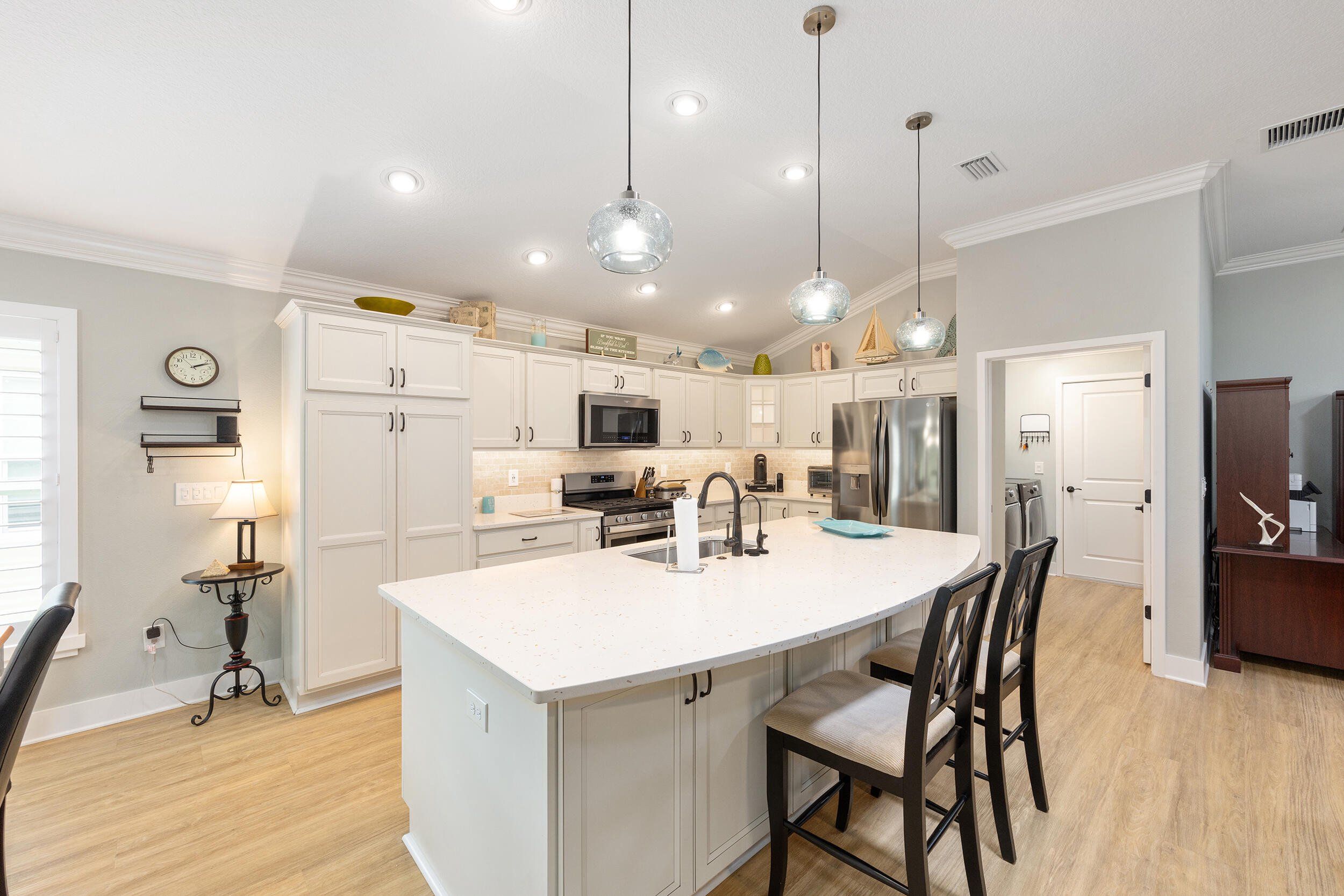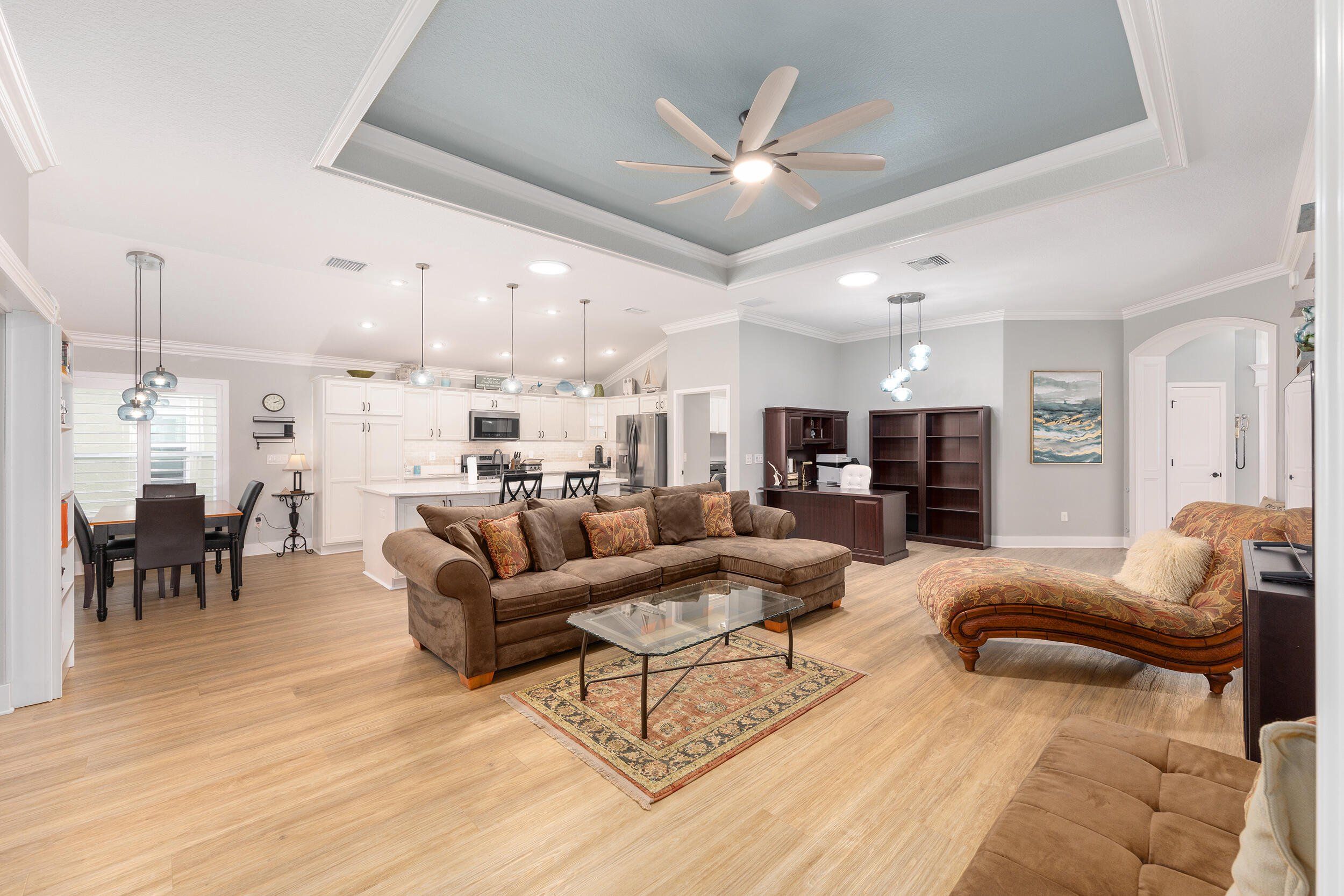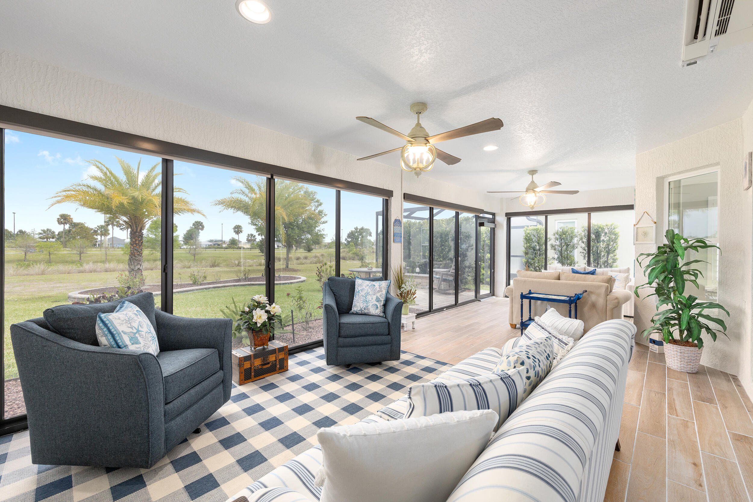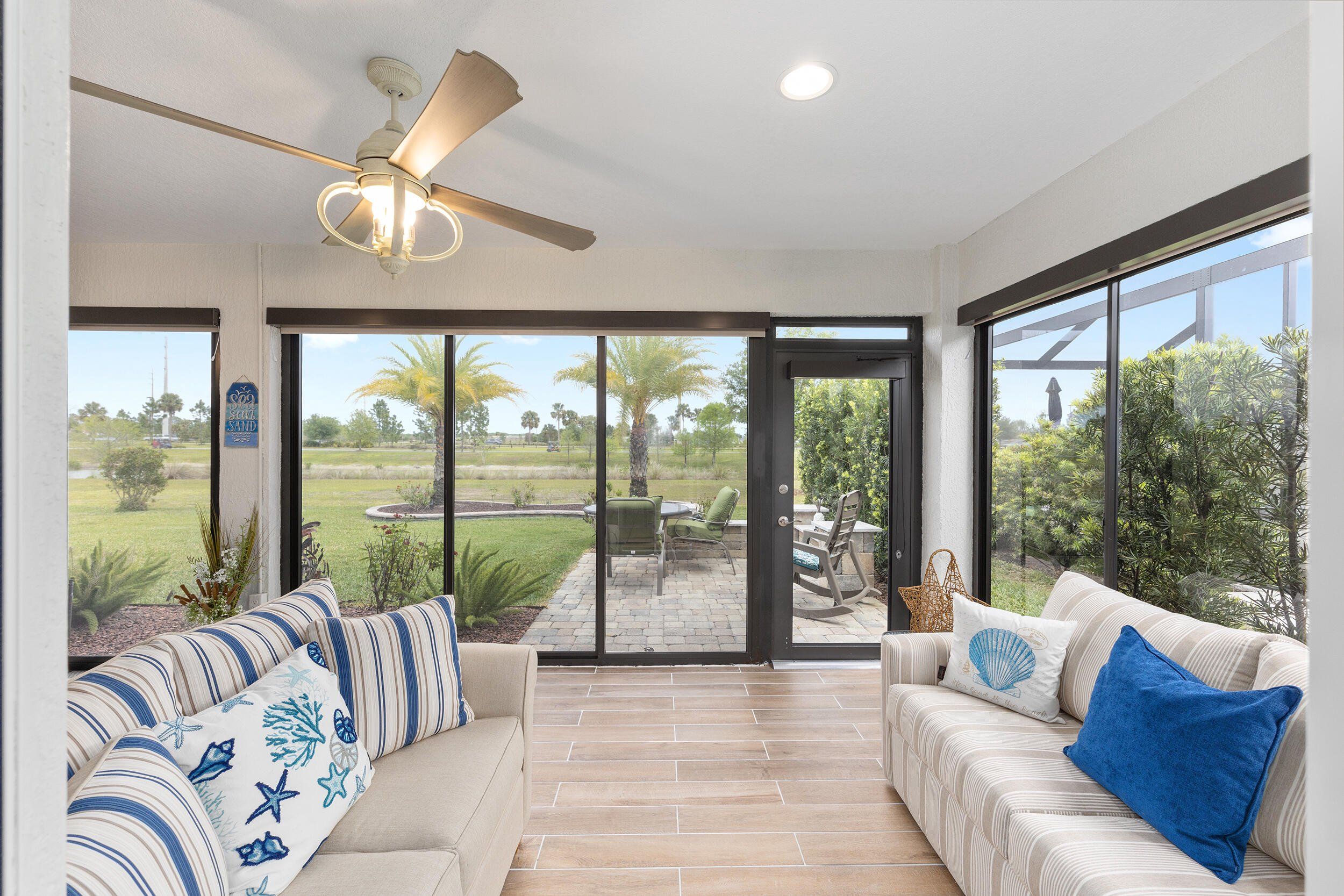 **WATERFRONT**ROOM FOR A POOL**GLASS ENCLOSED LANAI**OVERSIZED 2 CAR + GOLF CAR GARAGE w/AC**$100,00.00 in UPGRADES. Stunning waterfront 3-bed, 2-bath expanded Iris in the Village of McClure, minutes from golfing, shopping, dining, recreation, and Eastport Town Center. This exceptional home features a stretched 2-car plus golf cart garage, 350 sq. ft. glass-enclosed climate-controlled lanai, room for a pool, and over $100,000 in premium upgrades. Previously owned by an interior decorator, it shines with plank flooring, crown molding, custom trim and closets, plantation shutters, solar tubes, designer lighting, and fresh professional paint. The open living area boasts a dramatic tray ceiling, while a versatile flex space works as a dining area, office, or cozy nook. A gourmet kitchen highlights quartz counters, tile backsplash, stainless appliances, cabinetry with under-cabinet lighting, and a counter-height island. The expanded primary suite wows with water views, tray ceiling, walk-in closet, and spa-like bath with dual quartz vanities and tiled Roman shower. Two additional bedrooms, guest bath, paver patio, private backyard, professional landscaping, and oversized garage with attic storage complete this luxurious home, where serene waterfront living meets endless Villages adventures—golf cart and furniture package negotiable so you can enjoy it all in style! THE VILLAGE OF MCCLURE Living in the Village of McClure means having it all right at your doorstep! From the Longleaf and Loblolly Executive Golf Courses to the relaxing Willow Tree Recreation Area with its adult pool, there’s always something to enjoy. Looking for more activity? The Everglades Recreation Complex delivers with a sports pool, fitness programs, softball, pickleball, and even RC car and boat tracks for a little extra fun. Dog owners will love nearby Dudley Canine Park, and with Magnolia Plaza and Eastport just down the road, shopping, dining, and everyday essentials are always close by. It’s easy to see why the Village of McClure is such a desirable place to call home.