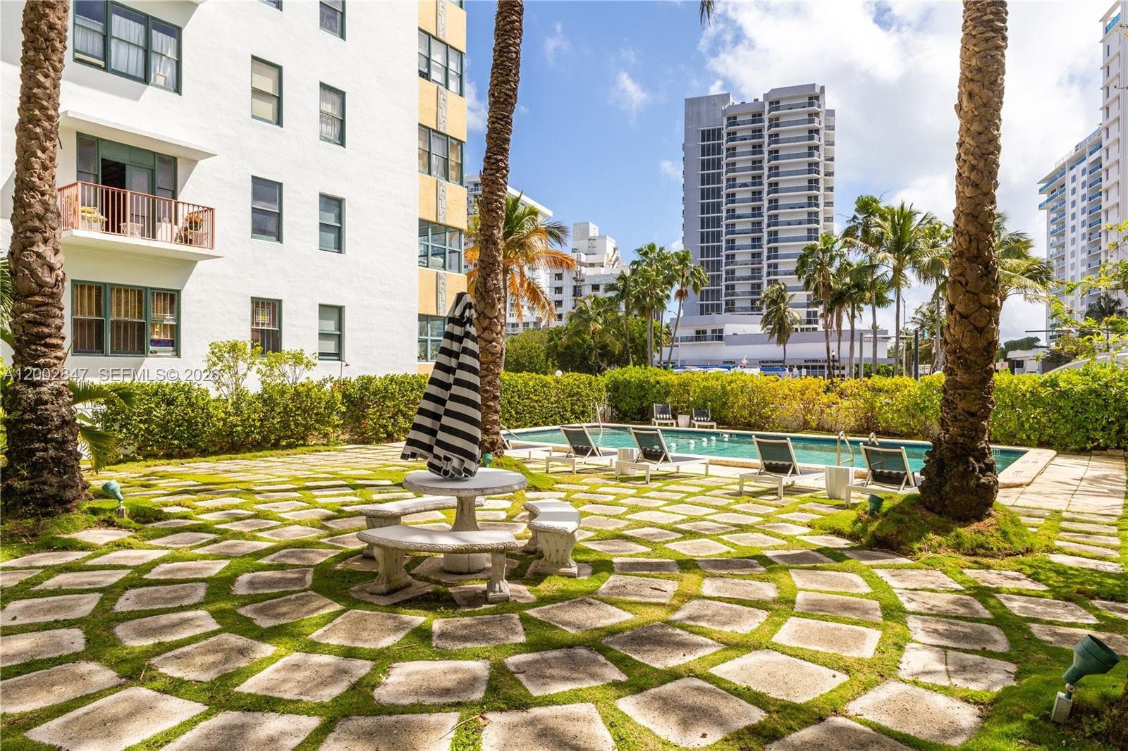 Enjoy stunning water views from this beautifully updated and tastefully furnished oversized studio in the iconic Helen Mar Condo. Soaring 10-foot ceilings and unique architectural charm, including a decorative fireplace, this residence offers a spacious and inviting feel rarely found in a studio. The gorgeous kitchen is outfitted with butcher block countertops, great windows for natural light, and stainless steel appliances, including a gas range. Featuring an open airy layout with stylish wood floors throughout, updated modern bath with seamless glass doors, central A/C and thoughtfully curated furnishings for a turnkey living experience. Bright and sun-filled, this one-of-a-kind unit showcases tranquil water views that create a serene retreat in the heart of Miami Beach. Residents enjoy a dedicated parking lot, lush tropical gardens, a sparkling pool, and a BBQ area—perfect for relaxing or entertaining. Ideally located- just cross the charming footbridge to the beach, or head to Lincoln Road for world-class dining, shopping, and entertainment. Available for annual lease or longer.