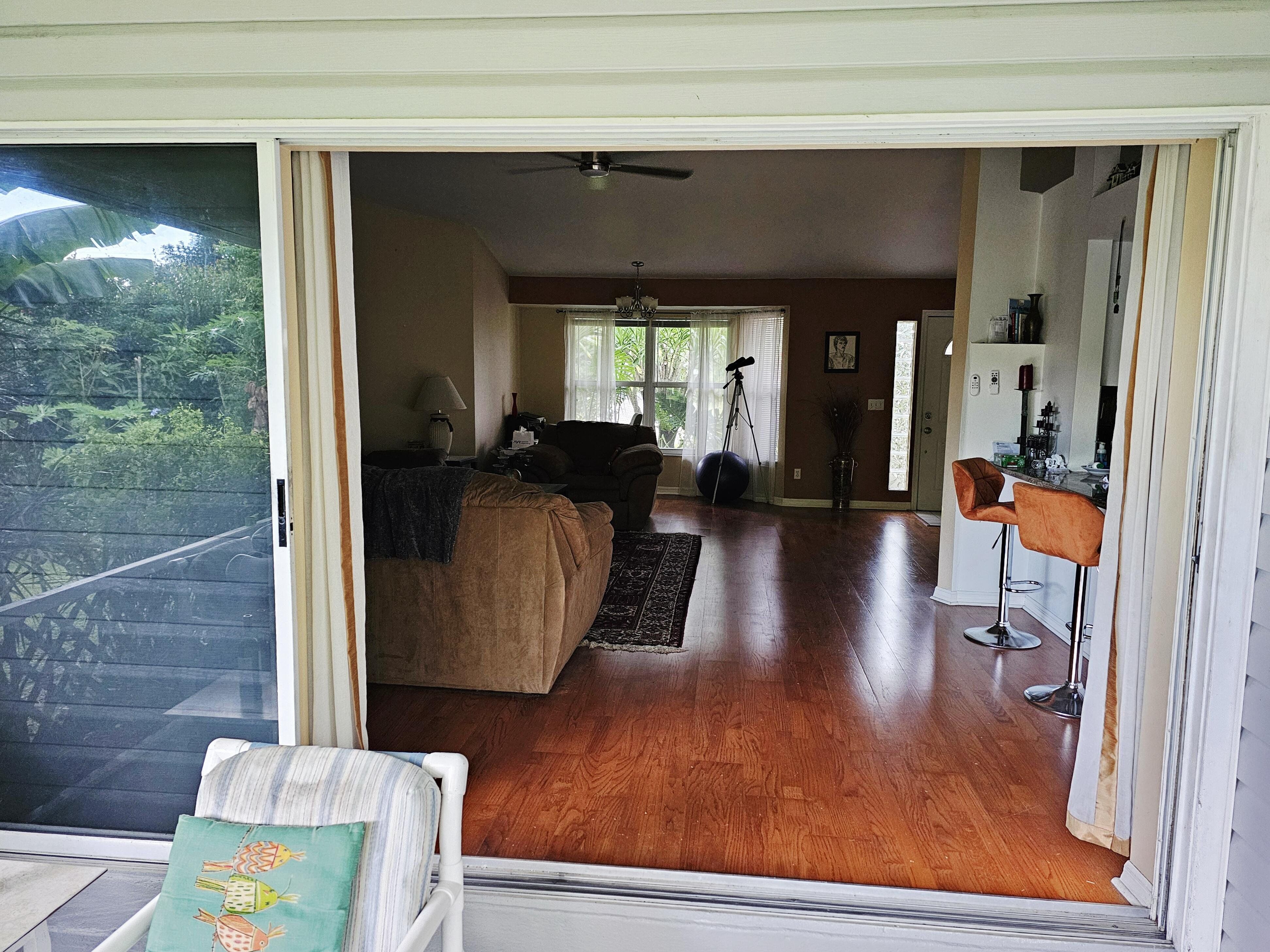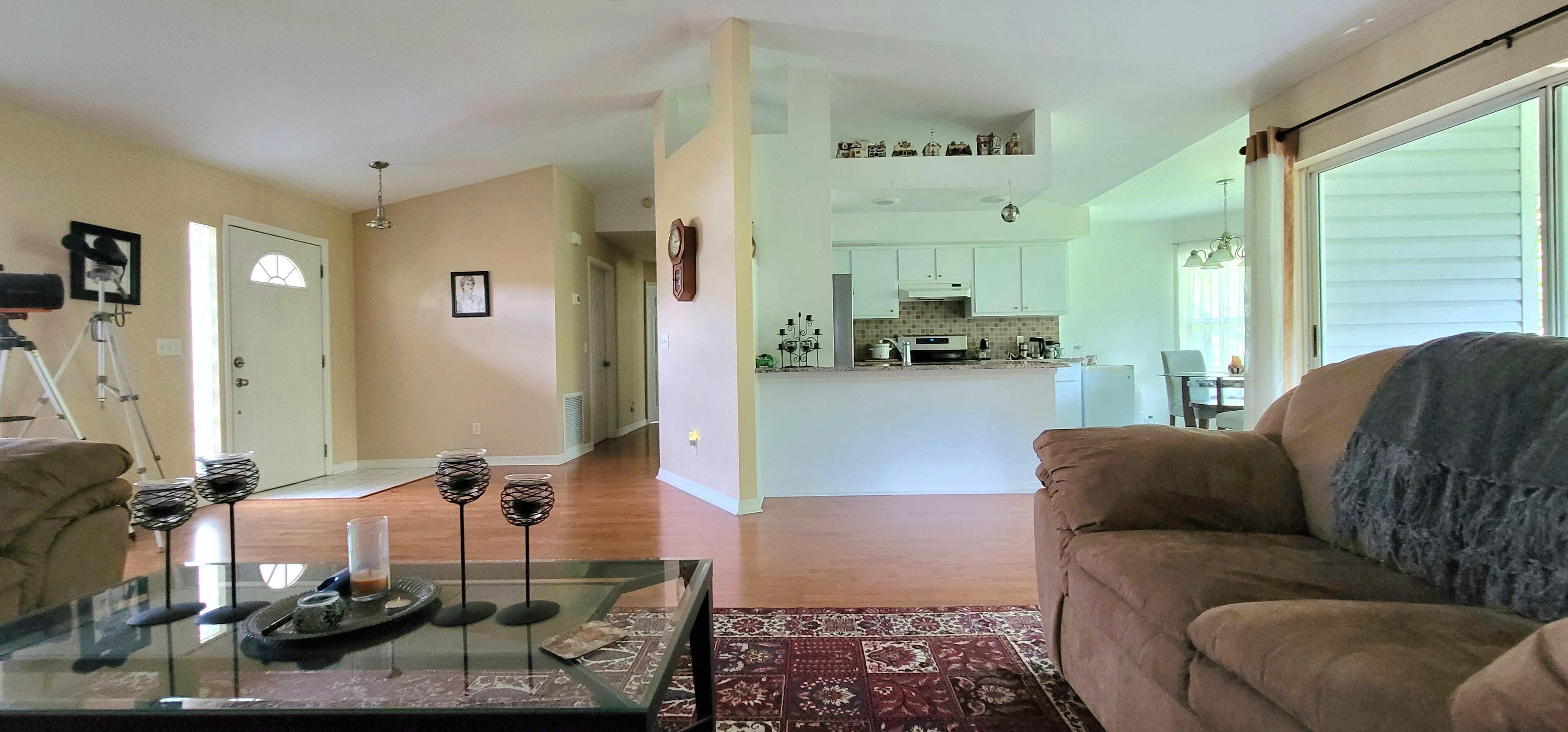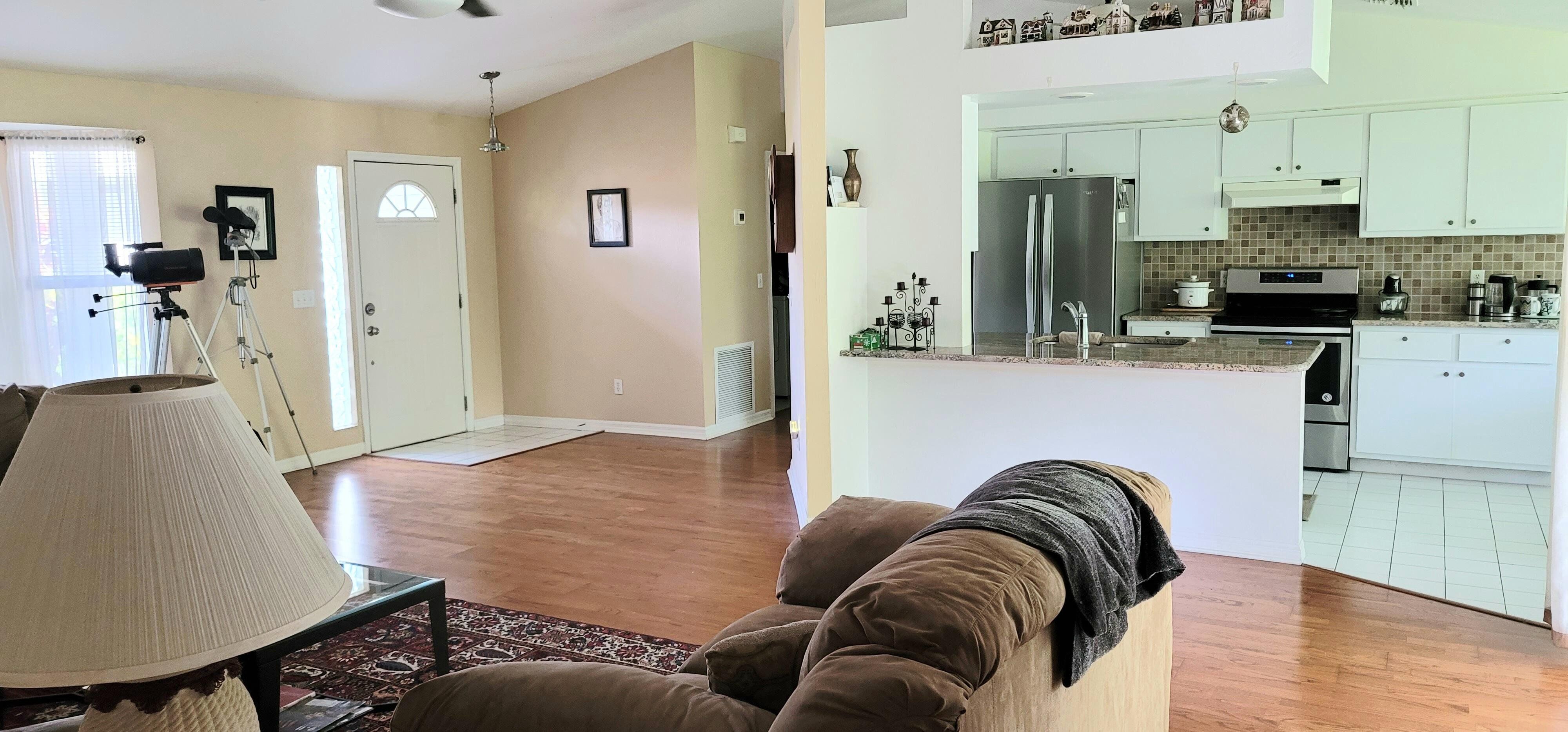 Welcome to this charming home located in Lehigh Acres, FL. Nestled in a quiet neighborhood, this property features a spacious interior with three bedrooms and two bathrooms, ceramic tile and wood-like vinyl floors, and ceiling fans in every room. The open floor plan allows for easy flow between the living, dining, and kitchen. Upgrades include granite countertops for the kitchen and porcelain tile for the master bathroom shower. Enjoy the Florida weather in the fully private, fenced backyard with assorted fruit trees, a sprinkler system and drip irrigation. An Owens-Corning Duration Designer shingle roof (with transferable warranty) and seamless gutters were installed November, 2024. Newer additions also include a Goodman HVAC system, well pump, 62 gallon hot water heater and whole-house water filtration system (which includes water softener, reverse osmosis and UV sterilization for unlimited clean drinking water), and a whole-house power surge protector. Conveniently located near local amenities, this nicely landscaped home offers a great opportunity for comfortable living. Note: The Furniture can be included in the sale at no additional cost.