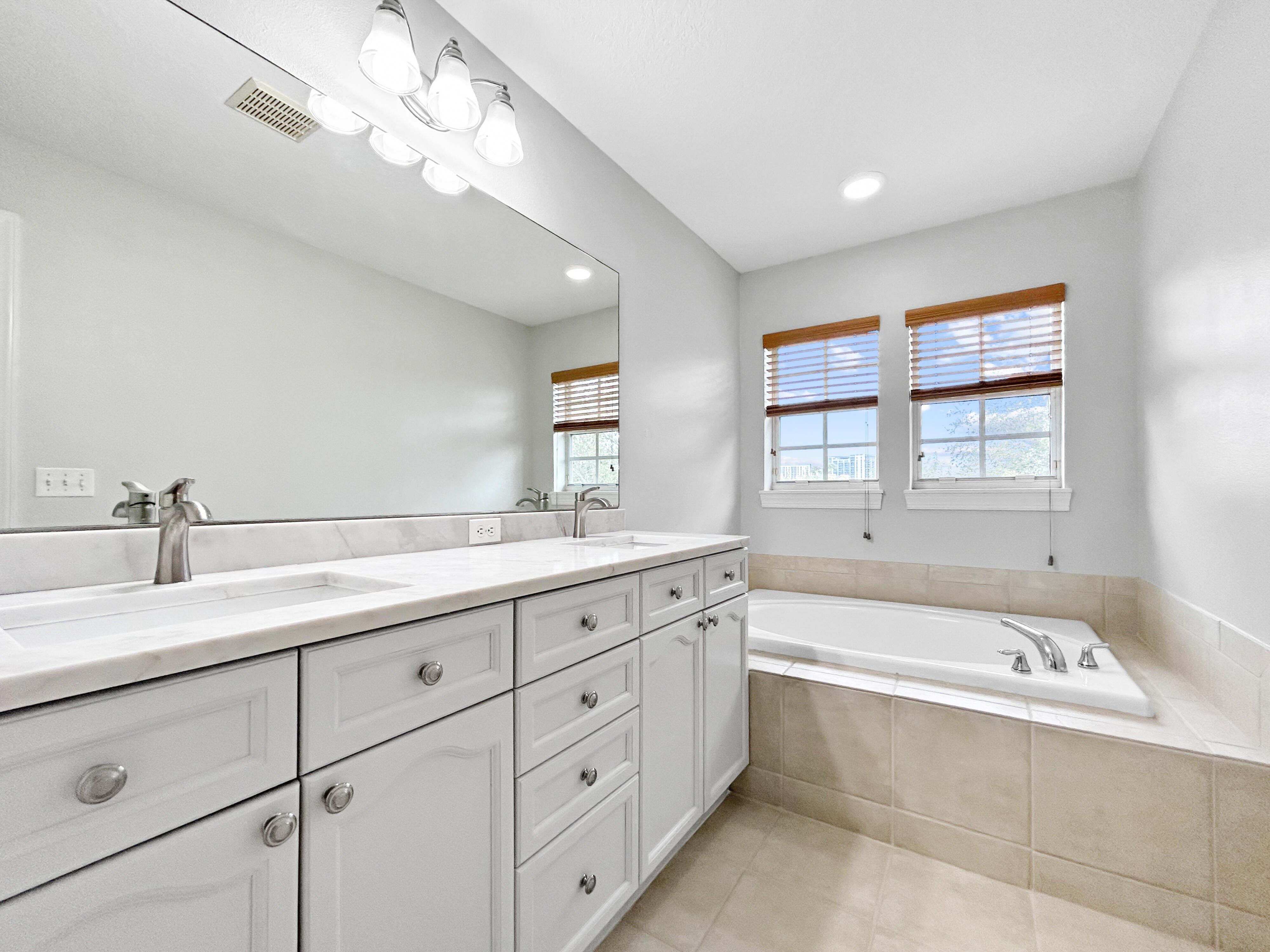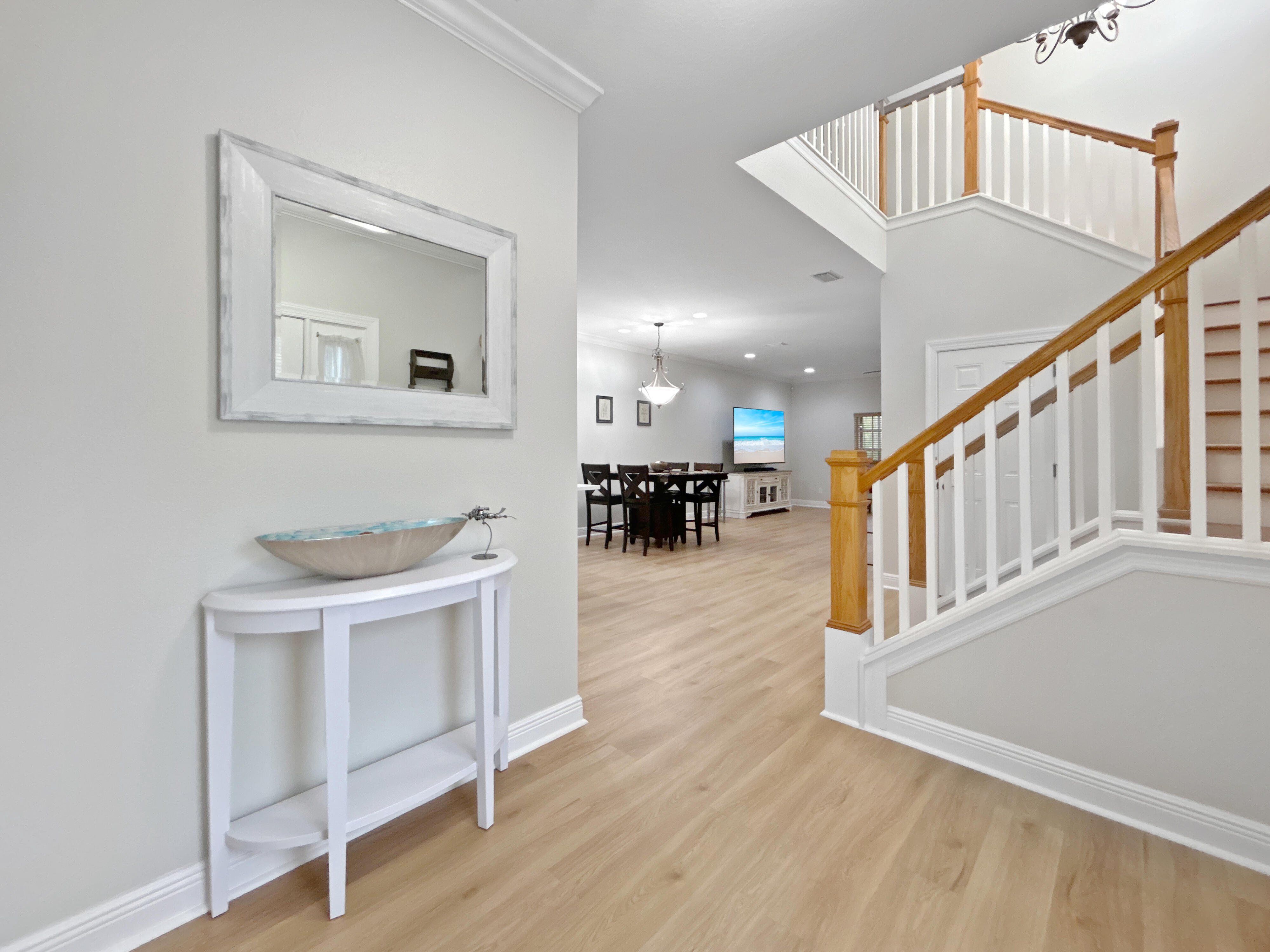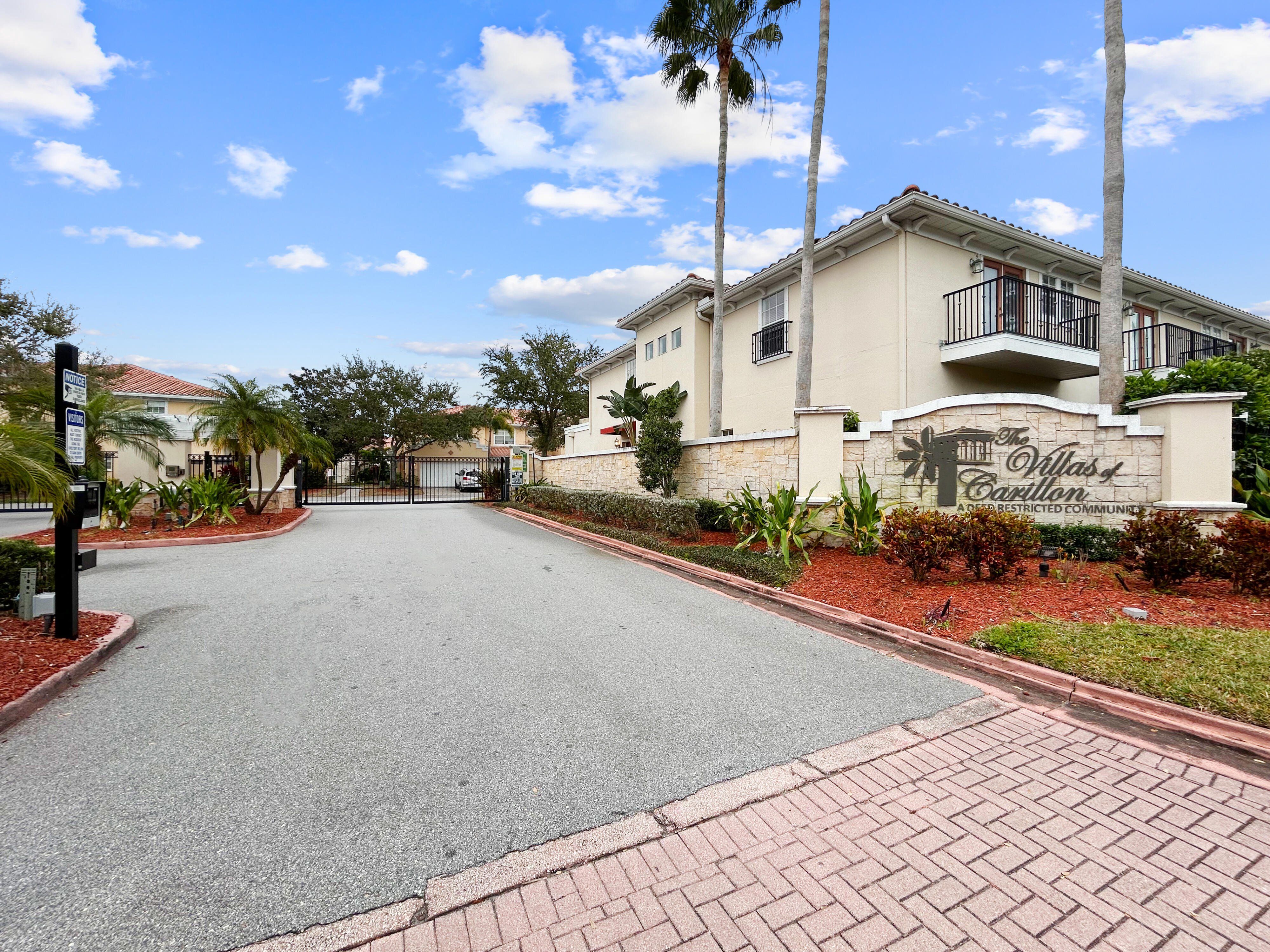 254 Valencia Circle is a two-story townhouse located in the gated Villas of Carillon community in Saint Petersburg, Florida. Offering 2,085 square feet, this residence features three bedrooms and two and a half bathrooms, along with a bright, open floor plan and high ceilings throughout. The freshly remodeled kitchen includes oversized, elegantly patterned quartz countertops, a matching marble backsplash, a fireclay deep-seated sink, brand-new stainless steel appliances, and luxury vinyl plank flooring throughout the first floor. The living area features French doors that open to a private, screened-in patio overlooking peaceful wooded views. Upstairs, the primary suite includes a private balcony, a large walk-in closet, and a newly updated en-suite bathroom with modern sinks and faucets, a sleek quartz countertop, and a new shower door. Bedrooms two and three are generously sized and share an updated bathroom. A second-floor laundry room adds convenience. Additional features include an attached two-car garage. Residents of Villas of Carillon enjoy access to a heated community pool and clubhouse. The HOA fee covers grounds maintenance, water, sewer, trash, exterior structural maintenance, and exterior flood/structural insurance.