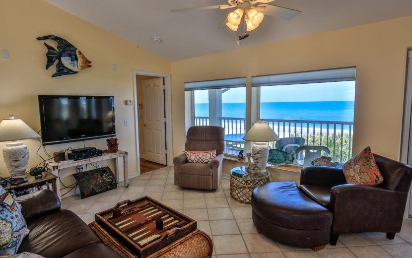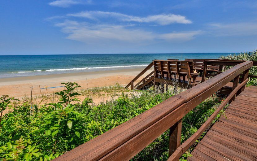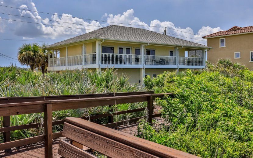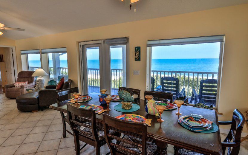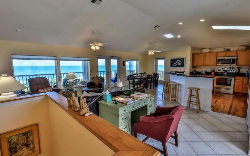 This is a lovely and furnished two story home DIRECTLY on the Atlantic Ocean with tremendous views of one of the quietest and cleanest beaches in Florida. It has 3 bedrooms and 2 full baths and sleeps 10. Upstairs has an open concept great room and connected kitchen, master bedroom, and full bath. Also on the second story is an expansive 600+ square foot covered deck great for lounging and entertaining. The first level has 2 bedrooms, 1 full bath, and a large 2 car garage. A private dune walkover allows convenient access to the beach. Available monthly, seasonal, and yearly. For additional information and viewing call Ted Barnhill .