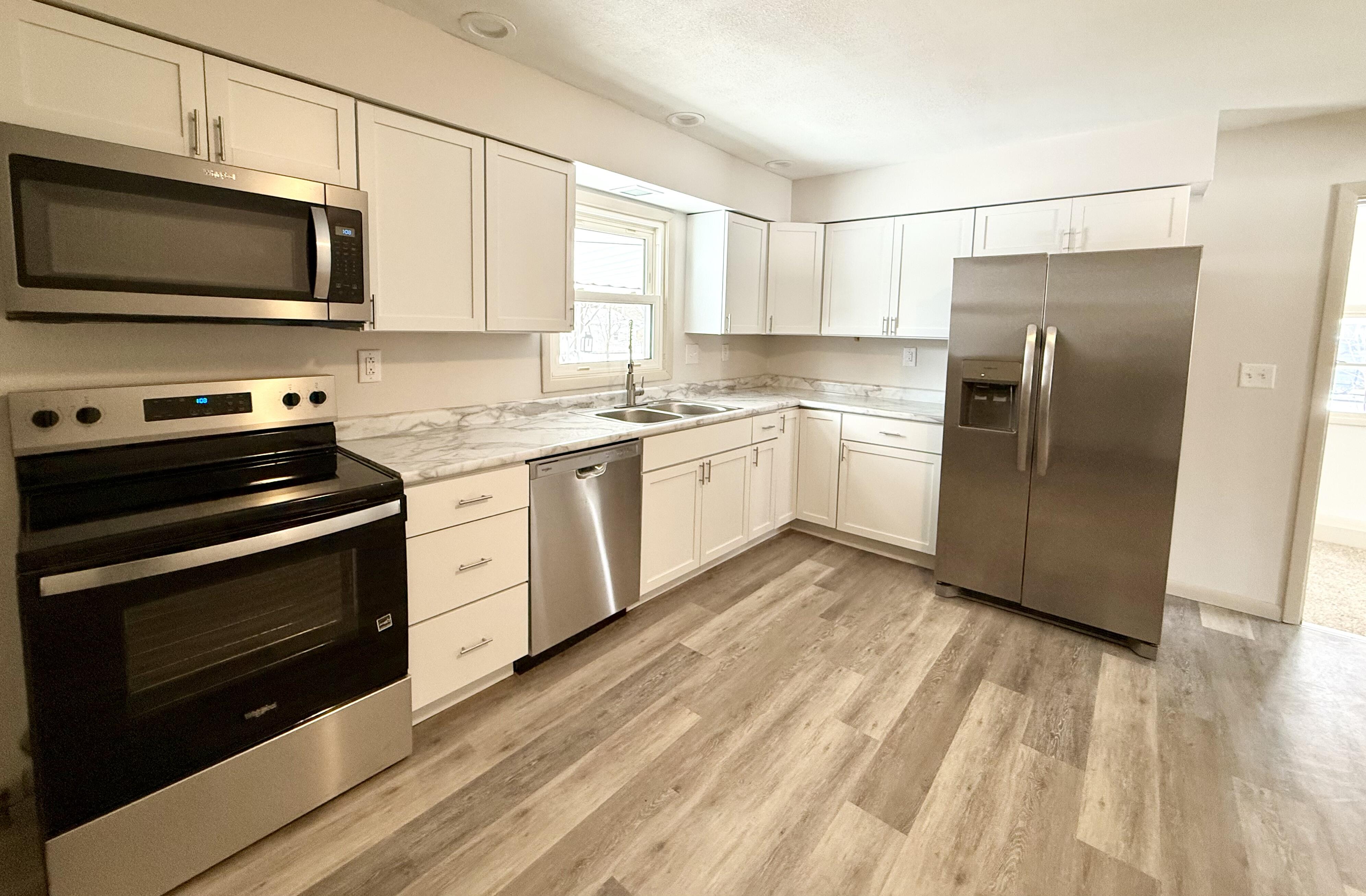 Updated 3-Bedroom Ranch with Additional Family Room, Covered Patio & Detached 2-Car Garage Move-in ready 3-bedroom, 1-bath ranch offering comfortable single-level living and an additional family room for added flexibility. The updated kitchen features all new cabinetry, marble-style countertops, stainless steel appliances, and luxury vinyl plank flooring. The carpeted living room boasts a cozy fireplace. All bedrooms are freshly painted and the remodeled bathroom, with modern finishes and a new tiled tub/shower surround. Outside, enjoy a spacious, tree-lined yard with a covered back patio, plus a detached two-car garage and an additional storage shed. A great home with modern updates, multiple living areas, and excellent outdoor features.