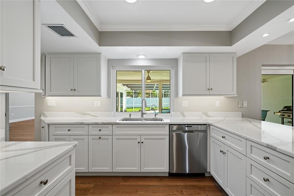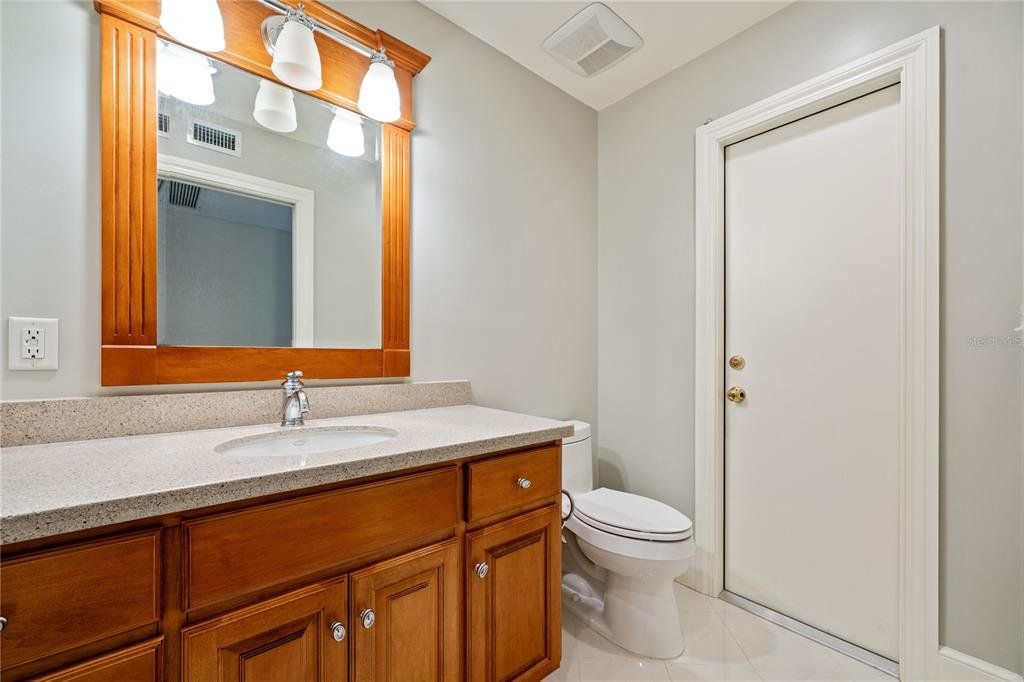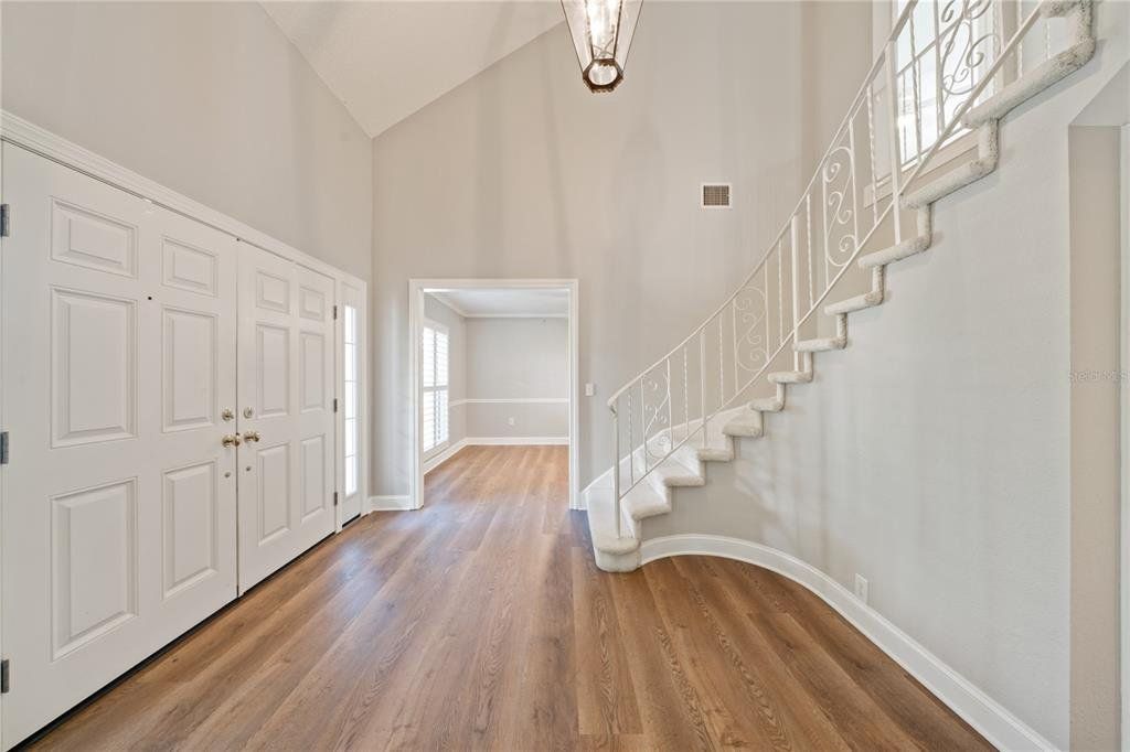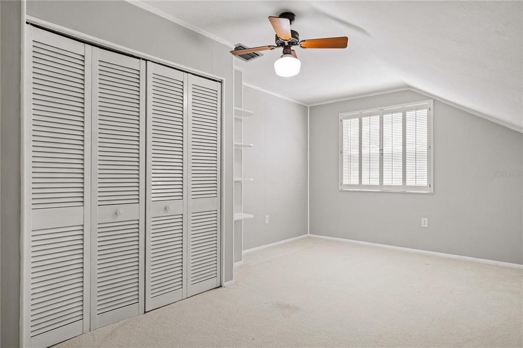 Welcome guests through an impressive two-story entryway into this beautifully maintained home designed for both comfort and entertaining. The spacious family room serves as the heart of the home, featuring custom built-in cabinetry that frames the fireplace, creating a stunning focal point for the TV, along with a convenient dry bar—perfect for hosting gatherings. The thoughtfully designed layout includes a large laundry room with abundant storage and a desirable split-bedroom floor plan. The primary suite and a guest bedroom (or ideal home office) are located on the first floor, while three generously sized bedrooms are upstairs. The third bedroom offers a unique bonus with a large walk-in closet that opens into an expansive walk-in attic space—perfect for storage or future possibilities. Step outside to your private screened pool area, complete with a dedicated pool bath so guests can come and go without tracking through the home—ideal for Florida living and entertaining. This home has been meticulously cared for with major updates already completed, including new windows with hurricane covers, hurricane-rated sliding glass doors, a new roof, A/C system, and water heater. Located in a sought-after community offering a golf course, clubhouse, fitness center, and pools, and just minutes from Countryside Mall, dining, and entertainment—this home truly combines lifestyle, location, and peace of mind.