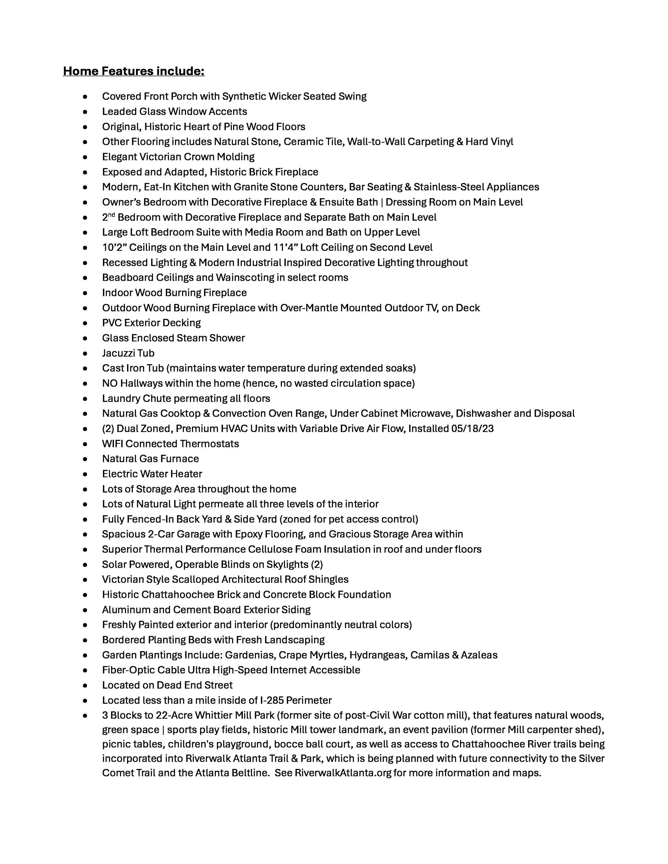 ALERT: There is a 3D virtual tour viewable on some domains. However, beycome's algorithm is preventing incorporation of this text because it determines it as 'an offer', when it's simply pertinent listing information. Unique, custom home inside the perimeter in the budding Upper Westside! This charming turn-of-the-century home with a storied history is the largest home within Whittier Mill Village (one of Atlanta’s oldest neighborhoods dating back to 1896 that is on the National Register of Historic Districts). It is also the only house in the WMV neighborhood with a 2-Car Garage. The house offers Craftsman / Queen Anne Victorian architecture with historic heart of pine floors, wide wood trim and solid wood doors throughout, celebrated by a seamless 2008 house addition, uplifting the home with modern luxurious features, providing a unique, elevated lifestyle immersed in character and function. Additionally, the HOUSE IS BEING SOLD FURNISHED, requiring no additional outlay. (See list of personal property items included in sale within photos. Keep what you want, sell what you don't want.) Welcome to your next home and neighborhood with storybook allure! This gem with a master on main, open floor plan and high 10'+ ceilings with crown moldings offers unique, spacious in-town living in a truly special, distinct neighborhood with 100-year-old trees and porch-lined streets, where neighbors become life-long friends (yet don't live on top of one another as experienced in 'zero lot line' communities). The home's rear and side yard are fenced in. Its convenient location provides a brief stroll to the secluded 22-acre Whittier Mill Park, Bellwood Coffee House, Hidden Gym and Public House 28 restaurant. Its advantageous location also offers quick vehicular access to Westside Village or Atlanta’s new Westside Reservoir Park within a 10-minute drive, and Vinings Village, The Battery/Truist Park, Buckhead Village, Midtown and Downtown, all within a 15-minute drive; and a commute to the airport within 20 minutes! Also, the WMV neighborhood park is connected to existing Chattahoochee River trails that are anticipated to provide future connectivity to Riverwalk Atlanta, and beyond to the Atlanta Beltline and Silver Comet trails. The home’s ground level features an epoxy floored two-car garage, a 4th bedroom (or office, or fitness studio), a laundry room with utility sink, and a 150+/- square foot dedicated storage area with workbench. Between the ground level and main level is a stair landing mudroom with seating and storage. The main level features an open plan kitchen with granite counter tops and bar seating connected to the living room with heart of pine floor, an exposed historic brick wood-burning fireplace, and mounted surround audio speakers. Adjacent to the kitchen, a separate dining room opens to an outdoor covered terrace and generous private deck with outdoor fireplace, that enjoys spectacular treetop-elevation unencumbered sunset views, which is marvelous for daily indoor/outdoor family living, dining alfresco and entertaining guests. The primary bedroom with in-suite bath is also on the main level and enjoys a decorative fireplace, built-in shelving, jacuzzi tub, glass enclosed steam shower, granite stone counter tops, double sink vanity plus separate, seated vanity counter, day-lit dressing room/walk-in closet and direct access to the side yard brick patio. A 2nd bedroom with a decorative fireplace and separate bath is also located on the main level. Upstairs, a second suite features a 3rd bedroom with an in-suite, lofted and sky-lit media/family room, adjacent reading/napping nook that could serve as an additional little one’s bedroom, a walk-in closet, and a luxurious bathroom featuring a partitioned sink area with skylight and granite stone countertop, a partitioned water closet, and a free-standing cast iron soaking tub and glass enclosed day-lit shower. (SEE A LIST OF HOUSE FEATURES WITHIN PHOTOS.) This custom home offers historic charm and modern comfort in a highly desirable, convenient location. Don't miss out on this exceptionally unique opportunity!