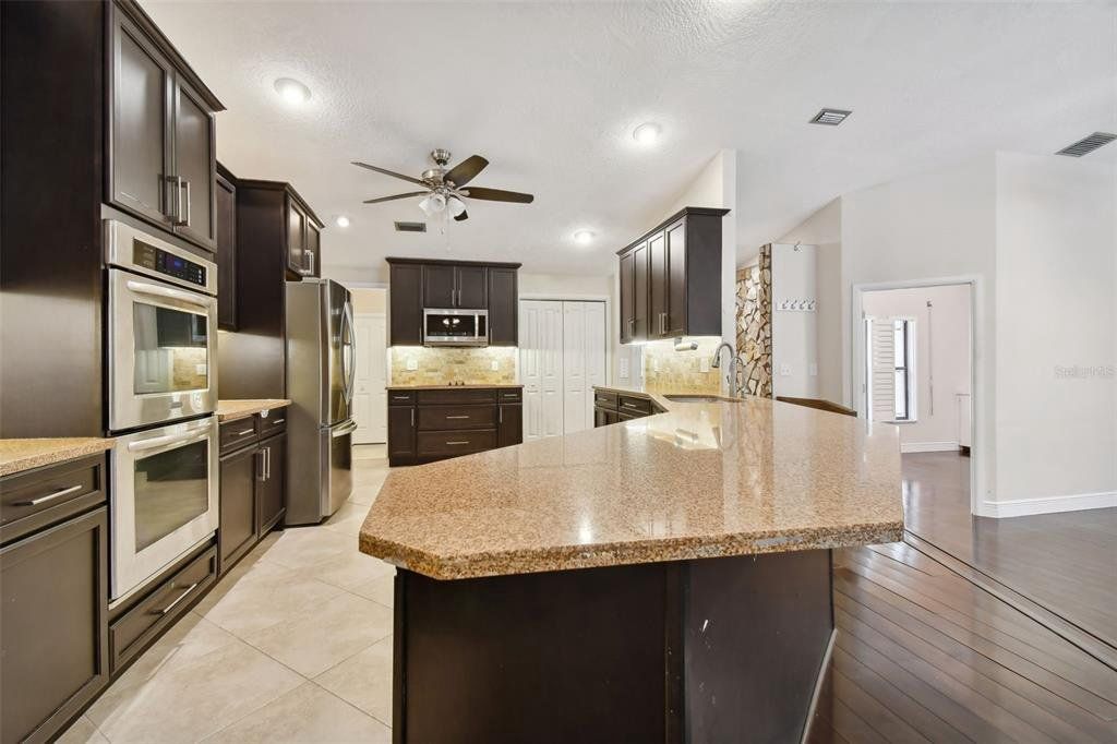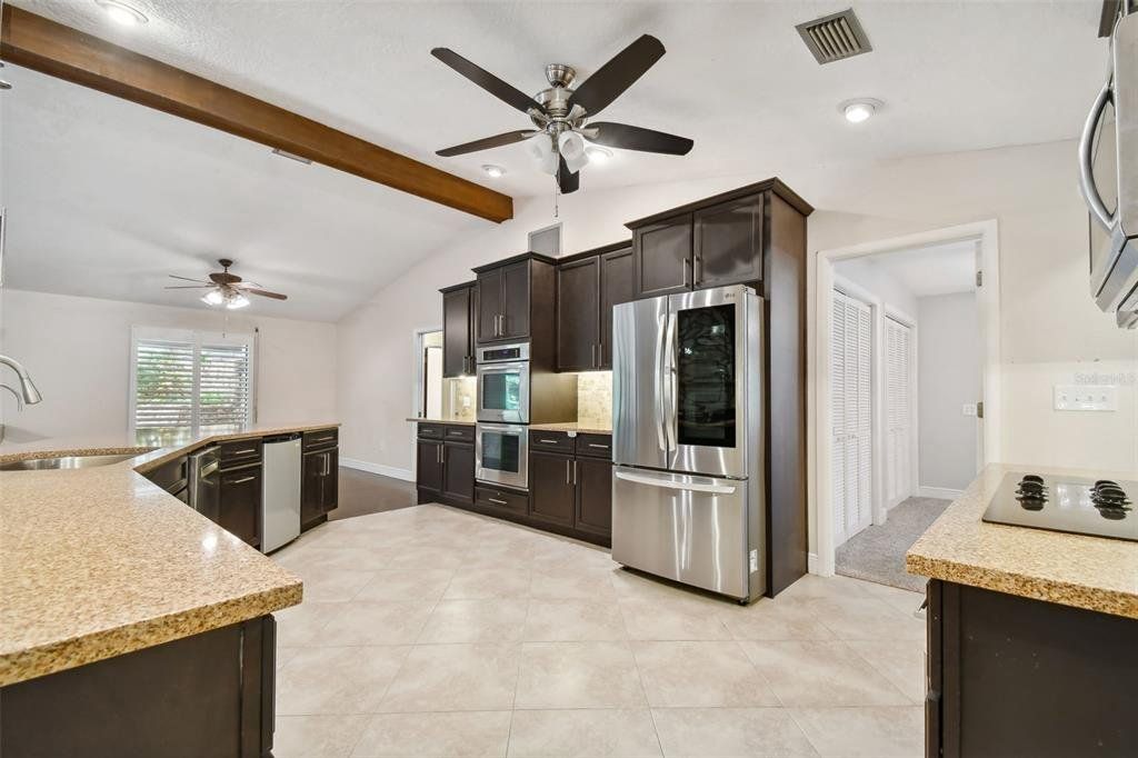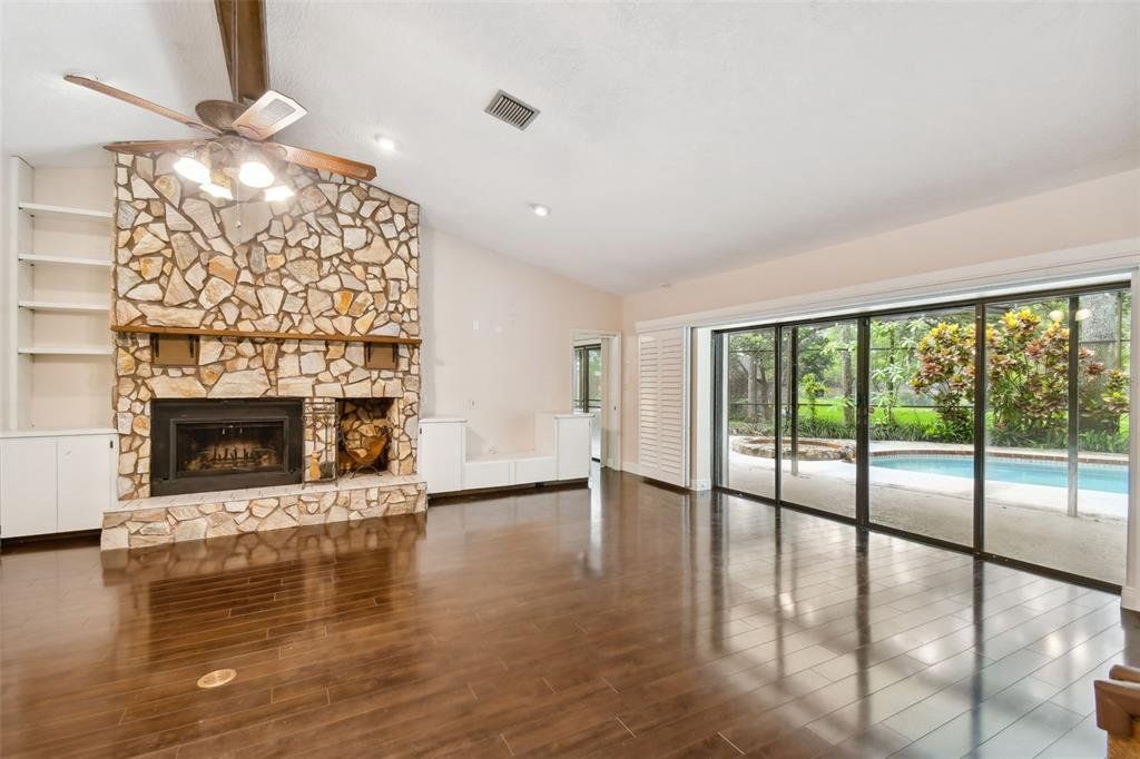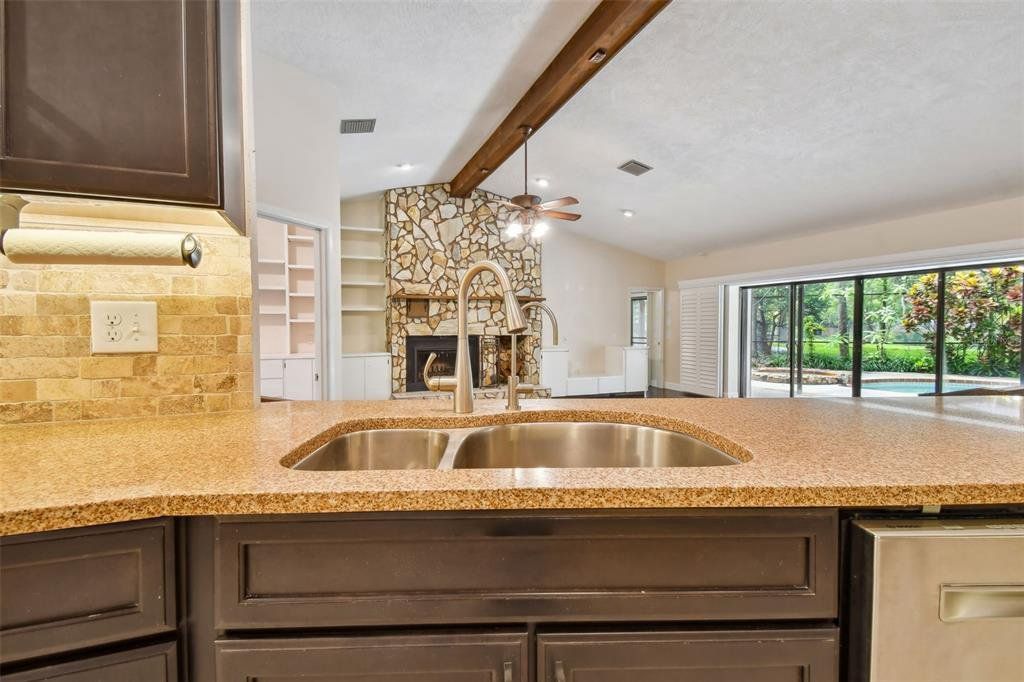 Surrounded by serene, mature landscaping and situated in a non-evacuation zone ~50 feet above sea level, you will find 3015 Tall Pine Drive in the ultra-desirable Rainbow Farms neighborhood. Overlooking a quiet conservation pond, you’ll enjoy a fun day splashing in the dual shallow ended pool with a soothing trickling waterfall over the rock wall. This four-bedroom, two-bath updated home is simply ideal in so many ways. The renovated kitchen boasts ample kosher-compatible Caesarstone quartz countertops, newer stainless LG and Kitchen Aid appliances including dual ovens, view friendly refrigerator, flat surface cooktop, excellent pantry storage, water softener and whole-house filtration system. The primary suite is perfectly positioned overlooking the pool and backyard through your personal sliders. Two beds and an additional bath are across the home with the fourth bedroom also split, ideal for guests or a second office. The expertly appointed home office with cathedral ceiling is behind a glass door just off the living room. Completed with an oversized two-car garage, plantation shutters, child-safety pool fence, pineapple plants and tropical landscaping, this home is perfect for a growing family. Hurricane shutters, hard wired cameras with DVR, a locking mailbox, block construction and a roof installed in 2017 provide security, privacy and peace of mind. Close to everything and excellently rated schools, this home truly checks all the boxes and is a must see! Schedule your private tour today.