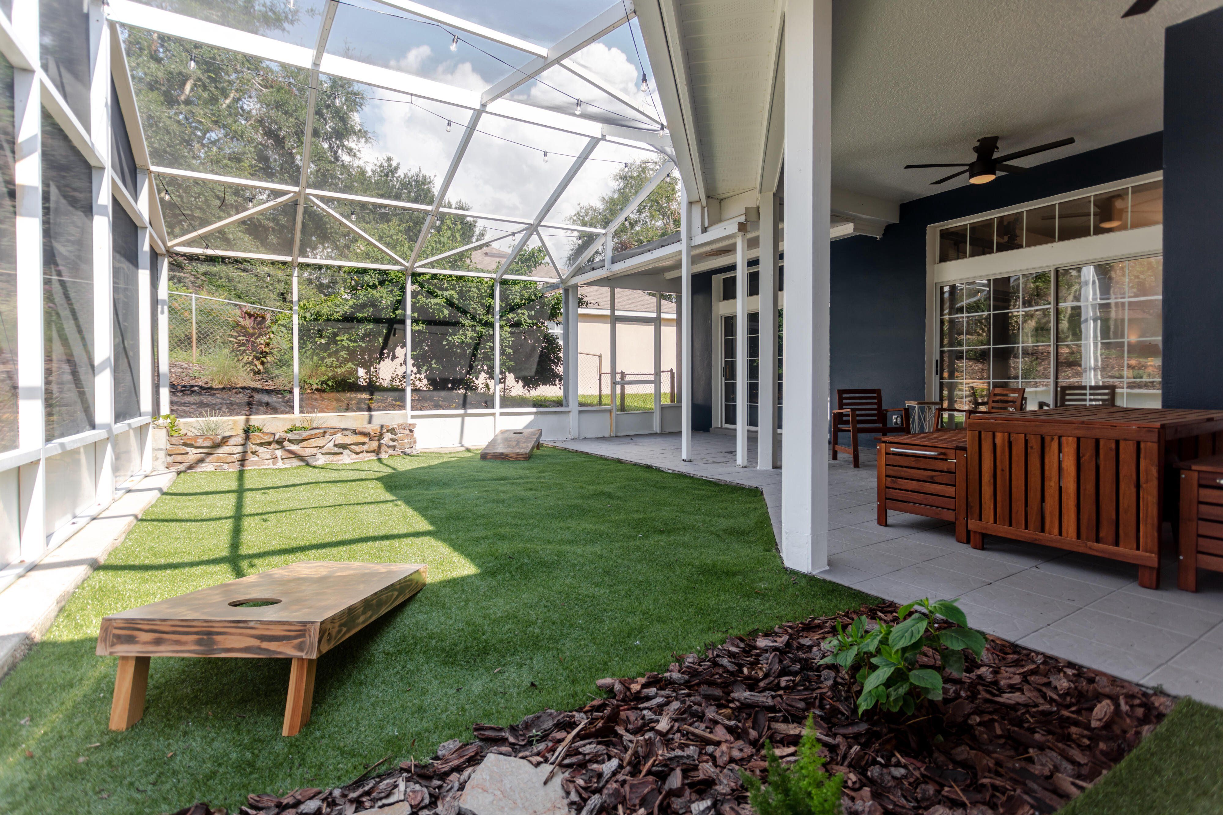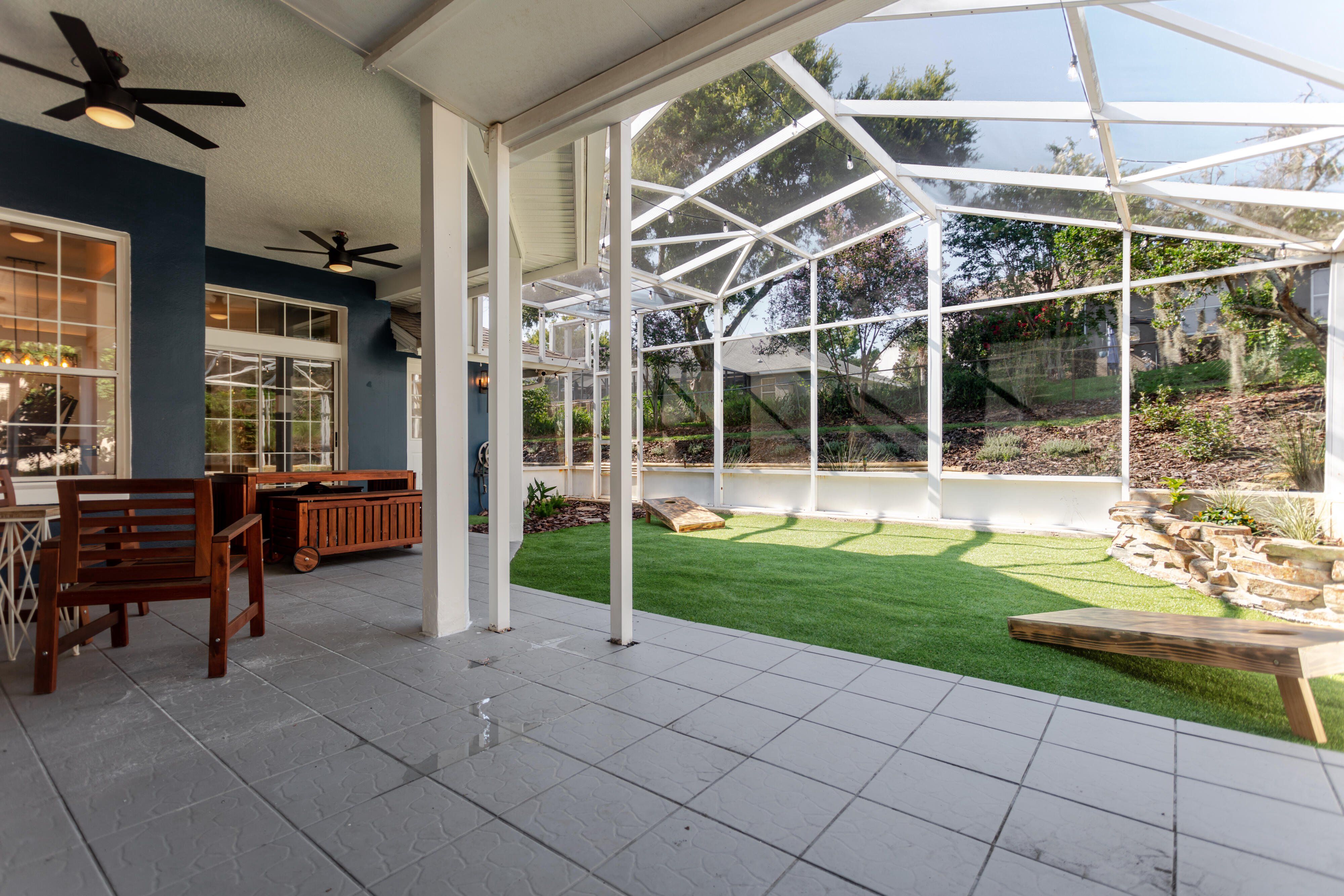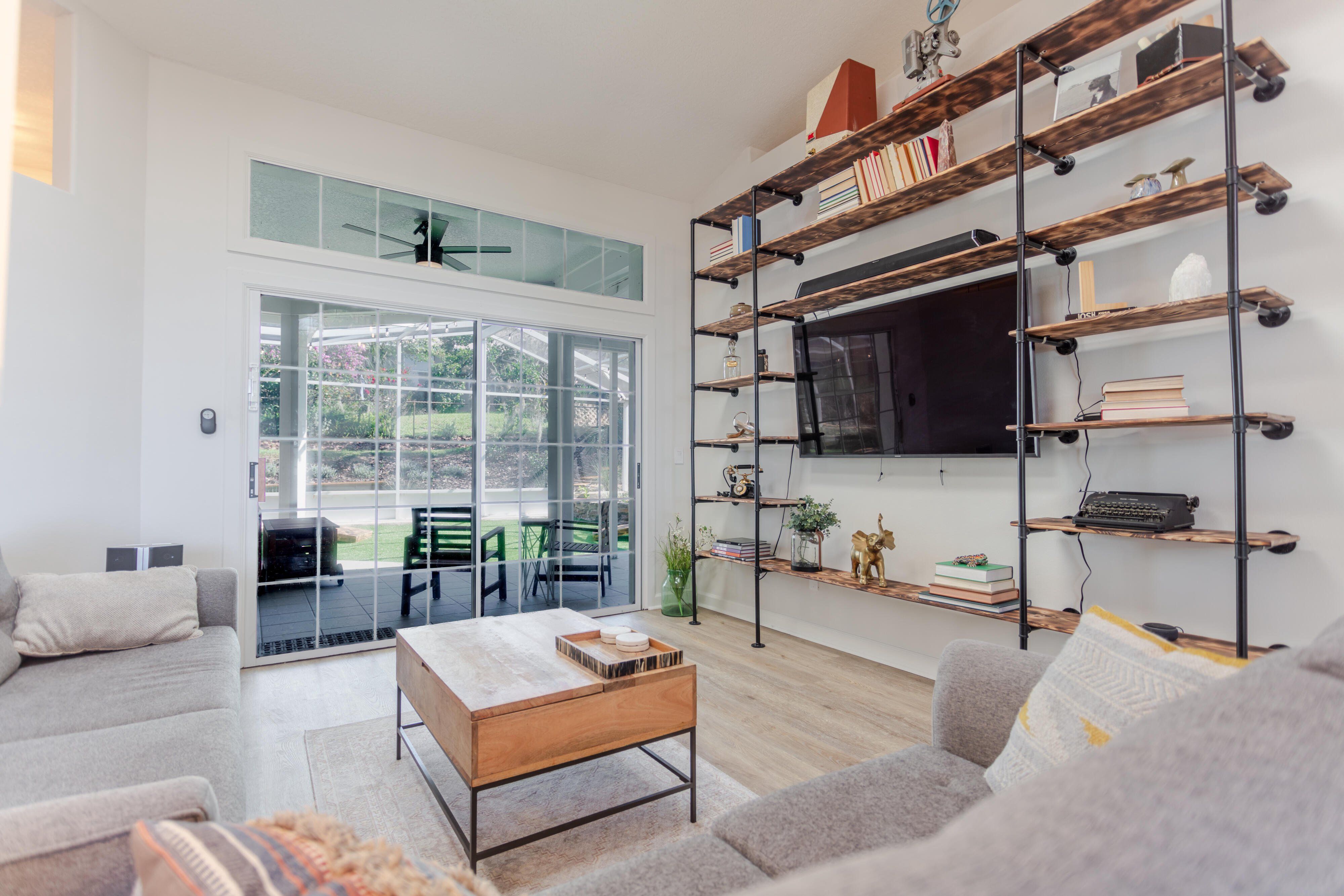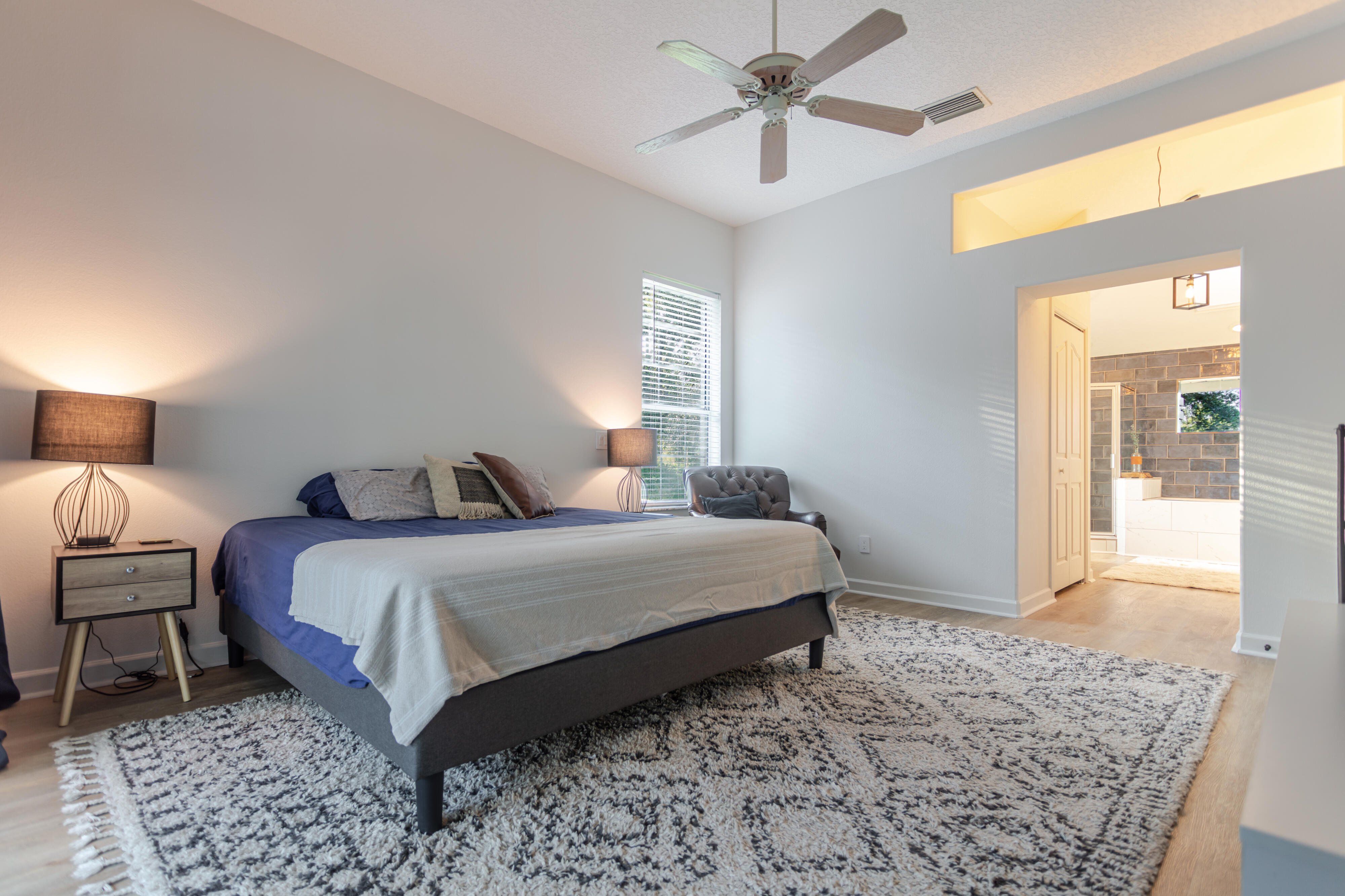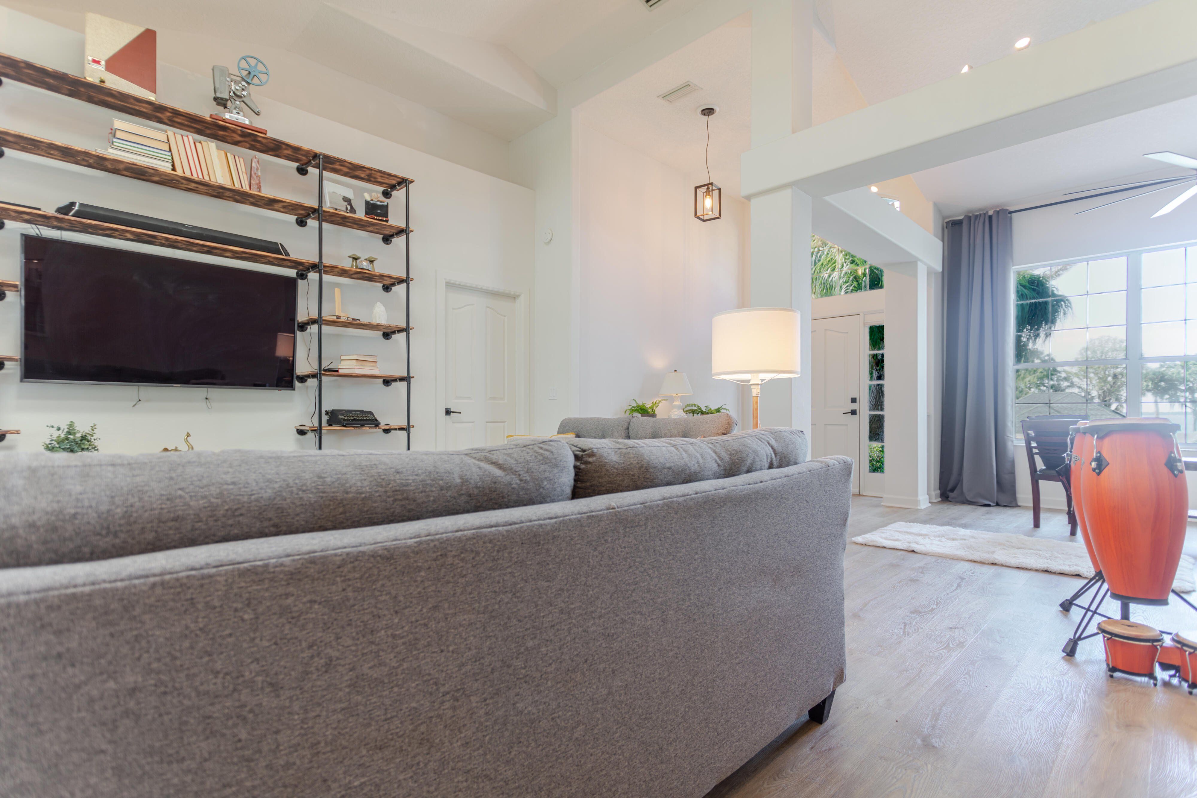 Lake views without the lakefront price. Beautifully renovated home located directly across the street from Lake Eustis with easy access to the Harris Chain of Lakes. This light-filled home features soaring ceilings, an open-concept layout, and modern finishes throughout. The updated kitchen includes quartz countertops, stainless steel appliances, navy shaker cabinetry, and a large center island for entertaining. Luxury vinyl plank flooring runs throughout the home and complements the stylishly renovated bathrooms with modern vanities and designer tile. The spacious primary suite with direct access to the screened outdoor living area, creating seamless indoor-outdoor living. Enjoy Florida living in the expansive screened lanai and covered patio featuring a large low-maintenance turf area for relaxing, entertaining, or pets. Additional features include an indoor laundry room, flexible space for an office, gym, or guest space, and established landscaping. Conveniently located just minutes from downtown Eustis, waterfront parks, boat ramps, restaurants, and festivals. Move-in ready and perfectly positioned to enjoy the Lake Eustis lifestyle. Tenant Occupied until March 30th. Please do not disturb tenants. Available after March 30th.