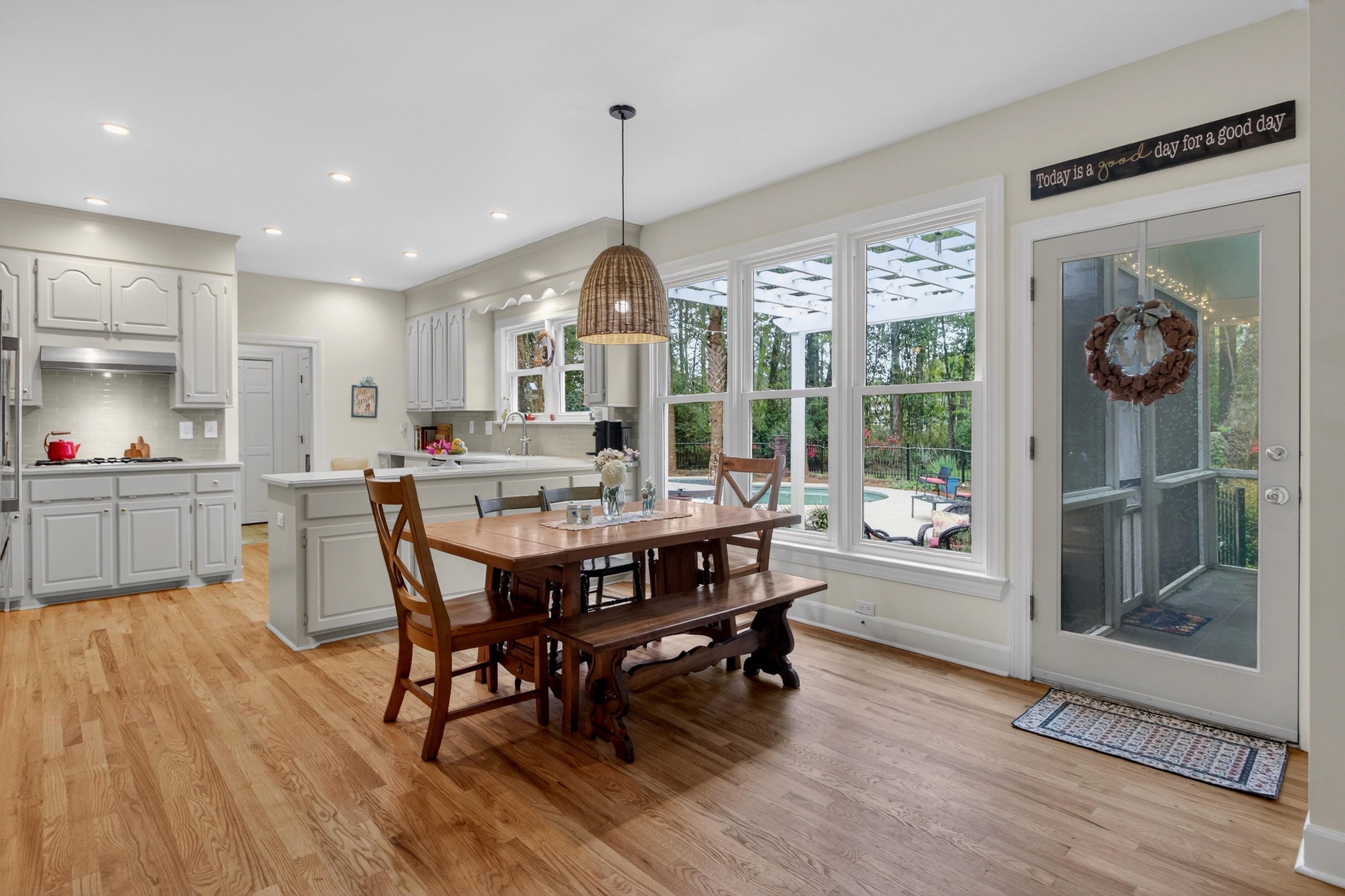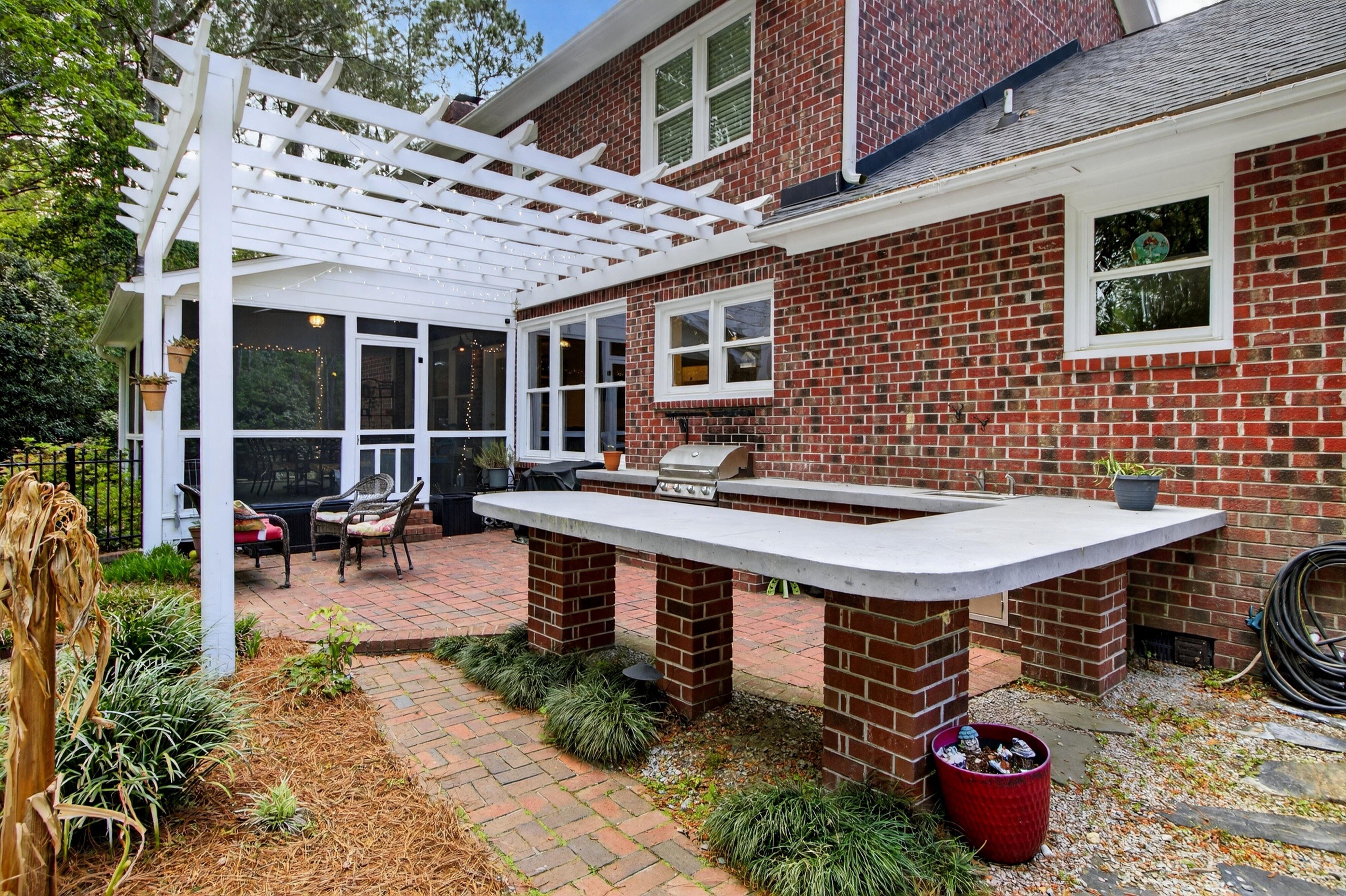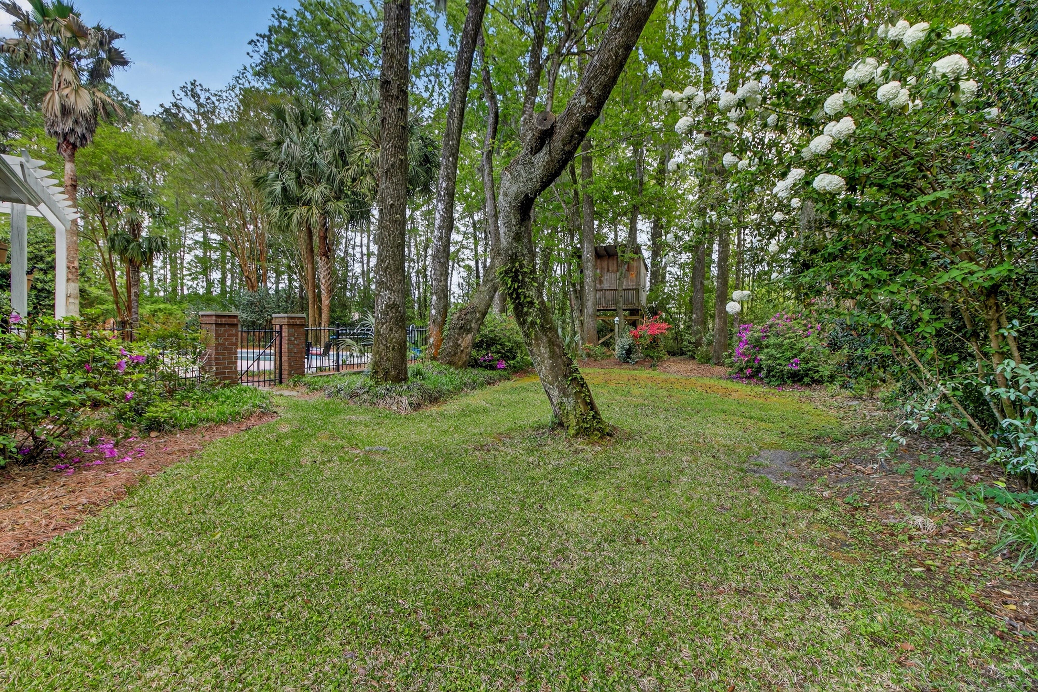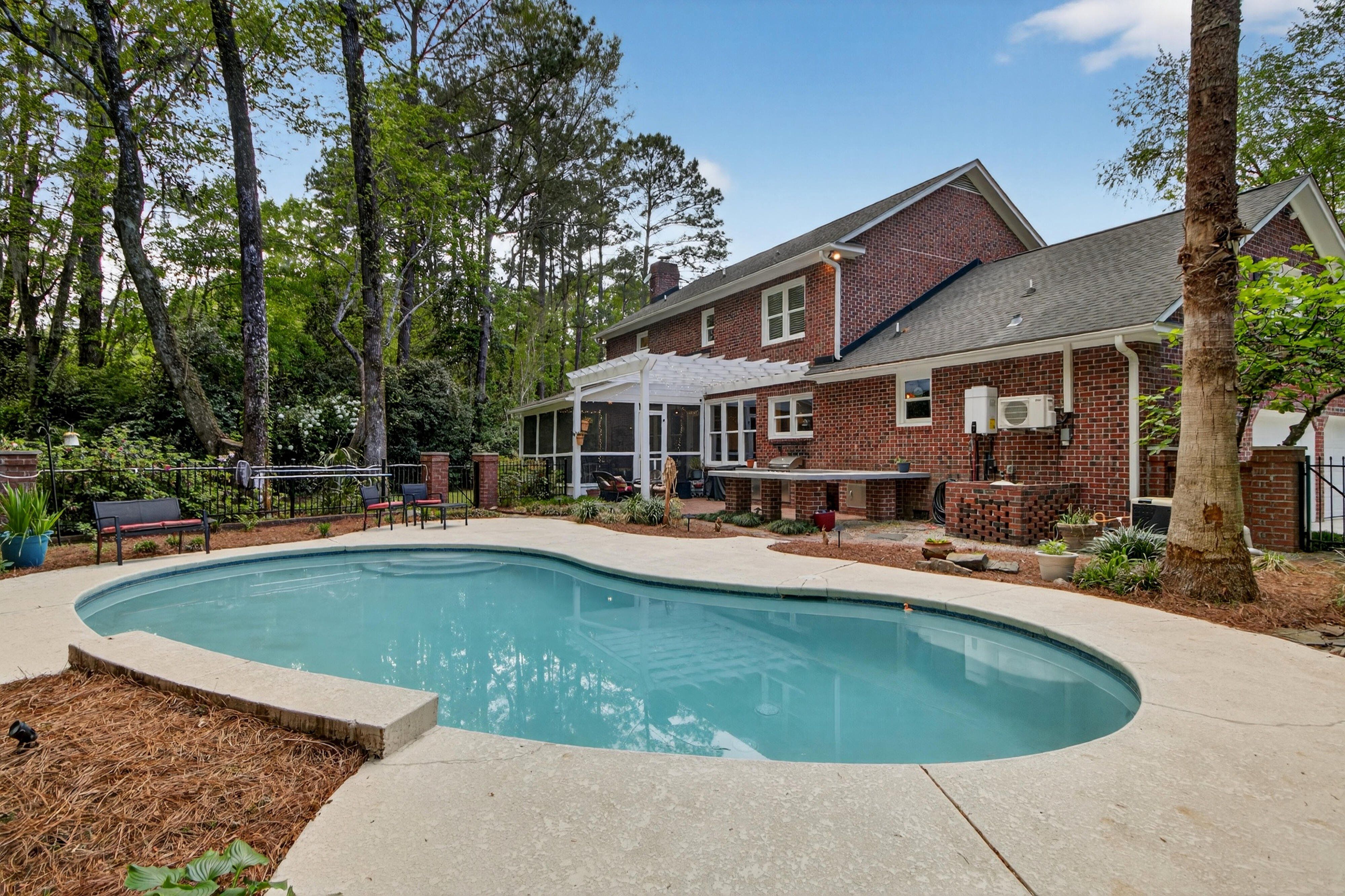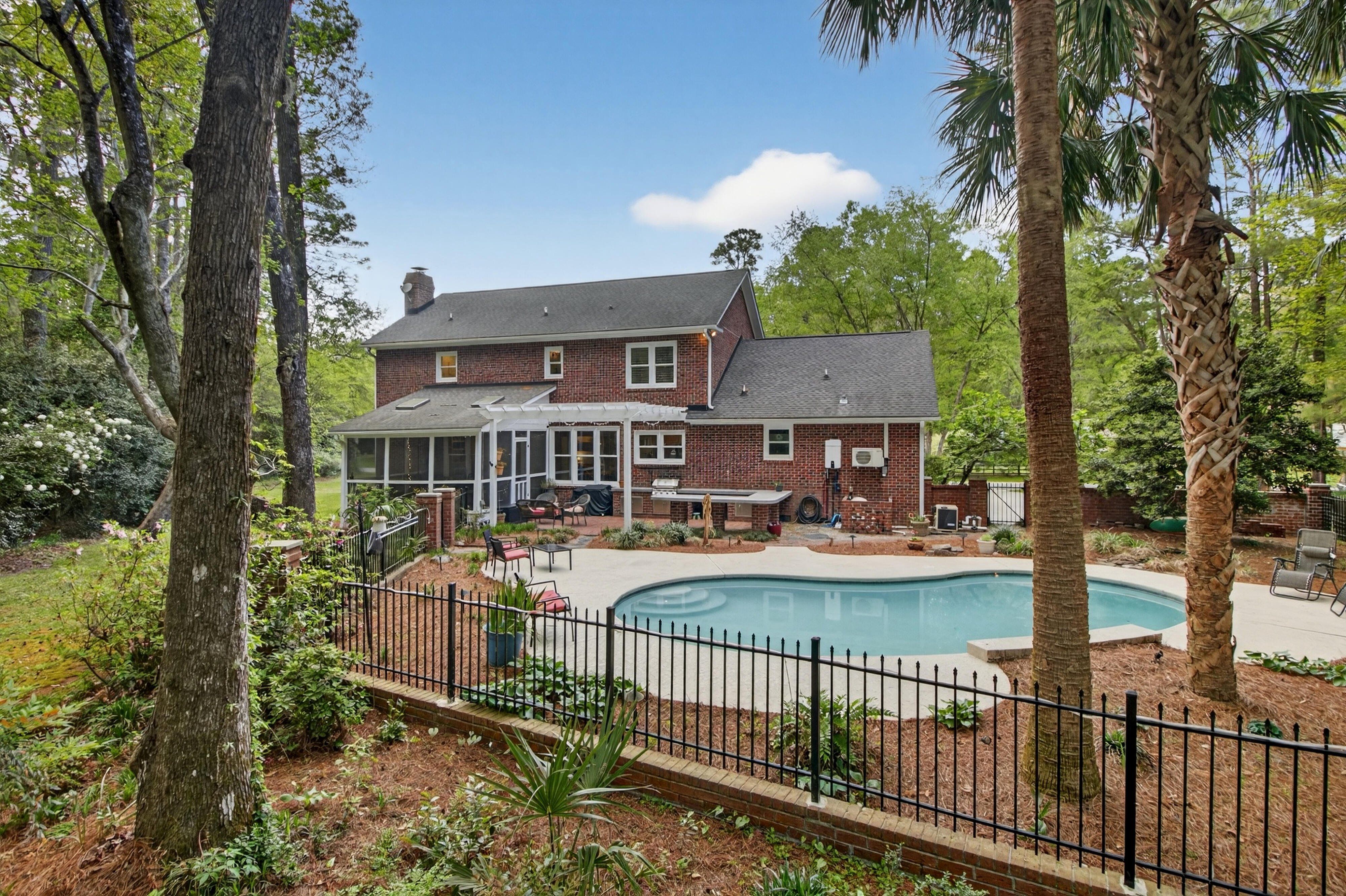 Down the road from downtown Summerville lies the quiet, established neighborhood of the country's first Tea Farm, where sprawling yards & no HOA make this one of the most desirable communities in the Lowcountry. This 2-story brick colonial boasts 5 bedrooms, 2.5 baths & a brand new custom-built library. Enjoy your beautiful eat-in kitchen with double ovens & stainless appliances. Oversized windows look out over your private backyard oasis, with a newly-resurfaced saltwater pool surrounded by palms, myrtles, azaleas & fig trees, an outdoor kitchen, & screened-in porch. The primary suite has a tray ceiling, walk-in closet & jetted tub. 3 more spacious bedrooms complete the upper level. The FROG flexes as a 5th bedroom, playroom, etc. Hardwood floors & crown molding add elegance throughout.