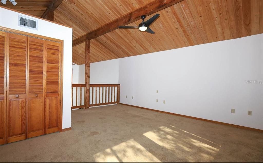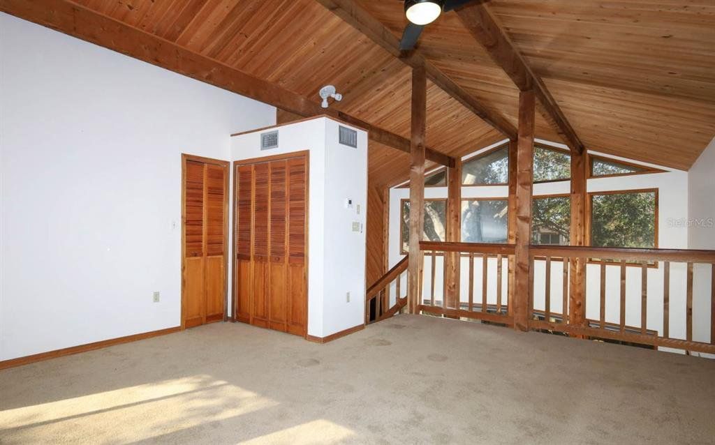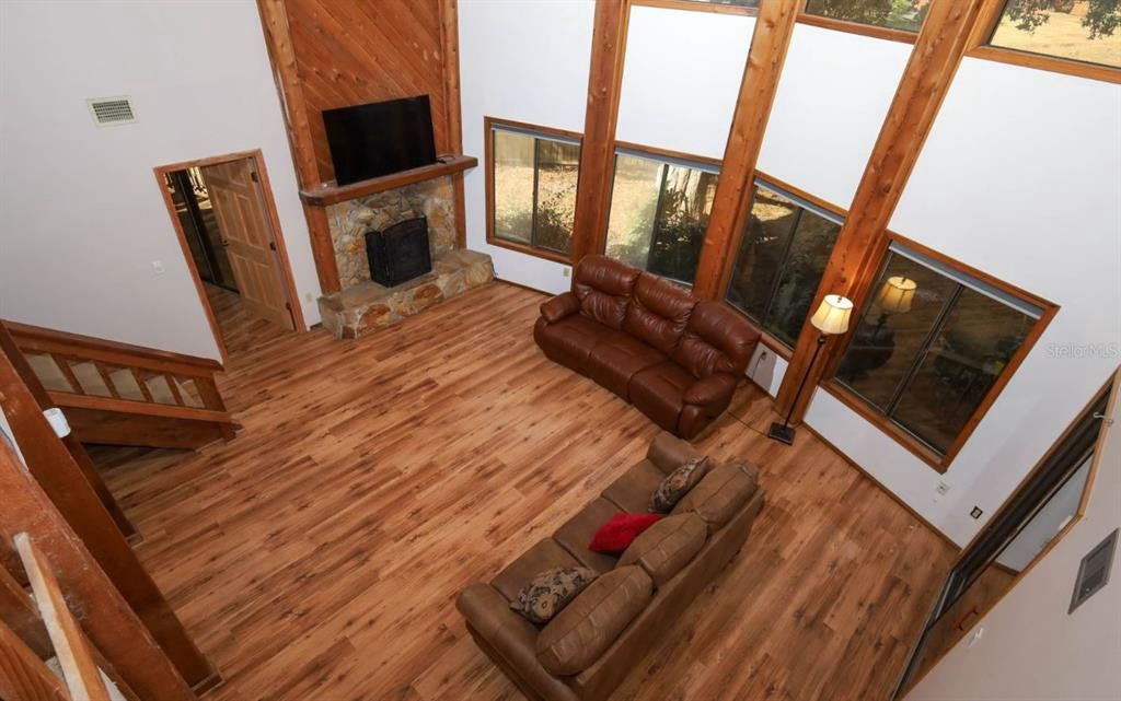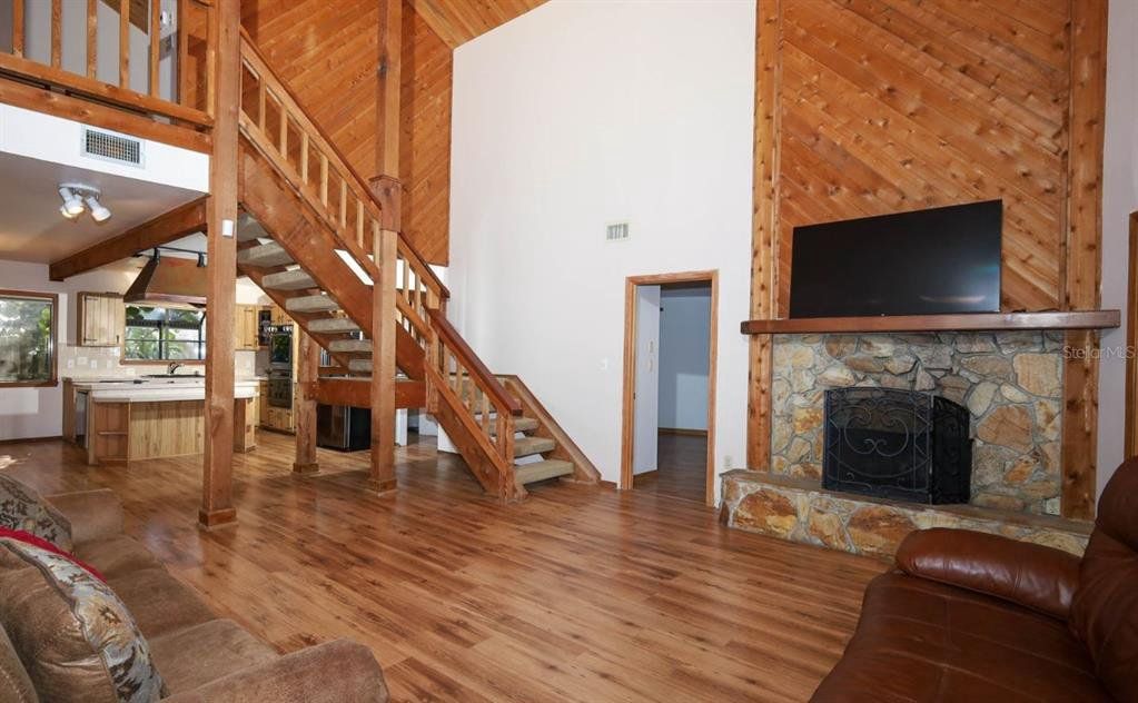 One or more photo(s) has been virtually staged. Escape into your private mountain-style retreat—where 30-foot pine ceilings, floor-to-ceiling windows, and a stone fireplace create cabin-inspired character and architectural finesse, and every space invites you to slow down and savor the view. You enjoy 3 bedrooms, 3 full baths, and 1,868 square feet of beautifully designed living space set on nearly a quarter-acre. Wide front steps welcome you home, creating peaceful spots for morning coffee, sunset conversations, and quiet moments of reflection. Inside, soaring ceilings and walls of glass fill the great room with natural light while framing tranquil golf-course vistas. The open island kitchen steals the spotlight with a patina copper range hood, sleek stainless-steel appliances, double ovens, a generous breakfast bar, and an adjoining dining area made for long, laughter-filled evenings. This thoughtfully designed home features two spacious primary suites, with the main bedrooms tucked into their own private wing with a full bath—perfect for rest and retreat. Just off the living area, a large tiled, screened-in porch expands your entertaining space and invites breezy gatherings. Upstairs, a loft or third bedroom with an attached bath overlooks the great room, creating a cozy perch for guests or a serene hideaway. Downstairs, you unwind in a luxurious primary suite with direct deck access. Step outside to outdoor living at its finest—an open back deck captures sweeping backyard views and refreshing coastal breezes, with the ocean only 12 miles away. The fully fenced yard offers room to roam, garden, or play, plus a powered workshop shed with A/C and a double-gate entrance for added flexibility. This is more than a house—you arrive at a sanctuary.