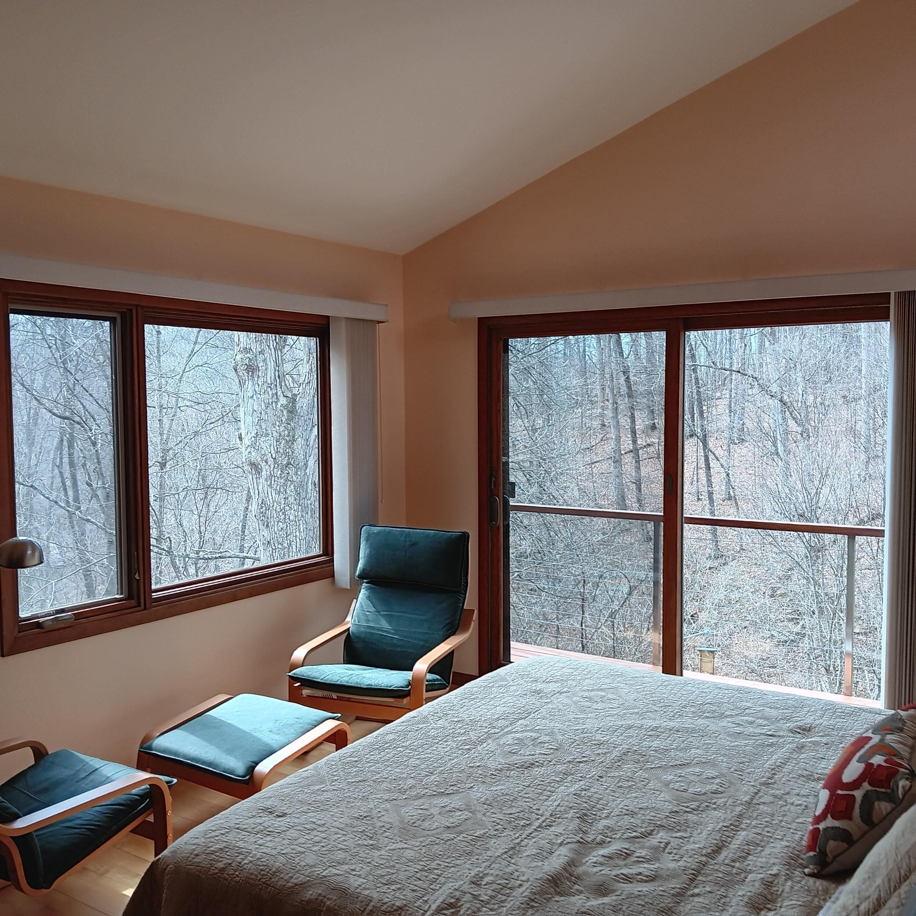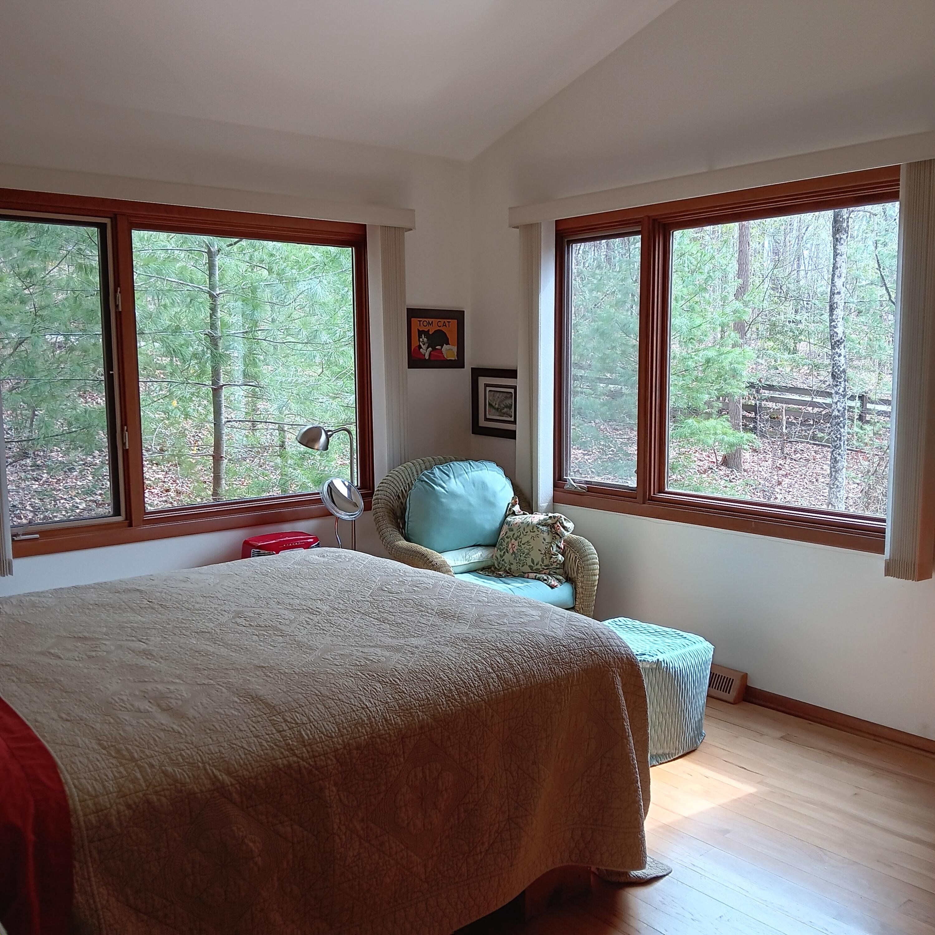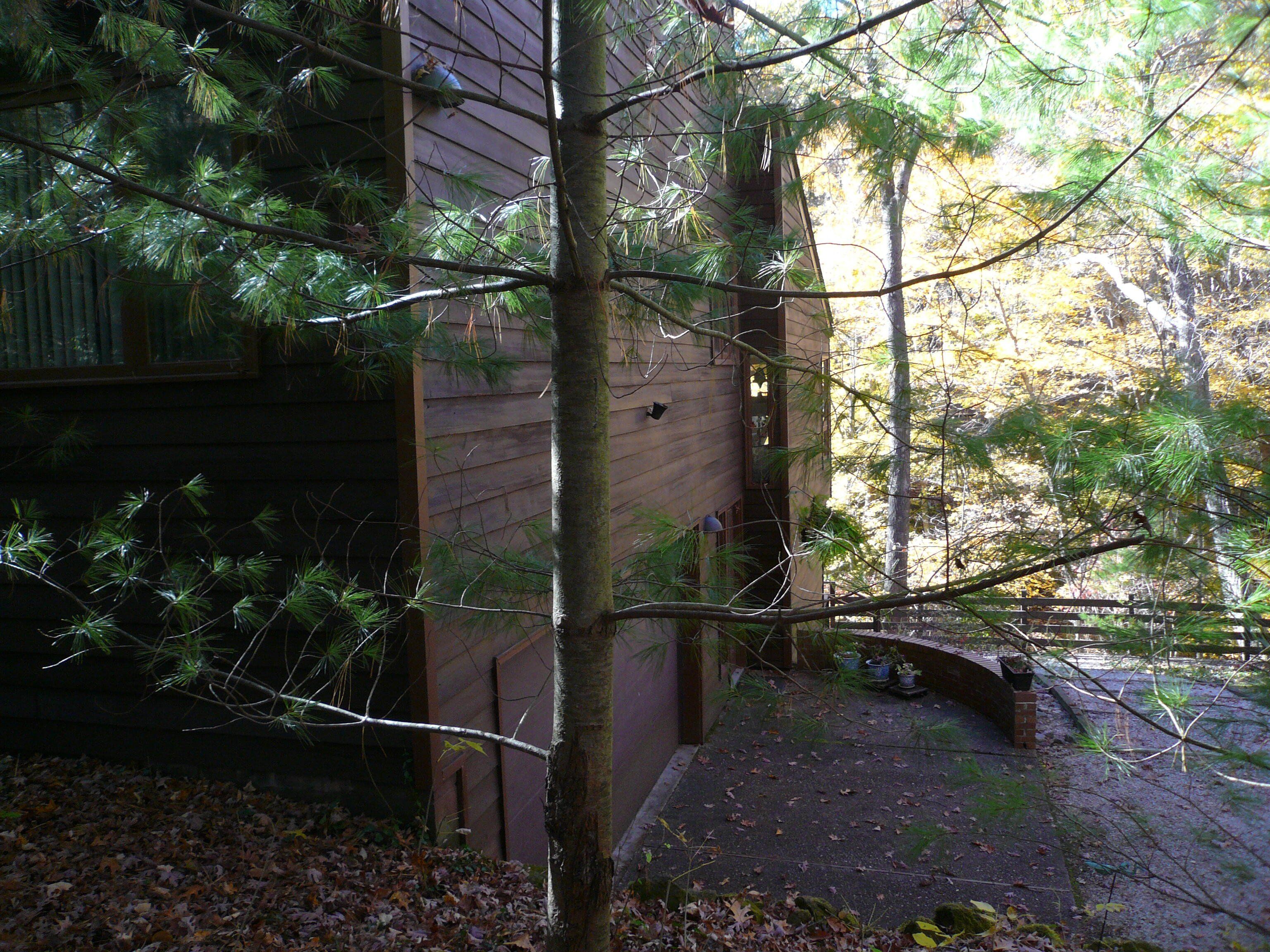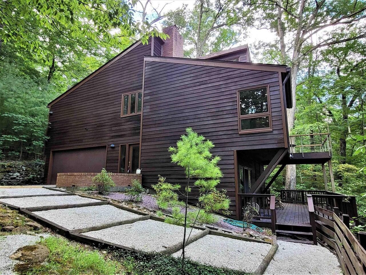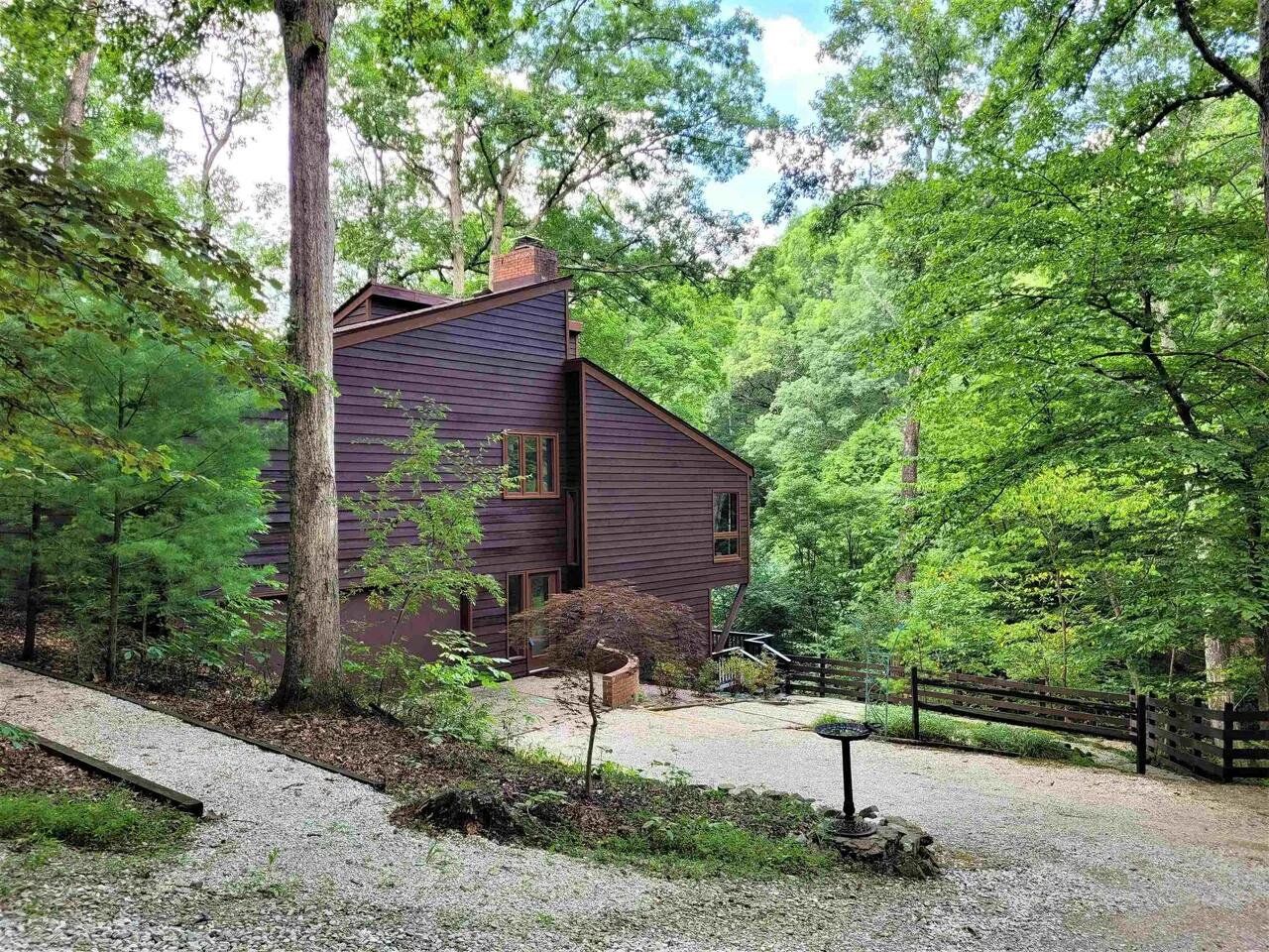 This jewel-like Mid-Century Modern on serene and scenic 1.32 acre wooded wonderland is both quiet and dramatic, yet only 7 or 8 minutes from campus, College Mall, or I.U Hospital. Only 3 miles to University Elementary, Tri-North Middle School, or Bloomington H.S. North. Huge windows look into the woods and ravine with stream below, decks on 3 levels to enjoy leisurely dining or drinks, sweeping vaulted ceilings. Designed by prominent architect Duane Odle, built by John Ingram, the home is rated highly energy efficient by Duke Energy, featuring tankless water heater, new ultra-high efficiency dual-fuel furnace and 19SEER heat pump, solar roof panels, Generac whole-house generator. All new high-end kitchen and laundry appliances. Hardwood flooring and tile throughout. Newer roof and a pylon foundation anchored to bedrock. Low Monroe County taxes. The inventory of unique and personal, architect-designed homes is small and prized--make it yours!