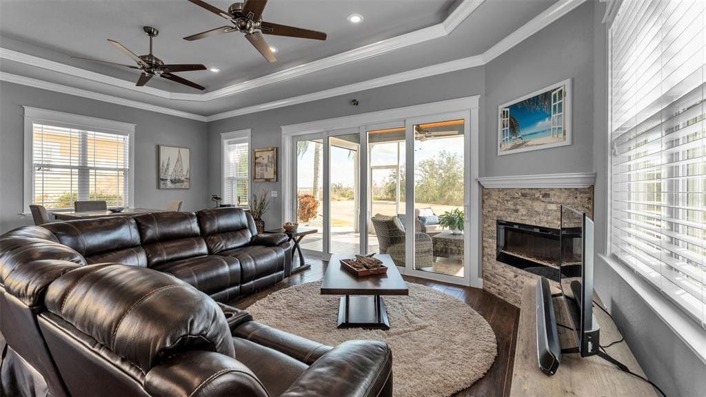 Interior Features: Crown Molding, Eating Space In Kitchen, Living Room/Dining Room Combo, Open Floorplan, Primary Bedroom Main Floor, Solid Surface Counters, Thermostat, Tray Ceiling(S)