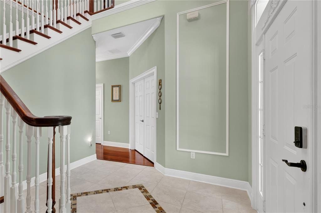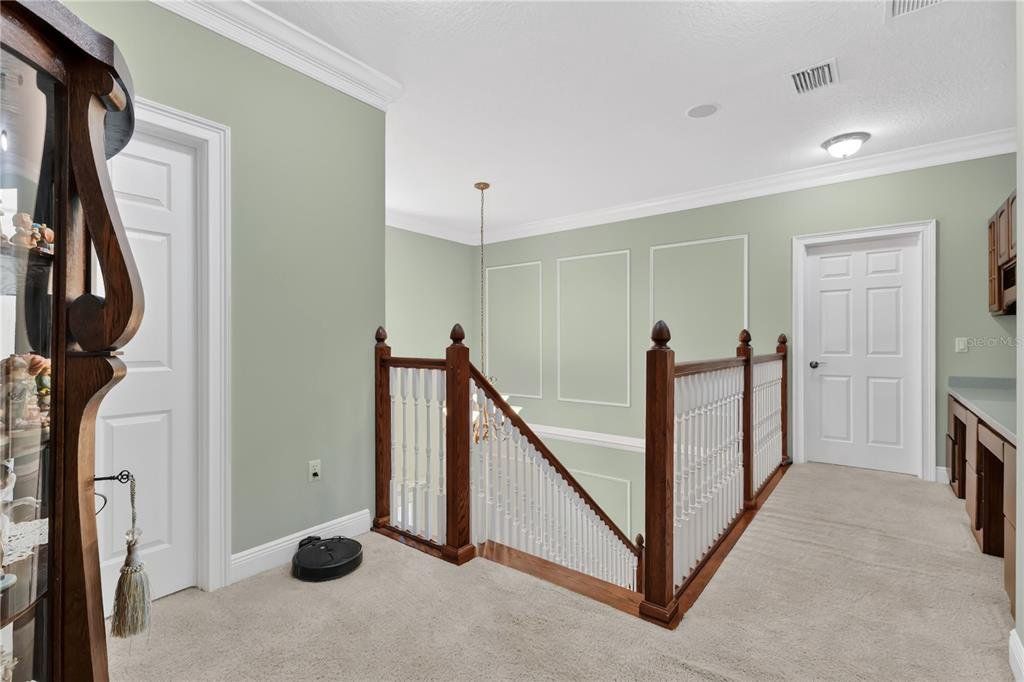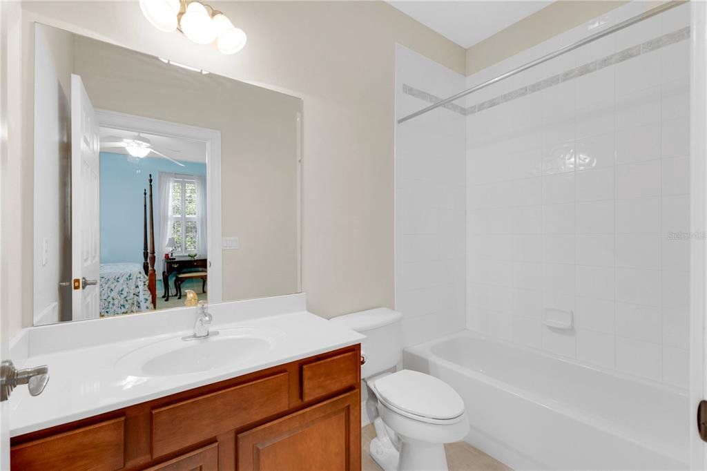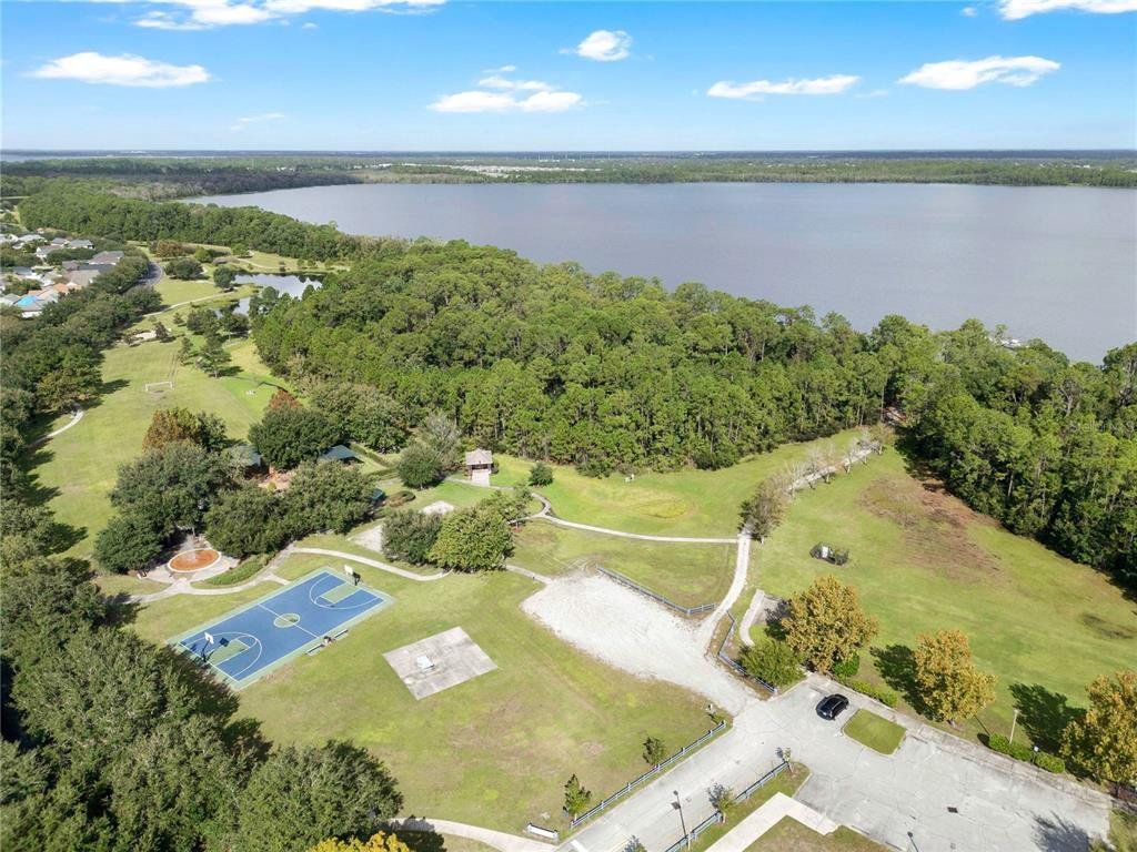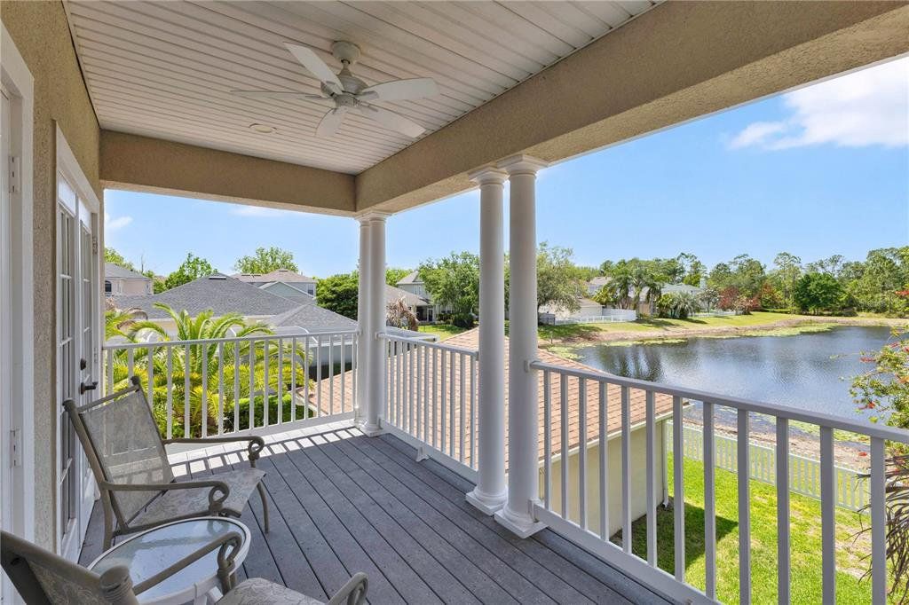 CDD PAID OFF! Welcome to this beautifully maintained 3-bedroom, 4-bath home located in the desirable Birchwood neighborhood of Harmony. From the moment you arrive, you’ll notice the inviting curb appeal with lush landscaping, elegant stone pavers leading to the front entrance, and an extended driveway guiding you to the detached two-car garage. A shaded front patio creates the perfect space to relax and unwind. Step inside to a thoughtfully designed layout featuring a striking staircase and a versatile flex room—ideal for a home office, playroom, or potential fourth bedroom. The main living area offers an open-concept design where the living room, dining area, and kitchen flow seamlessly together—perfect for both everyday living and entertaining. The kitchen is equipped with stainless steel appliances, rich dark cabinetry, and ample counter space, and features a wraparound bar area ideal for casual meals. A convenient serving window and bar setup make hosting and serving food effortless. The dining area is filled with natural light from surrounding windows, while the living room is bright and welcoming with double doors leading to the backyard. The den includes a smart TV that conveys with the home, offering a turnkey entertainment setup. Upstairs, you’ll find built-in desk spaces with cabinetry—perfect for work or study. The spacious primary suite is a true retreat, featuring private access to an oversized balcony with peaceful water views. Dual walk-in closets with built-in shelving provide generous storage, while the en-suite bathroom offers a dual-sink vanity, a garden tub with relaxing jets, and a large walk-in shower. Each additional bedroom is generously sized and includes its own private full bathroom, offering comfort and privacy for everyone. Step outside to enjoy a covered patio with a ceiling fan and an extended paver deck—perfect for entertaining or relaxing while overlooking the fenced backyard and serene water views. Located in a community known for its amenities and convenient access to major roads, highways, dining, and entertainment, this home offers the perfect blend of comfort, functionality, and lifestyle.