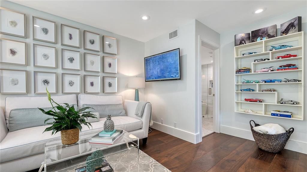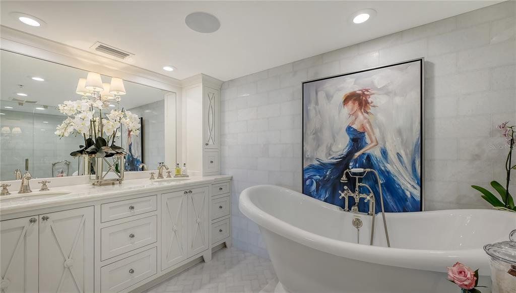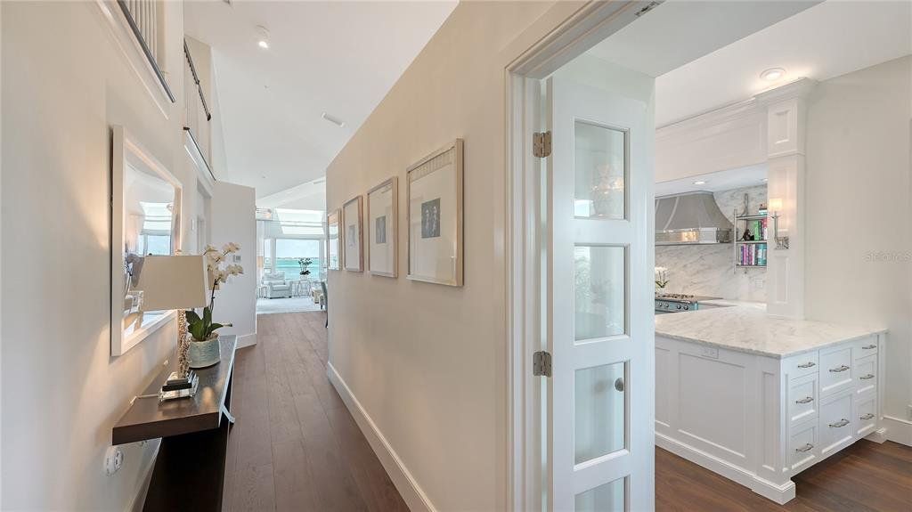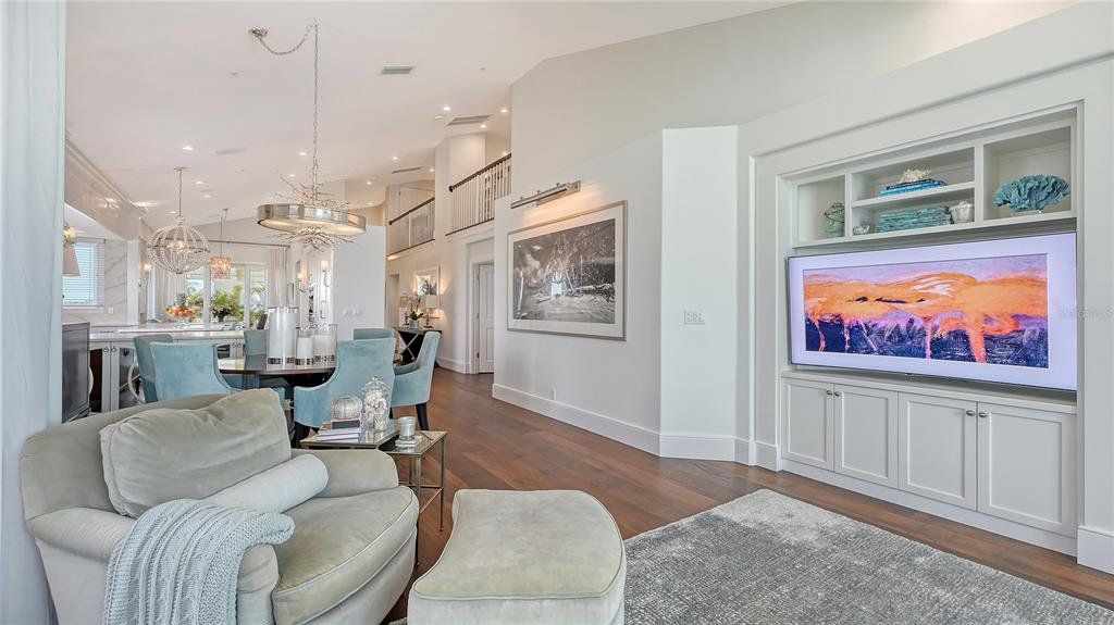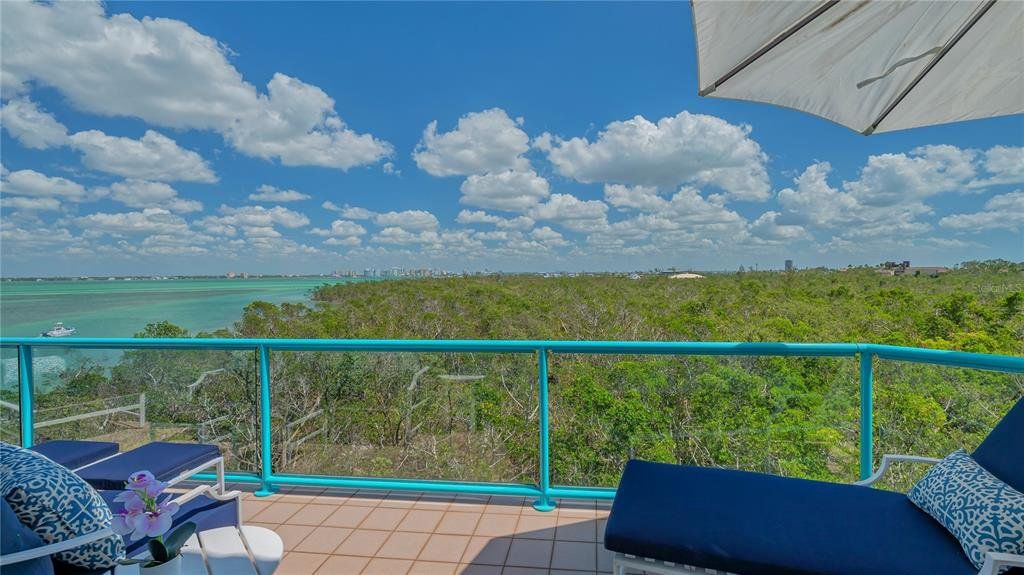 Two-level penthouse residences at Tangerine Bay Club are rarely available, and this south-facing corner offering sets a new benchmark for waterfront living. Recently reimagined, this nearly 3,000-square-foot residence captures expansive views of Sarasota Bay, the downtown skyline, and protected mangrove preserves, all while offering exceptional privacy. With two generous terraces, a private courtyard entry, and a private two-car garage, the layout lives with the ease and separation of a single-family home. The interior blends coastal sophistication with thoughtful upgrades throughout. An open-concept living space features vaulted ceilings, a skylight, gas fireplace, and a custom entertainment wall, while walls of glass frame the bay and open to outdoor terraces for seamless indoor-outdoor living. Impact-rated Andersen windows, motorized storm shutters, custom LED lighting, and California Closets elevate both comfort and functionality. The gourmet kitchen anchors the main living level and is designed for both daily use and entertaining. Finishes include honed marble countertops, a leathered-stone island, custom cabinetry by Campbell Cabinetry Designs, and chef-caliber appliances. Highlights include a La Cornue dual-fuel range with French plate, Flamberge rotisserie oven, galley sink, wine cooler, and Sub-Zero beverage drawers. A breakfast nook and formal dining area provide flexible gathering spaces. The primary suite is privately positioned in the east wing, offering terrace access, custom wardrobe systems, and a spa-inspired bath with quartz surfaces, freestanding soaking tub, dual vanities, and a walk-in steam shower. A second bedroom with nearby full bath is currently styled as a den. Upstairs, a lofted lounge with built-ins and a third en-suite bedroom create an ideal guest retreat or work-from-home environment. Tangerine Bay Club is a resort-style Longboat Key community known for Mediterranean architecture, mature landscaping, and an active social atmosphere. Amenities include a 25-meter heated pool and spa on a private island, tennis and pickleball courts, fitness center, kayak launch, walking paths, and a day dock available on a first-come basis. Optional membership to the Bay Isles Beach Club offers deeded access to a private stretch of Gulf-front beach. Ideally located on the south end of Longboat Key, this residence is moments from the Longboat Key Club, Harbourside Golf Course and Marina, and popular waterfront dining. St. Armands Circle’s boutiques and restaurants are minutes away, with downtown Sarasota’s arts, theaters, galleries, and marina district just beyond—delivering a refined island lifestyle with effortless access to the region’s best amenities.