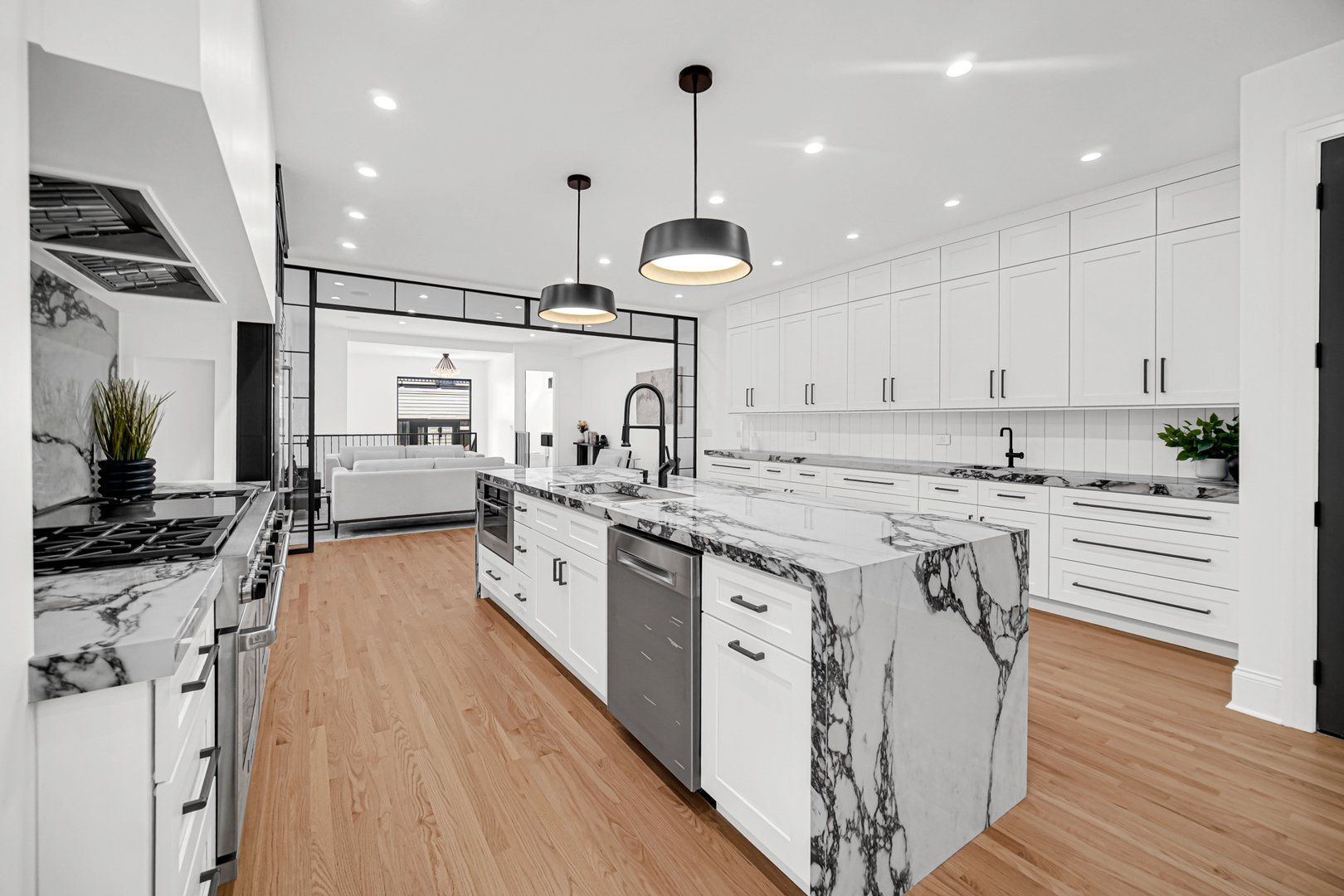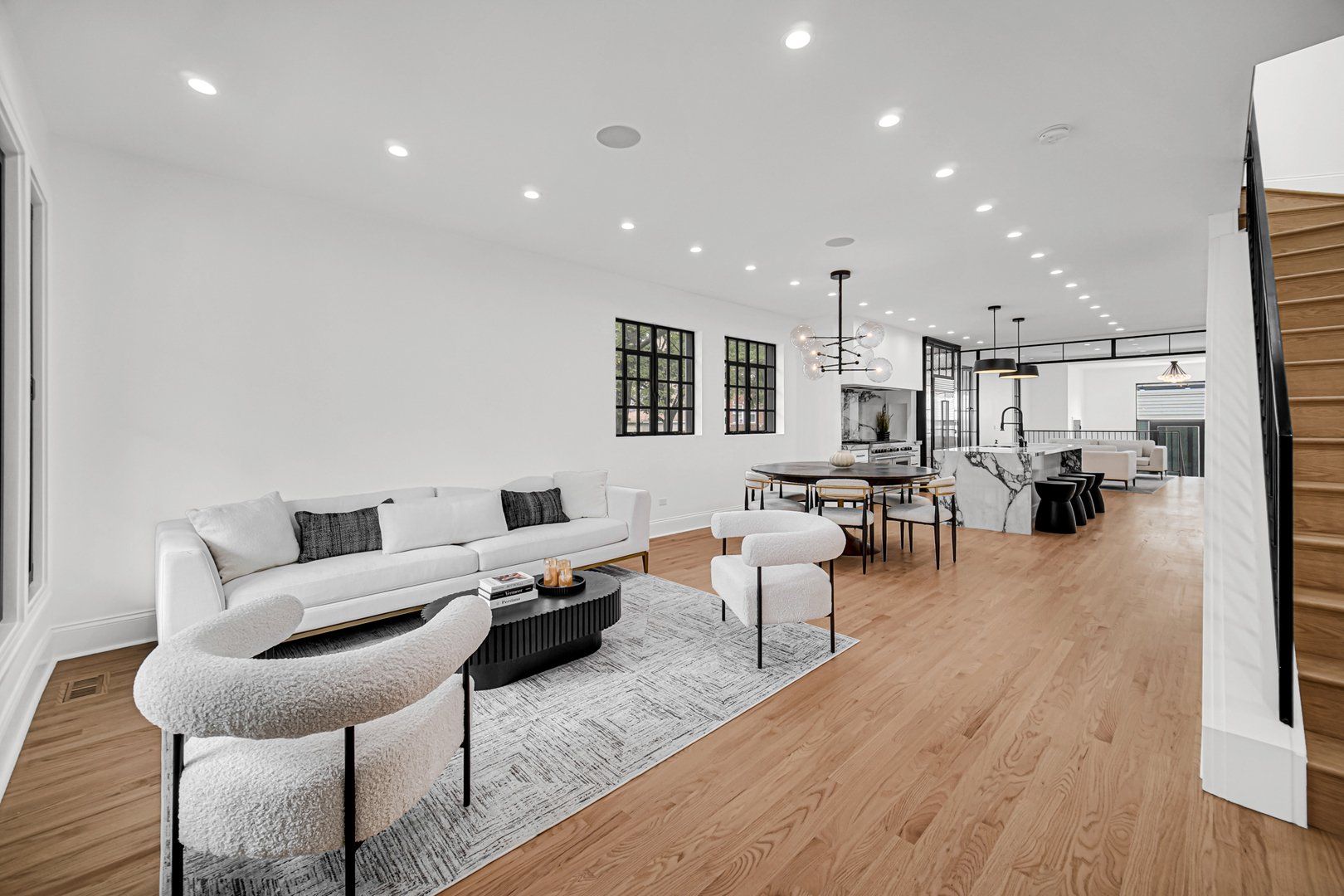Welcome to your dream home in the heart of Logan Square, a modern single-family residence that blends luxury with thoughtful design. Perfectly situated on a corner lot, this 5-bedroom, 3.5-bath home offers the ideal balance of sophistication, comfort, and convenience. The chef's kitchen is a true showpiece, featuring a 60" Wolf range, SubZero refrigerator, Bosch dishwasher, dual sinks, and Italian countertops. Custom metalwork, designed exclusively for the home, frames the open-concept kitchen and living area, while custom cabinetry surrounds the refrigerator for a seamless, modern look. Elegant lighting and finishes from Restoration Hardware bring a refined touch of luxury throughout. Upstairs, 6 skylights fill the vaulted ceiling hallways and bedrooms with natural light, creating bright and airy spaces. Four spacious bedrooms provide room for family and guests, while the lower level extends the living space with a fifth bedroom, a sleek wet bar, and a dog wash station. A thoughtful detail for pet lovers, the back entrance even includes a "dog apartment," perfect for keeping paws clean and organized. Throughout the home, integrated speakers set the perfect ambiance for everyday living or entertaining. The exterior is equally impressive, with crisp white siding, bold black Marvin and steel windows, and striking black accents. Outdoor living abounds with a welcoming front entrance deck, a private balcony off the primary suite, a designer patio, and a spacious rooftop deck above the 2-car garage. Located near Palmer Square Park, the 606 Trail, and the vibrant dining and shopping scene of downtown Logan Square, this home offers both a family-friendly environment and sophisticated city living. Whether hosting a gathering or enjoying a quiet evening at home, this residence was designed for those who appreciate quality, style, and comfort.