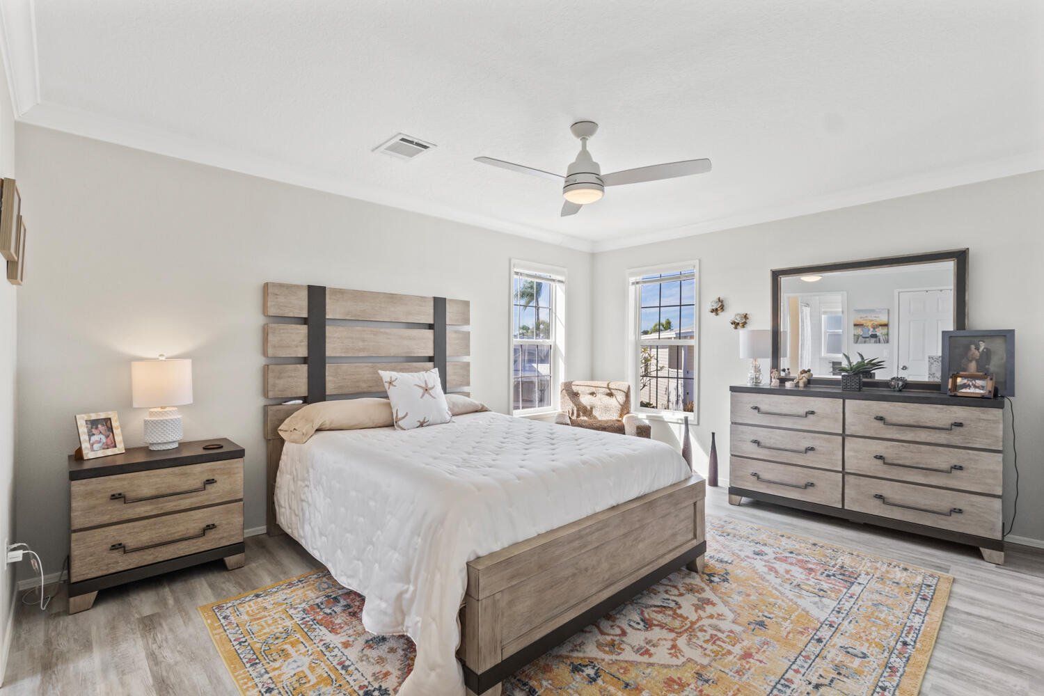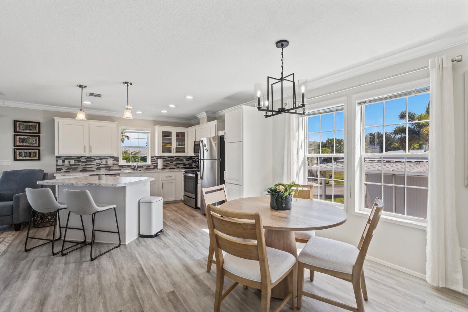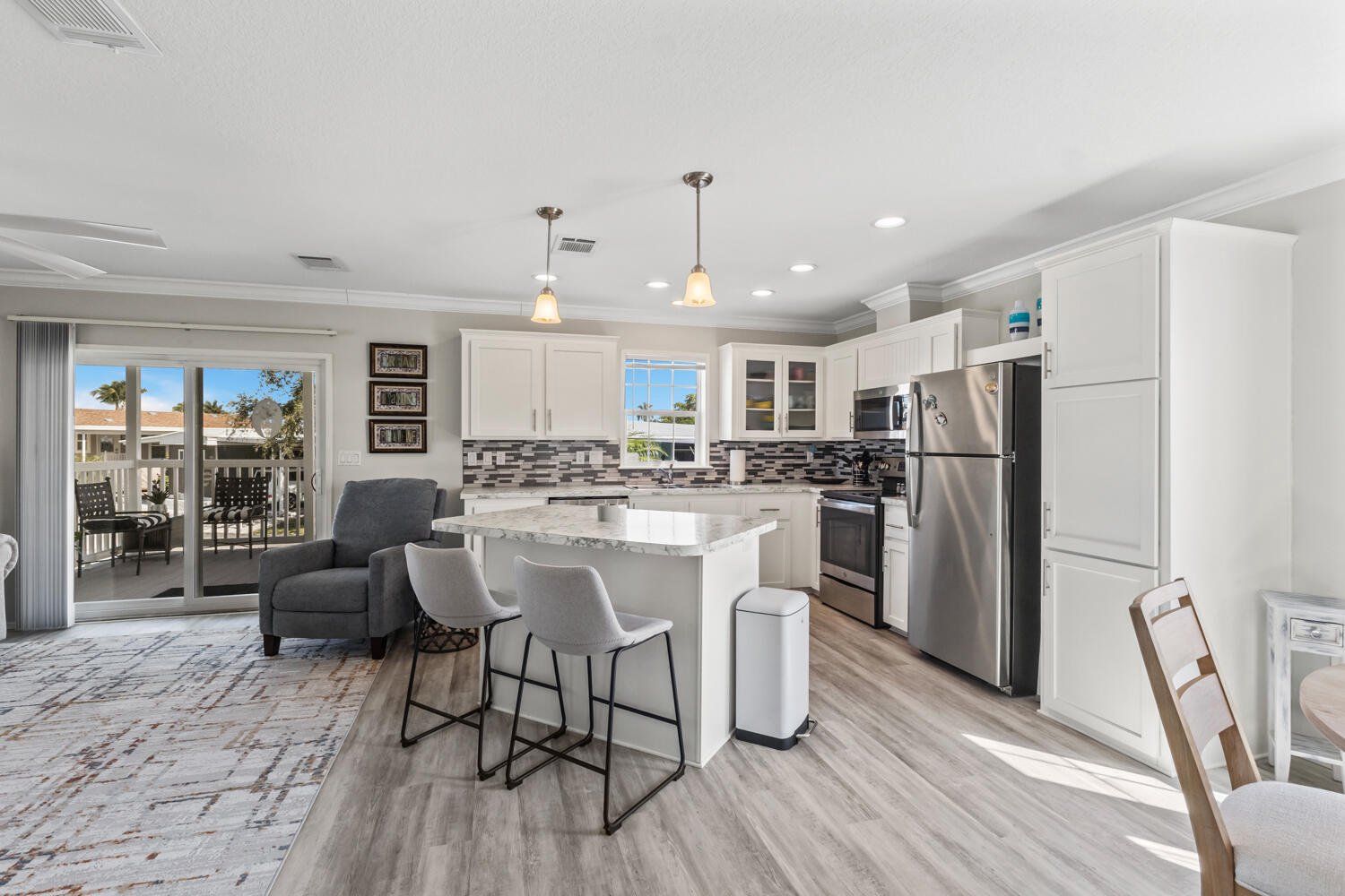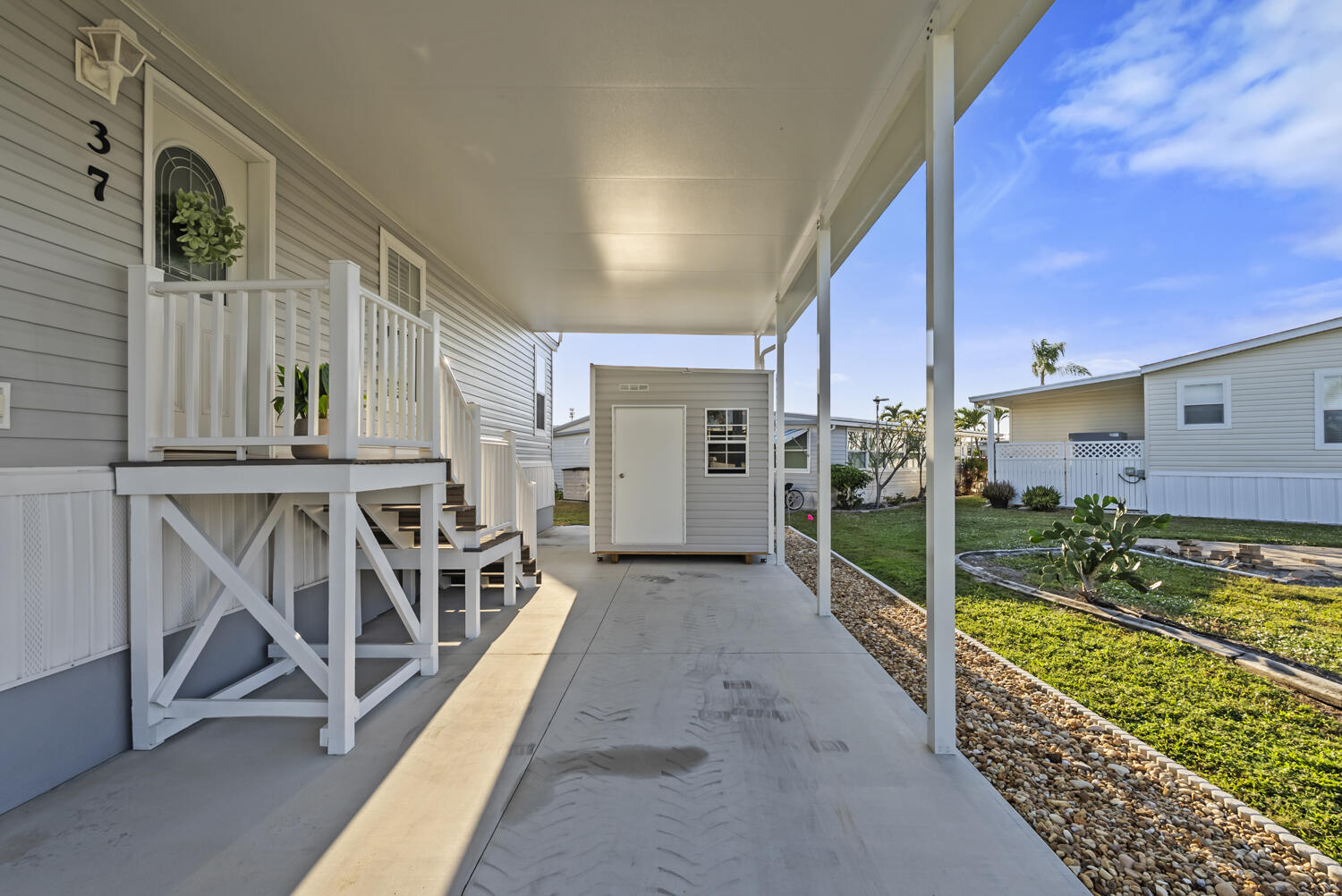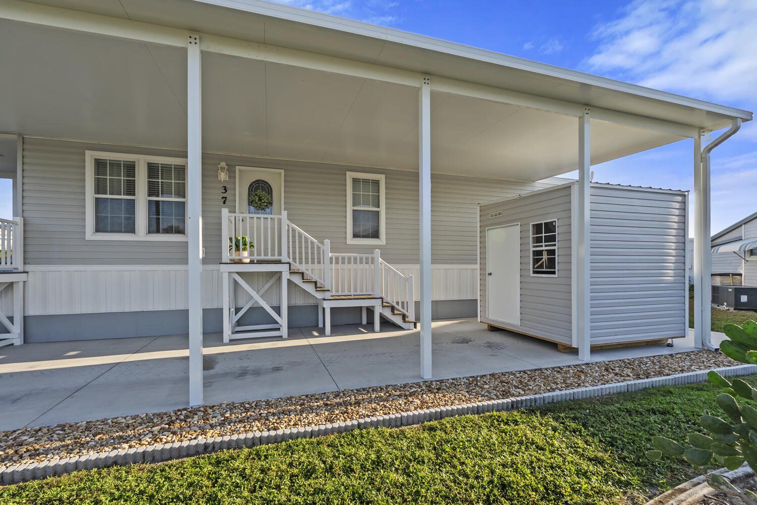 Own the land in Thunderbird Park! This 2023 Jacobsen home (ALL new since post-Ian except the lot!) is modern, charming, light, airy with so much to offer w crown moldings throughout, skirting anchored w hardie board, shed (11/05/25), extended & widened drive (say toys!!), continuous greige vinyl beachy flooring throughout, shaker cabinetry, fully covered porch, composite deck and stairs, kitchen island w extra storage, ceiling fans, stainless appliances, full-sized washer & dryer. Have peace of mind w Wind Zone 3 rating (highest current rating for wind safety in manufactured homes), featuring hurricane-resistant designs w wind-load rated roofs, impact-resistant windows, and reinforced wall systems; nothing to do but lock it when leaving! The carport is constructed w insulated panels & 4” beams, attached to roofline. The primary has two walk-in closets, while the guest has one. The community offers a remodeled clubhouse w many clubs & activities, including a pool, shuffleboard, bocce ball, horseshoes; 37 Ronald is only one block away. Prime location! Thunderbird ideally located… a few short miles to Fort Myers Beach & Sanibel with restaurants & shops abound locally.