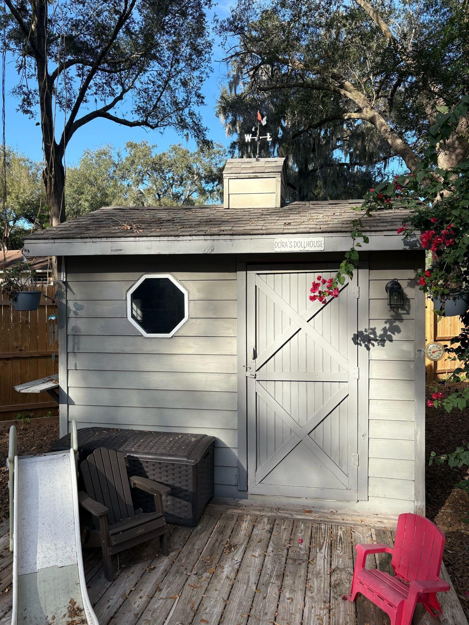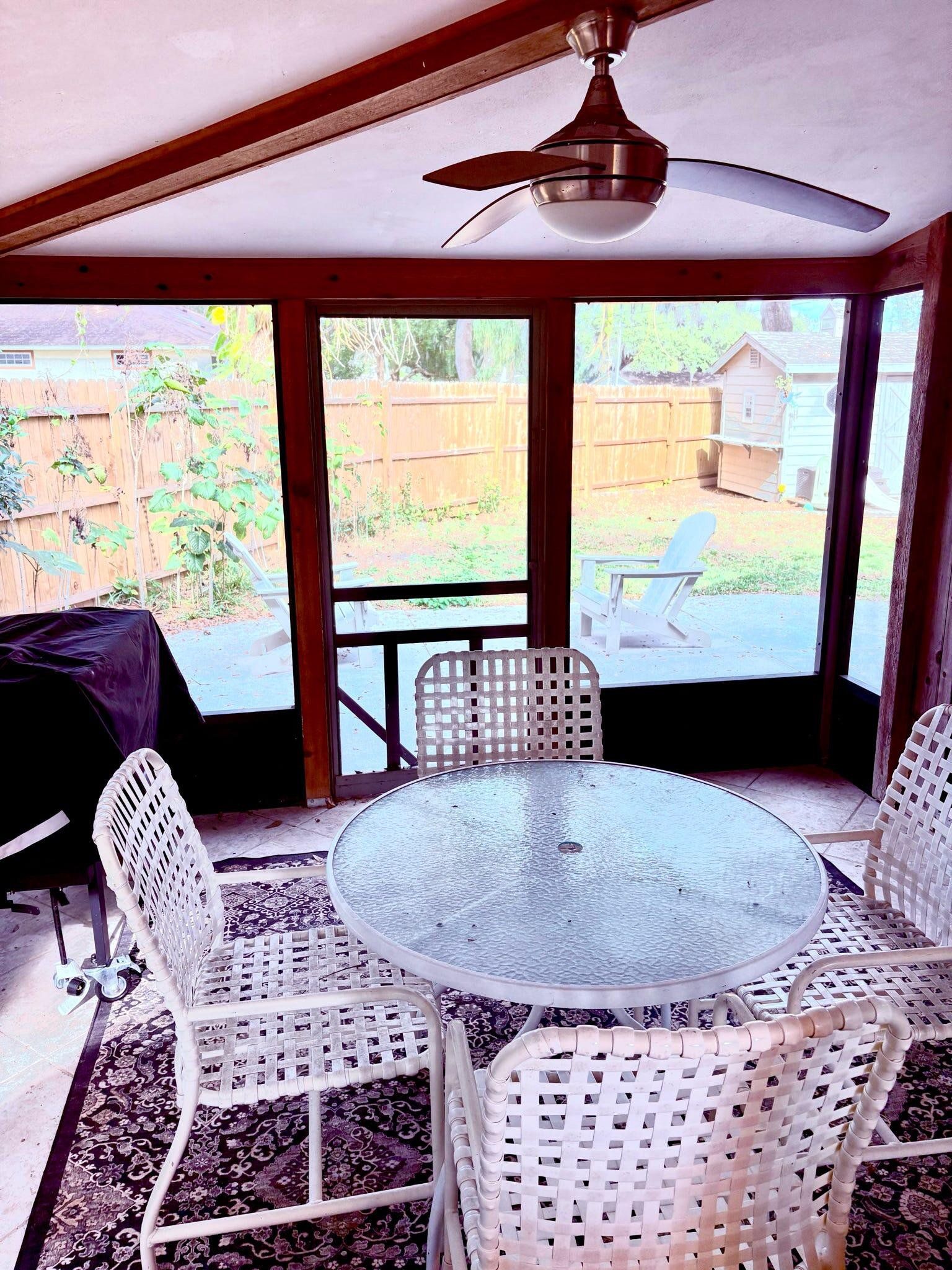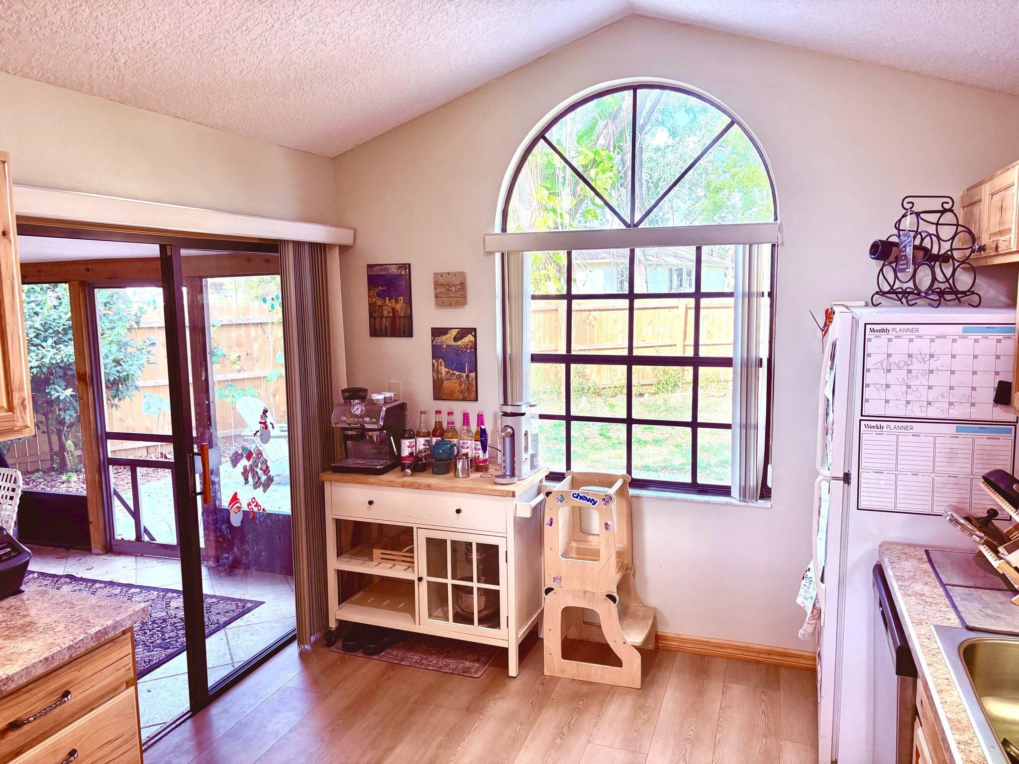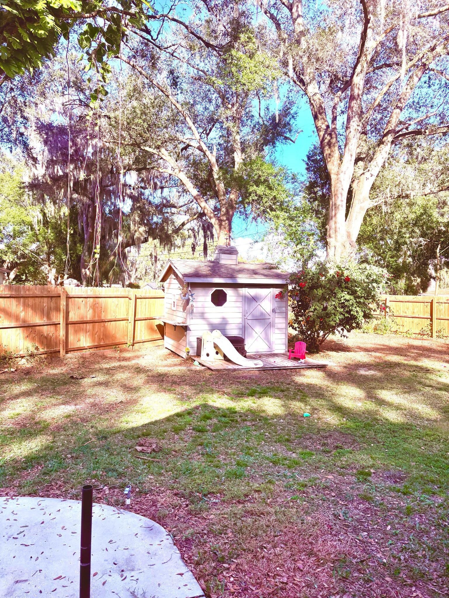 Welcome to this charming three-bedroom, two-bathroom home nestled in picturesque Mount Dora in the sought-after Lake Forest community. Surrounded by beautiful trees and mature landscaping, it sits on a spacious nearly half-acre lot. The inviting open floor plan features high ceilings and a wood-burning fireplace in the ample living room that creates the perfect backdrop to cozy evenings. The bright and airy kitchen boasts a new stove, dishwasher, ample cabinets, a large window, and counters that flow into a big peninsula with space for stools forming a perfect central gathering spot. The kitchen also has a pantry and room for a coffee bar! A large bay window provides great natural light in the dining area which connects directly with a covered/screened porch, offering additional living space. The large primary bedroom includes high ceilings, two walk-in closets, a luxurious en-suite bathroom with a large step-down shower, and ample storage in the large counter and full linen closet. Two additional bedrooms, complete with ceiling fans and large closets, provide plenty of room for family and guests. The common hallway features a skylight that illuminates the entire space. A second full bath includes an additional linen closet just outside the door. The new washer and dryer are conveniently located next to a utility sink, with oversized built-in cabinet storage above. The two-car garage with automatic door opener and side outdoor entry, combined with a long driveway, provides ample parking. Garage storage space is also abundant, with attached wall cabinets, a large attic space above with pull-down stair access, and an attached, secure outside storage area. The newly fenced, very private backyard boasts a large patio, an incredible child’s playhouse complete with an exterior play deck, custom interior finishes, working windows, lights, and an air conditioner! The property has undergone several upgrades in recent years, including a new roof, drain field, flooring in the main living areas, Sentricon system, hot water heater, washer, dryer, dishwasher, stove, air conditioner, backyard fence, keyless entry lock, driveway camera, and permanent holiday lights. A portable generator is also included in the sale. Don’t miss out on the opportunity to own this incredibly well-maintained, character-filled property in this highly desirable location.