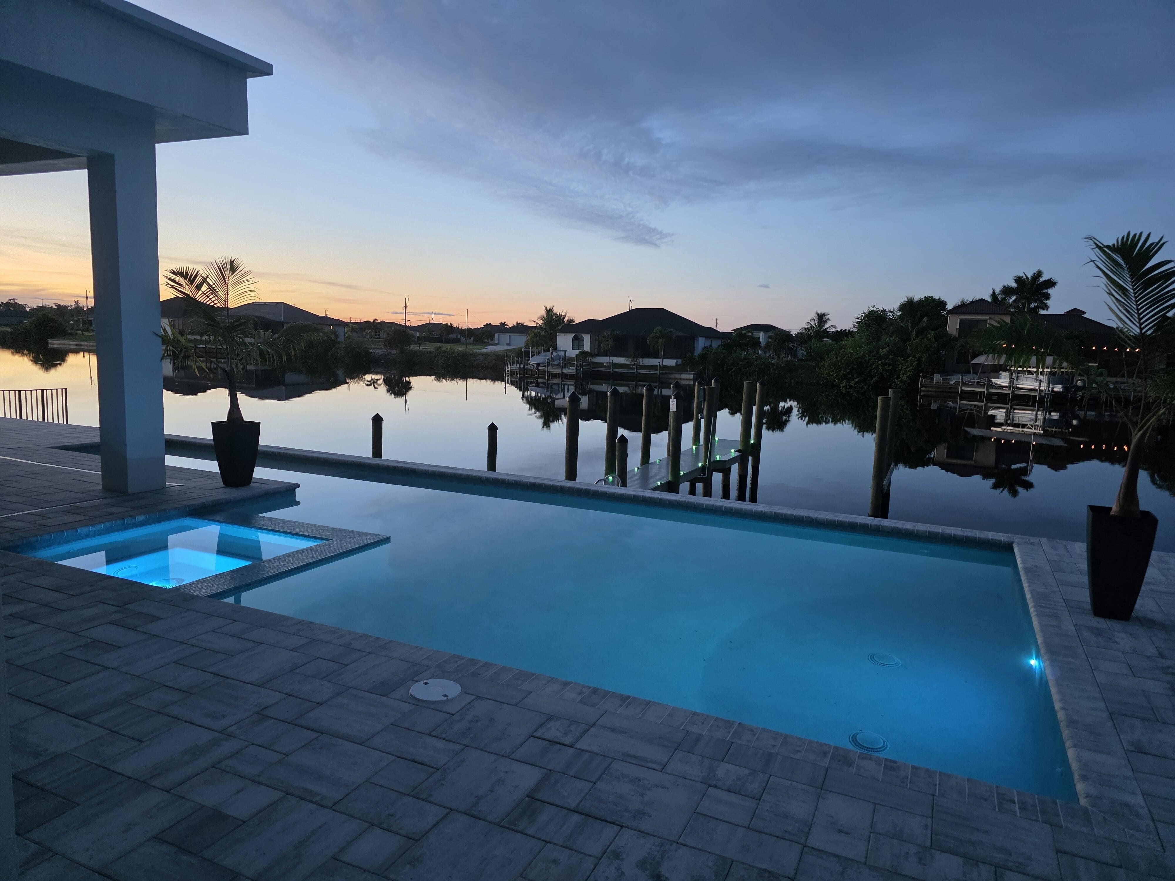 NEW CONSTRUCTION one-of-a-kind custom-designed home, not a builder’s model. Featuring 3 bedrooms, 3 bathrooms, and a versatile den or office that can be used as a permitted fourth bedroom. The home overlooks a 260-foot-wide south-facing canal with no bridges to the Gulf. Dock with 2 slips. Inside, the home offers 2,653 sf of A/C space with a total of 4165sf under roof. 14ft. soaring ceilings and 10-foot impact sliders that lead to a nearly 800 square foot covered lanai. The outdoor space includes a summer kitchen, bar, and a large fully automated saltwater pool with custom spa and sun shelf, all controllable from your phone. The primary suite features a spa-inspired bath with dual vanities, seven-foot LED backlit mirrors, a soaking tub, and a double-entry his and her shower. Throughout the home you’ll find 24 by 48 polished porcelain tiles, a modern fireplace, and a custom tile and wood accent wall. The kitchen includes espresso cabinetry, a ten-foot island, and top-of-the-line Bosch appliances. Every detail has been thoughtfully considered in this exceptiona