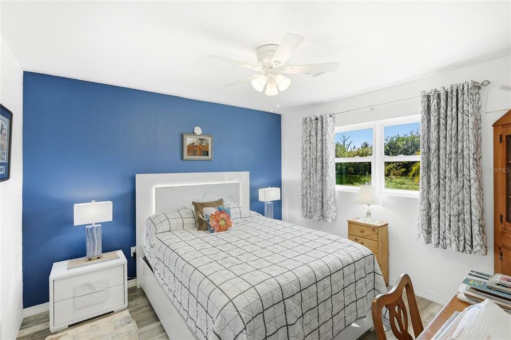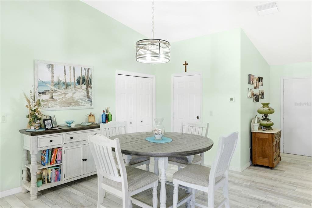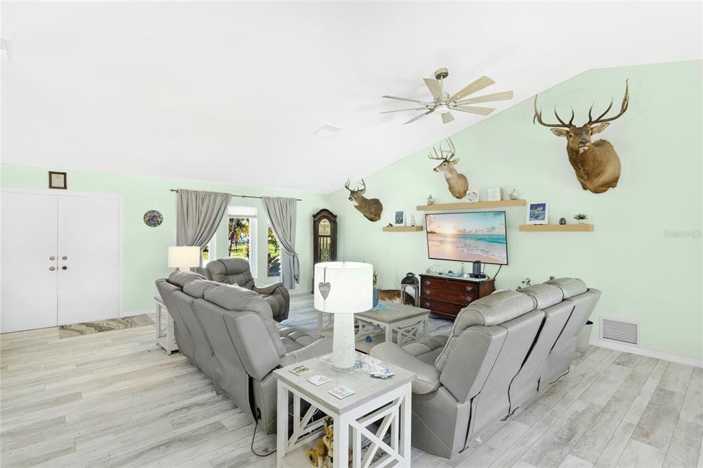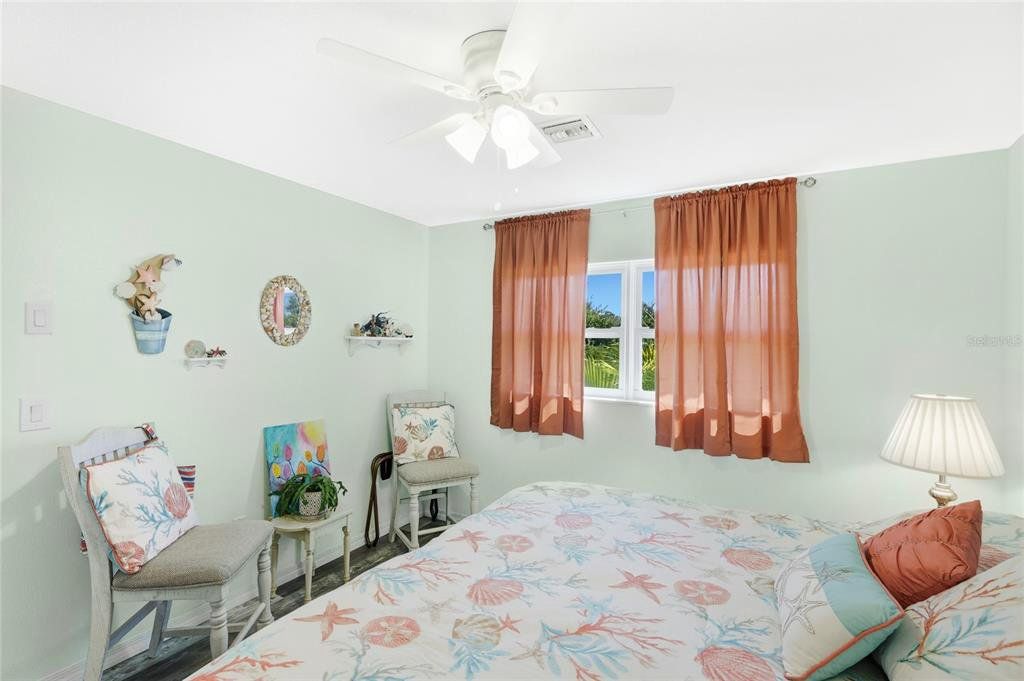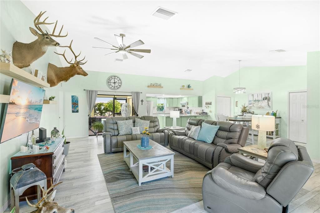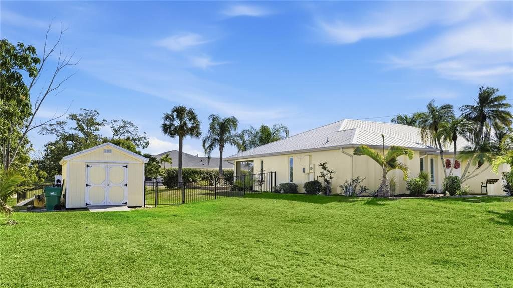 Located in the established community of Gulf Cove, this pool home is positioned on an oversized corner lot near the canal, offering a sense of openness, privacy, and flexibility with no mandatory HOA. Its unique setting provides wide spacing between neighboring homes and a peaceful backdrop without the responsibilities of a waterfront lot. Inside, vaulted ceilings and an open-concept layout create a bright, airy atmosphere. Wide-plank flooring extends throughout the main living areas, complementing the coastal color palette and natural light that fills the space. The living and dining areas flow seamlessly, making the home comfortable for daily living and well suited for entertaining. The kitchen sits at the heart of the home and features generous cabinetry, stone countertops, stainless steel appliances, and a breakfast bar that opens to the main living area. Sliding glass doors lead to the covered lanai, creating an easy transition to outdoor living. The primary suite offers a comfortable retreat with ample space and an ensuite bath with a walk-in shower. Guest bedrooms are arranged in a split floor plan, providing privacy and flexibility for visitors, family, or a home office. A convenient pool bath enhances functionality for outdoor entertaining. Outdoors, the backyard is designed for relaxed Florida living. The resurfaced pool is surrounded by a brick paver deck, mature palms, and tropical landscaping, while wrought-iron fencing adds privacy and definition. The expansive side yard is a standout feature, offering room for boat or RV storage, future expansion, or creative outdoor use. A matching shed provides additional storage or workshop potential. Residents of Gulf Cove have the option to join the voluntary homeowners association, which offers access to a community boat ramp, waterfront park, playground, and pavilion located nearby. This allows residents to enjoy boating and community amenities without a mandatory association or fees tied to the property. With a newer metal roof, impact windows, thoughtful updates, and a rare oversized corner-lot setting, this home offers a versatile option for full-time living, a seasonal retreat, or long-term ownership in a well-established Port Charlotte community. **THIS PROPERTY QUALIFIES FOR A 1% LENDER INCENTIVE IF USING PREFERRED LENDER. INQUIRE FOR MORE DETAILS.**