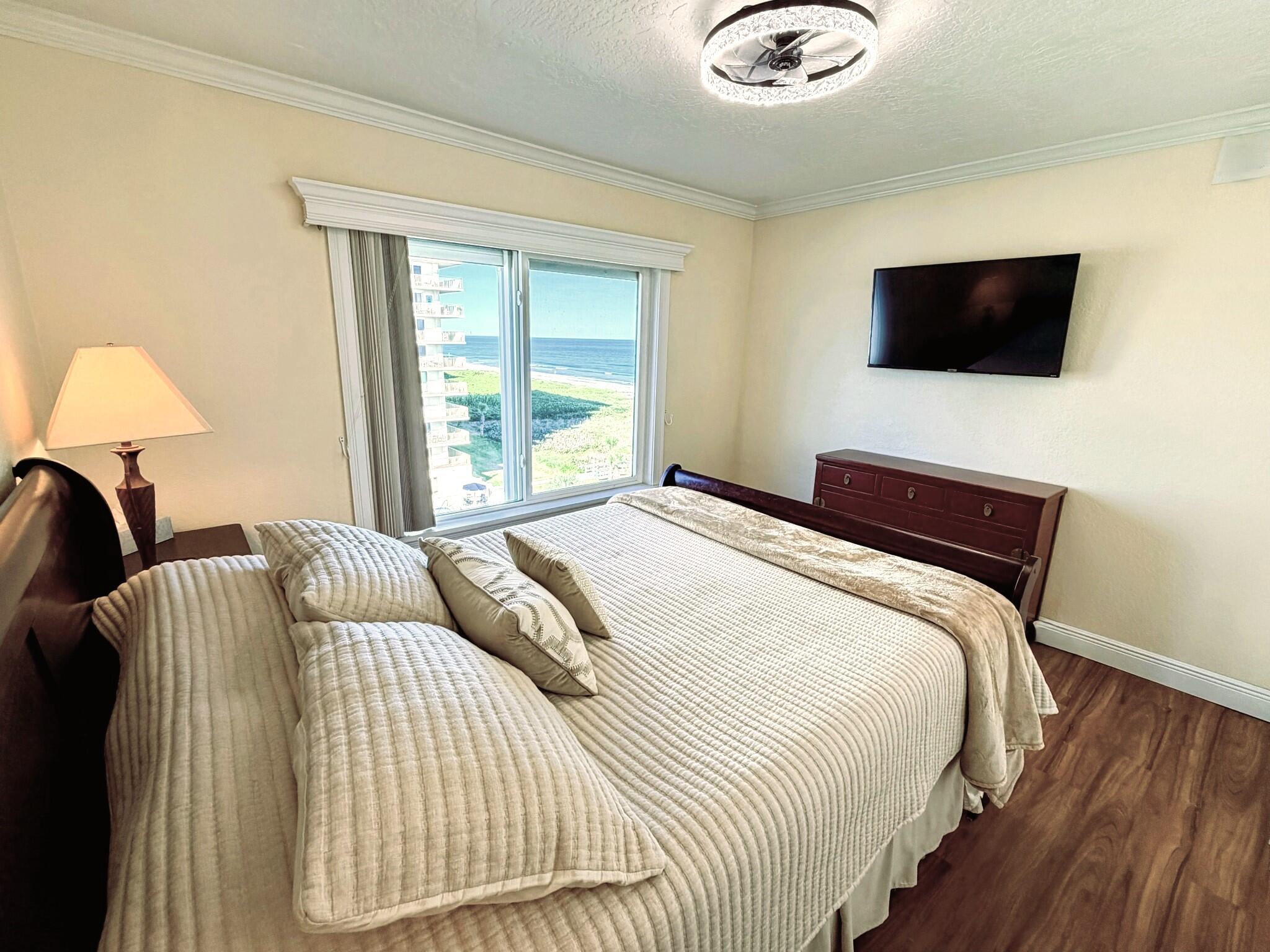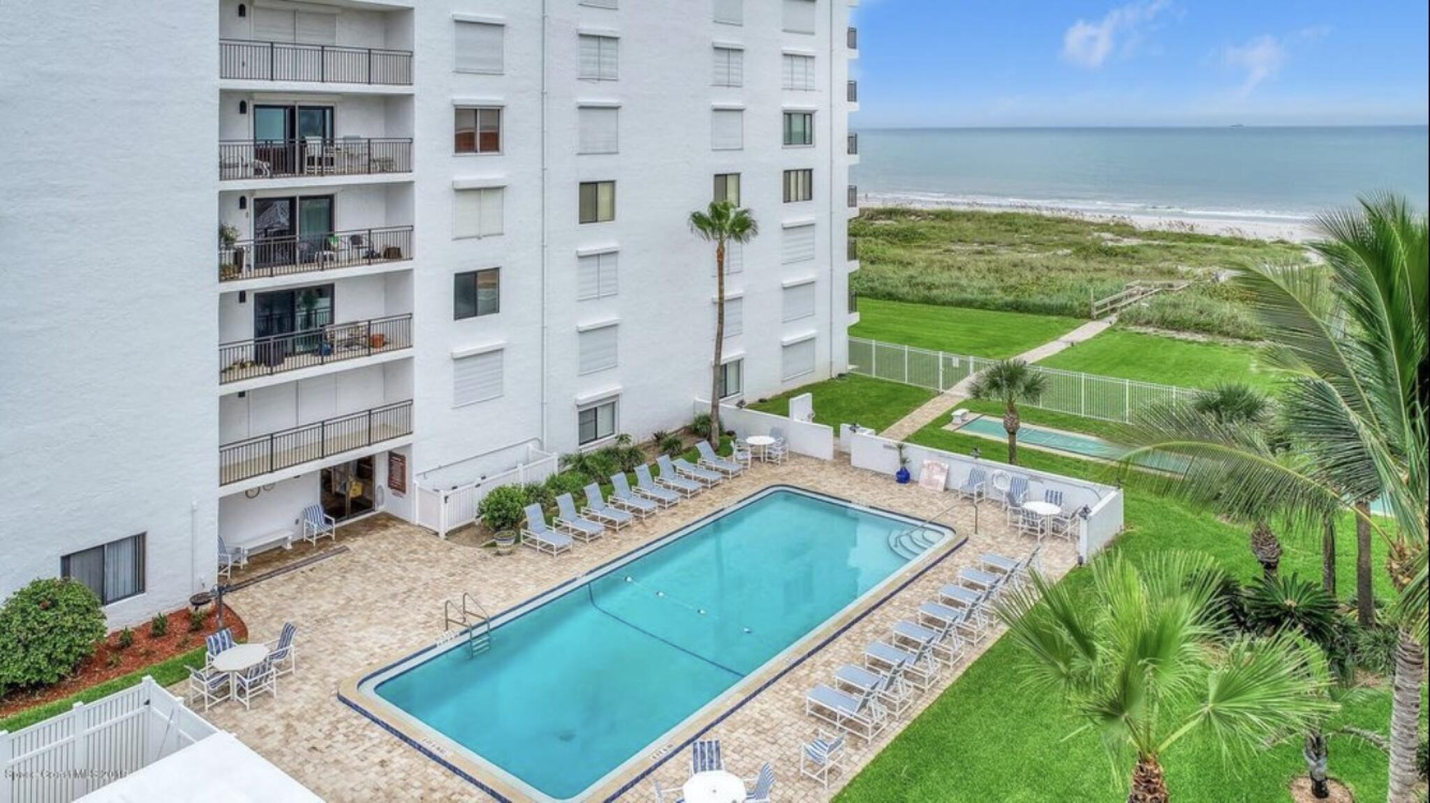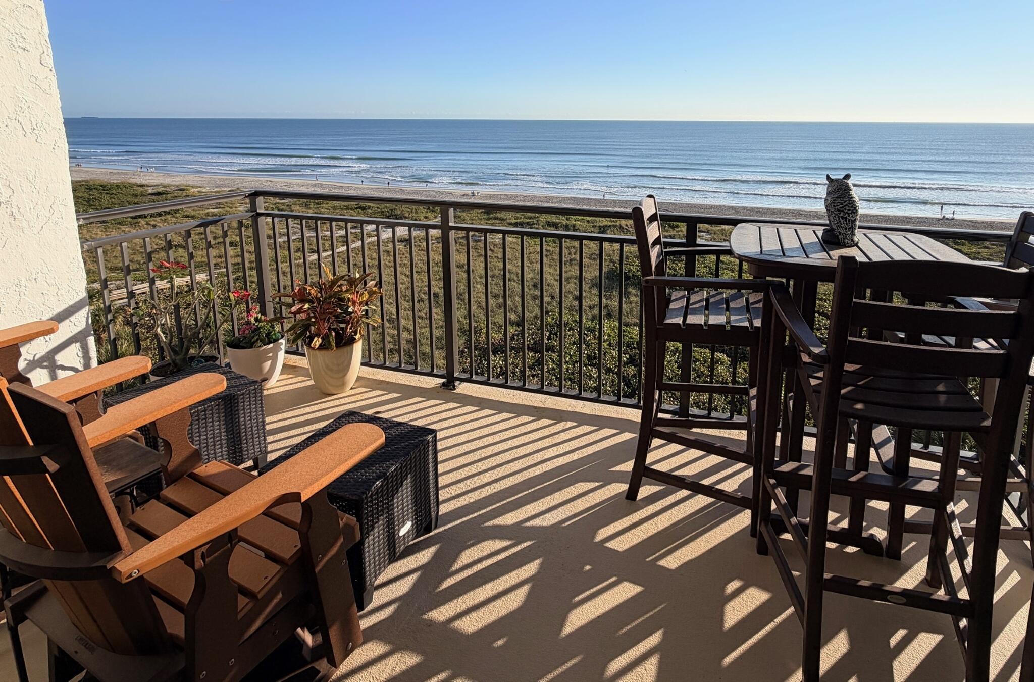 OCEANFRONT 3BR/2BA NE CORNER UNIT ON 7th FLOOR w RARE 2 CAR GARAGE. Panoramic Atlantic views from kitchen, living, dining, primary, and guest bedroom. Completely renovated with luxury vinyl plank flooring, high-end granite countertops, custom wood cabinetry, granite sink, custom lighting, and motorized voice-activated blinds. The primary bath has a walk-in shower, guest bath has a jet tub. 3rd bedroom is Full Murphy Bed/Office for remote work and guests. Hurricane-rated windows, slider, and shutters. Crown molding throughout, in-unit laundry, Coastal AC Unit, and 2025 tankless water heater. Direct beach access, heated oceanfront pool, fire pit, grill, and clubhouse with full kitchen/dining room. Enjoy sunrises, rocket launches, and ocean breezes from the private balcony. Walk to downtown Cocoa Beach. Fully funded reserves, SIRS compliant, concrete restoration TBC 2026. Furnishings negotiable. Move-in ready for living or investment. Direct sale opportunity w owner.