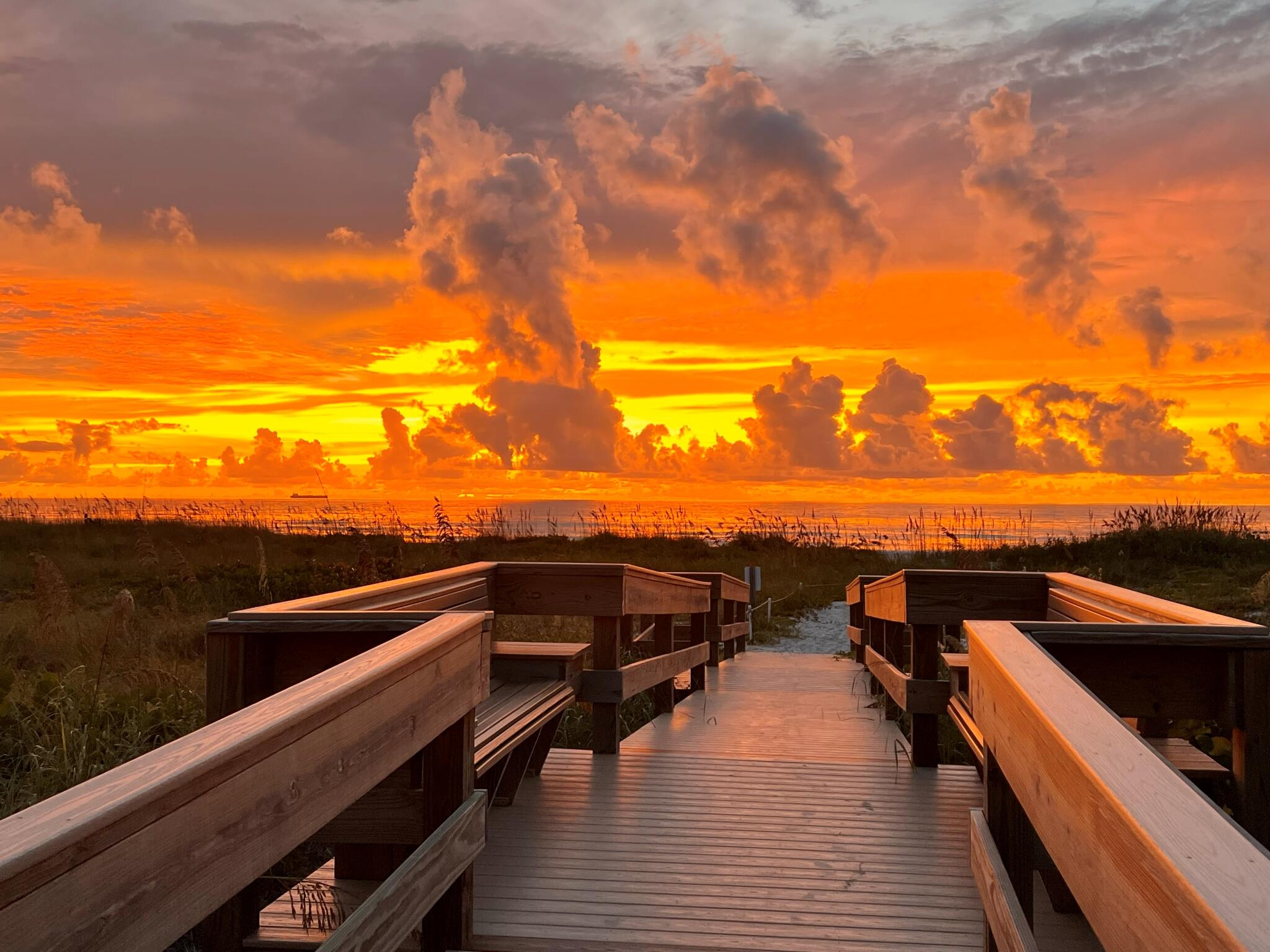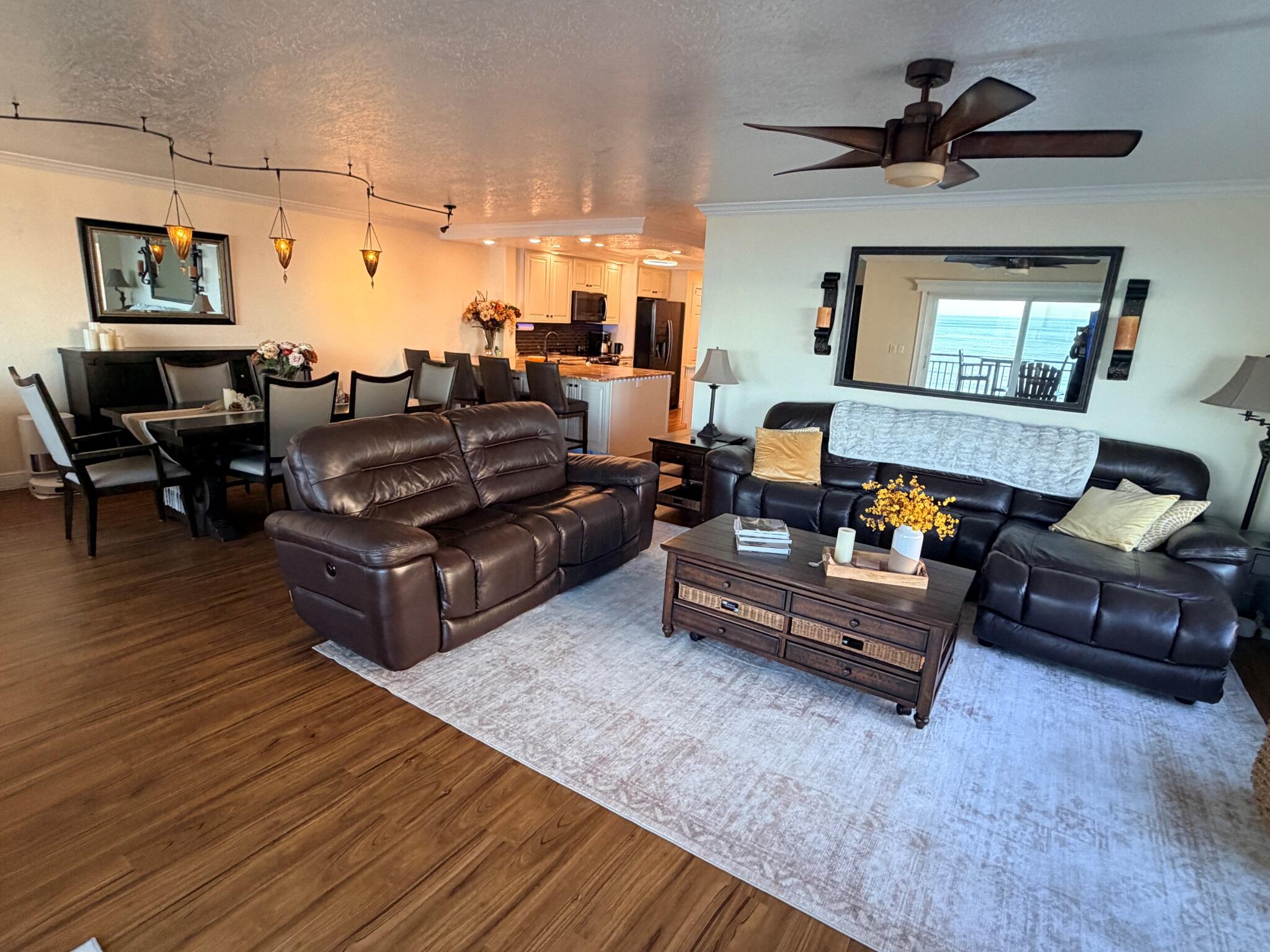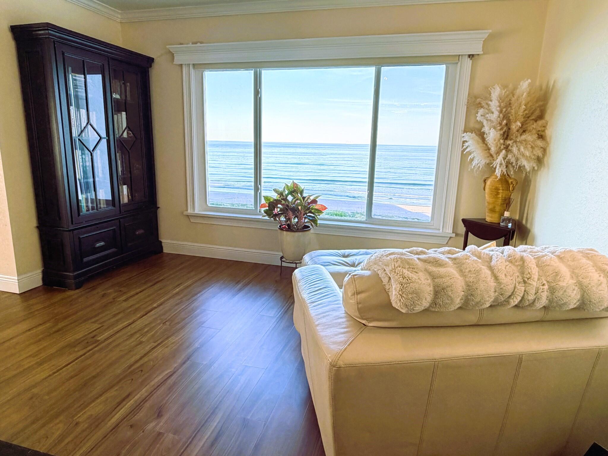 OCEANFRONT 3BR/2BA NE CORNER UNIT ON 7th FLOOR w RARE 2 CAR GARAGE. Panoramic Atlantic views from kitchen, living, dining, primary, and guest bedroom. Completely renovated with luxury vinyl plank flooring, high-end granite countertops, custom wood cabinetry, granite sink, custom lighting, and motorized voice-activated blinds. The primary bath has a walk-in shower, guest bath has a jet tub. 3rd bedroom is Full Murphy Bed/Office for remote work and guests. Hurricane-rated windows, slider, and shutters. Crown molding throughout, in-unit laundry, Coastal AC Unit, and 2025 tankless water heater. Direct beach access, heated oceanfront pool, fire pit, grill, and clubhouse with full kitchen/dining room. Enjoy sunrises, rocket launches, and ocean breezes from the private balcony. Walk to downtown Cocoa Beach. Fully funded reserves, SIRS compliant, concrete restoration TBC 2026. Furnishings negotiable. Move-in ready for living or investment. Direct sale opportunity w owner.