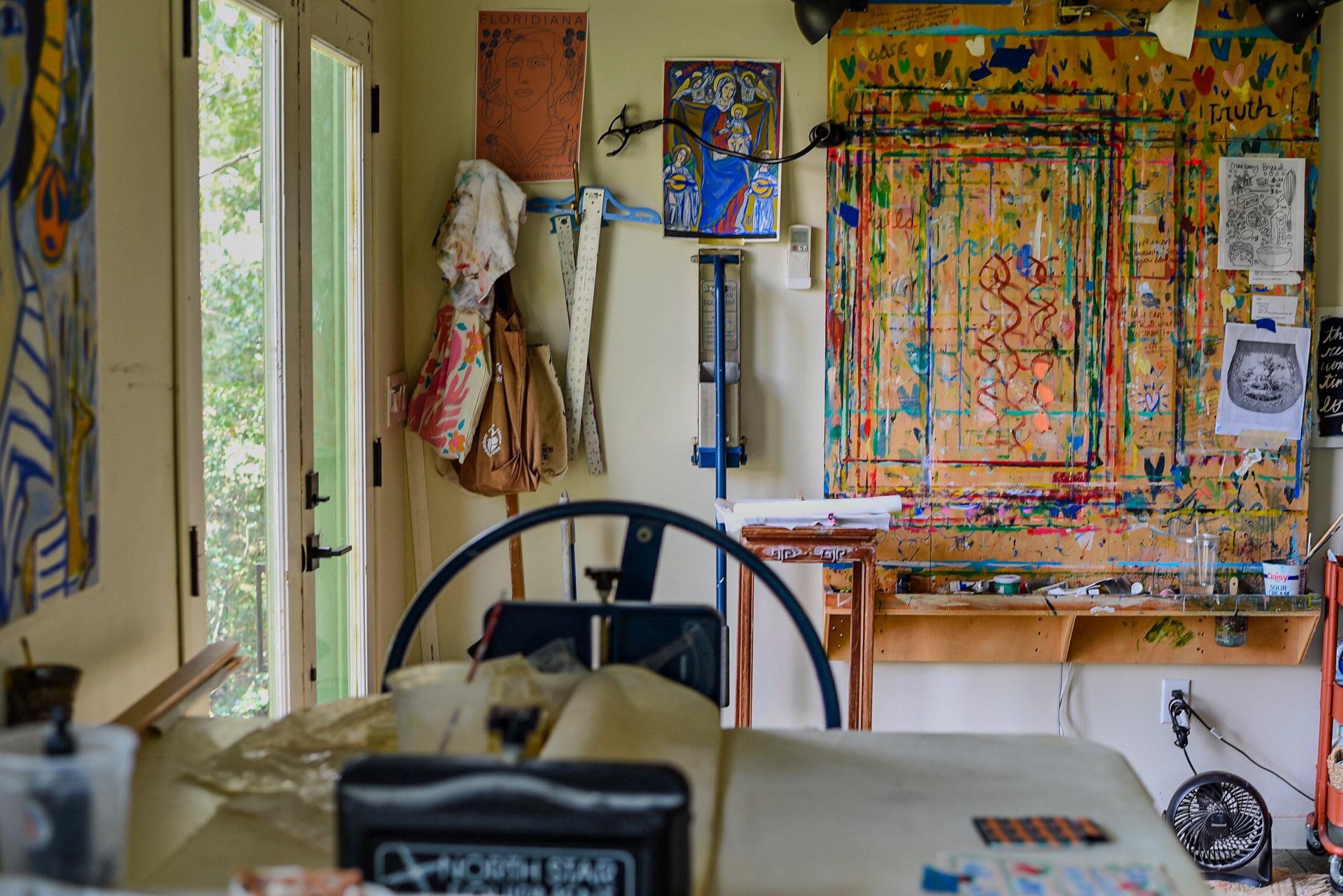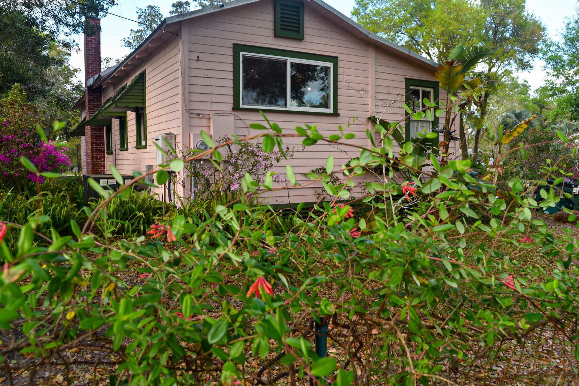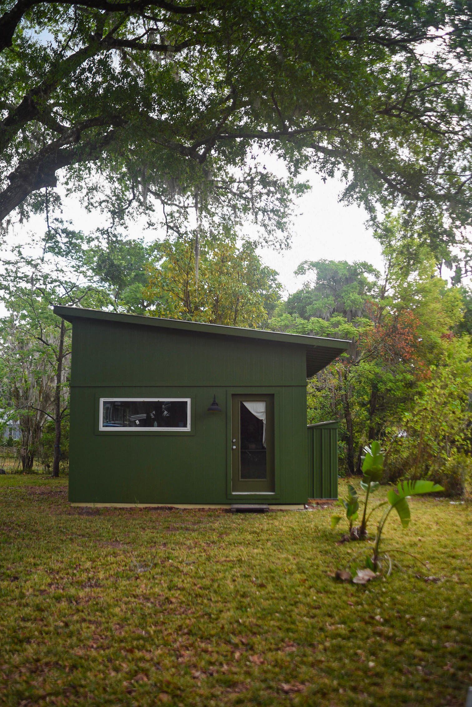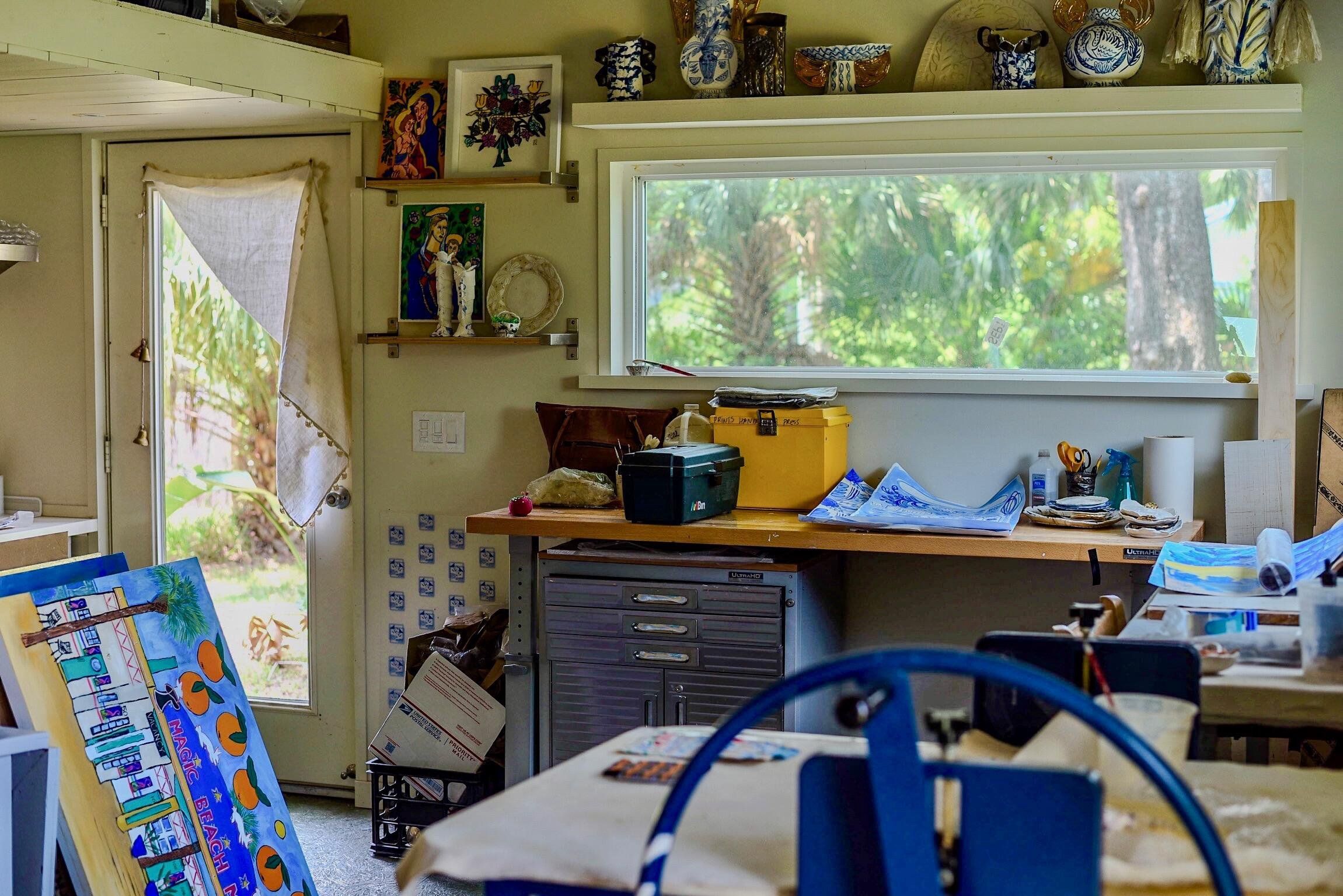 Artist Three-Bedroom Home with Detached Studio Near Downtown DeLand Just blocks from Downtown DeLand’s historic district, this three-bedroom, two-bathroom home offers a flexible layout and a newly constructed, climate-controlled detached studio— for a home office, workshop, or creative space. Inside, you'll find heart-of-pine tongue-and-groove ceilings, a wood-burning fireplace with brick surround, and custom artistic touches including hand-painted doors and murals. The kitchen has been updated, and the home features new AC units, insulation, electrical, tankless gas water heater, plumbing, and fresh interior and exterior paint. Outdoor highlights include native landscaping, a fenced backyard, fire pit, and screened-in front porch.