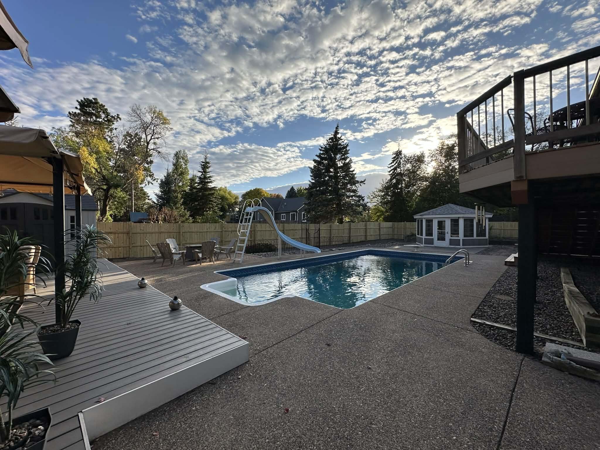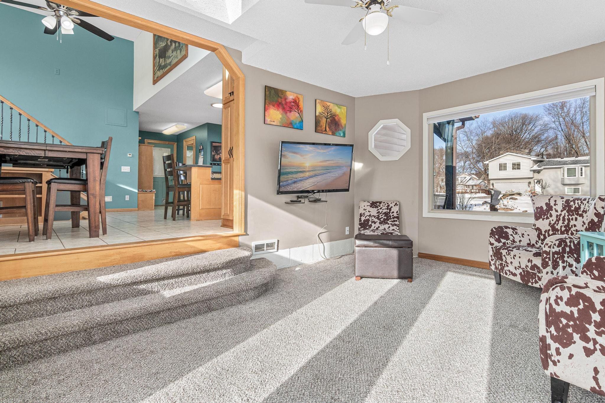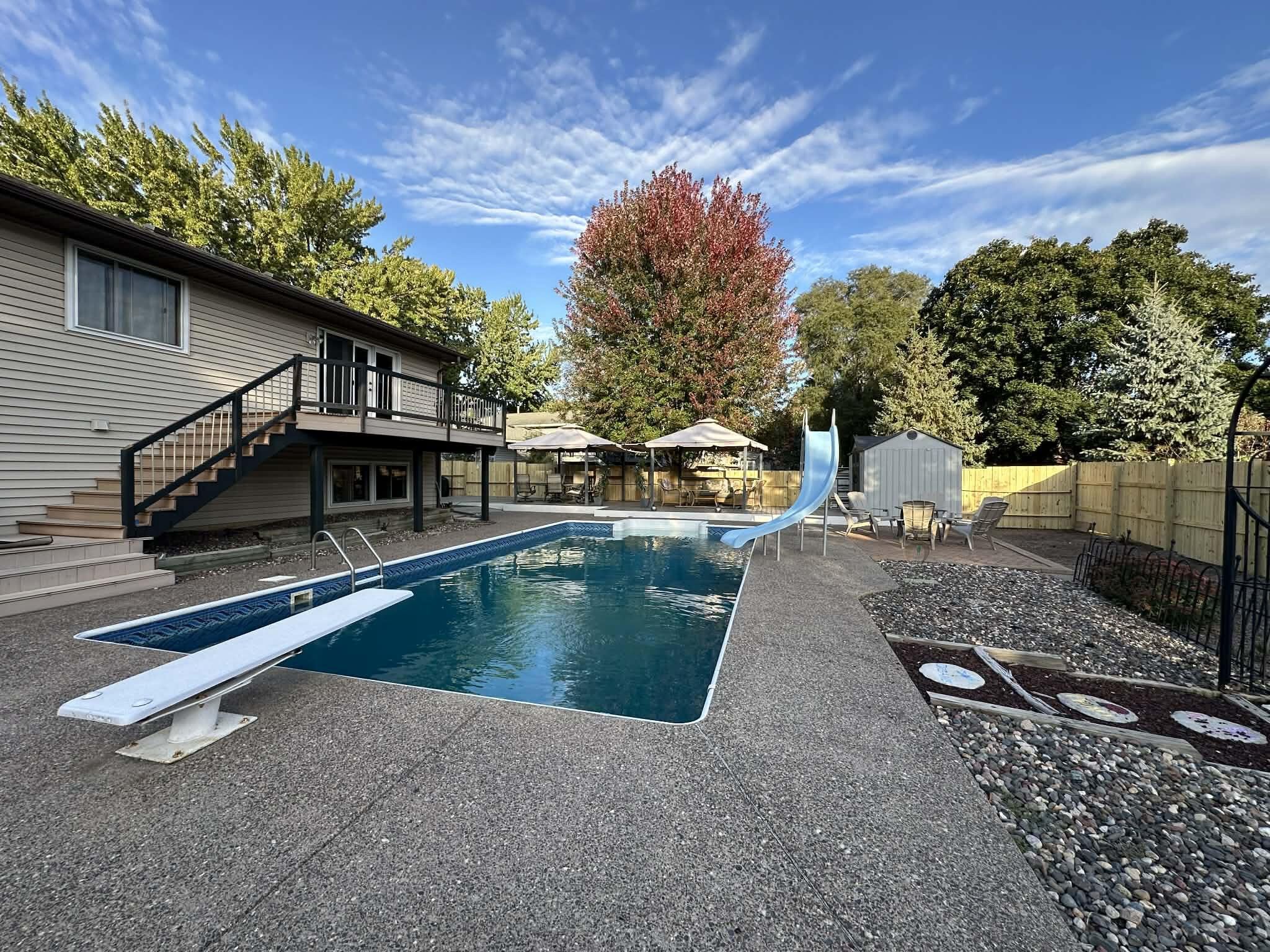Welcome home to resort style living at the end of a quiet cul-de-sac with outstanding neighbors. Listed by the second owners, this home has been well cared for and periodically updated since it was constructed. In 2025, the roof was replaced with all new long life shingles, the 300 foot privacy fence around the back yard pool was replaced with gorgeous Minnesota yellow pine wood fencing for years of beauty, privacy and security. Updated ceiling and LED lights in the lower level and new carpet throughout the home. Heated tile floor span the main level featuring an open concept kitchen and dining space and a sunroom that walks out to the fully fenced back oasis. There are three bedrooms up with one having direct access to the full bathroom and a large living room with tons of natural light. The lower level consists of a primary suite set up with a bedroom, generous three-quarter bath featuring a walk-in shower and heated drying space, a walk in closet, cozy living room with fireplace and abundant storage. Enjoy the thoughtfully designed backyard complete with in-ground pool, expansive entertaining space with multiple decks, gazebos and raised flowerbeds/garden. Additional features include an updated concrete driveway, Koi pond with waterfall, maintenance free vinyl siding, double attached garage, a single car detached garage and so much more