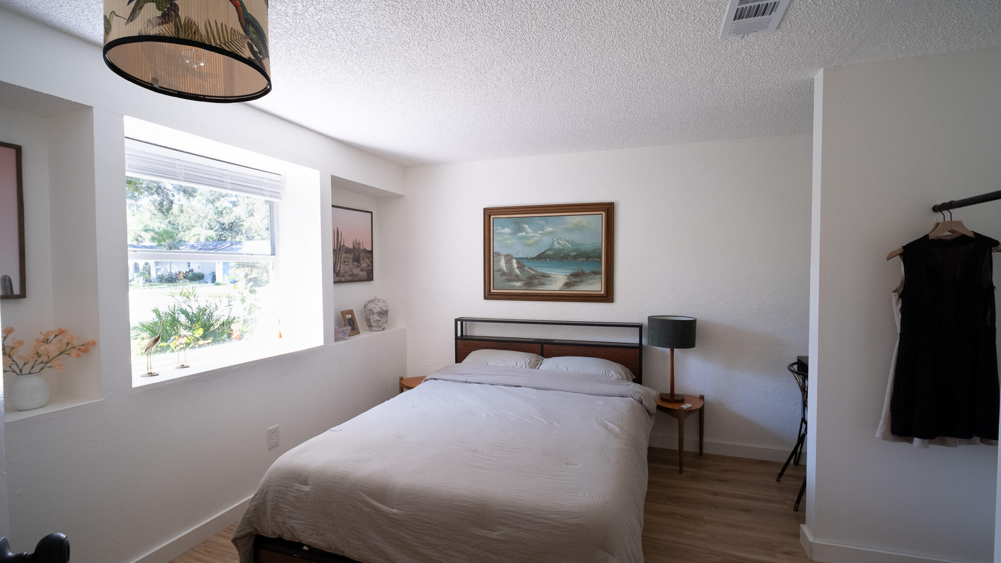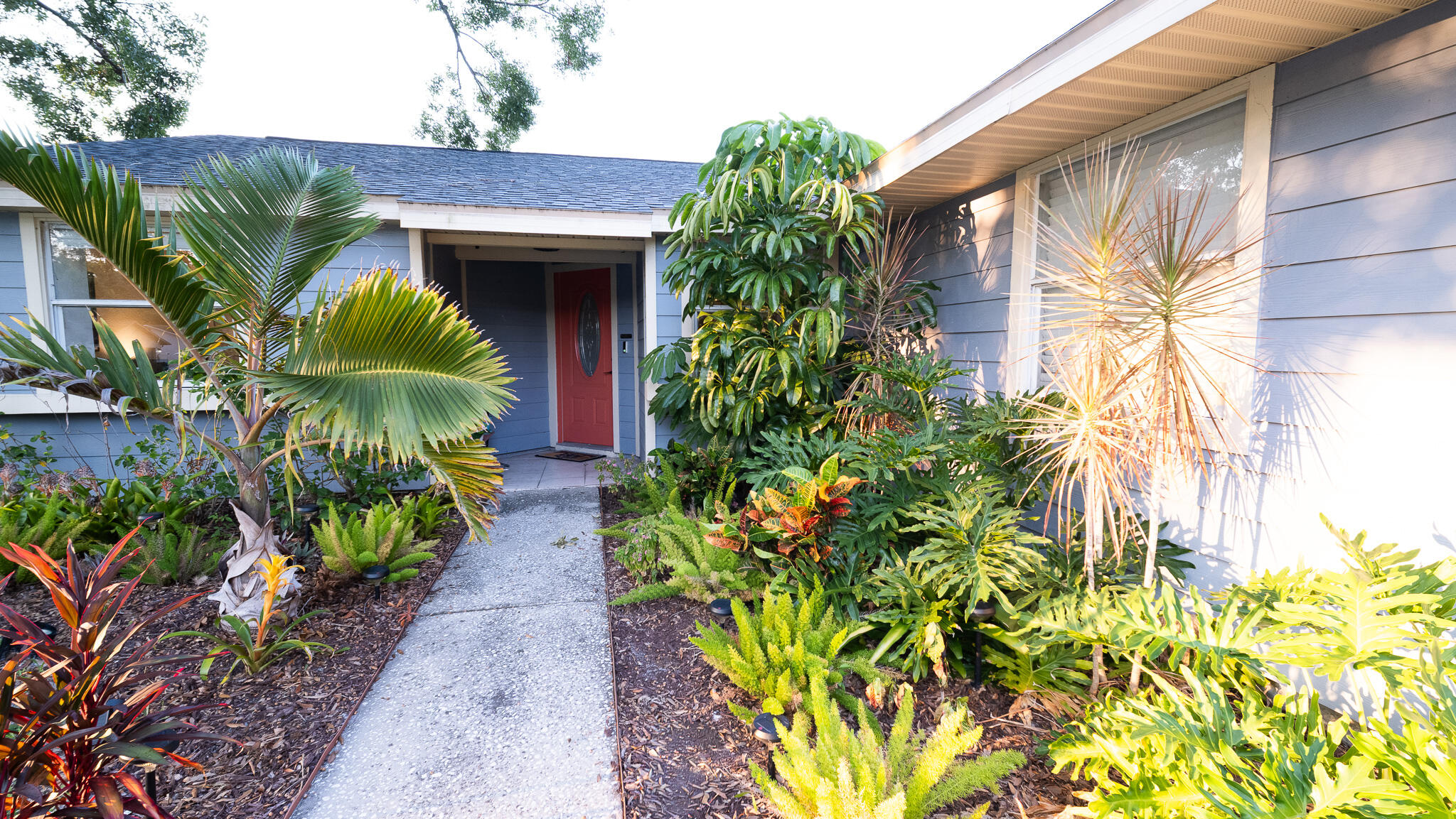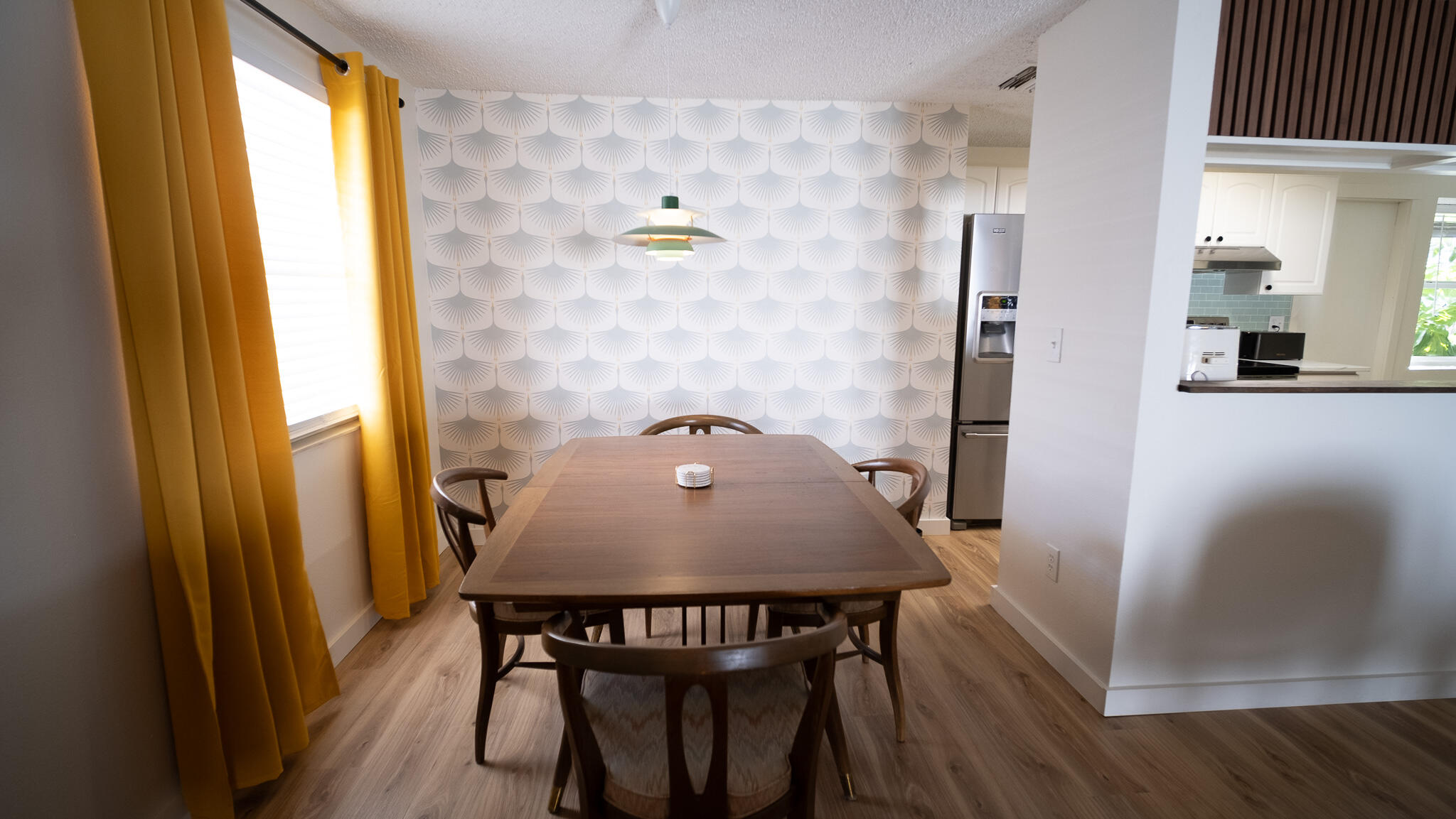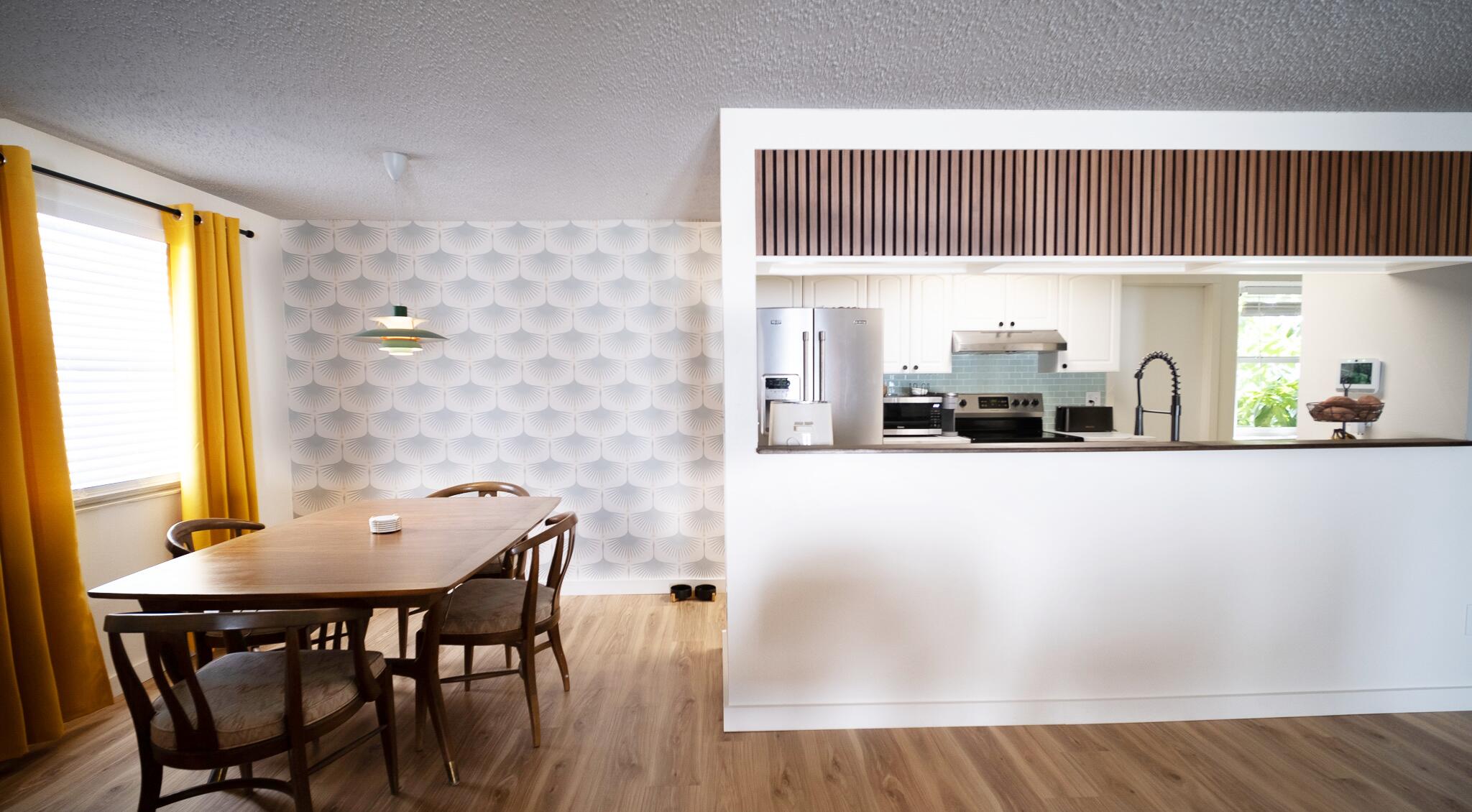 Move-in ready and freshly renovated, this 3 bed / 2 bath home blends mid-century modern style with beachy coastal vibes. With thoughtful updates inside and out, bonus living spaces under HVAC, and a lush tropical backyard, this home is designed for comfort and entertaining. Recent Renovations: -New waterproof LVT floors throughout -Mid-century modern light fixtures, ceiling fans, door hardware, and cabinet pulls -Accent wall with mid-century wallpaper in the dining room -Kitchen with sea-glass subway tile backsplash, stainless steel fridge w/ water dispenser, new dishwasher, new countertops, pantry, breakfast nook, and abundant cabinets -Front-loading washer/dryer included -Main bathroom fully remodeled -New roof (2023), newer A/C