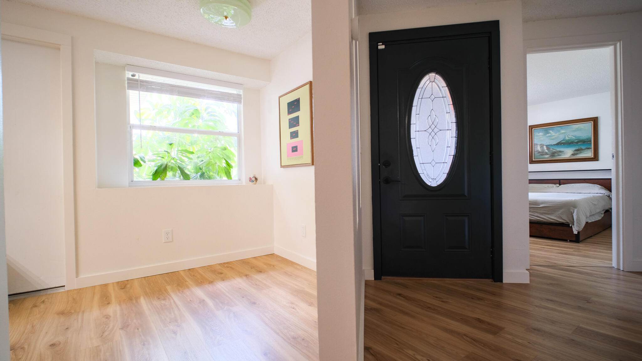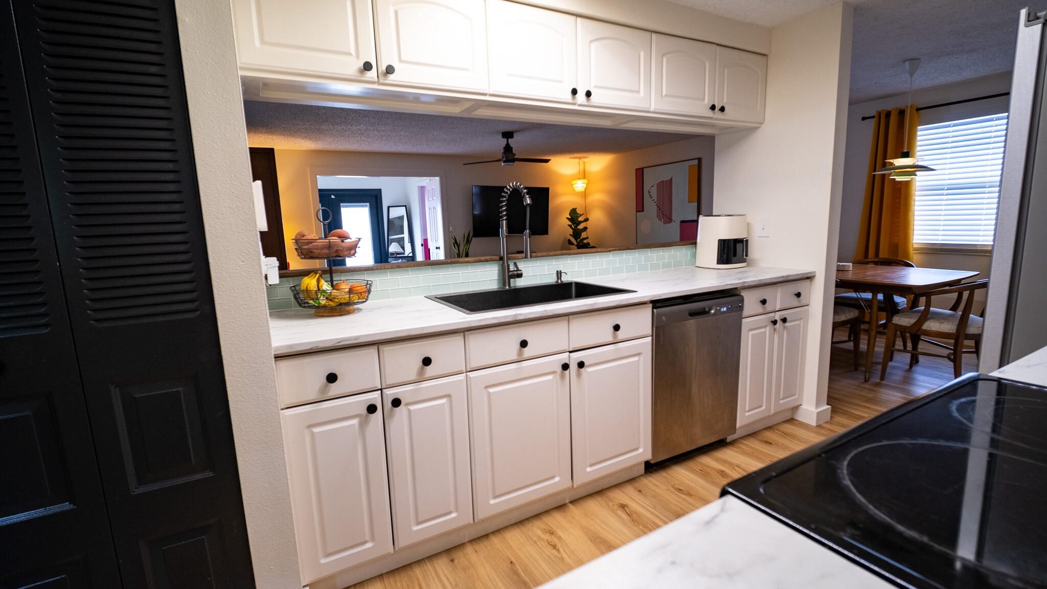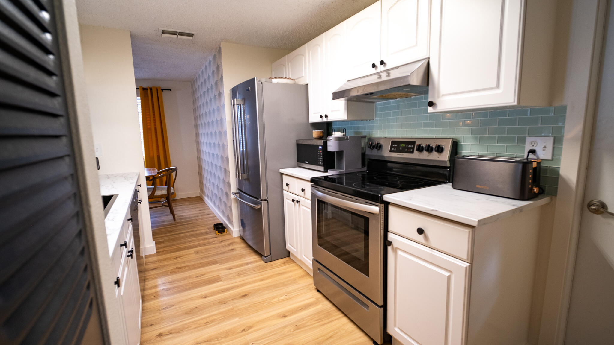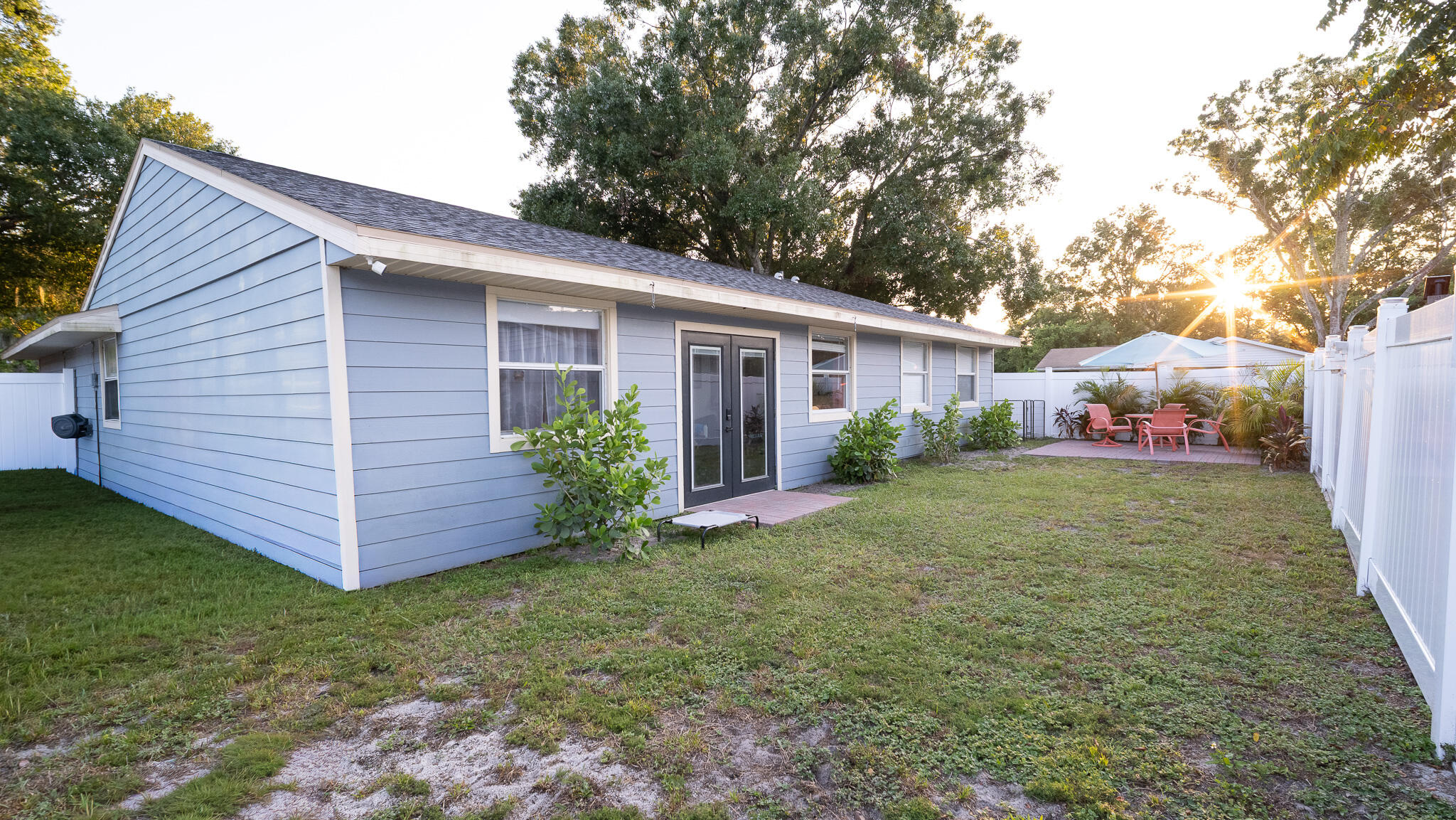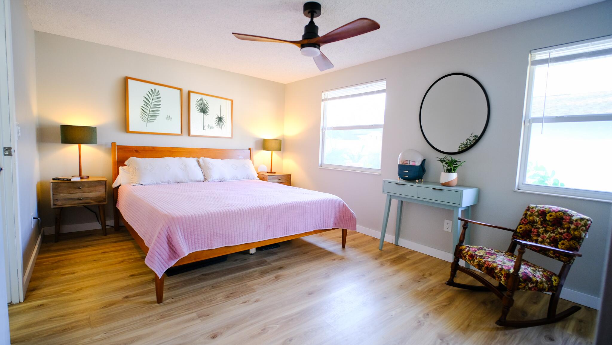 Move-in ready and freshly renovated, this 3 bed / 2 bath home blends mid-century modern style with beachy coastal vibes. With thoughtful updates inside and out, bonus living spaces under HVAC, and a lush tropical backyard, this home is designed for comfort and entertaining. Recent Renovations: -New waterproof LVT floors throughout -Mid-century modern light fixtures, ceiling fans, door hardware, and cabinet pulls -Accent wall with mid-century wallpaper in the dining room -Kitchen with sea-glass subway tile backsplash, stainless steel fridge w/ water dispenser, new dishwasher, new countertops, pantry, breakfast nook, and abundant cabinets -Front-loading washer/dryer included -Main bathroom fully remodeled -New roof (2023), newer A/C